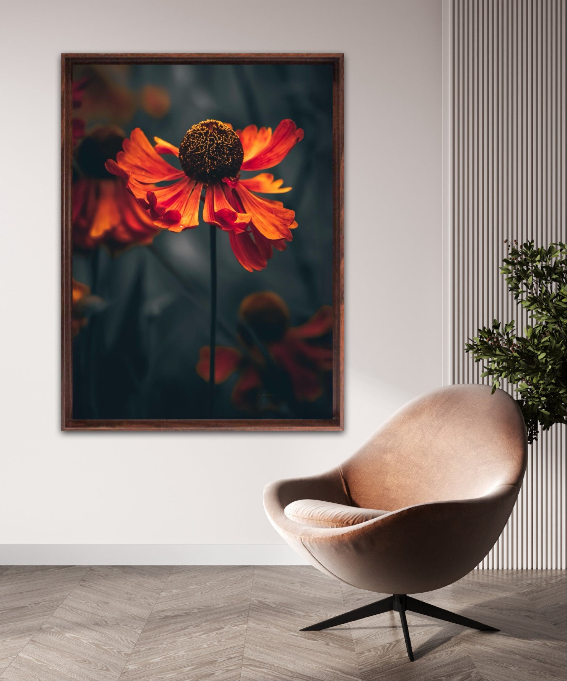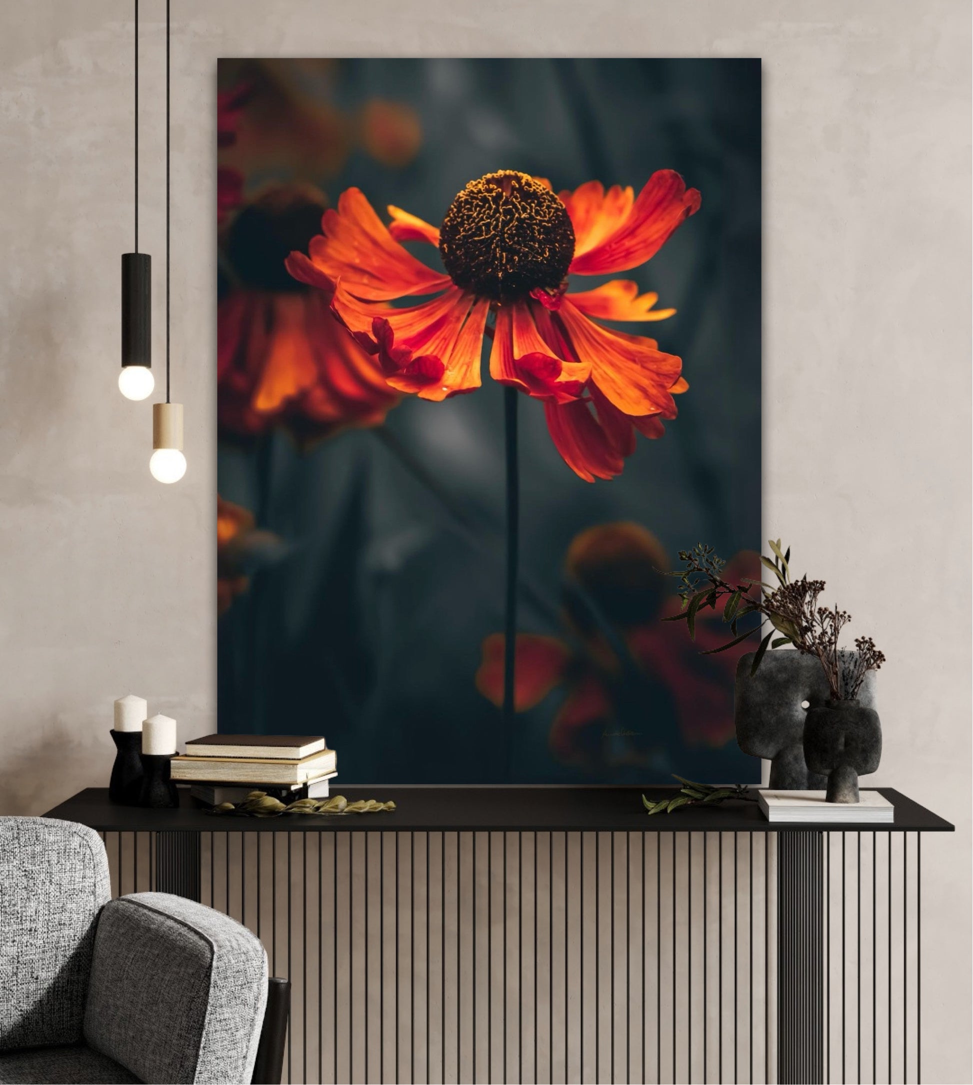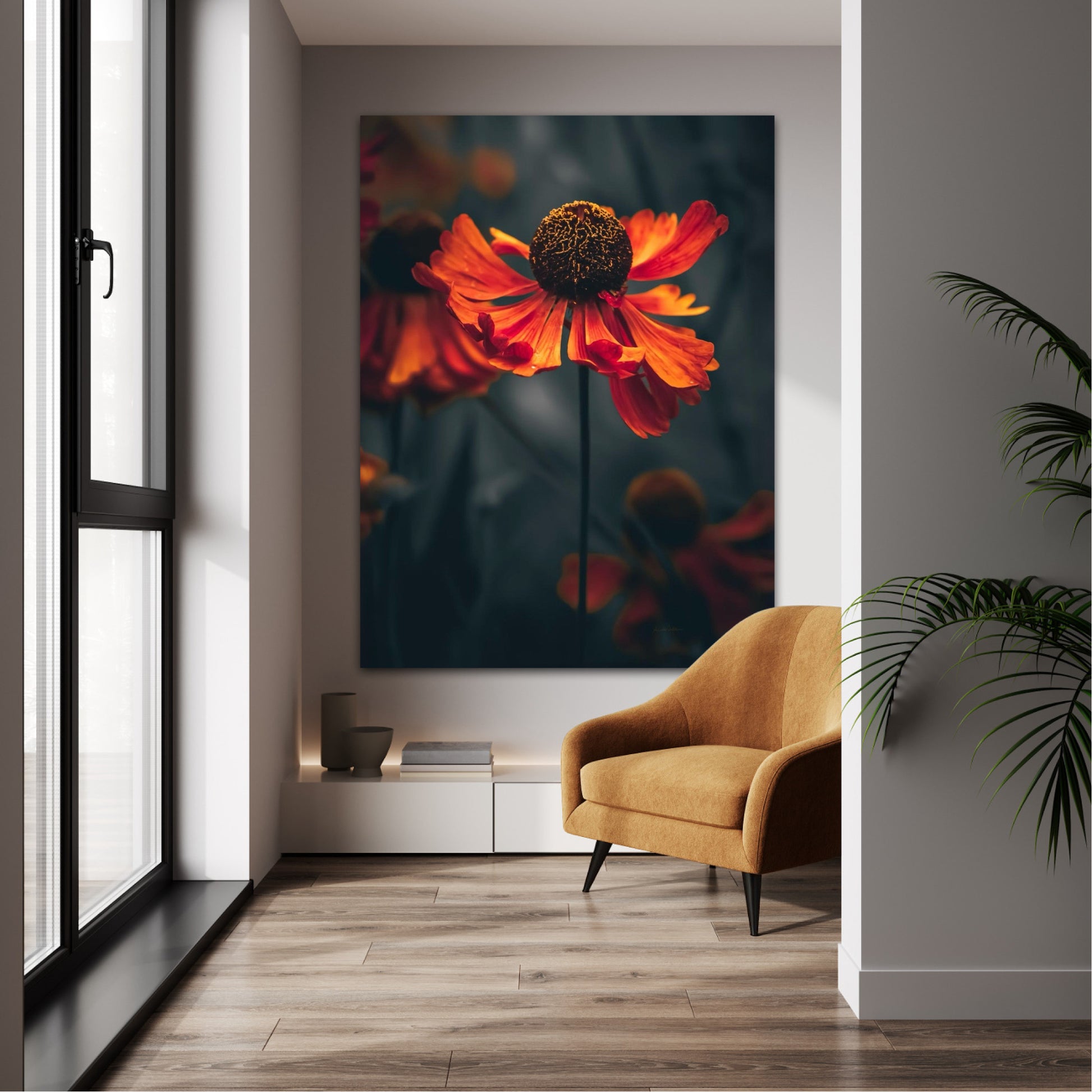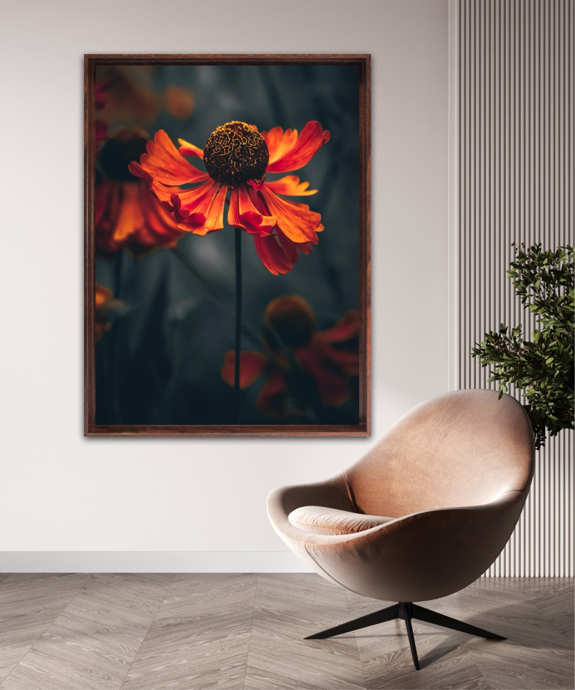 Beautiful photographic wall art of a gorgeous autumn solstice flower on a dark bluegrey background. This art piece will lift you up.