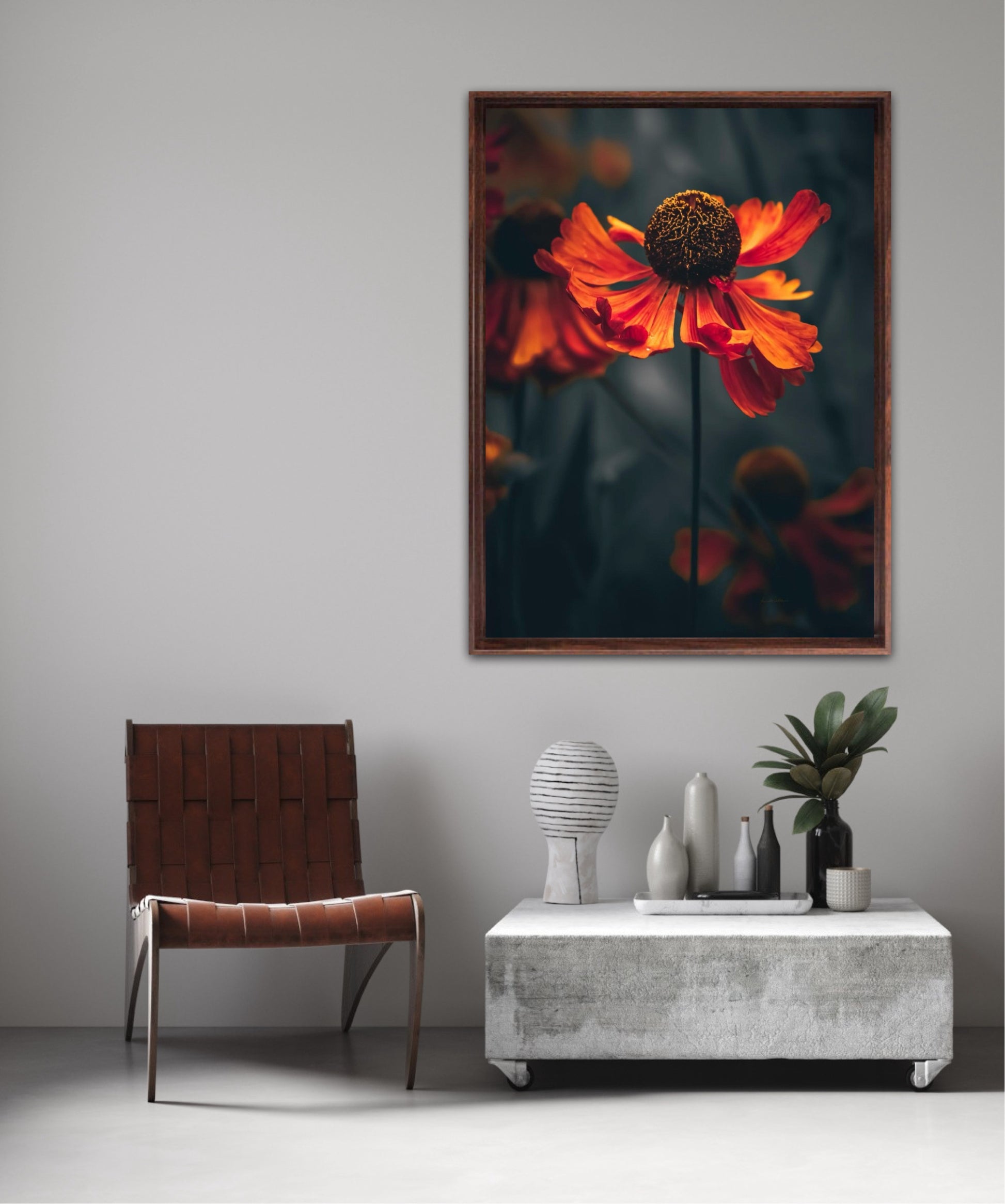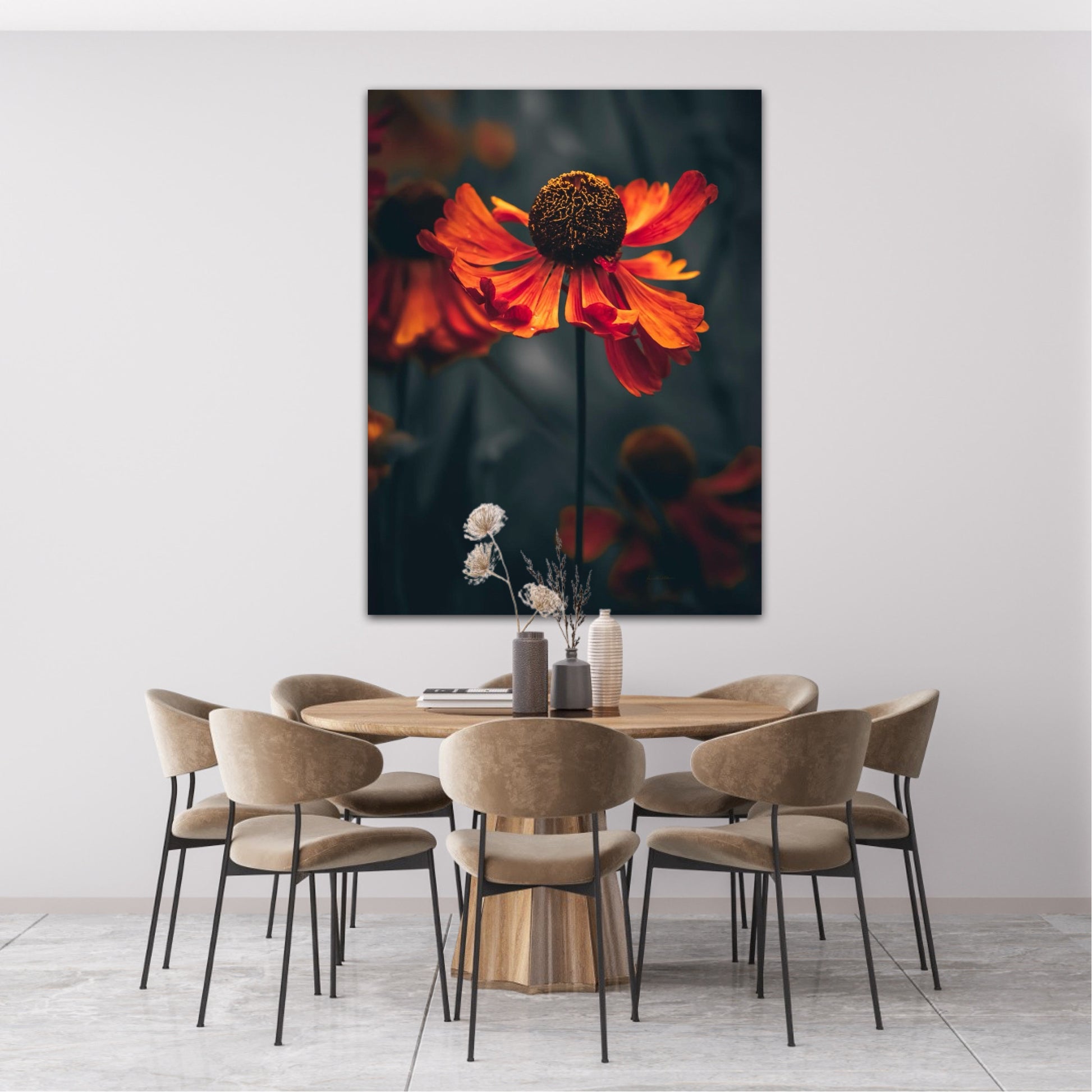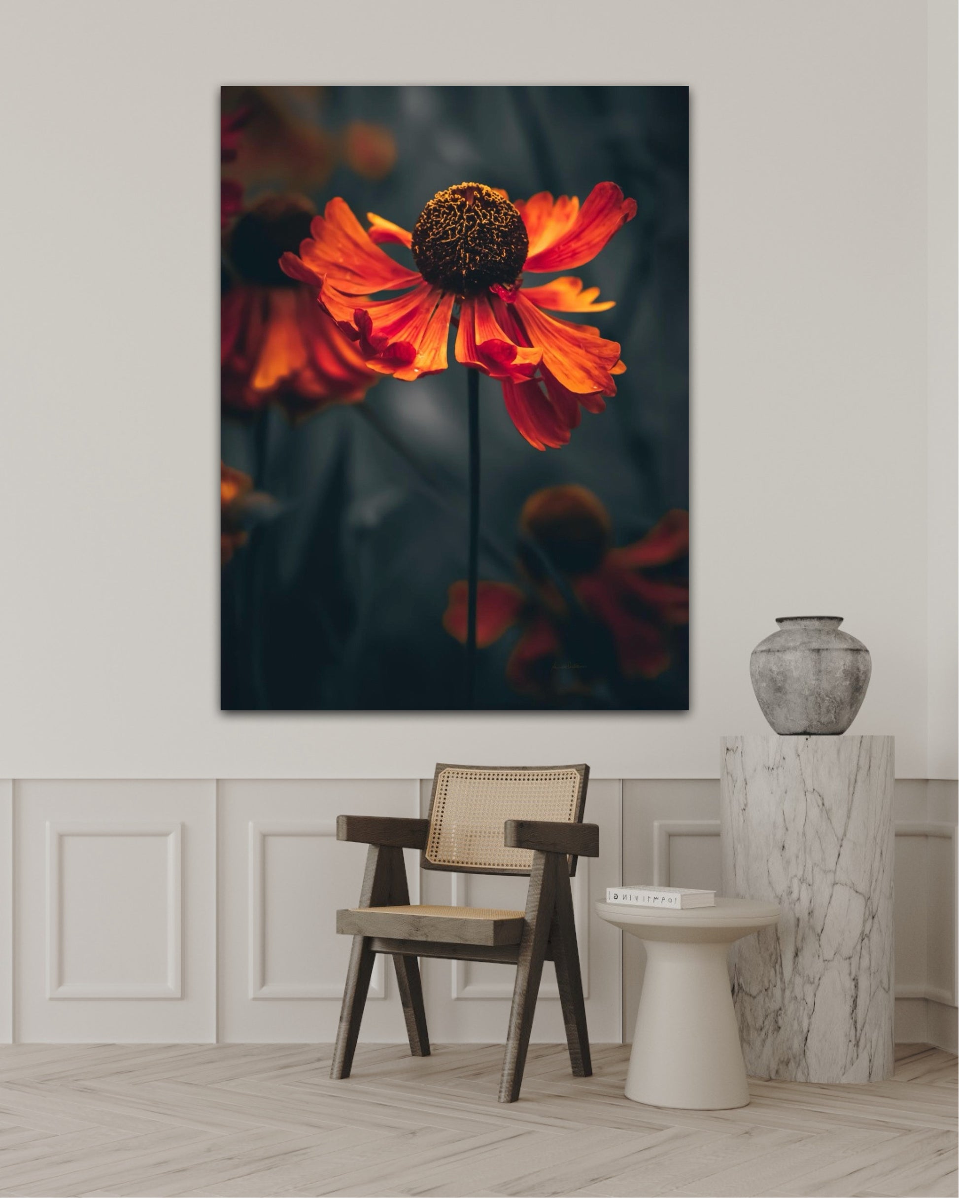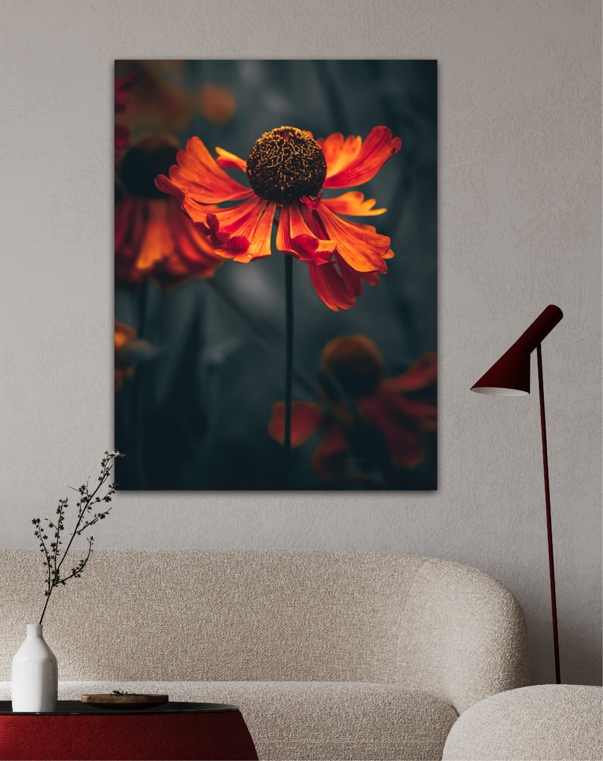Beautiful photographic wall art of a gorgeous autumn solstice flower on a dark bluegrey background. This art piece will lift you up.
