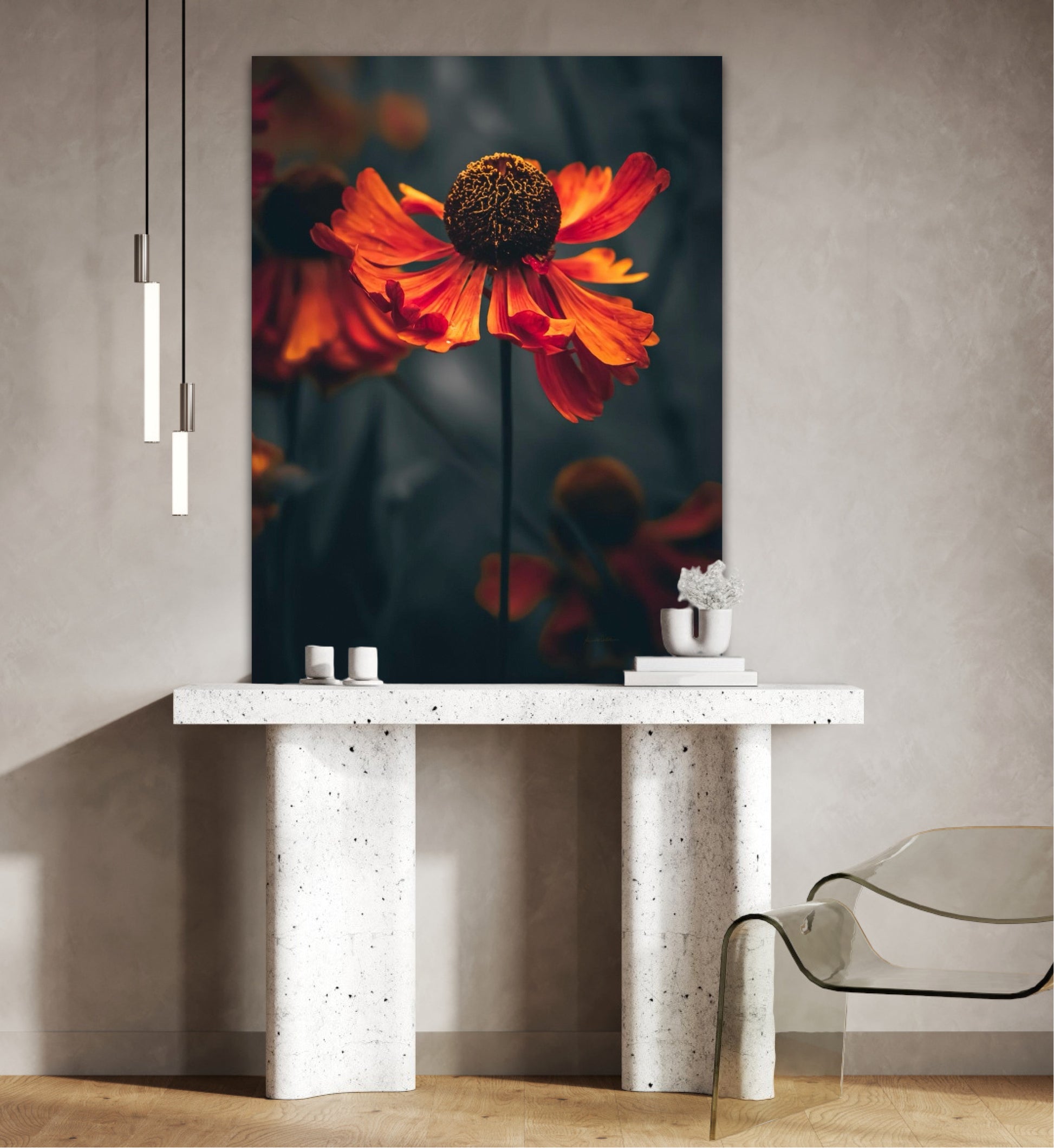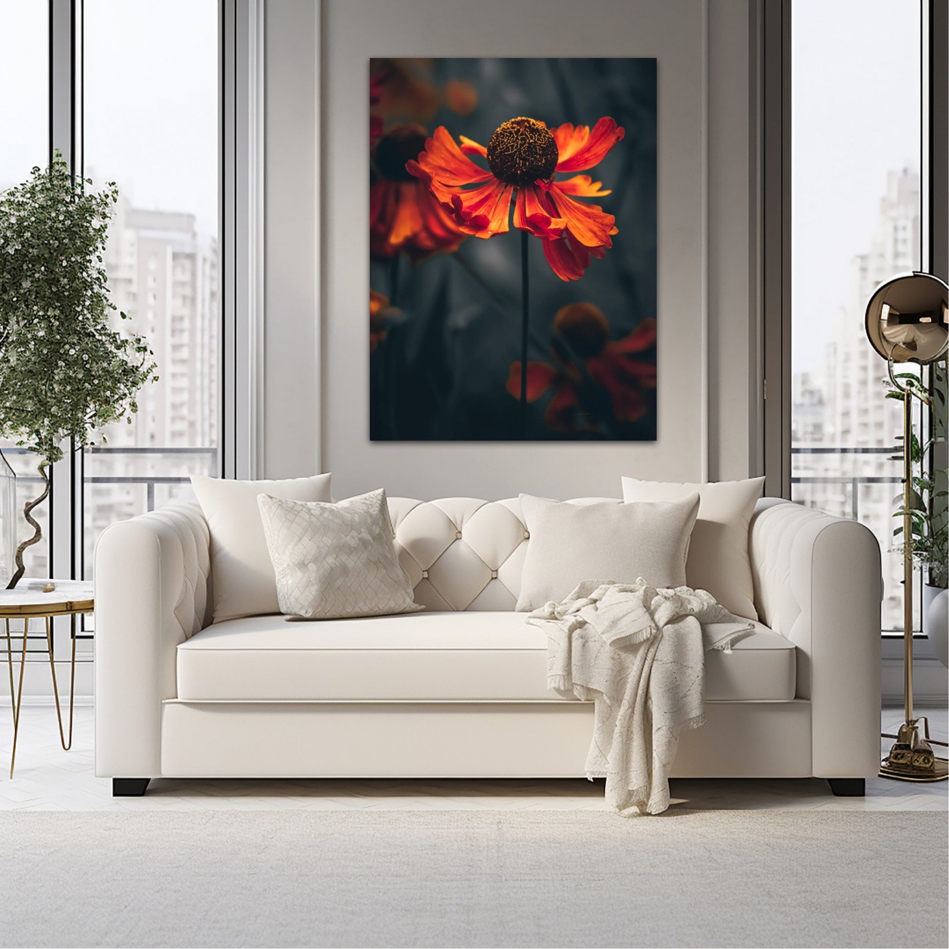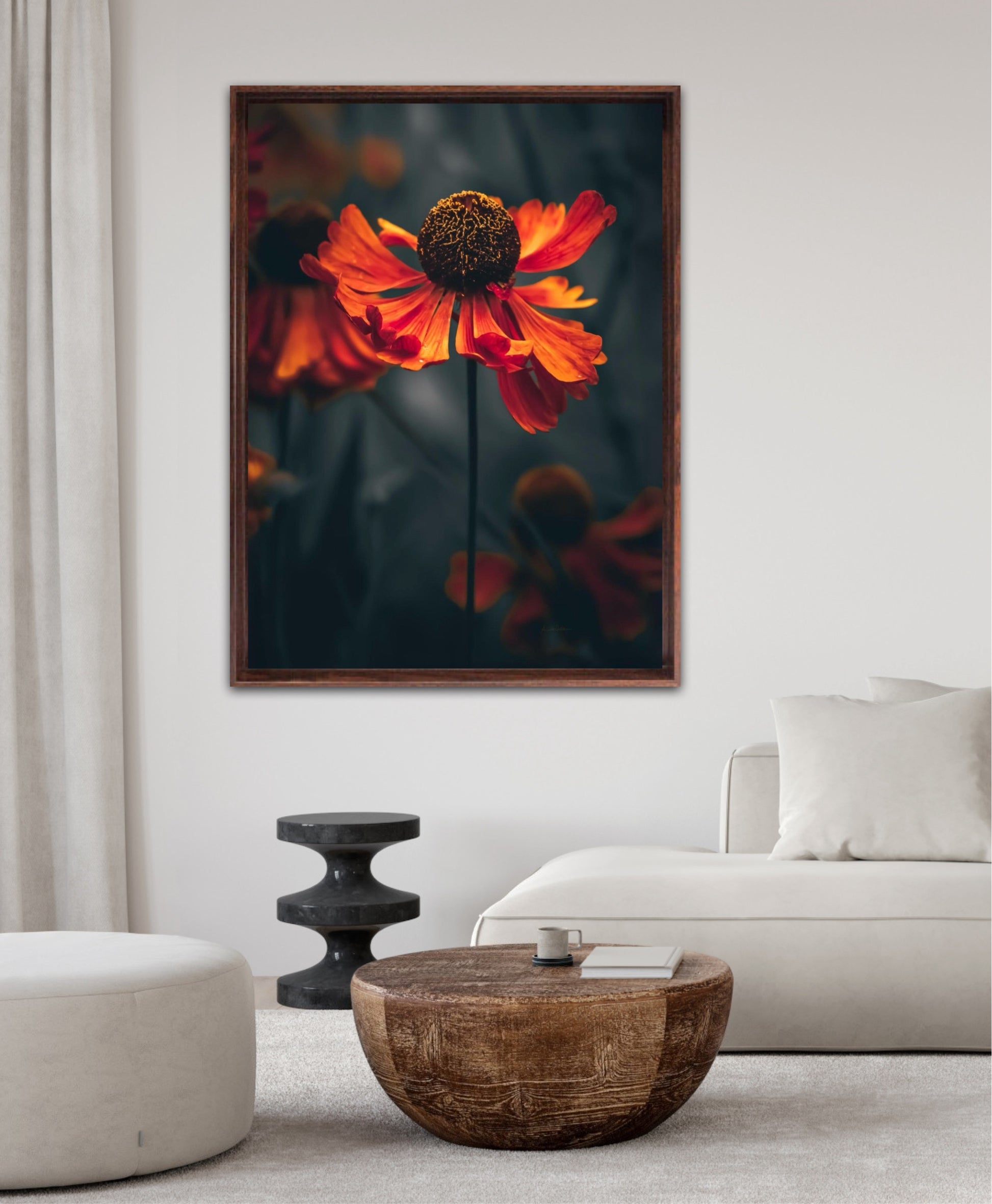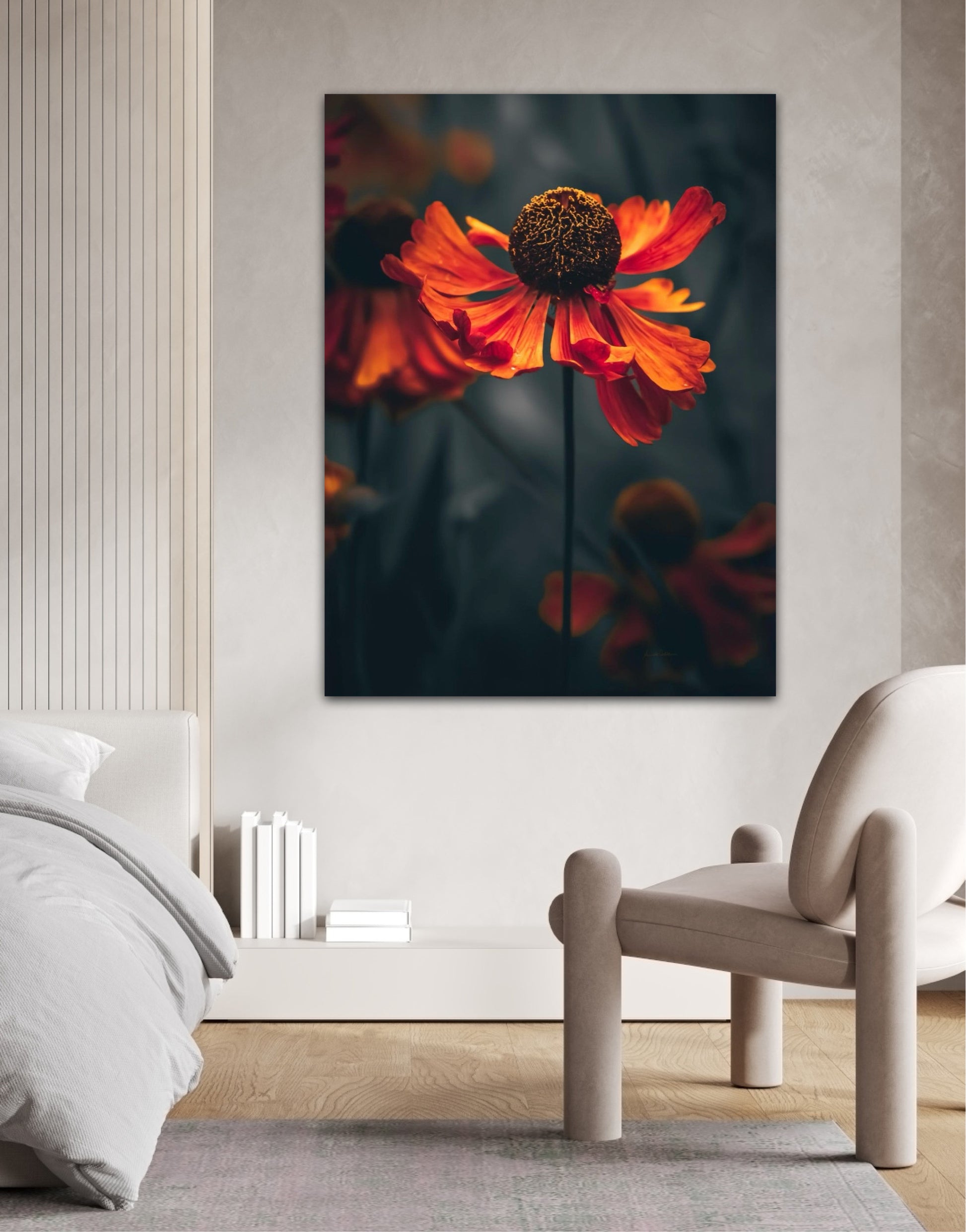Beautiful photographic wall art of a gorgeous autumn solstice flower on a dark bluegrey background. This art piece will lift you up.