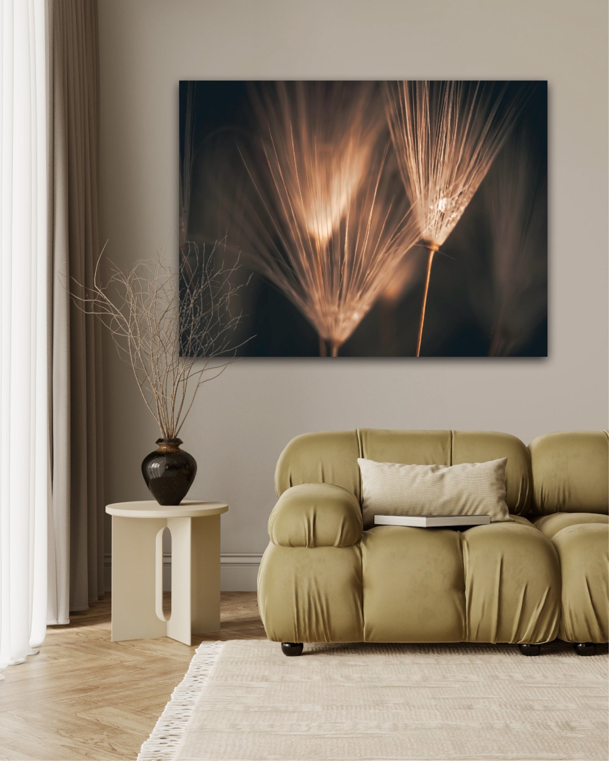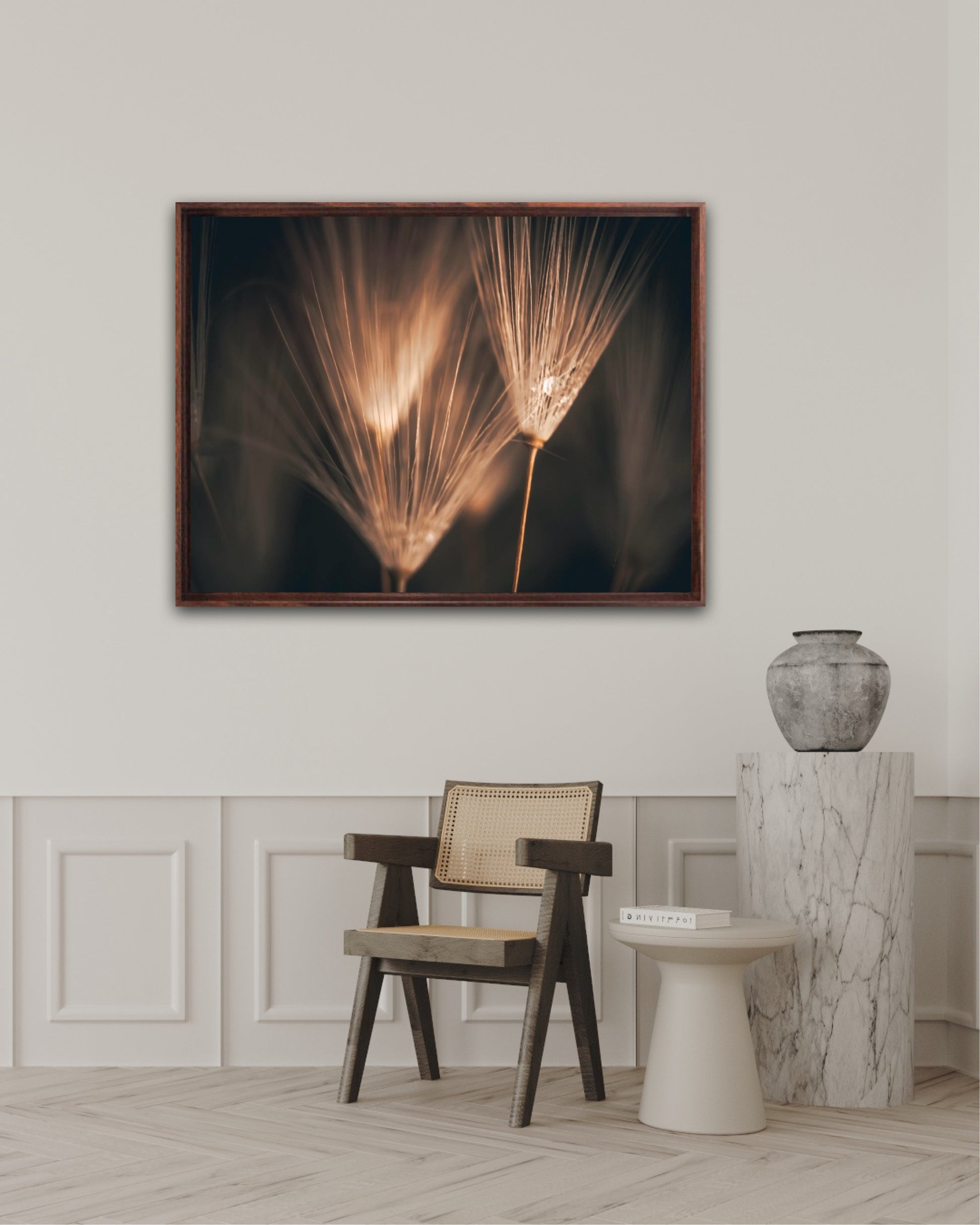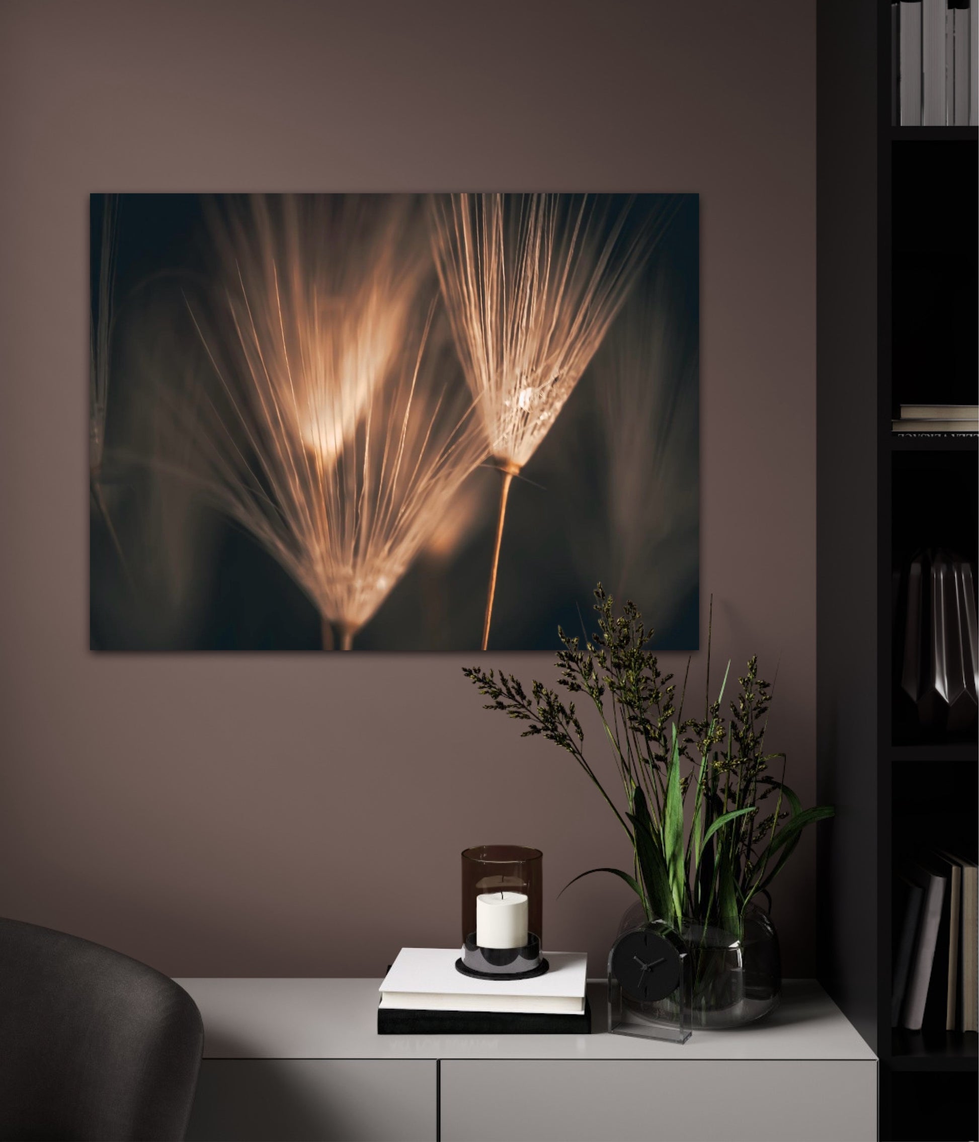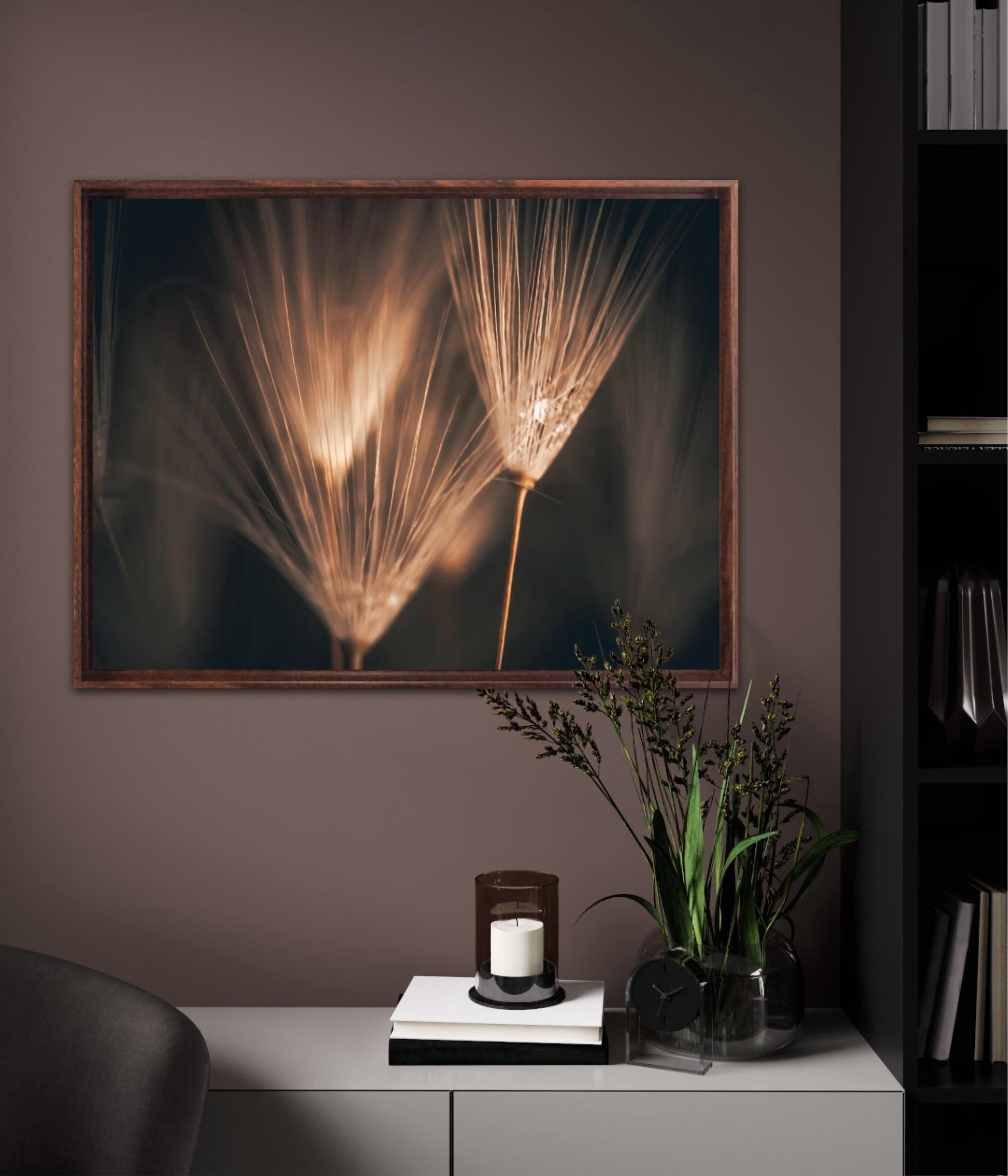 Beautiful photographic wall art of dandelion seed in beautiful tones of brown and light brown on a dark background. This phoo really has amazing atmosphere! Bring peace to your home with this beautiful artwork, and order today!