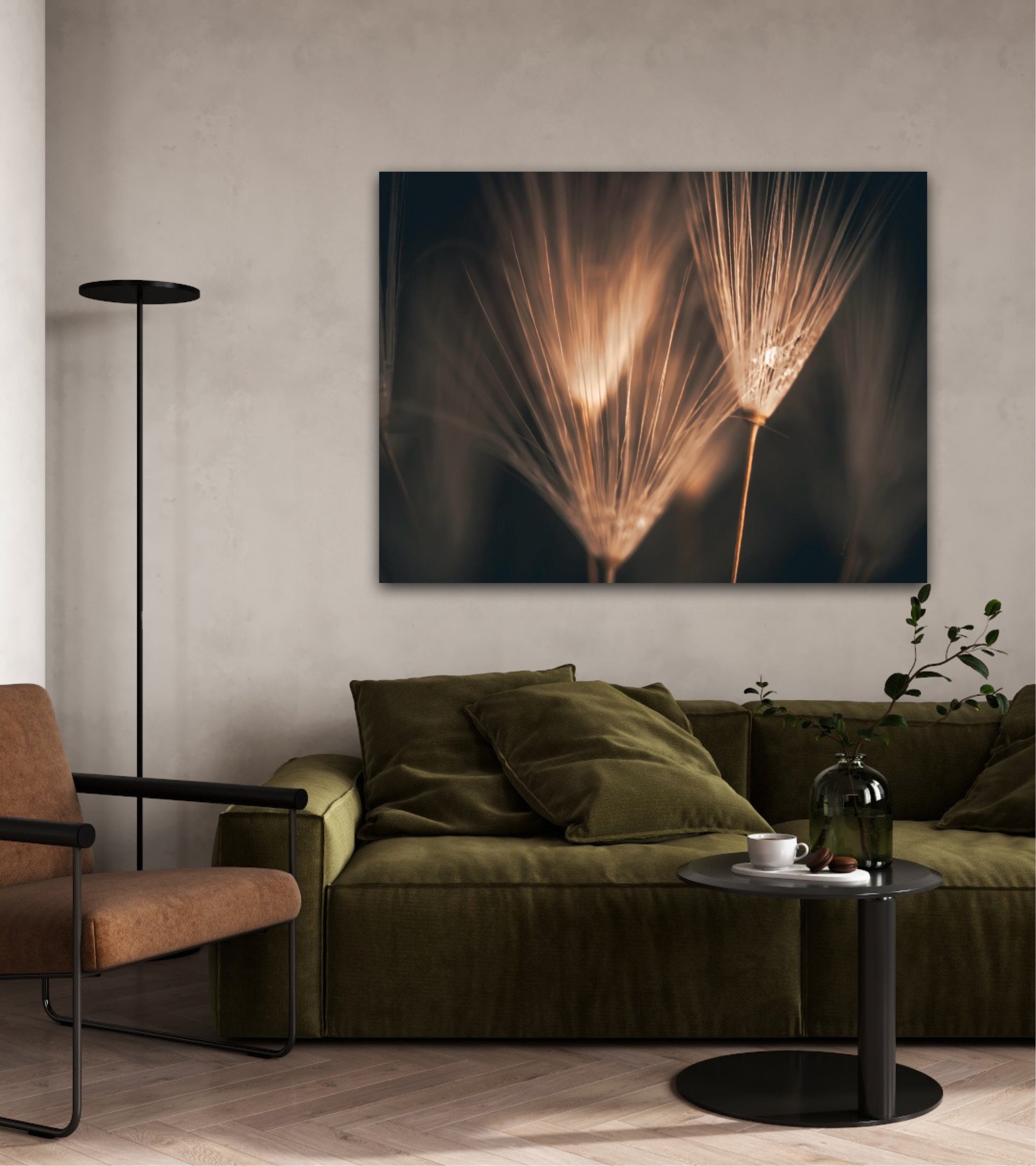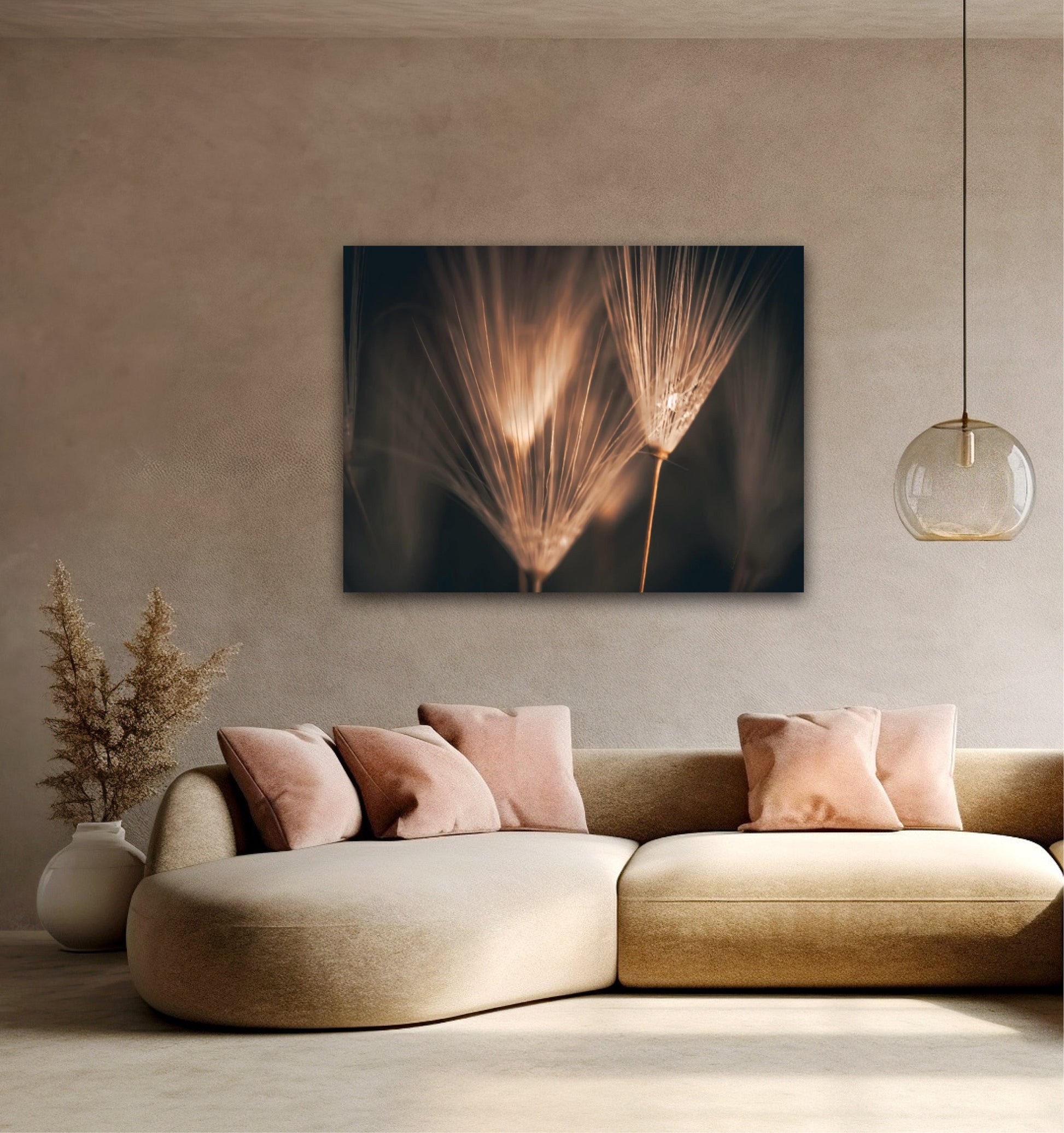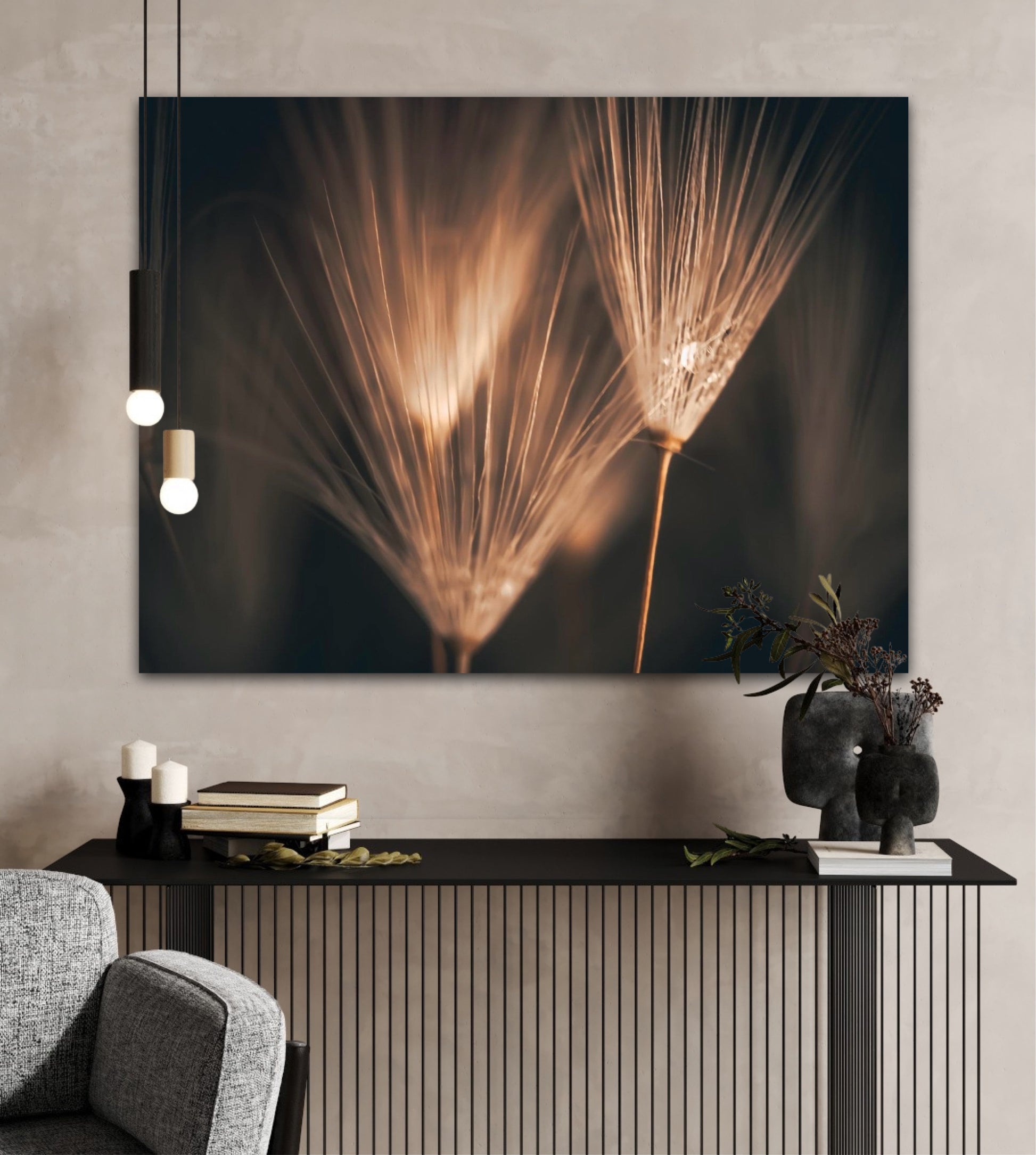 Beautiful photographic wall art of dandelion seed in beautiful tones of brown and light brown on a dark background. This phoo really has amazing atmosphere! Bring peace to your home with this beautiful artwork, and order today!