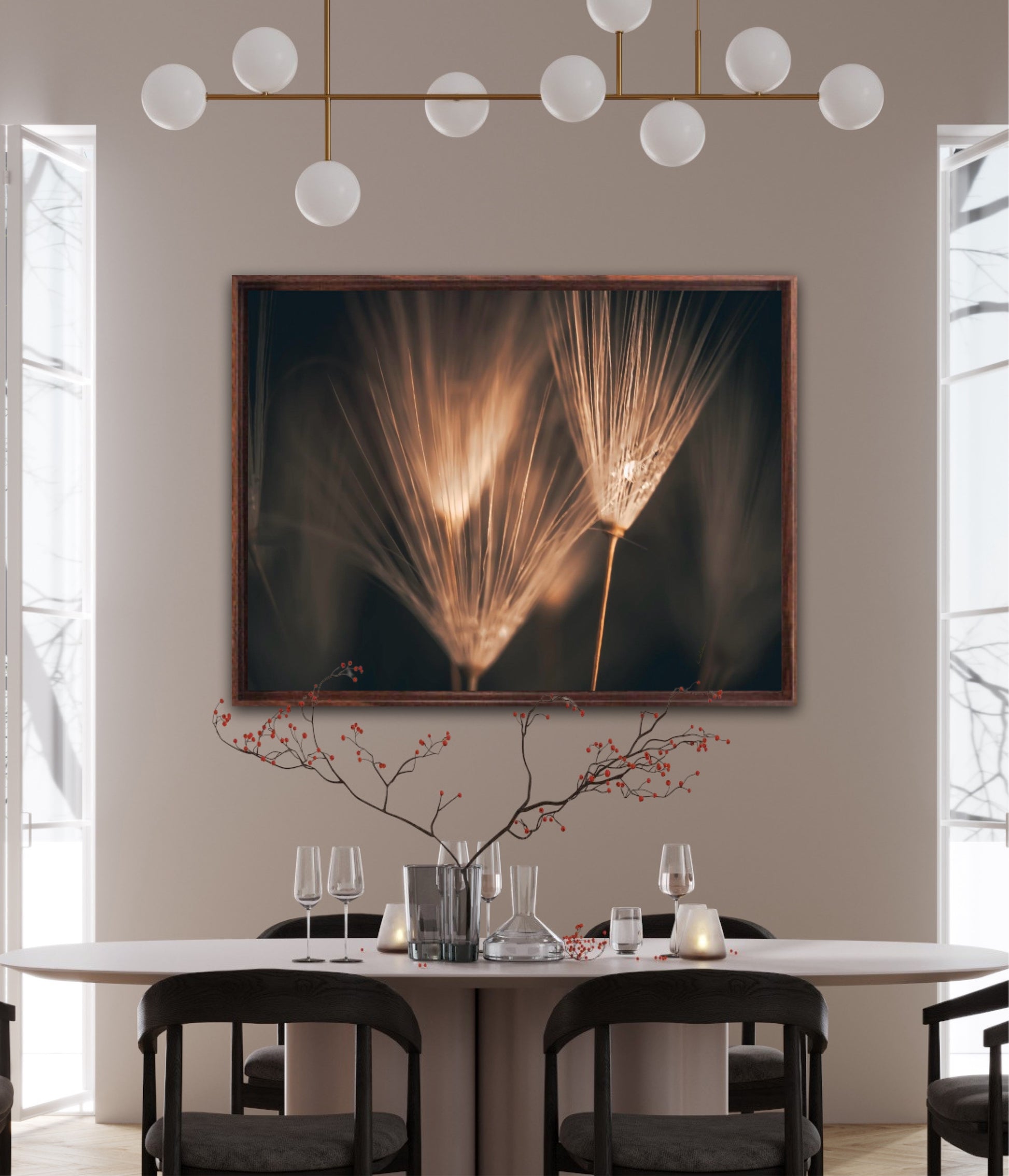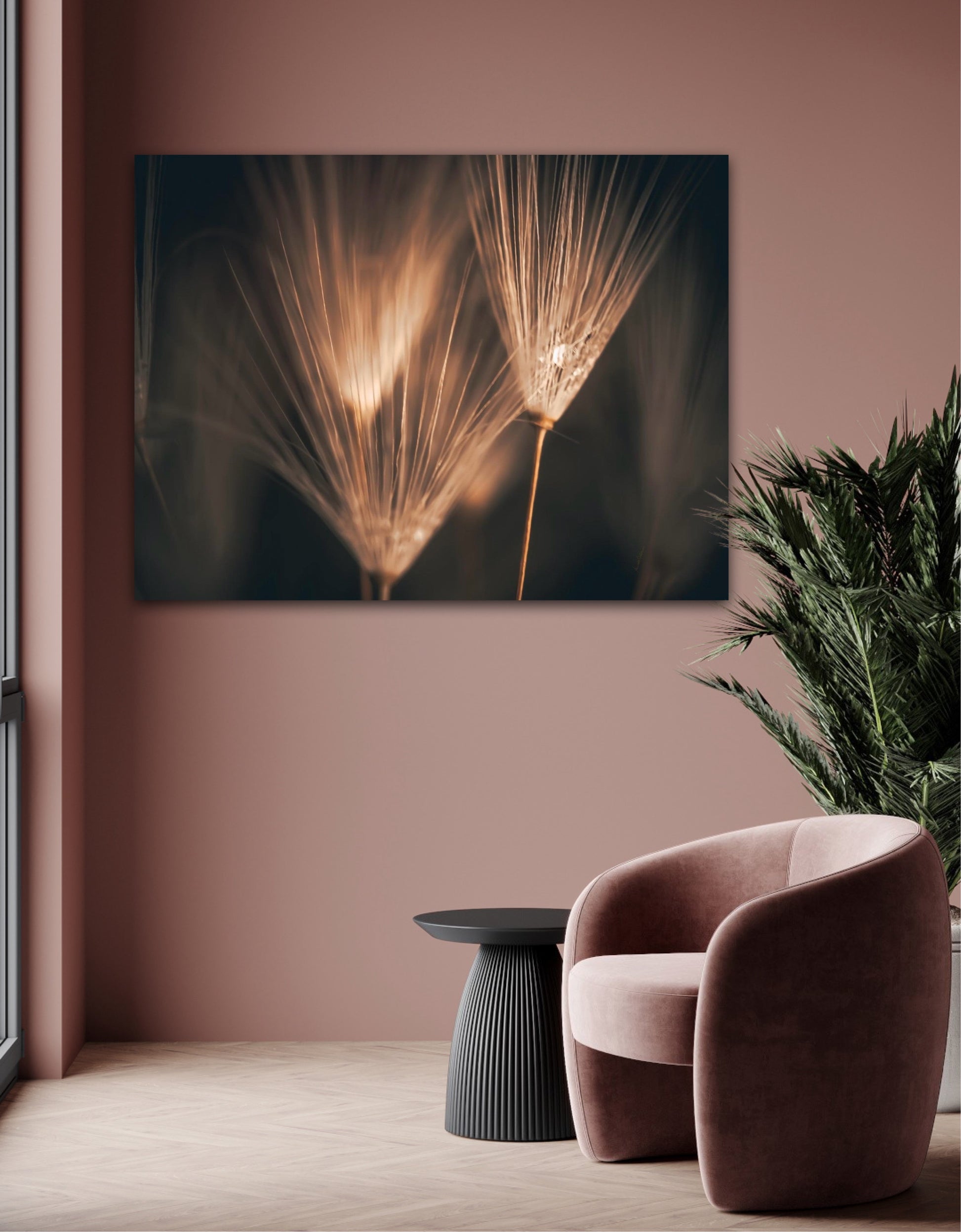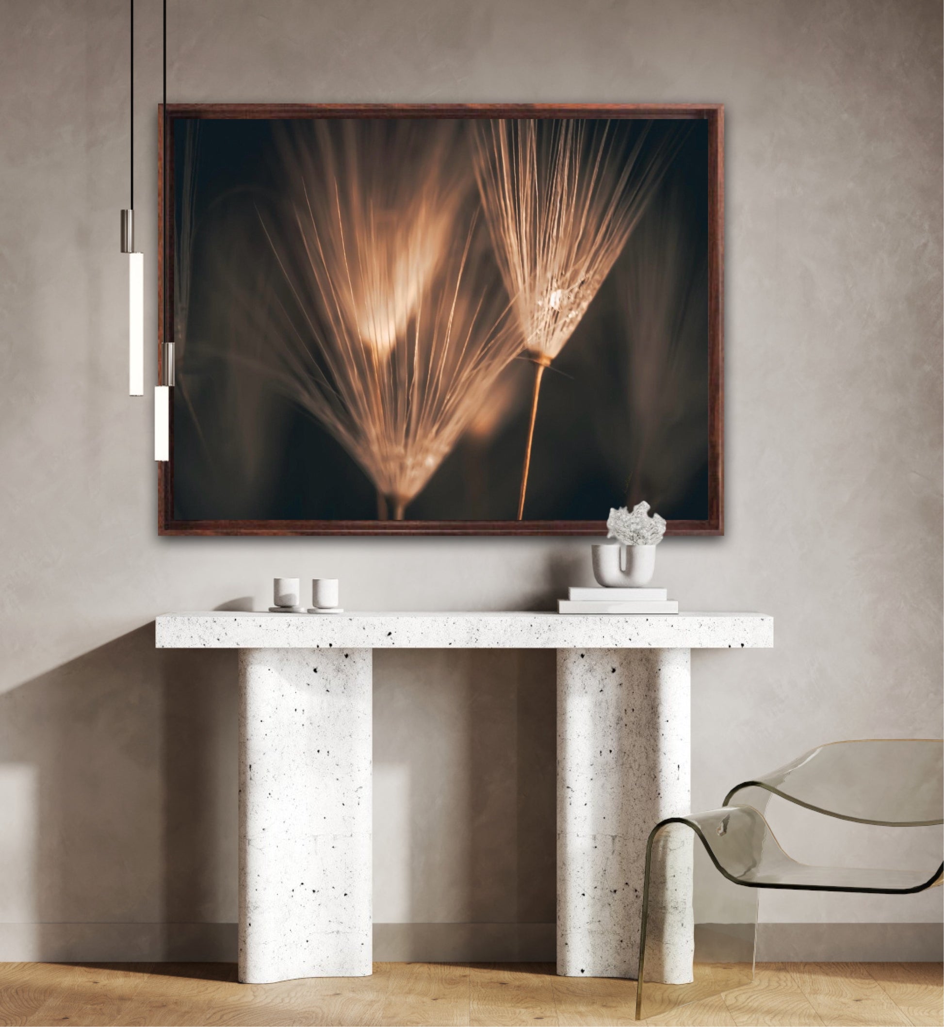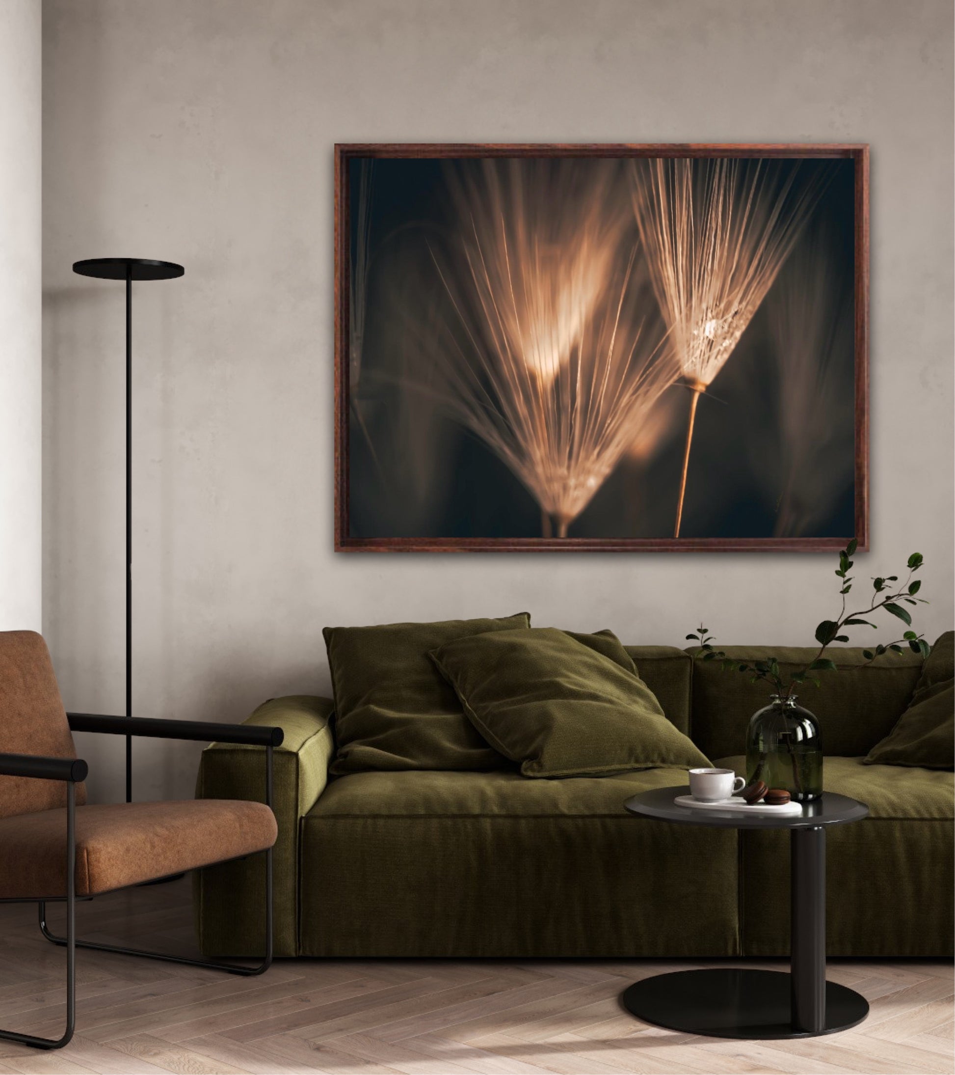 Beautiful photographic wall art of dandelion seed in beautiful tones of brown and light brown on a dark background. This phoo really has amazing atmosphere! Bring peace to your home with this beautiful artwork, and order today!