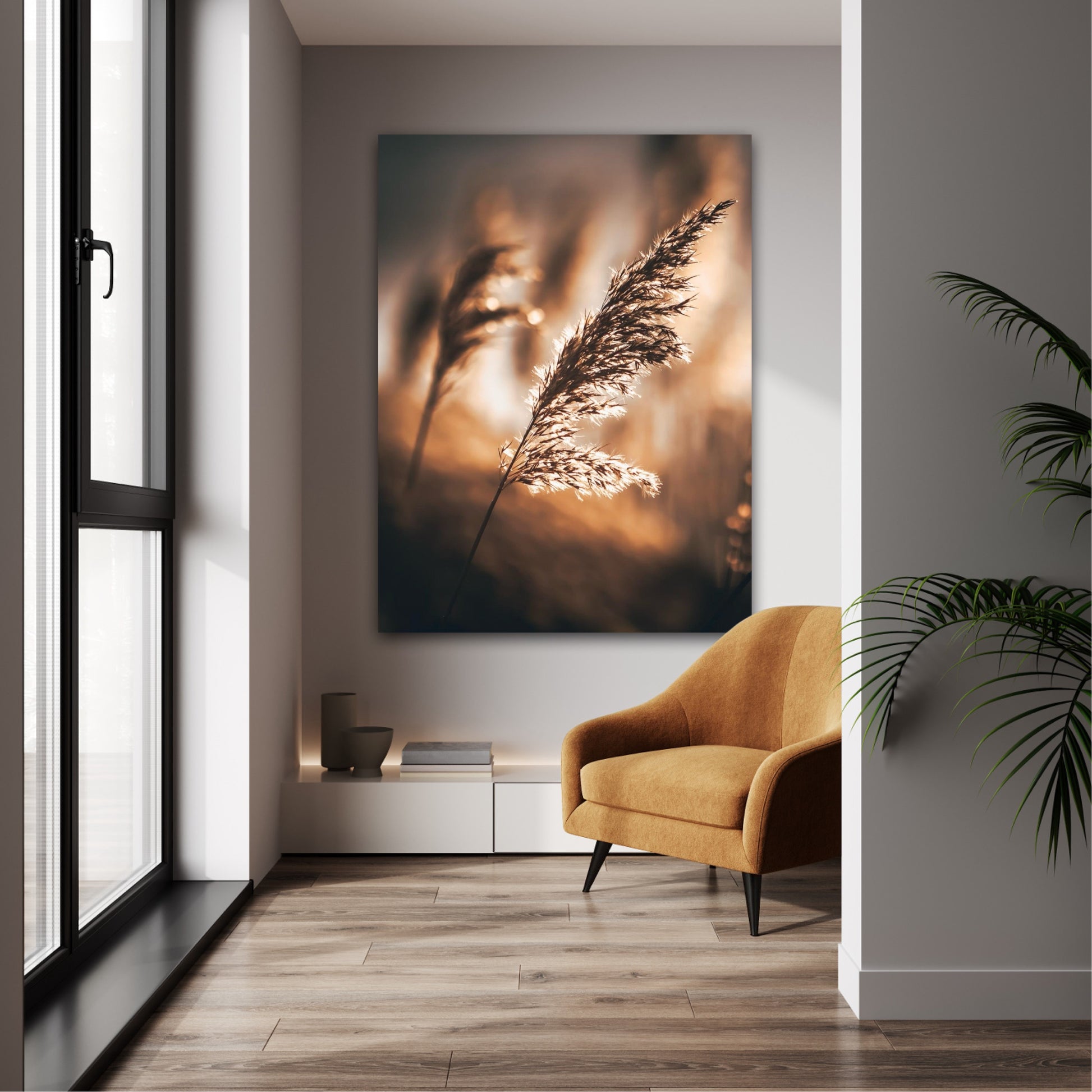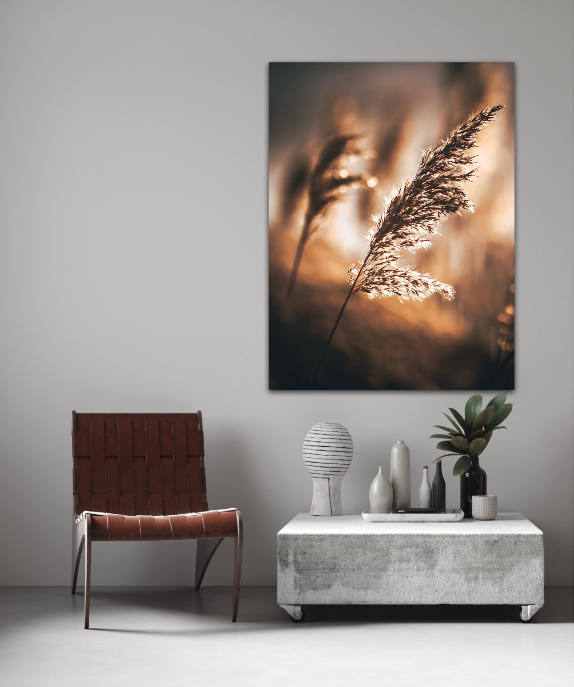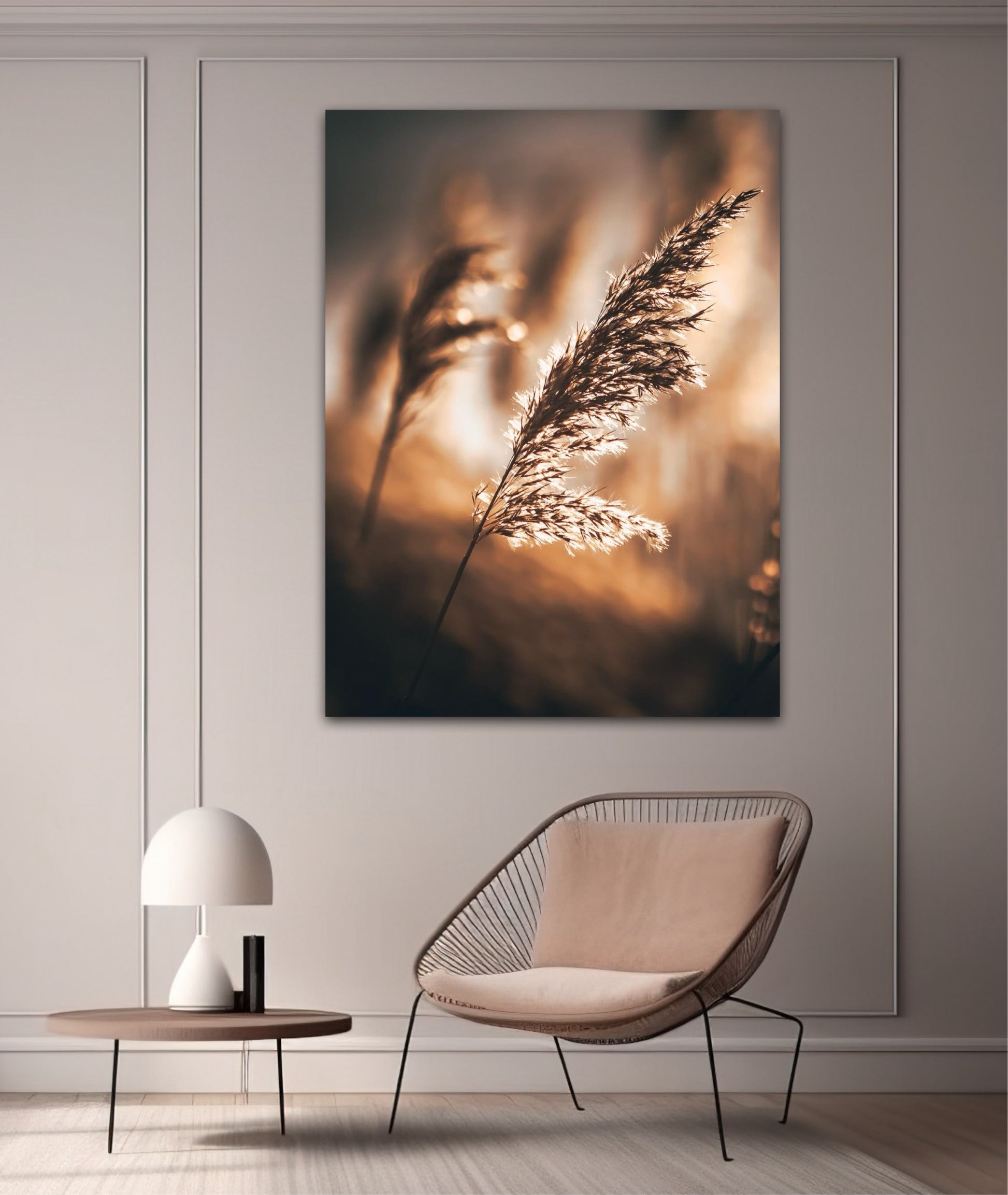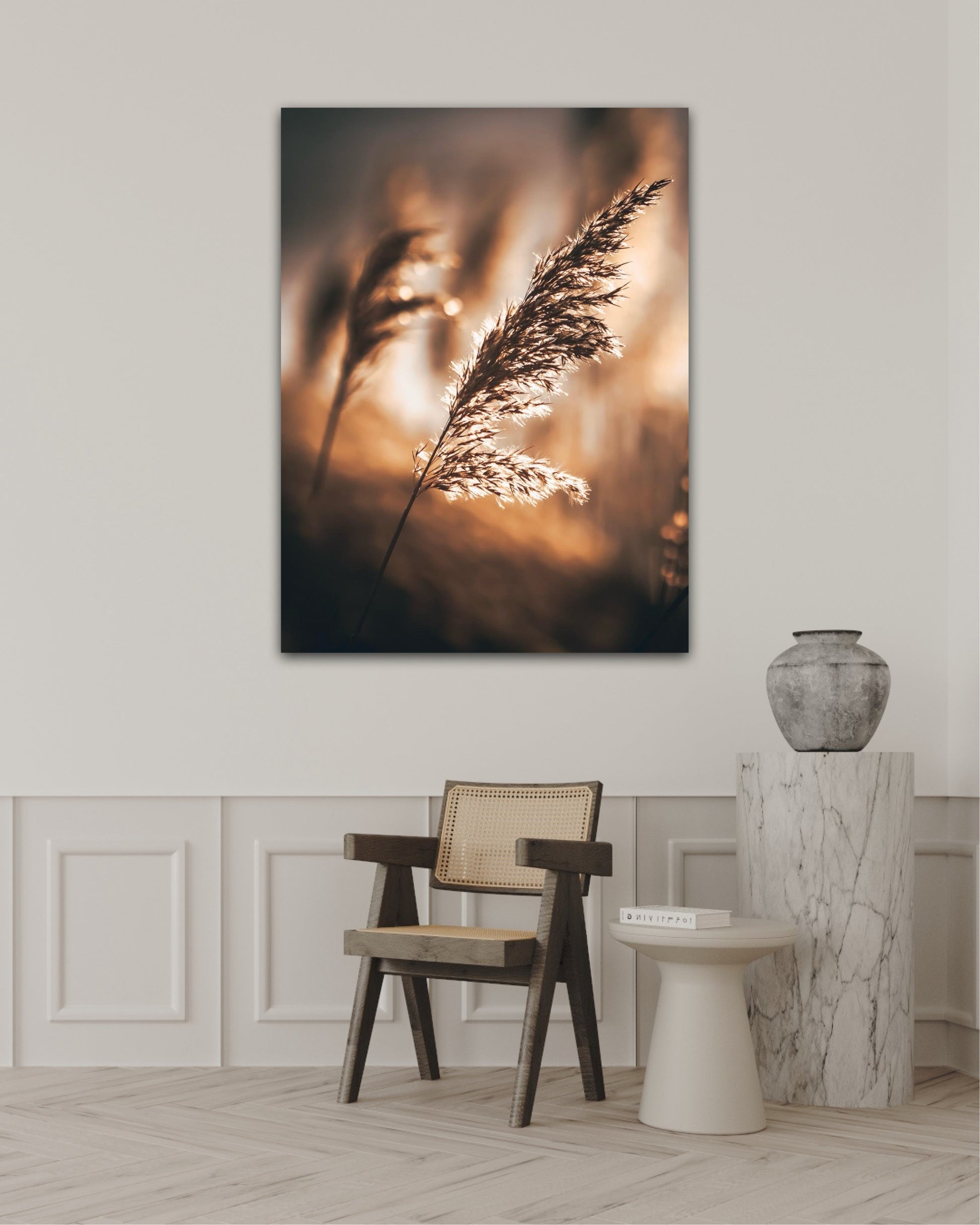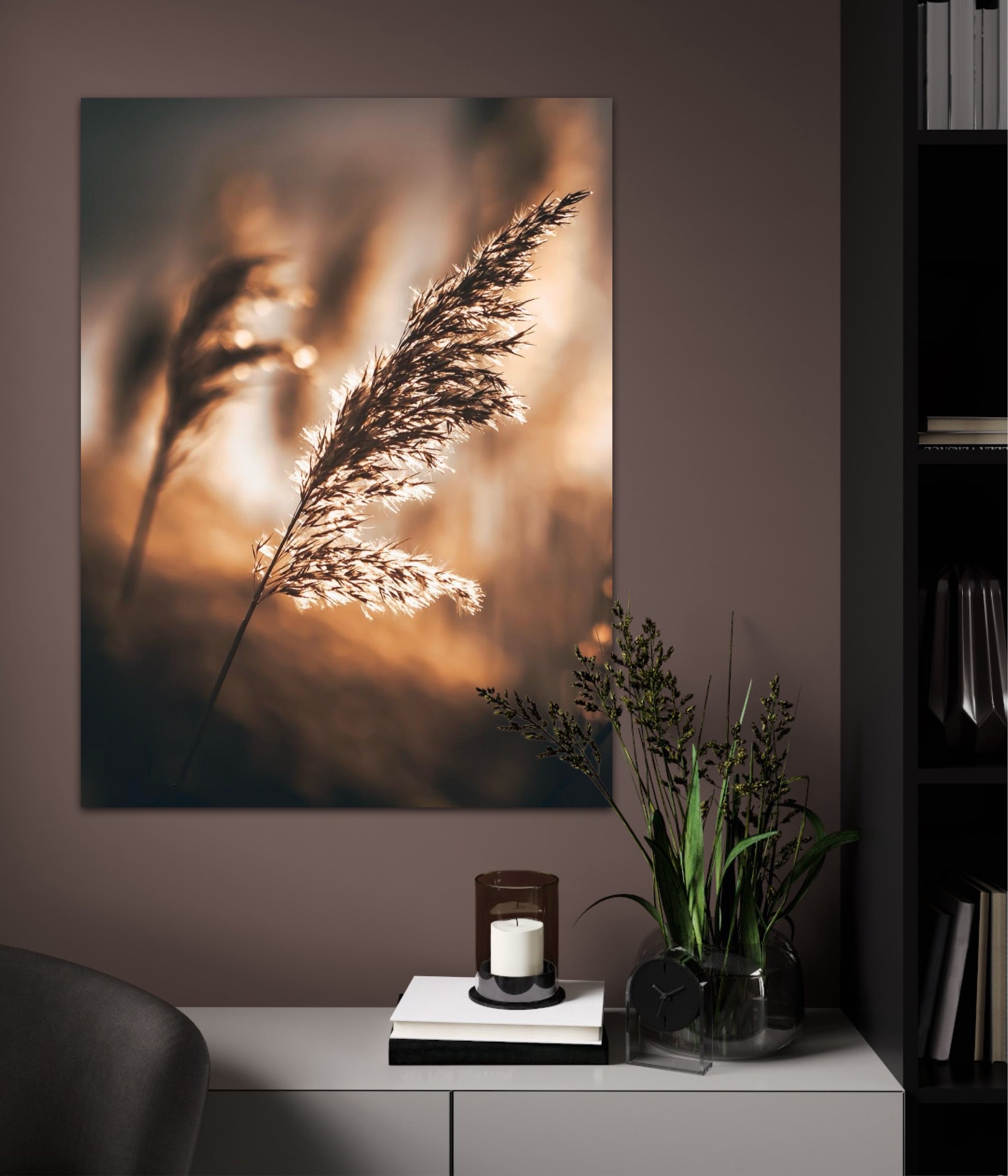 Beautiful photographic wall art of a straw at the waterfront during sunset. Magical, wonderful colours and light will bring great atmosphere to your home.