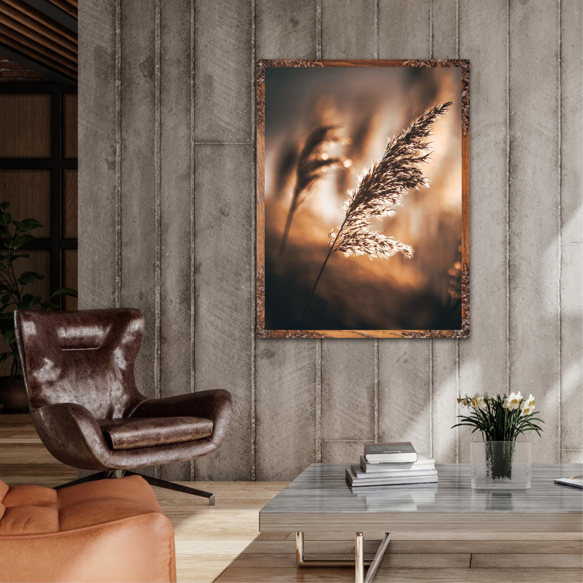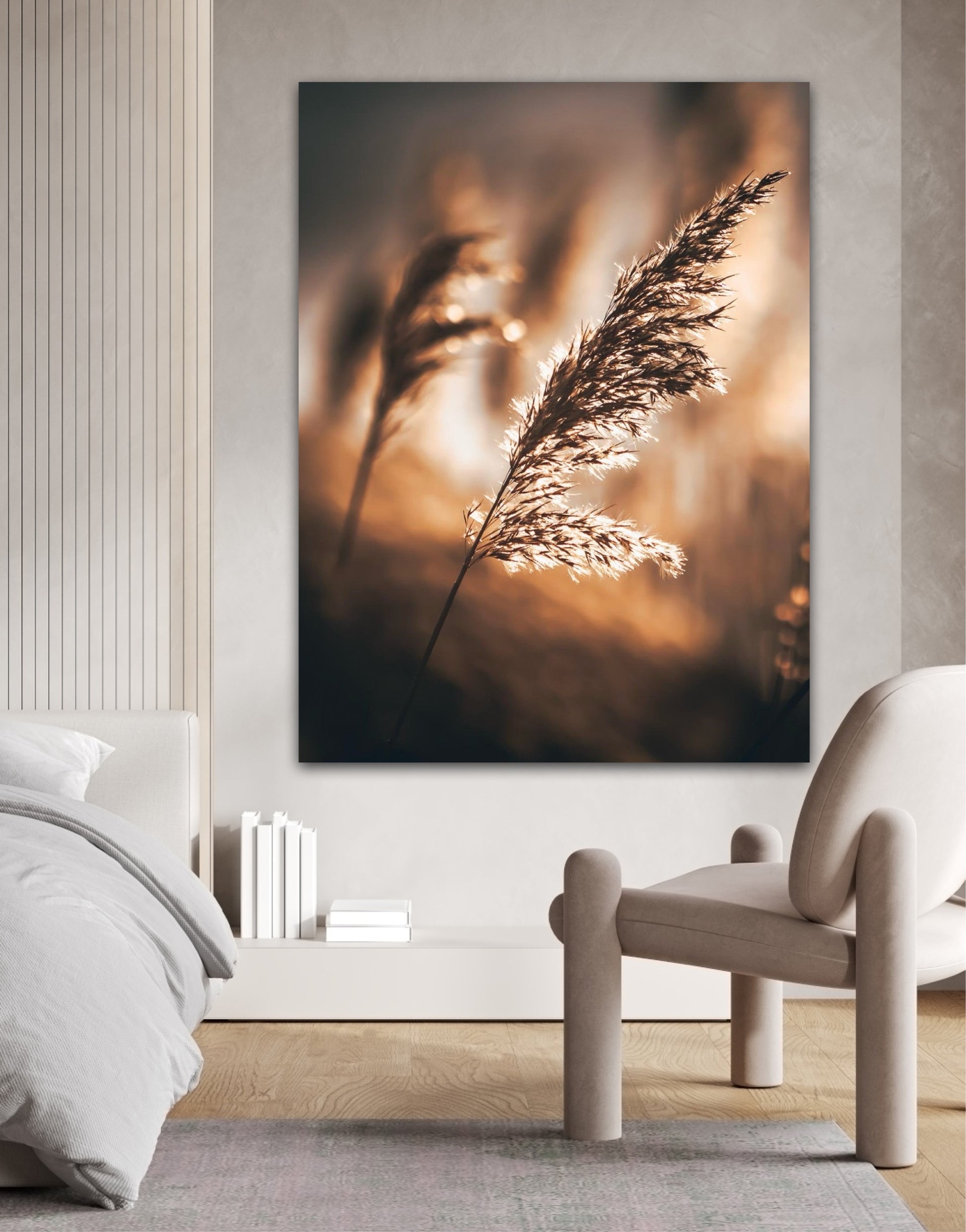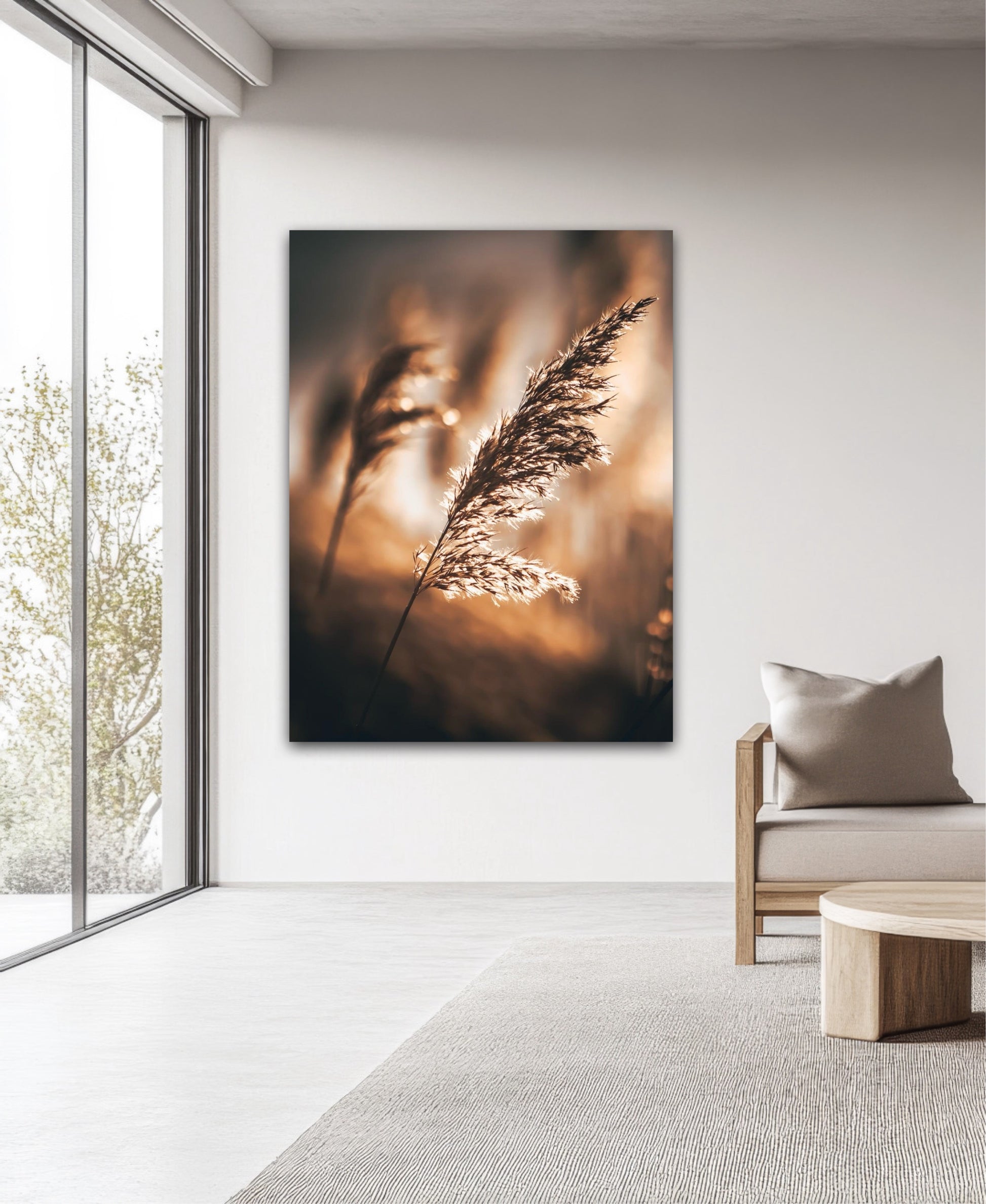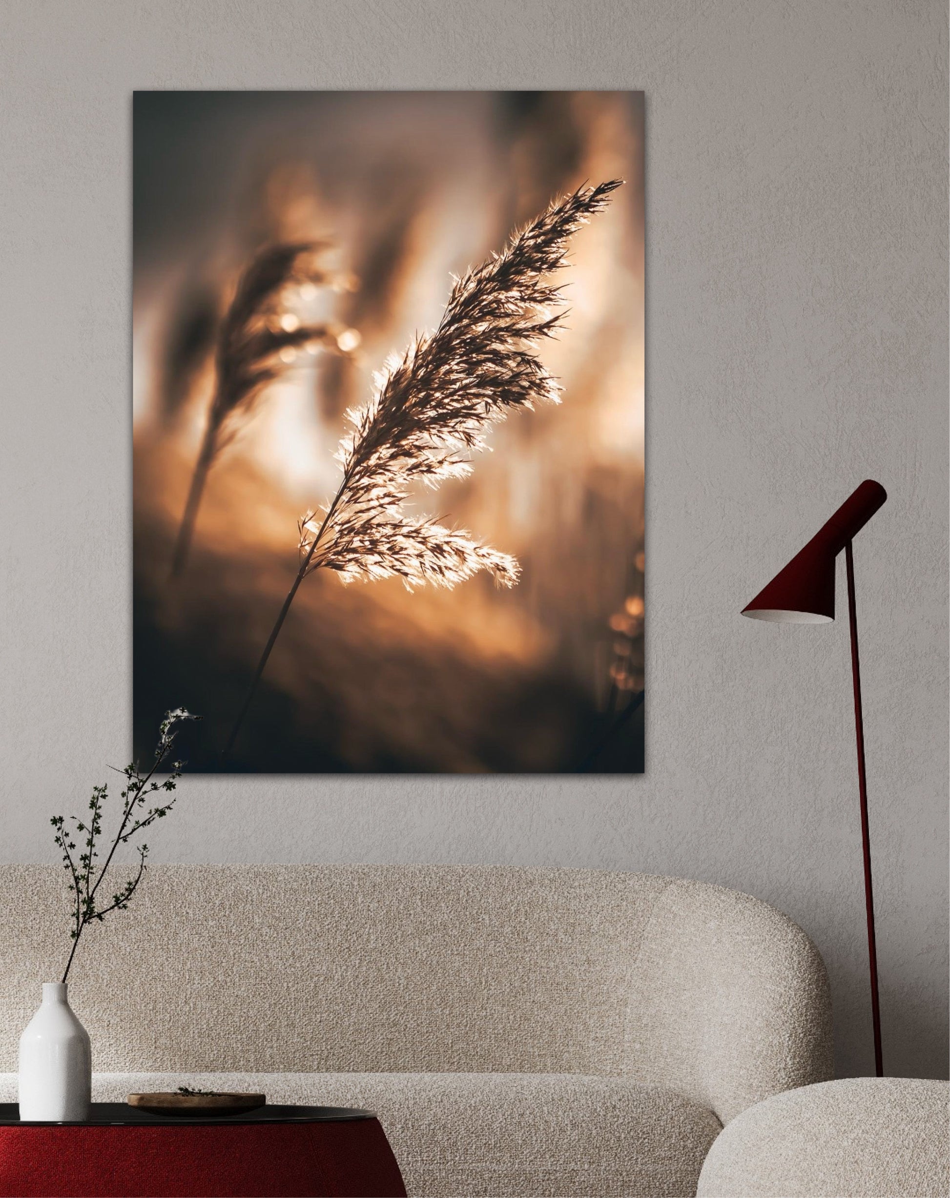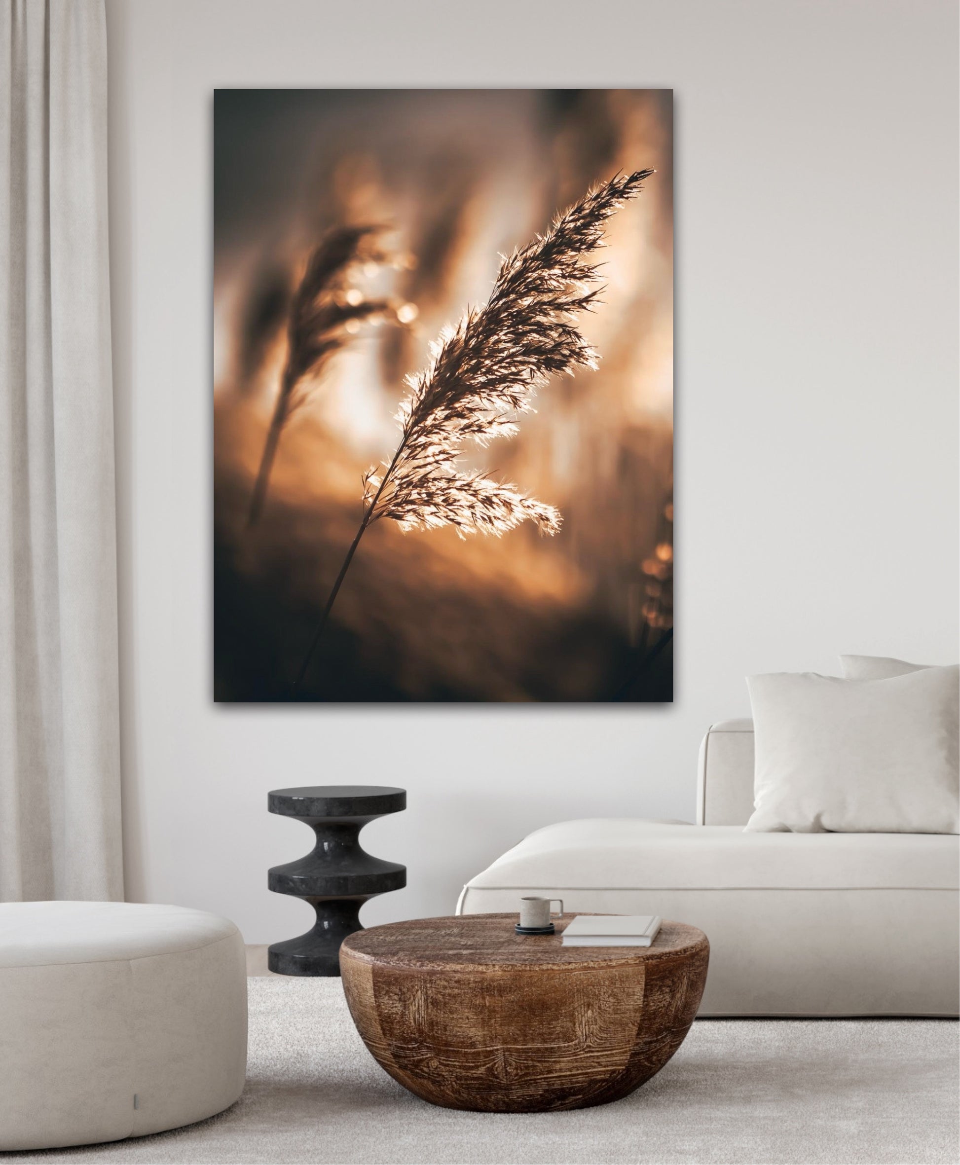 Beautiful photographic wall art of a straw at the waterfront during sunset. Magical, wonderful colours and light will bring great atmosphere to your home.