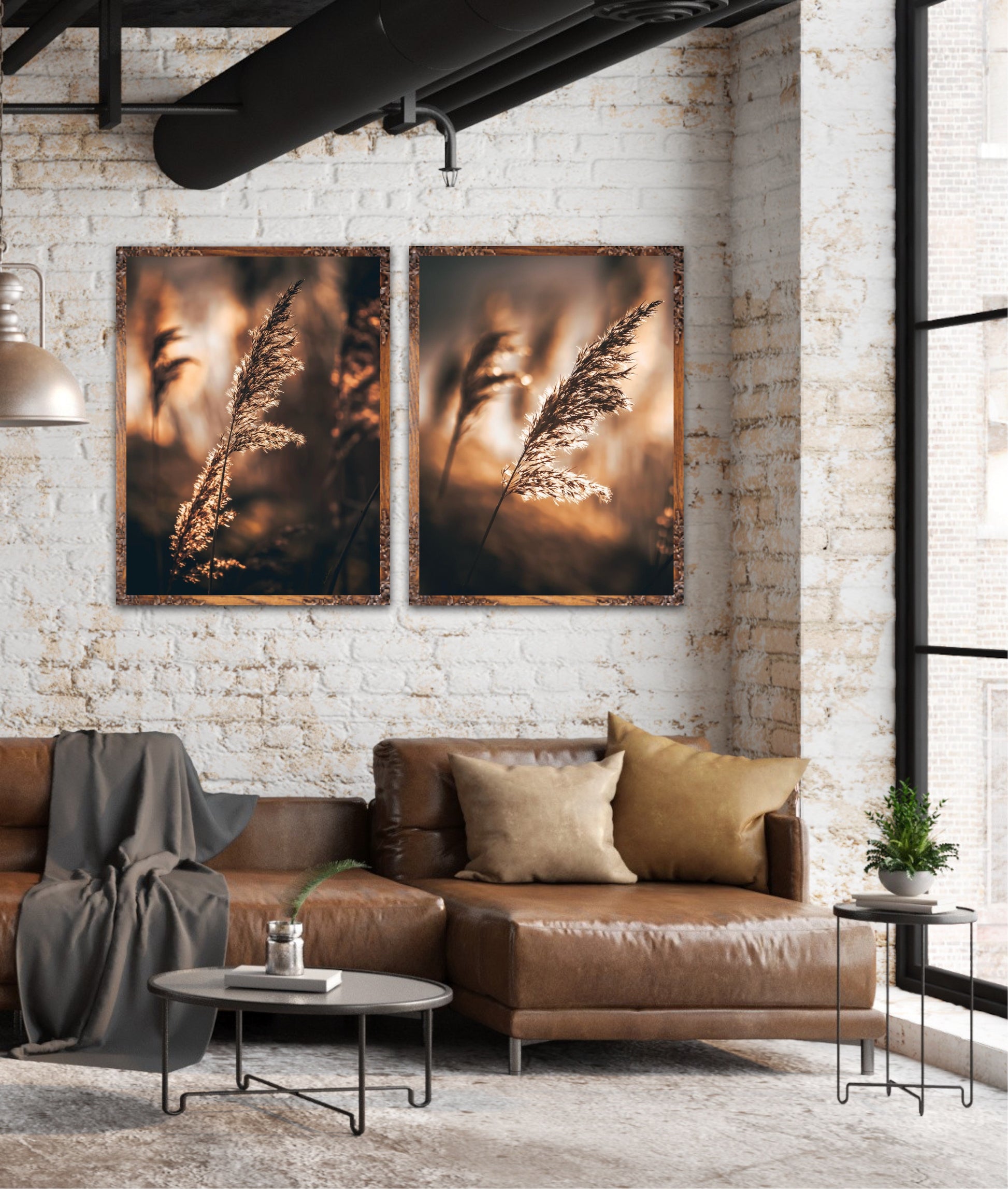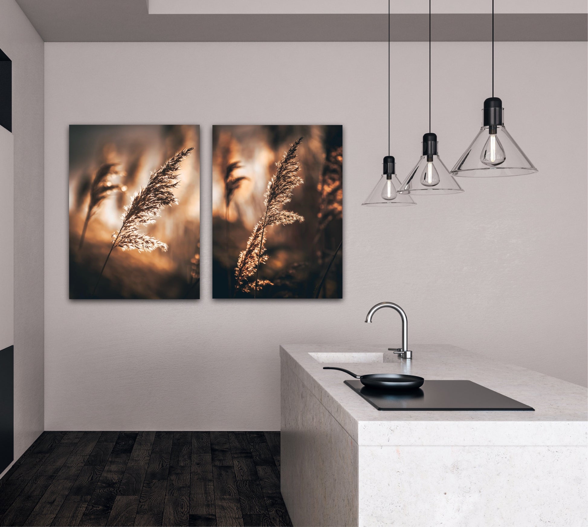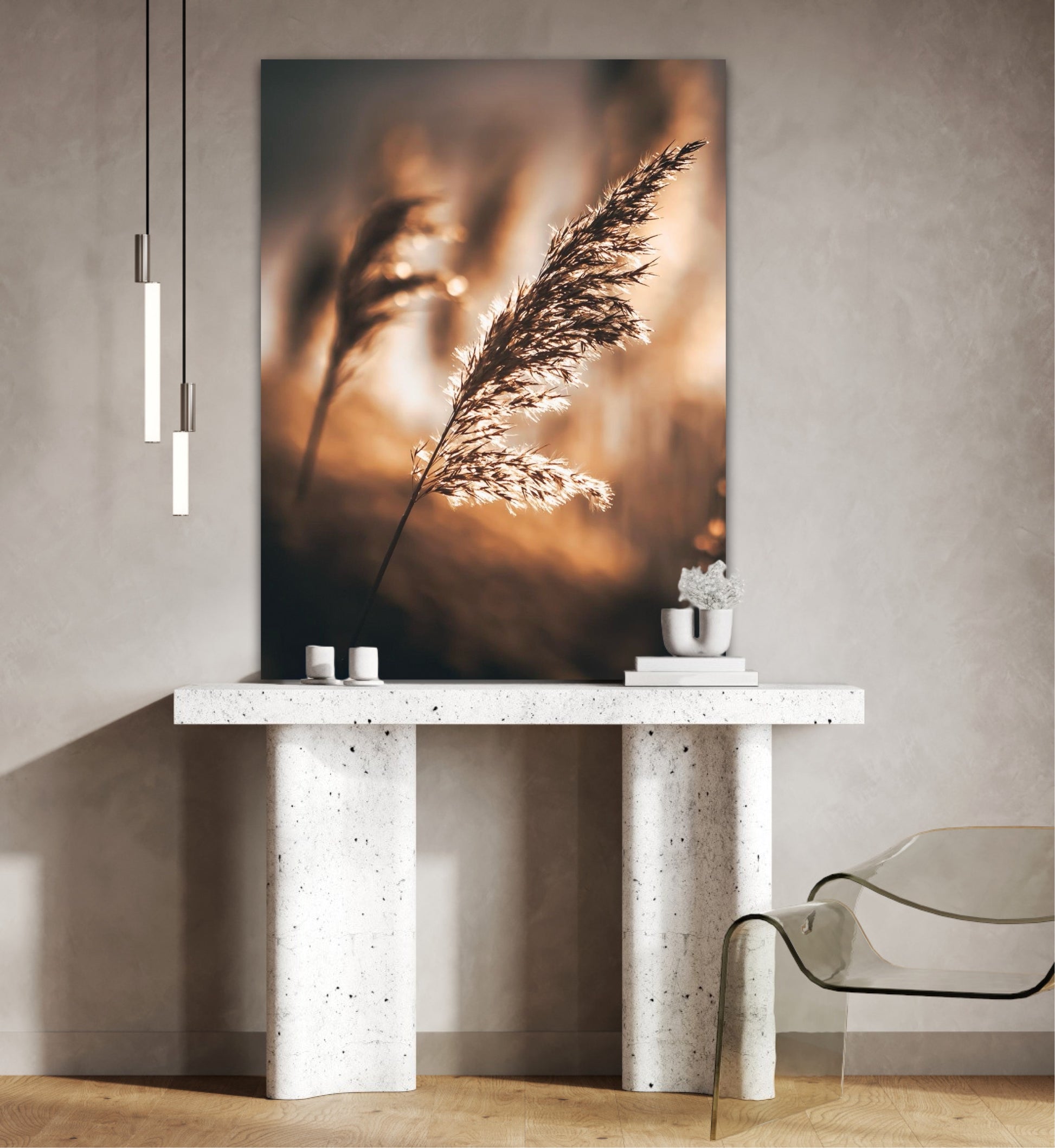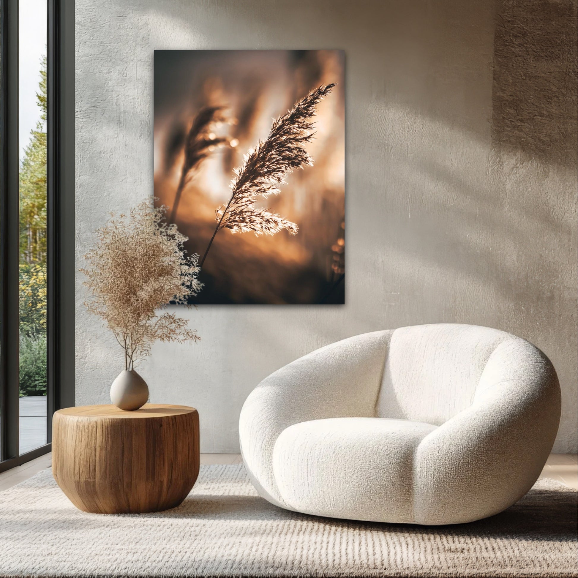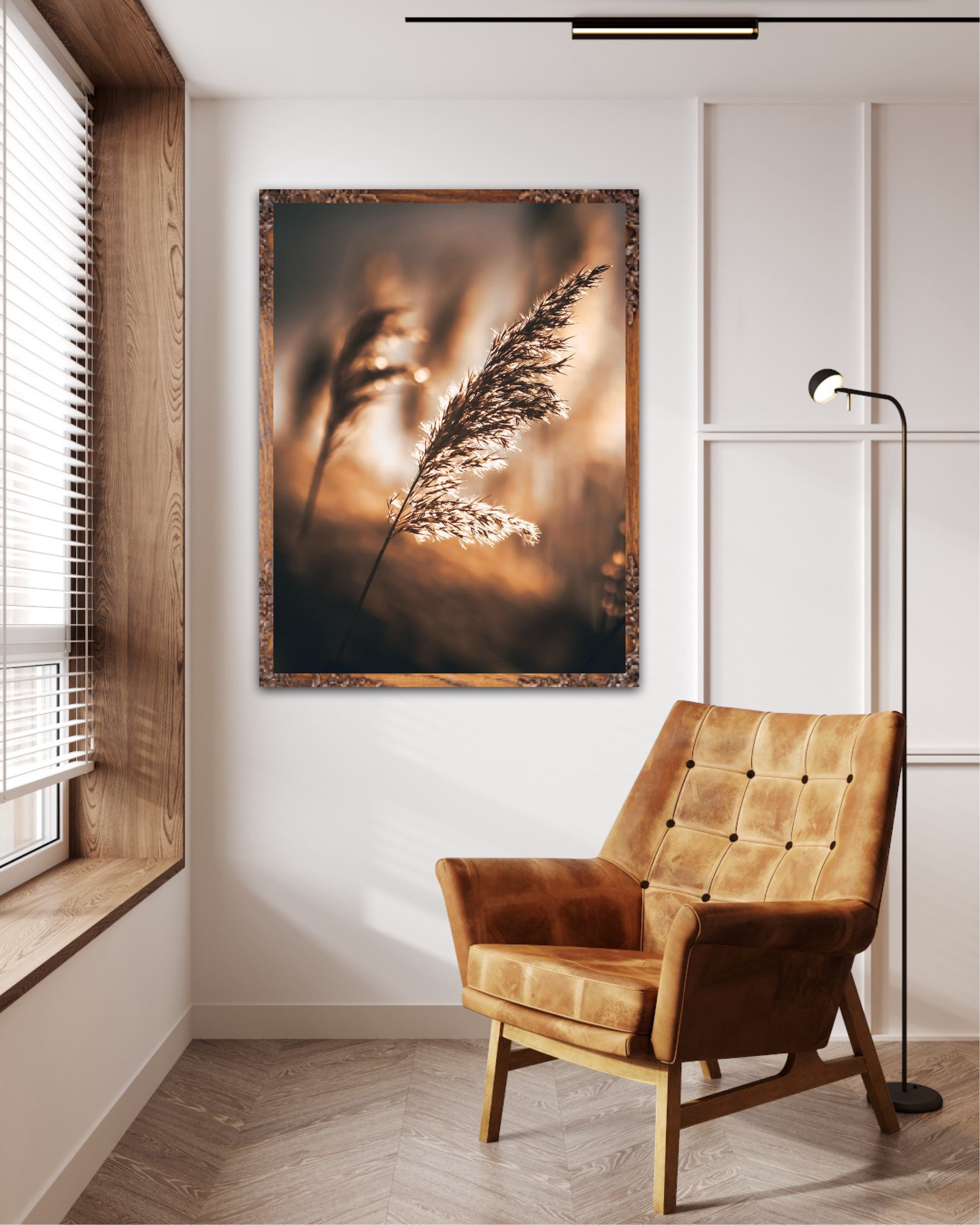 Beautiful photographic wall art of a straw at the waterfront during sunset. Magical, wonderful colours and light will bring great atmosphere to your home.