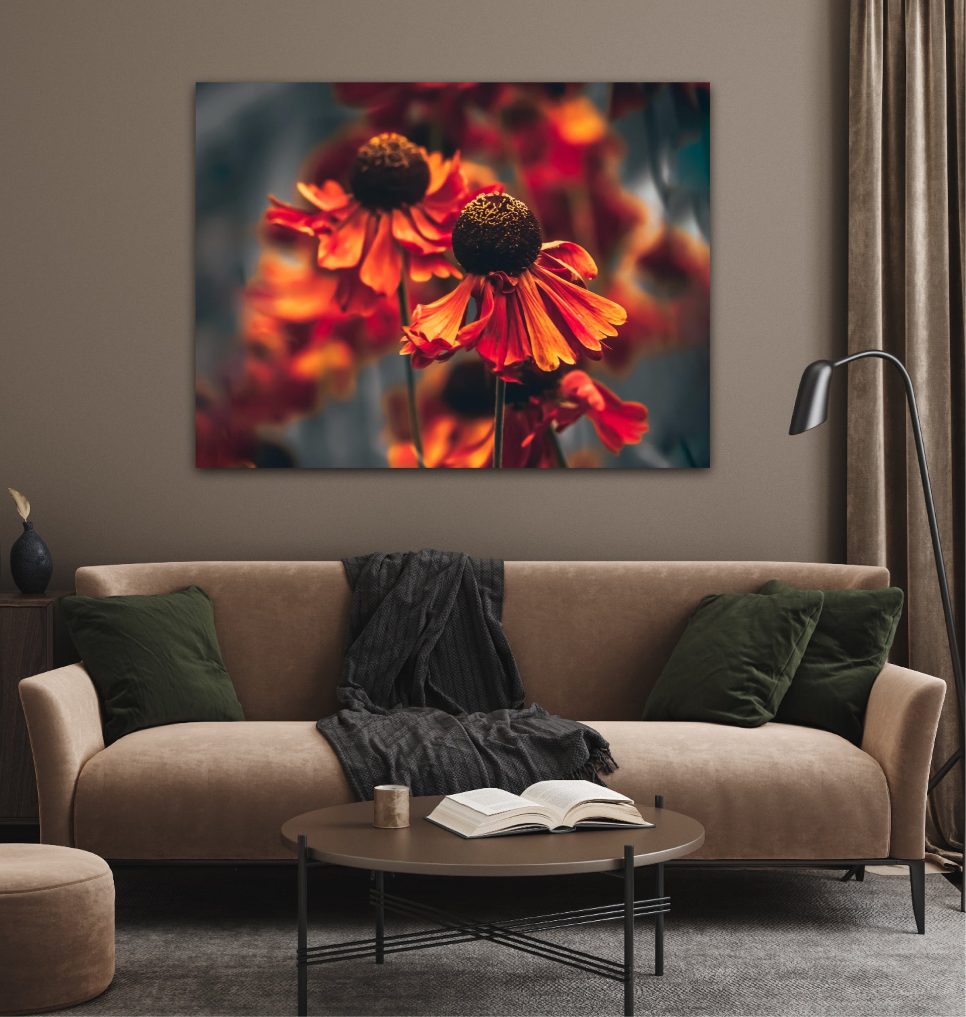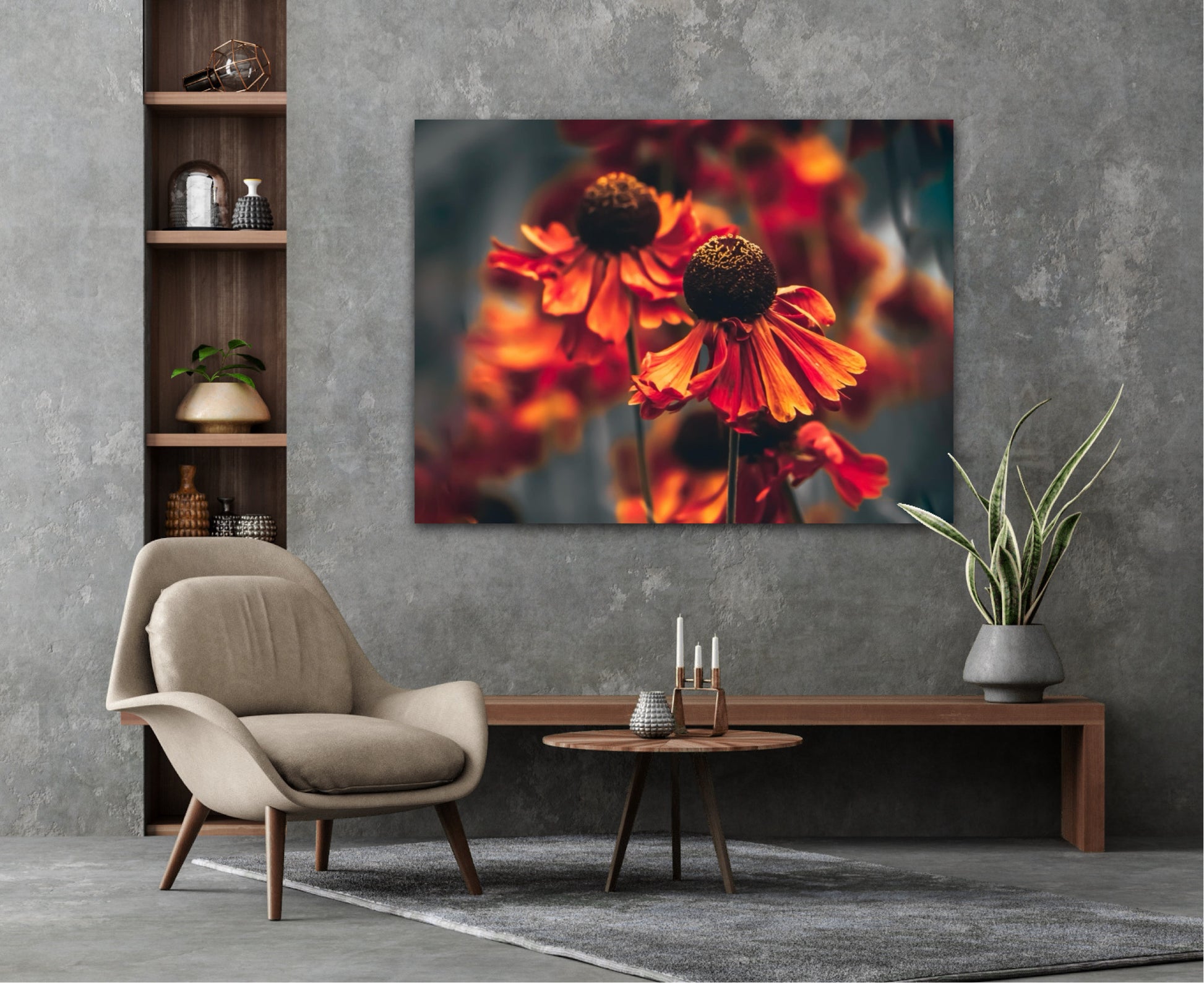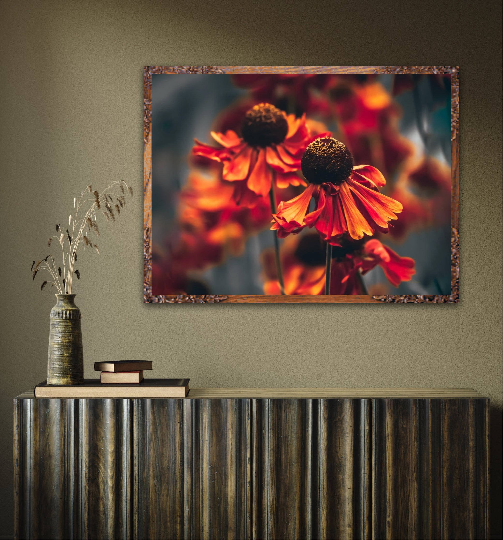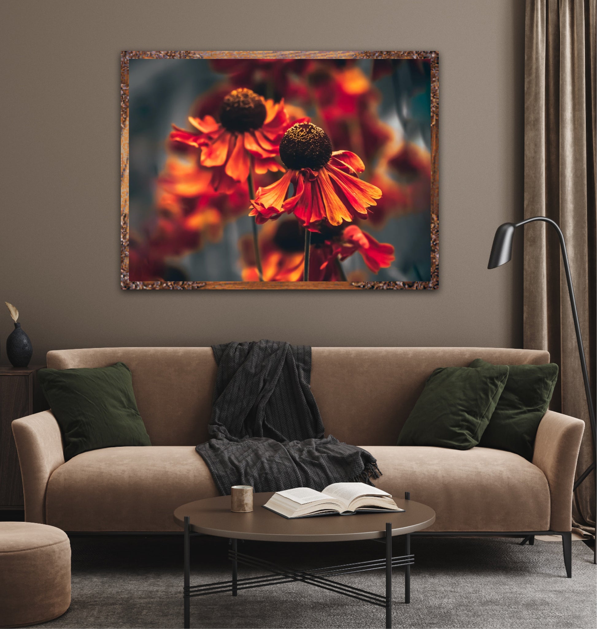 Beautiful photographic wall art of two magnificent sunflowers against a backdrop of several other flowers. This is a colourful and fresh image that will give you strength and joy for many years.