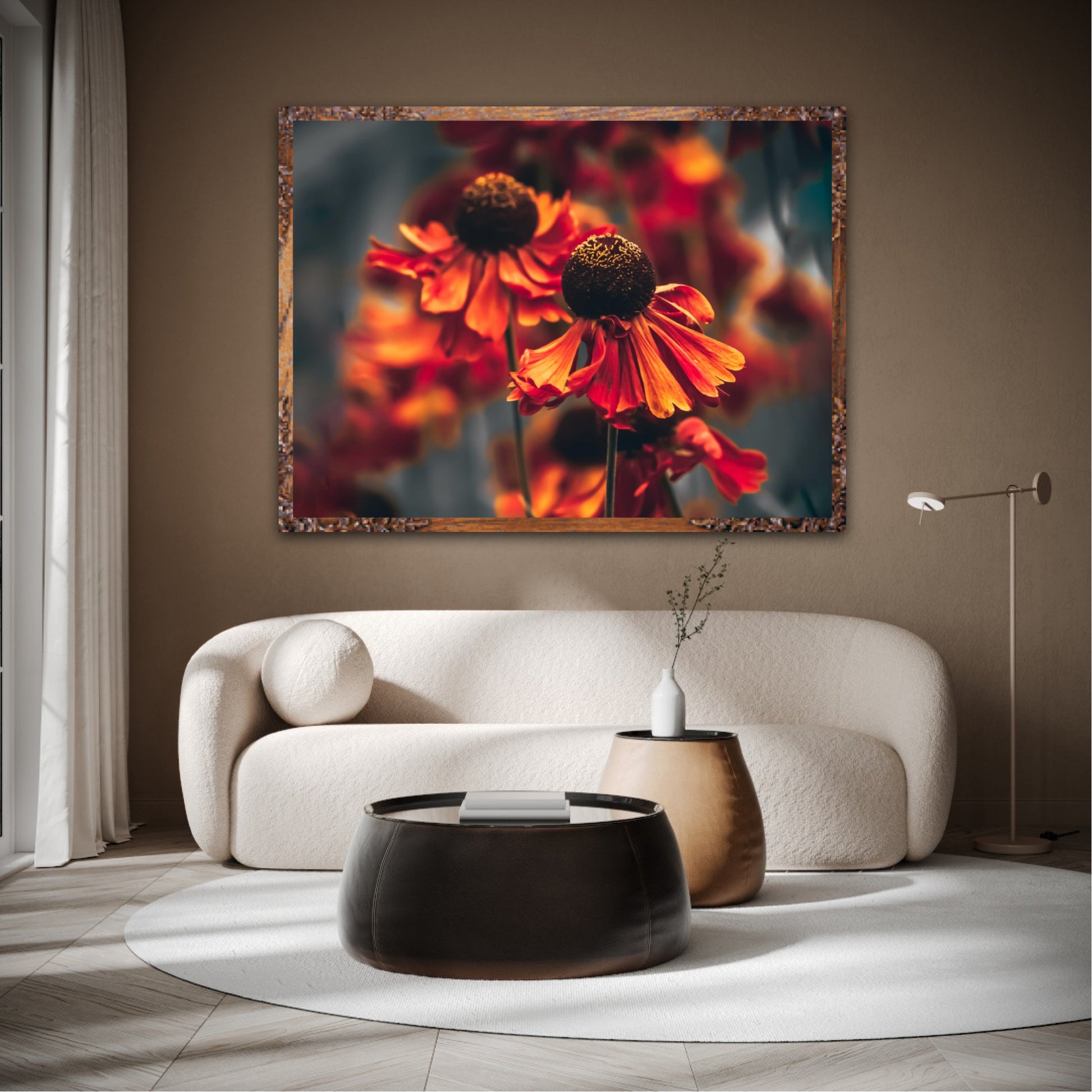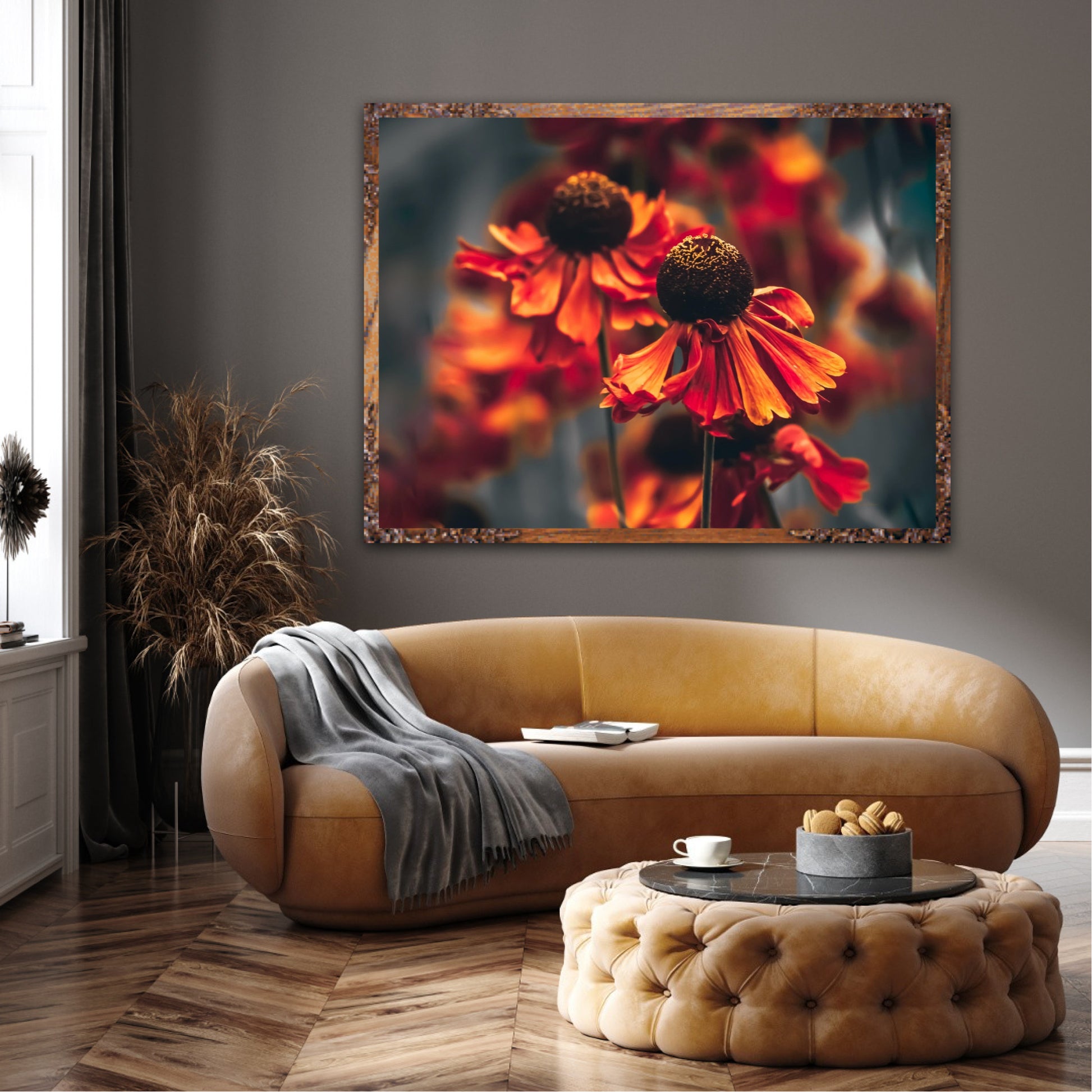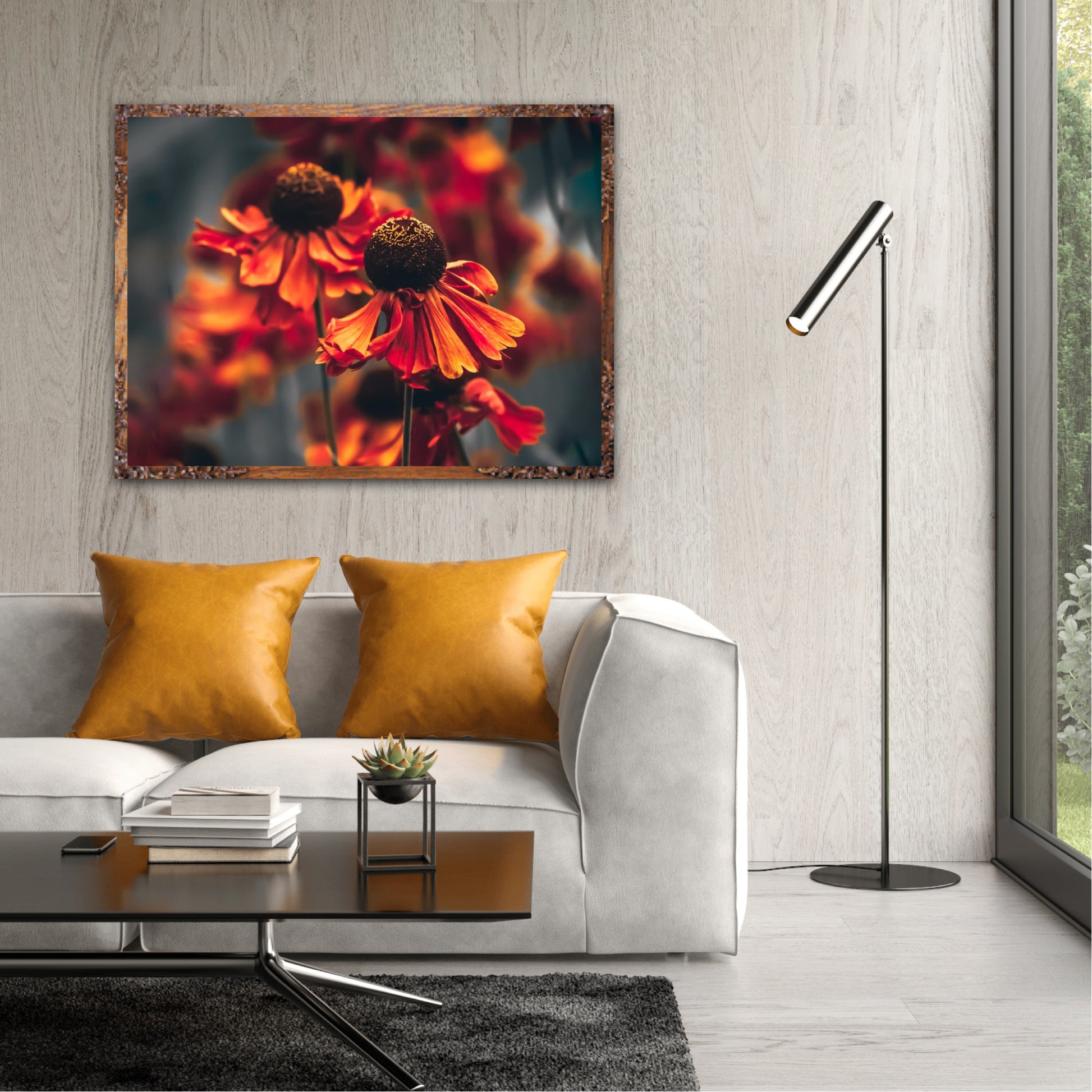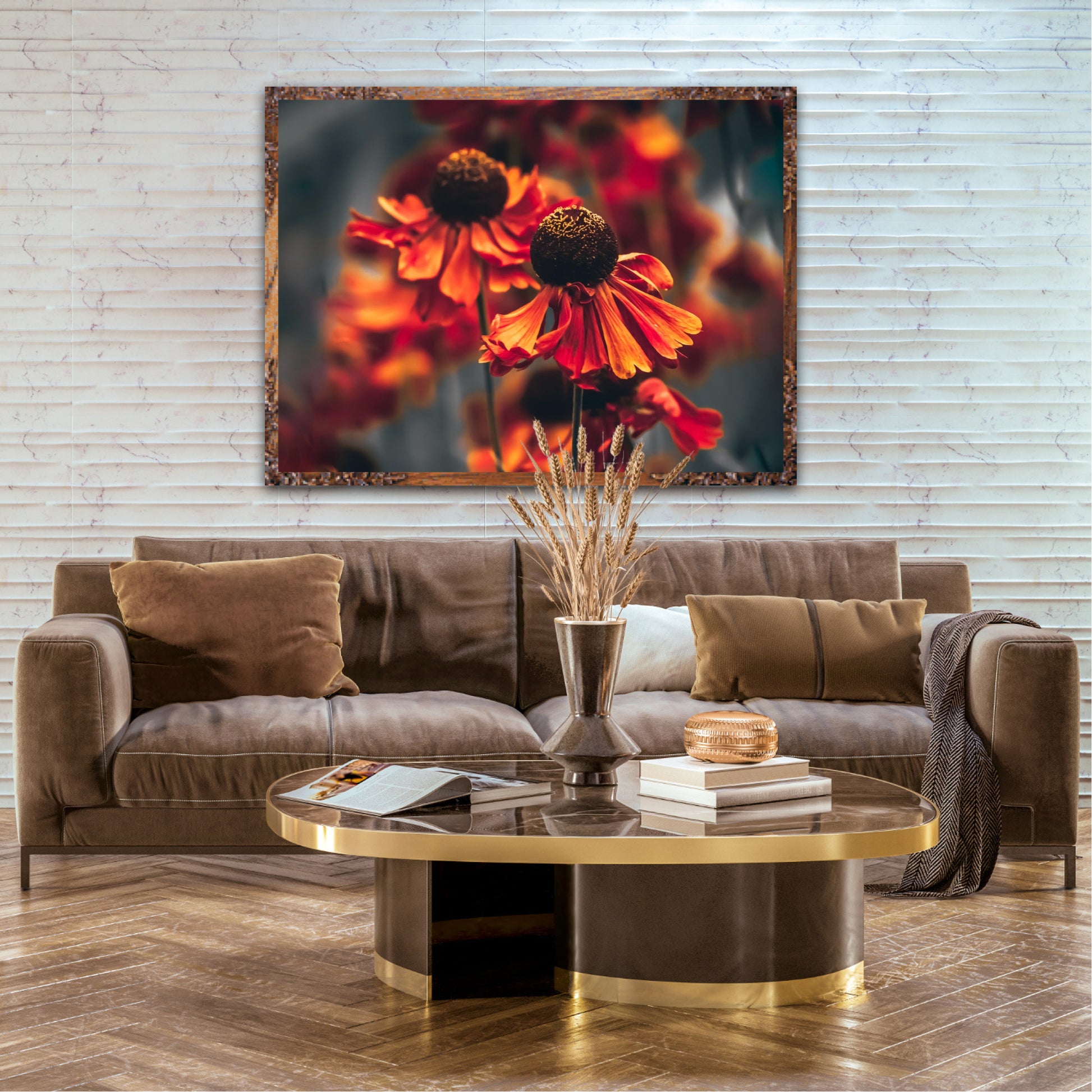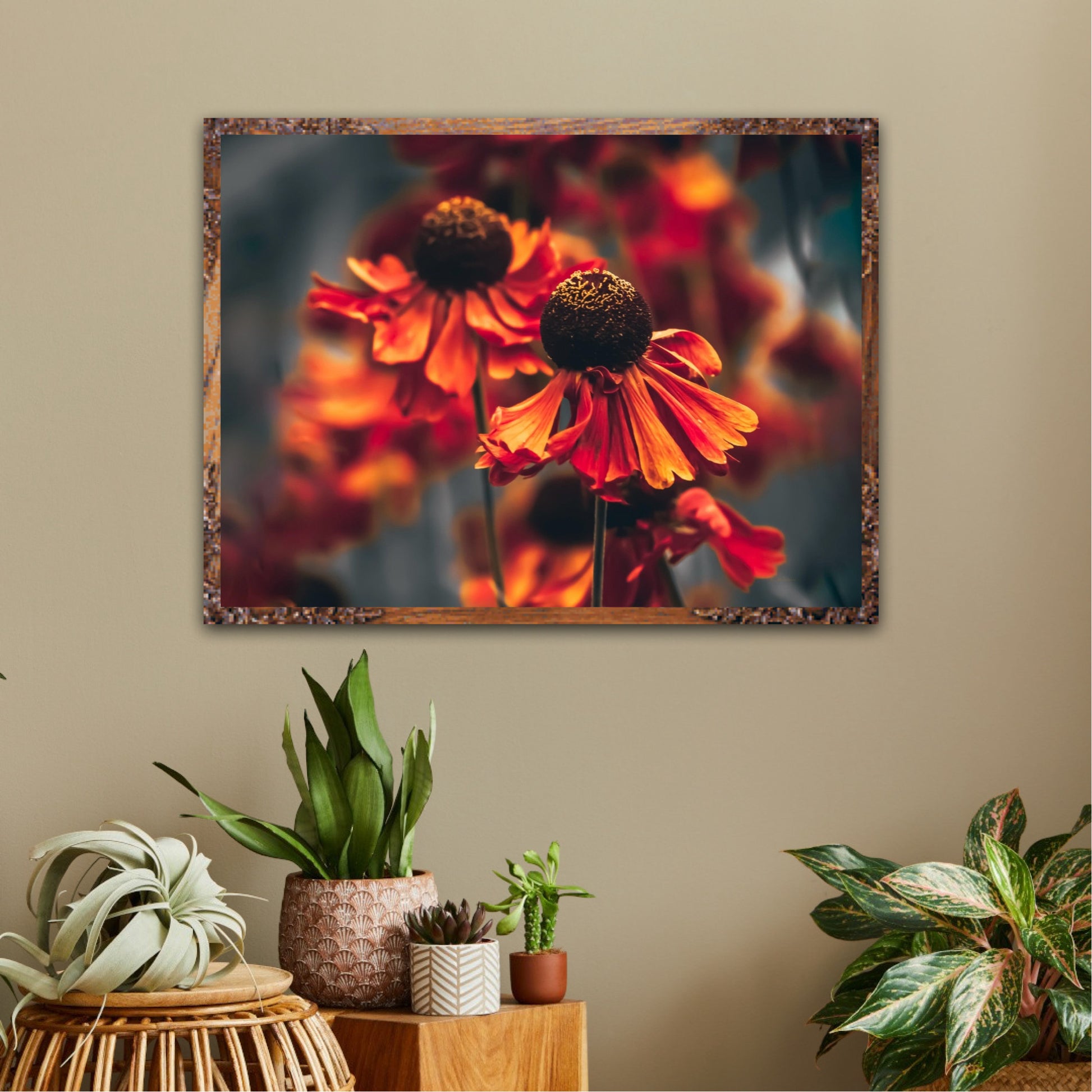 Beautiful photographic wall art of two magnificent sunflowers against a backdrop of several other flowers. This is a colourful and fresh image that will give you strength and joy for many years.