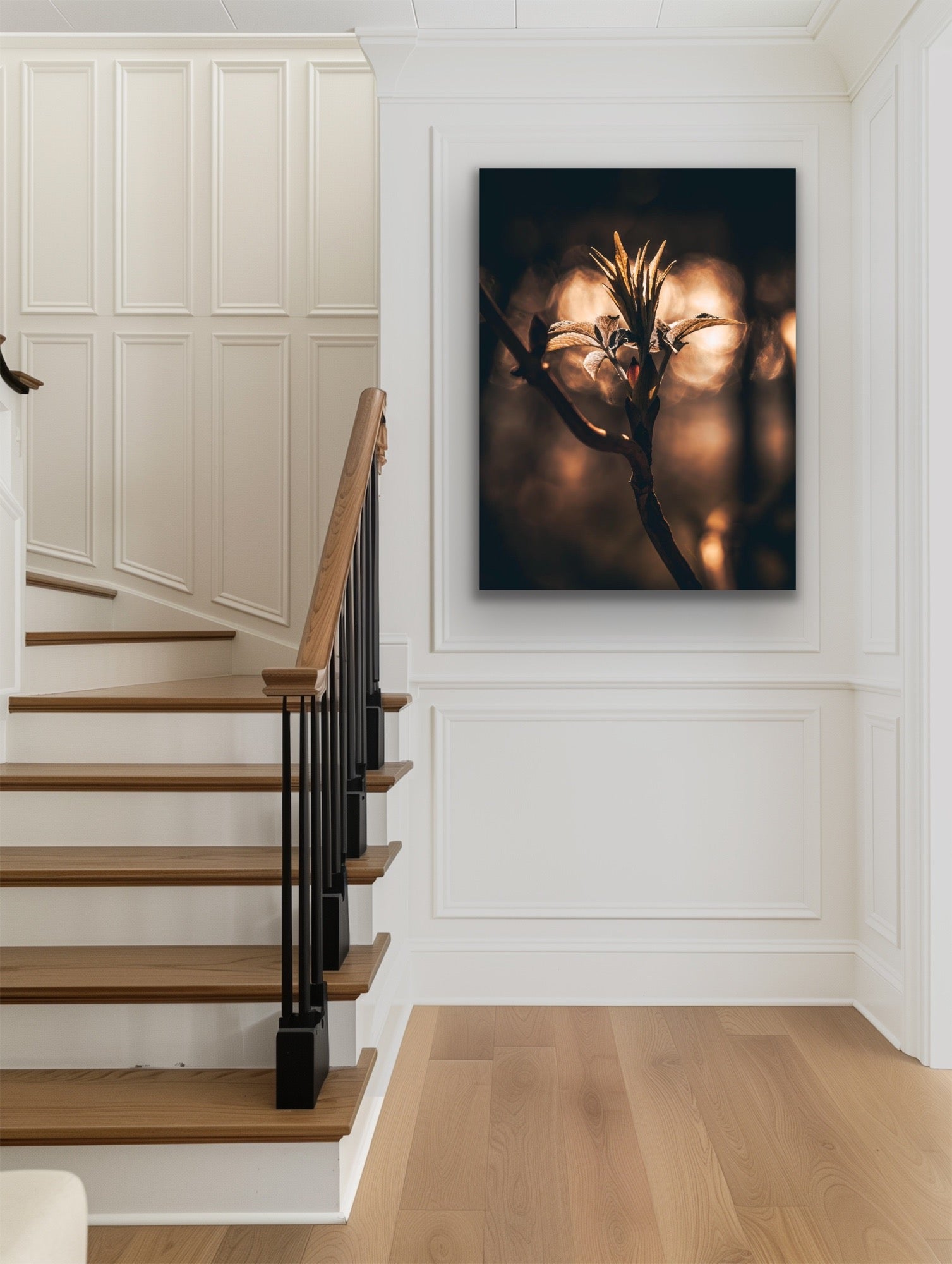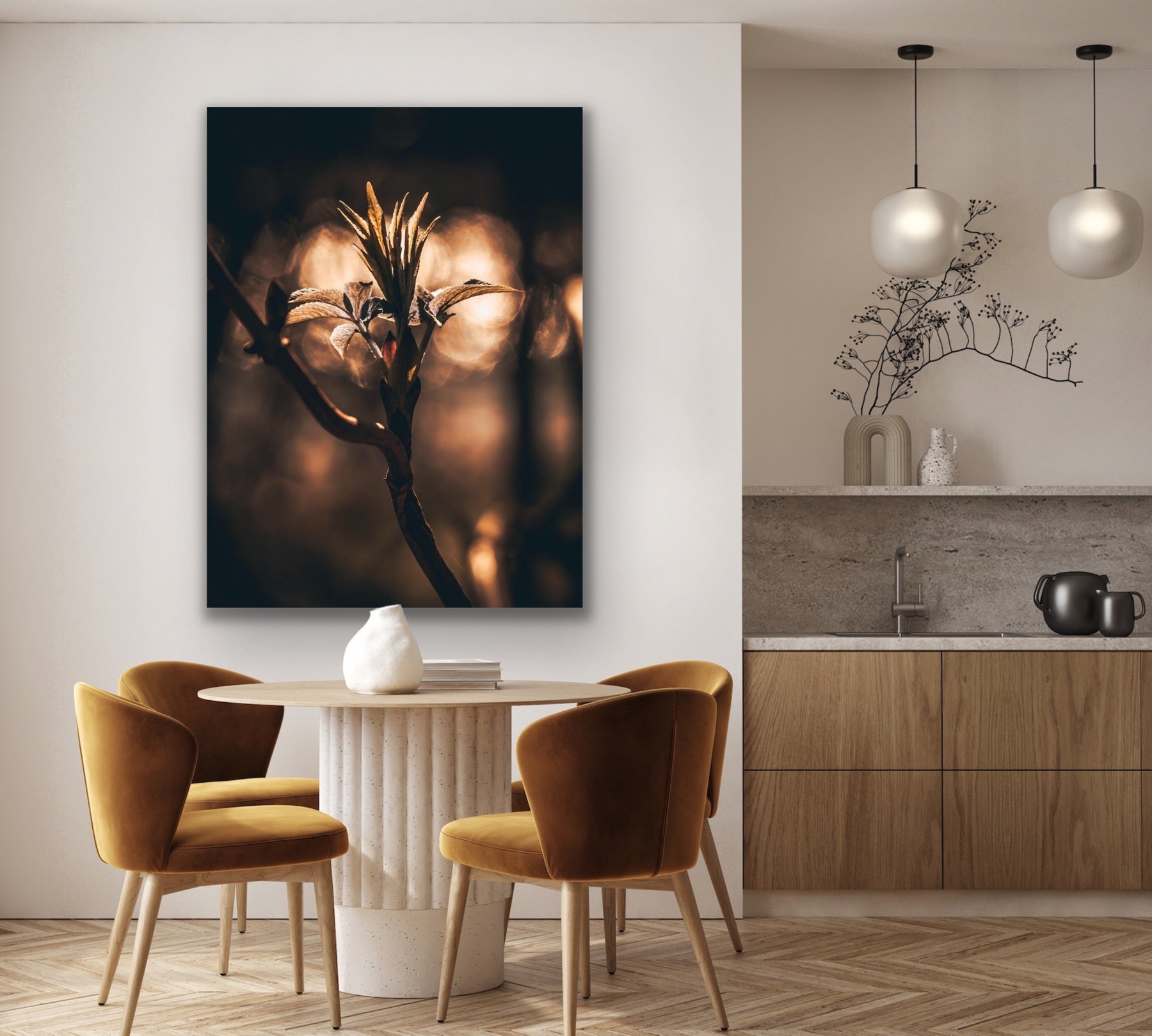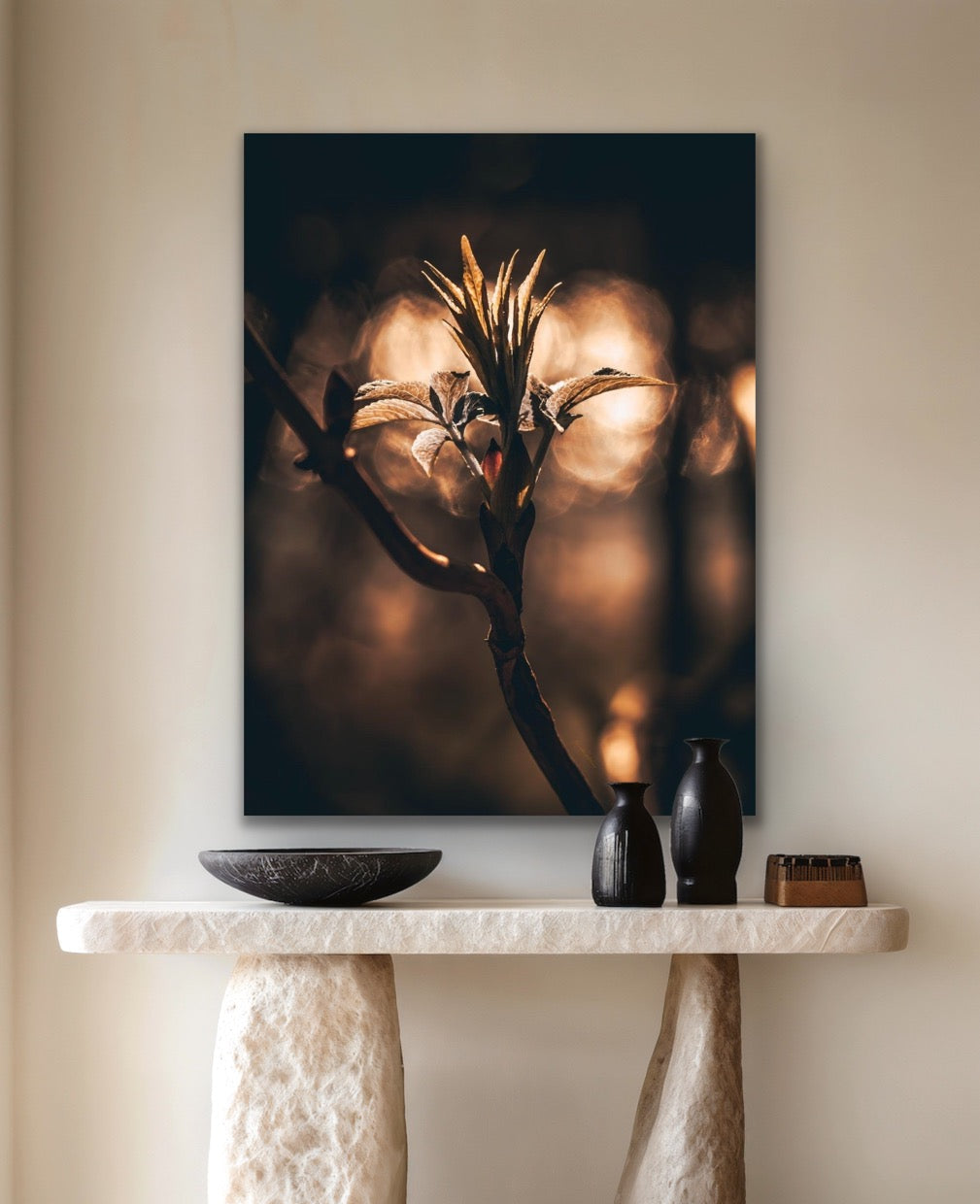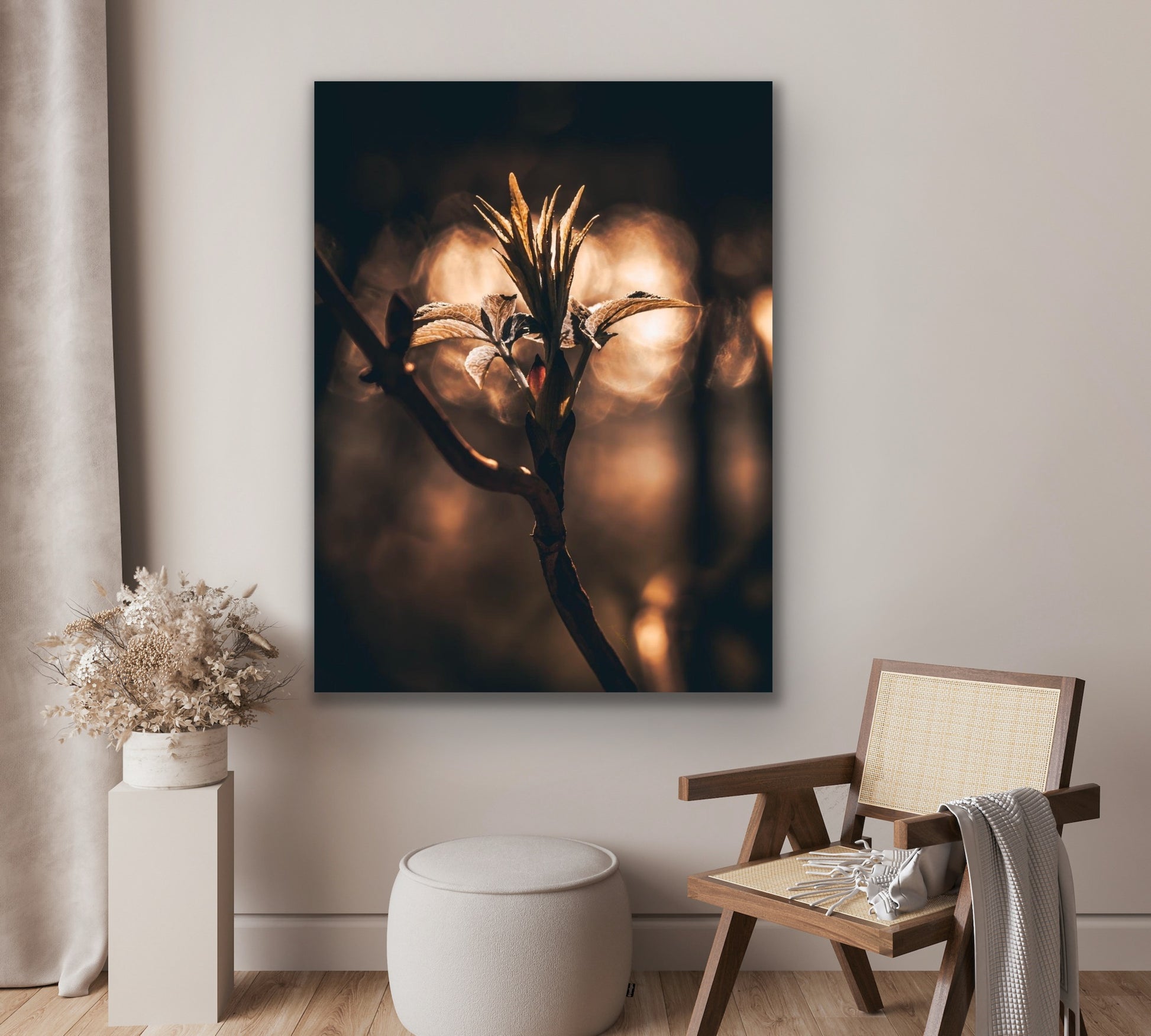 Beautiful photographic wall art of a branch with leaves against a golden light from the water. Get wall art that gives you a good and warm feeling, where you can find peace and dream away to beautiful moments in nature.