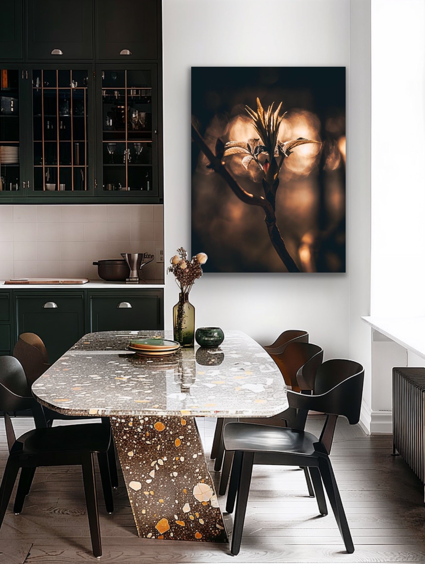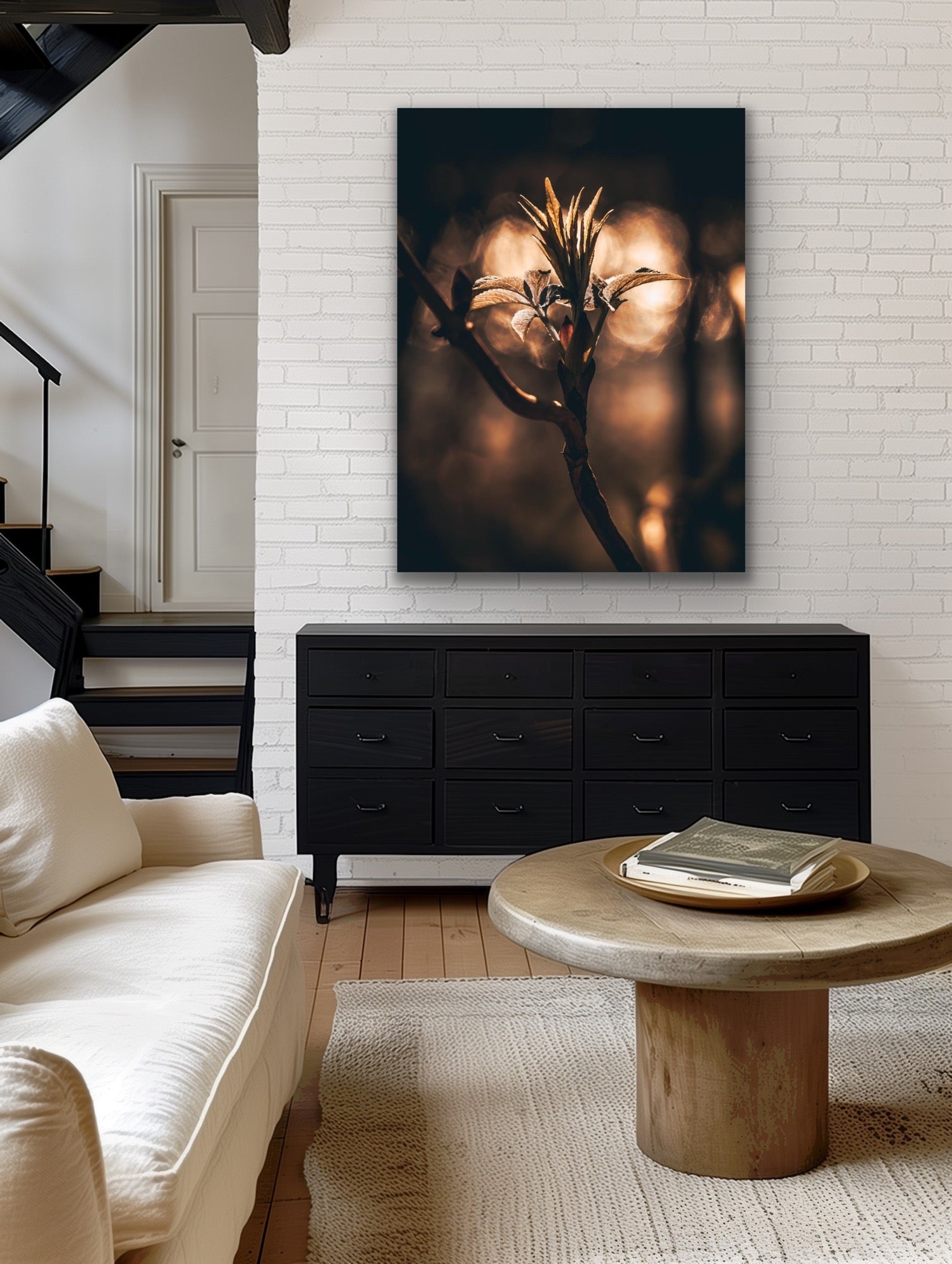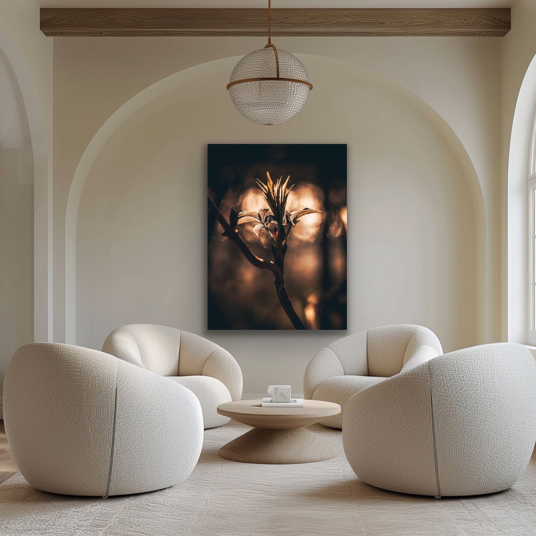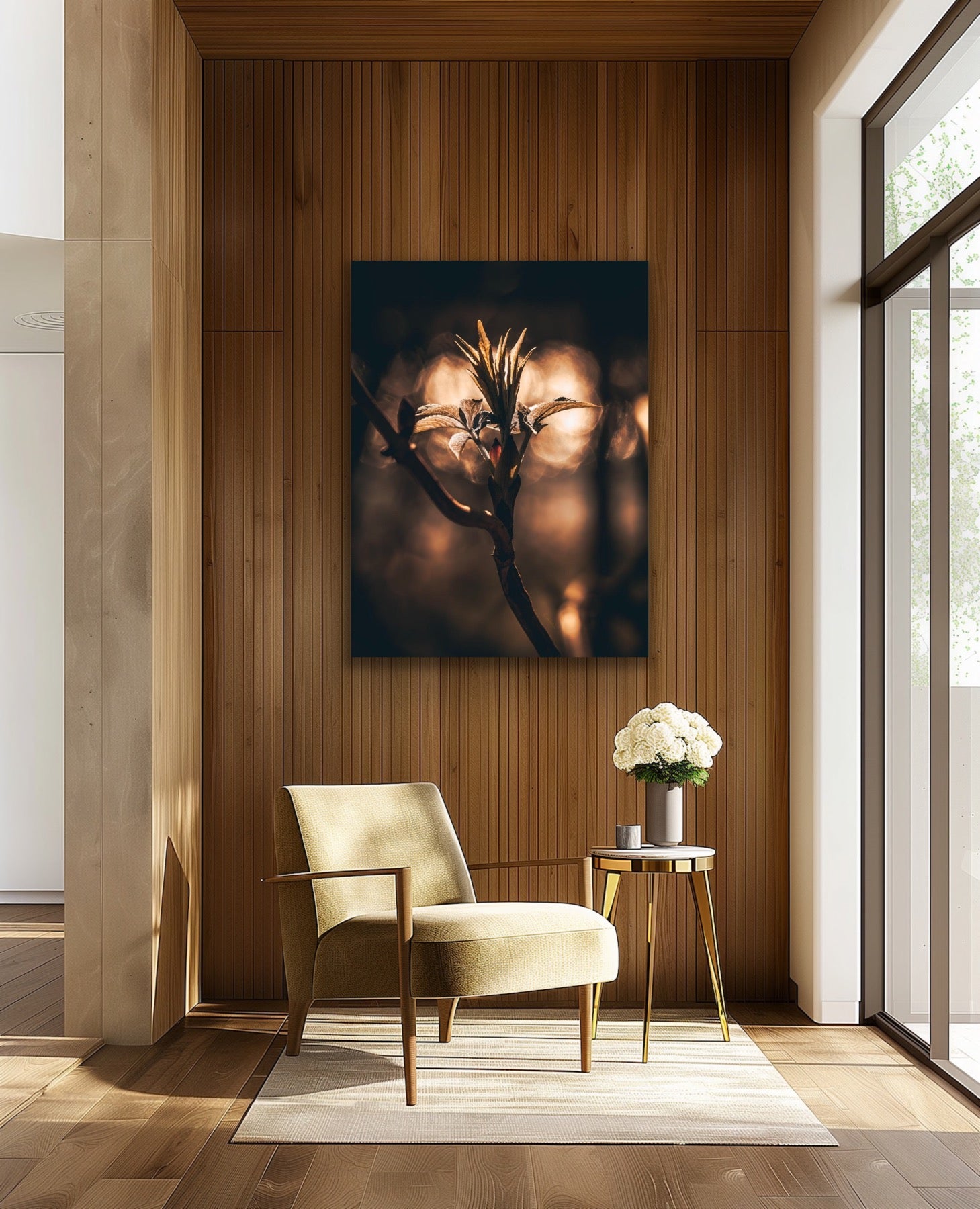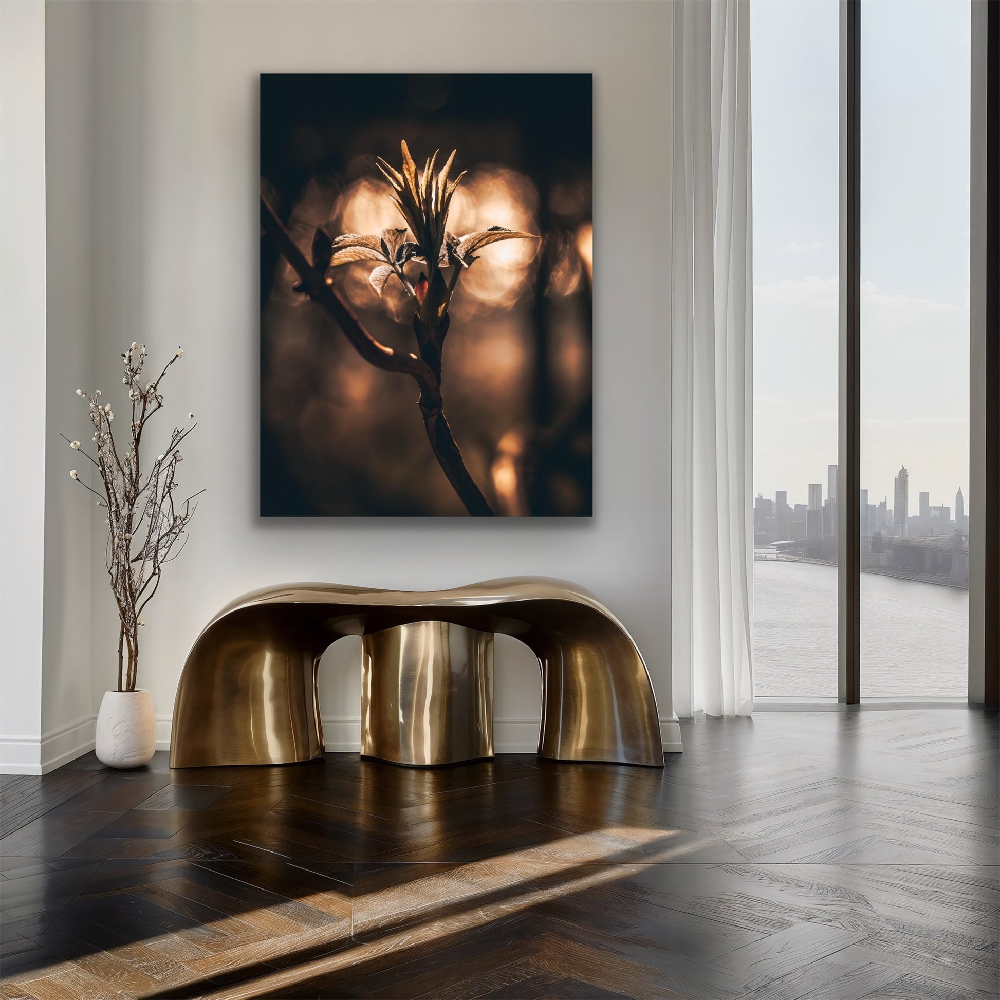 Beautiful photographic wall art of a branch with leaves against a golden light from the water. Get wall art that gives you a good and warm feeling, where you can find peace and dream away to beautiful moments in nature.