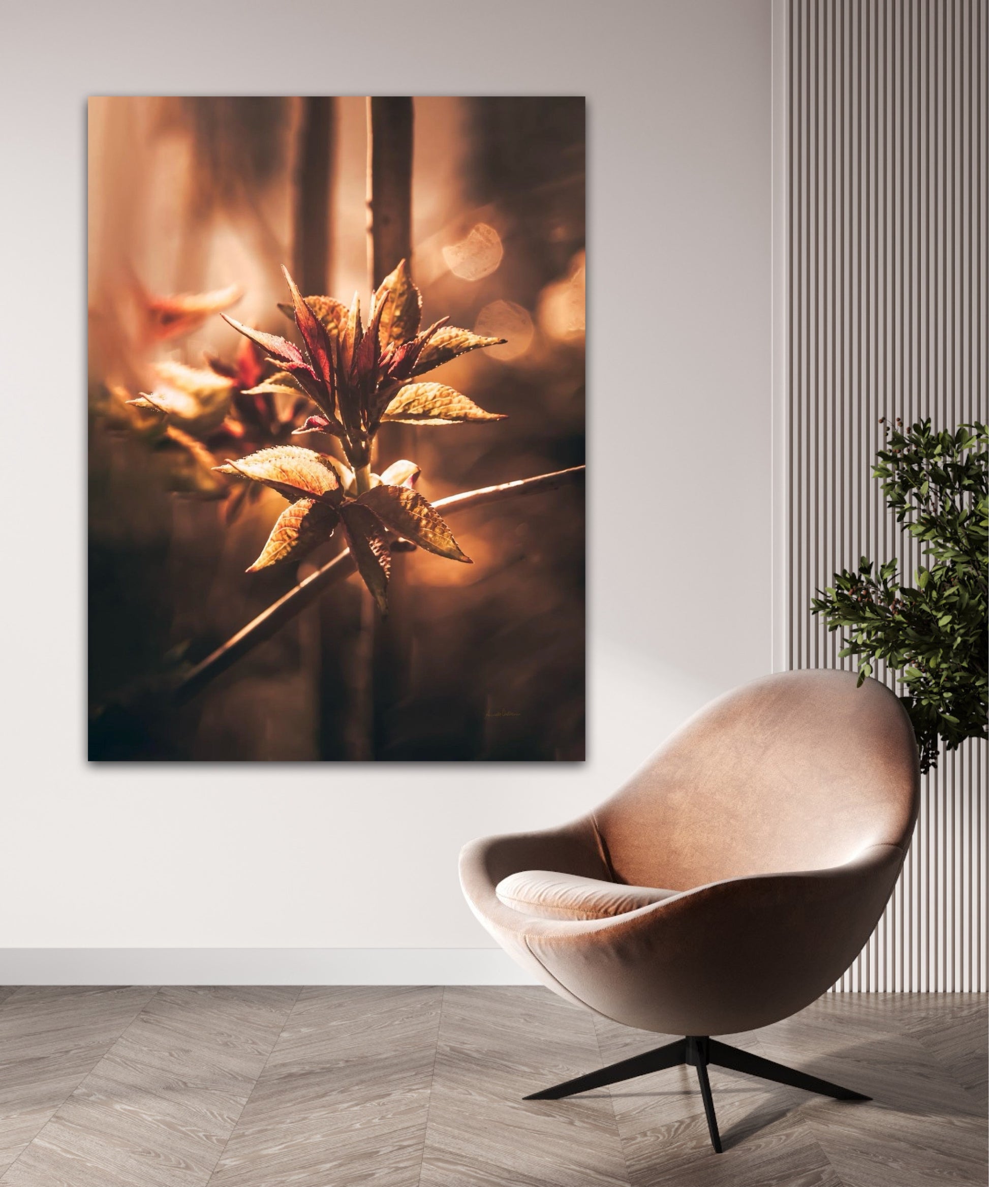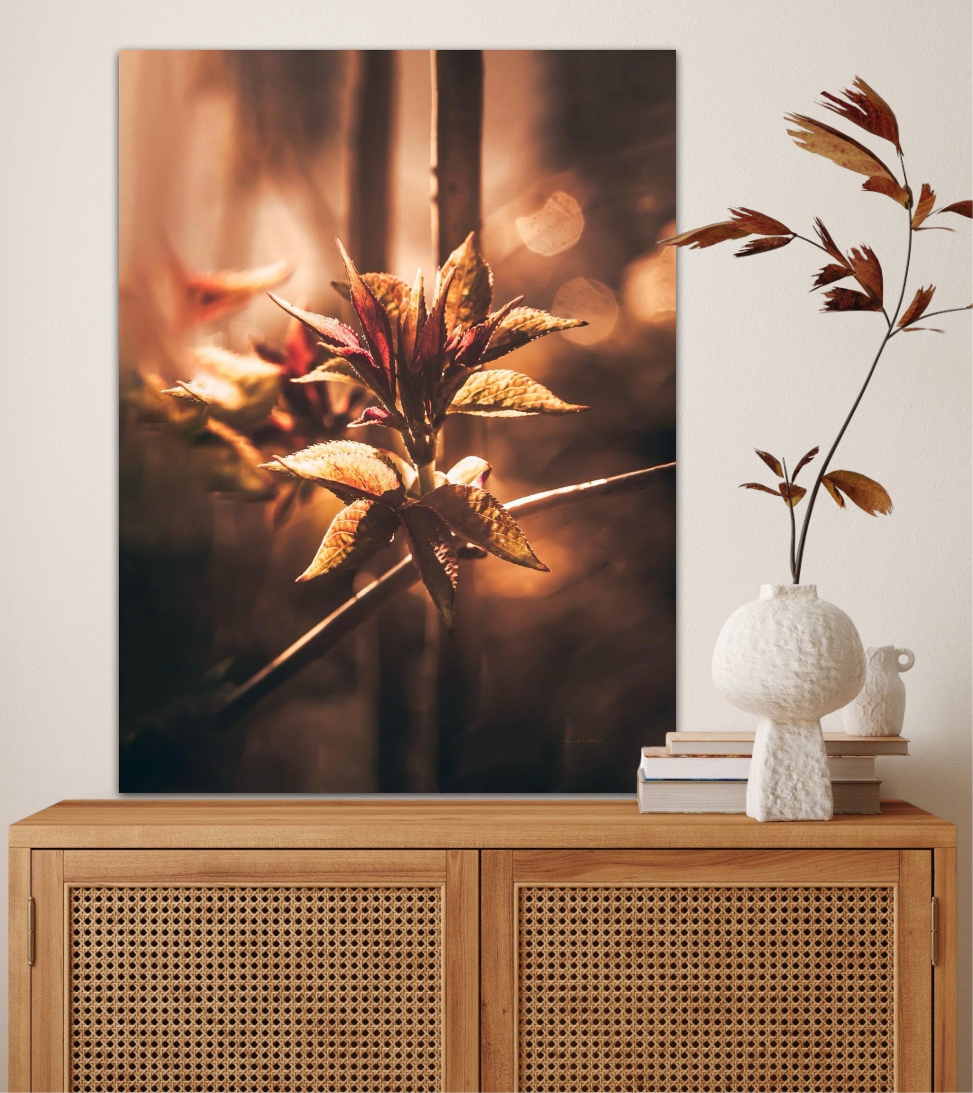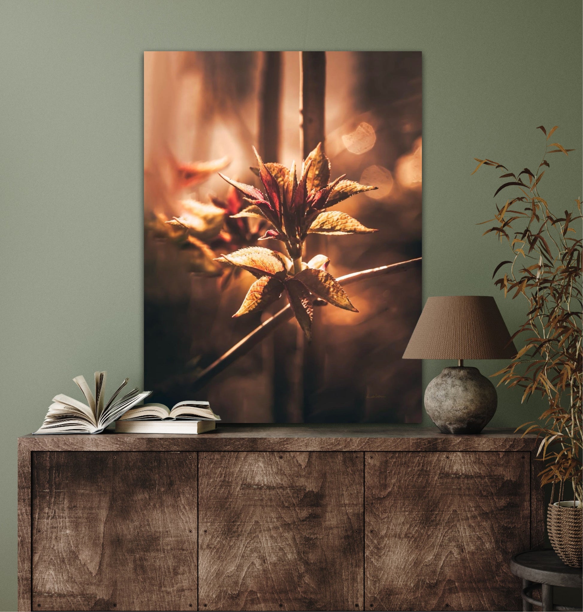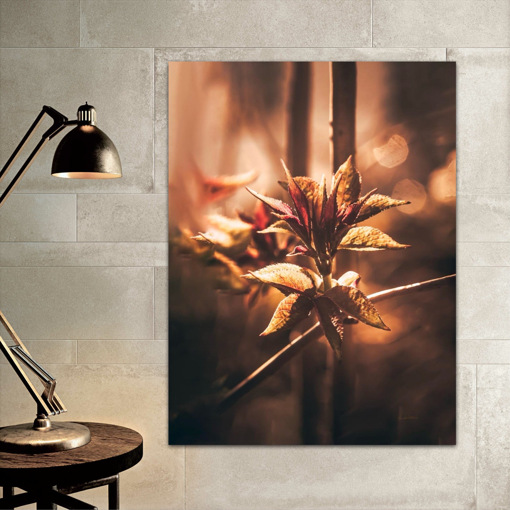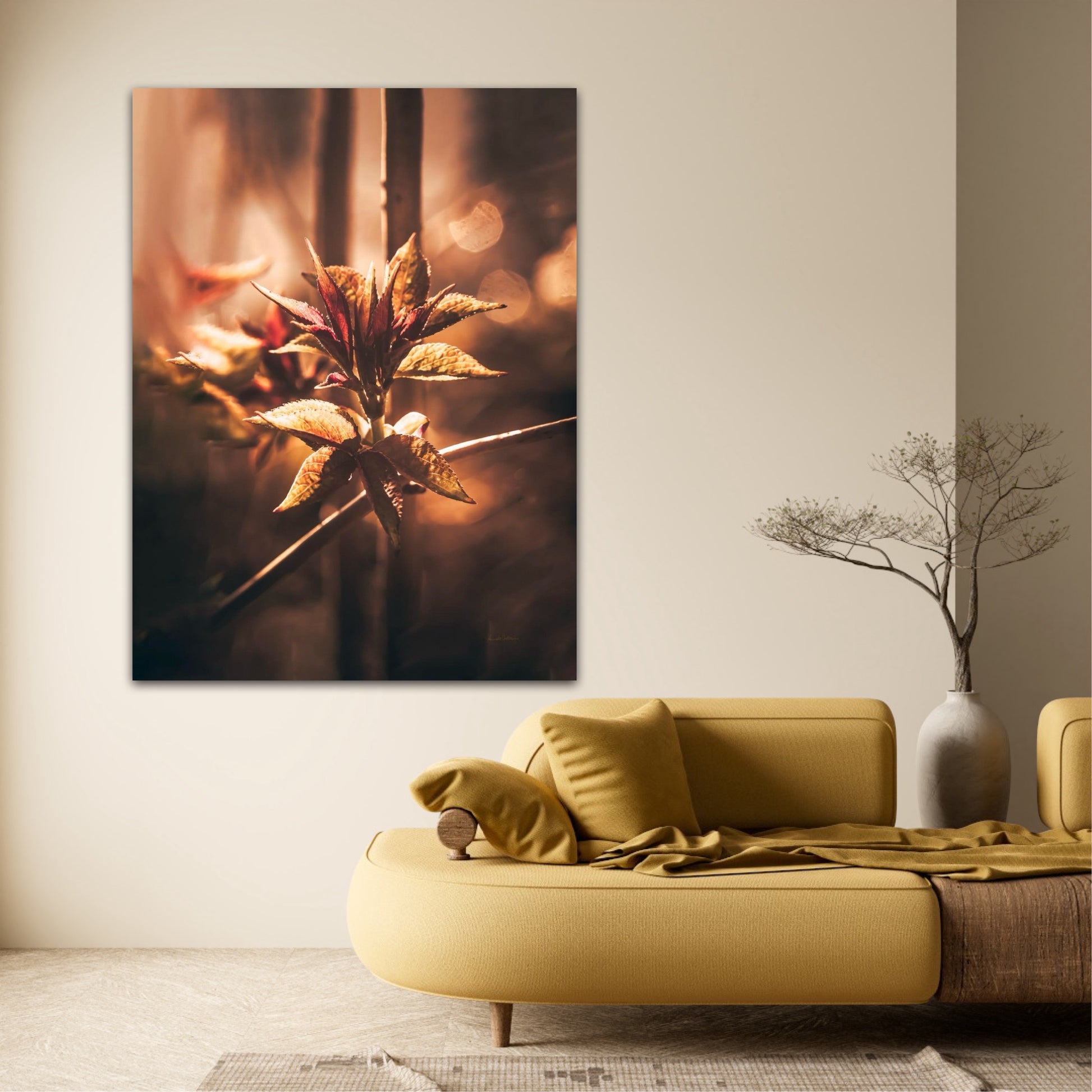 Beautiful and warm photographic art image of sprouting leaves on a tree branch on gorgeous, golden light. Beautiful and peaceful, get the good feeling with this beautiful artwork.