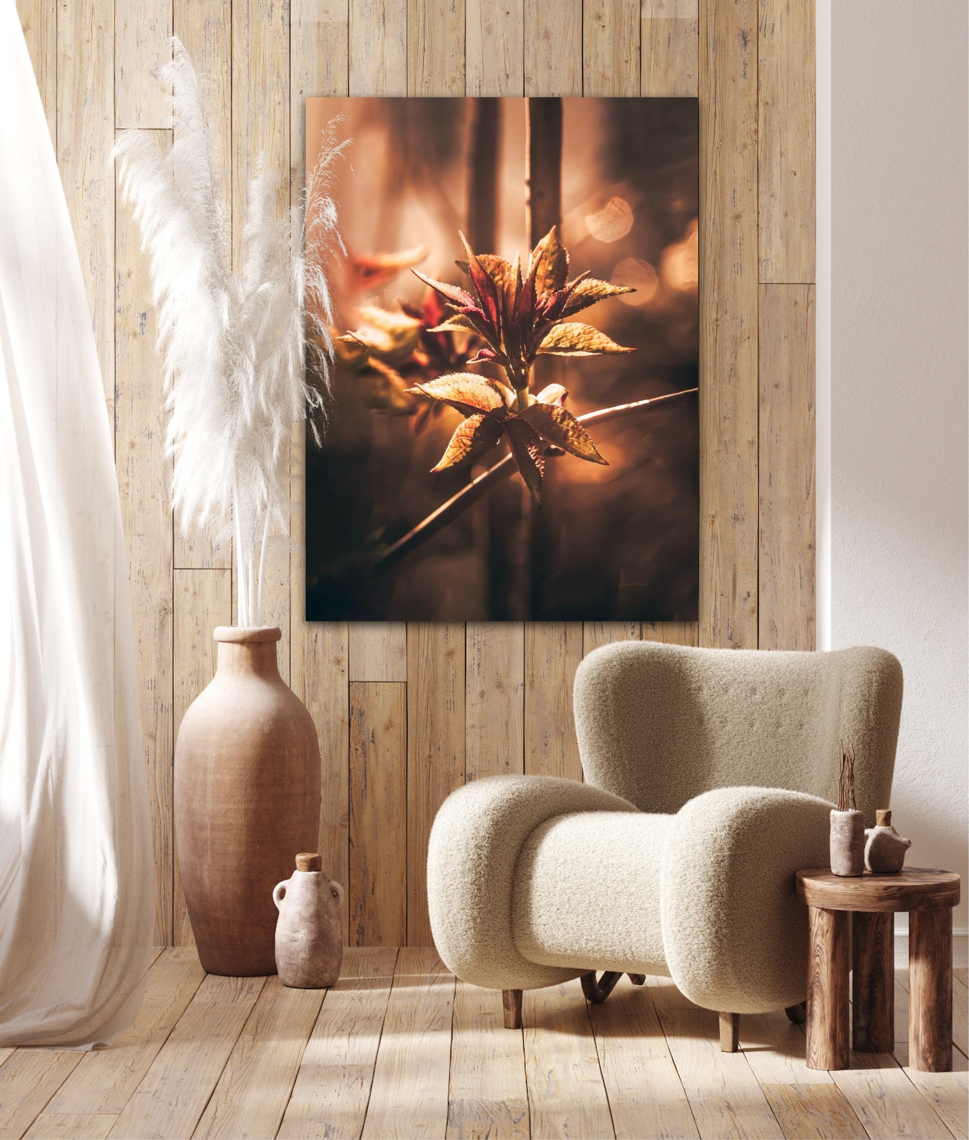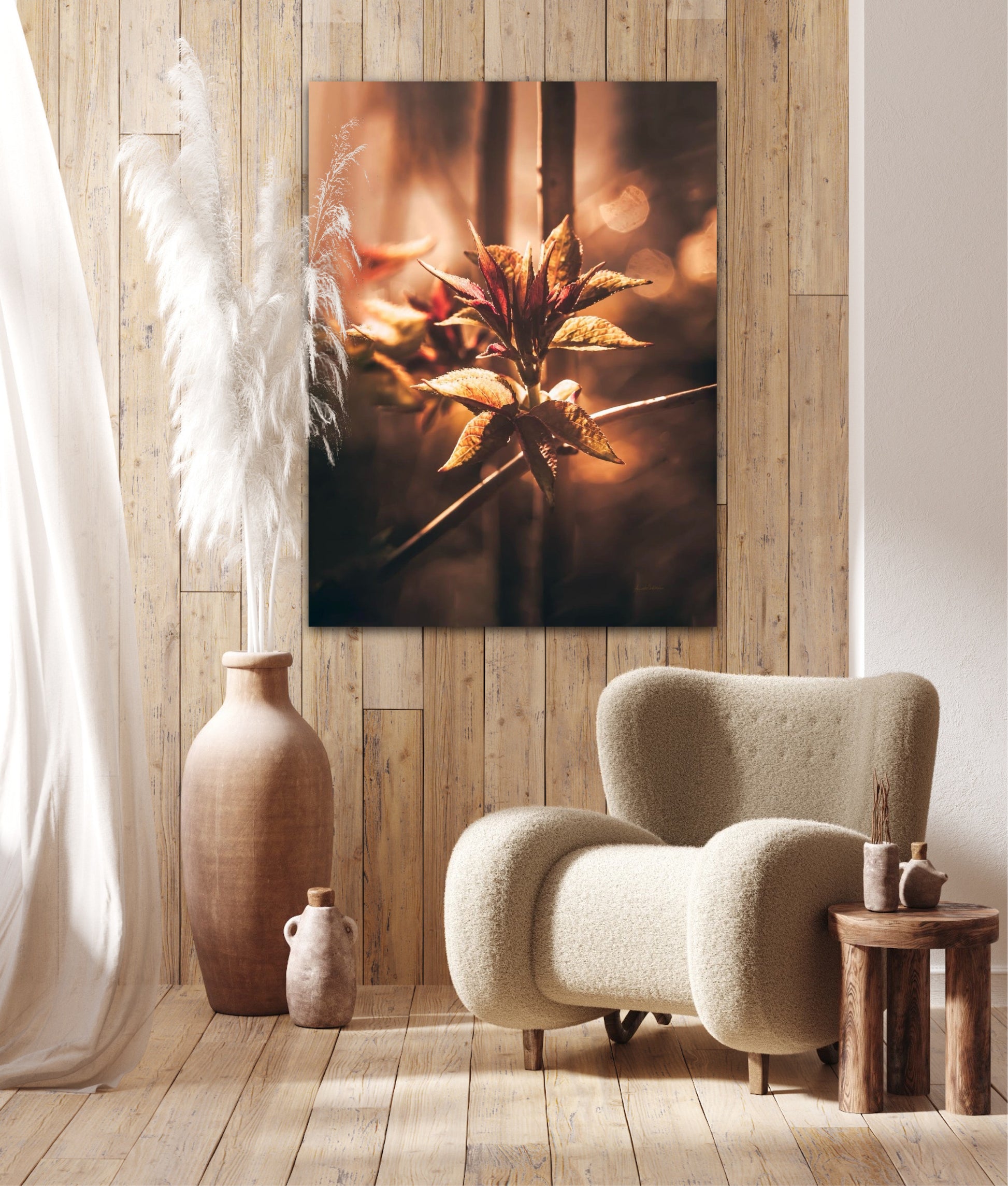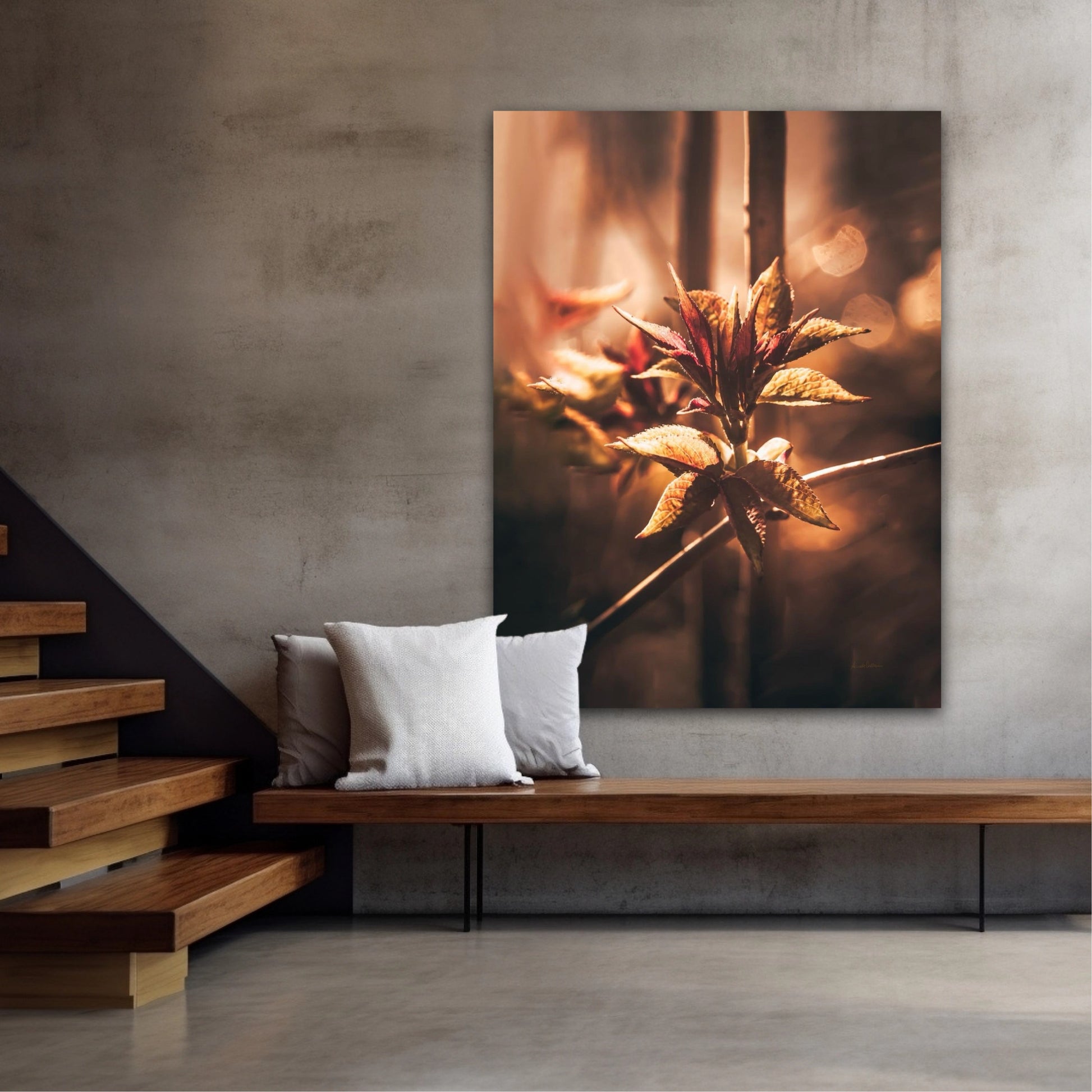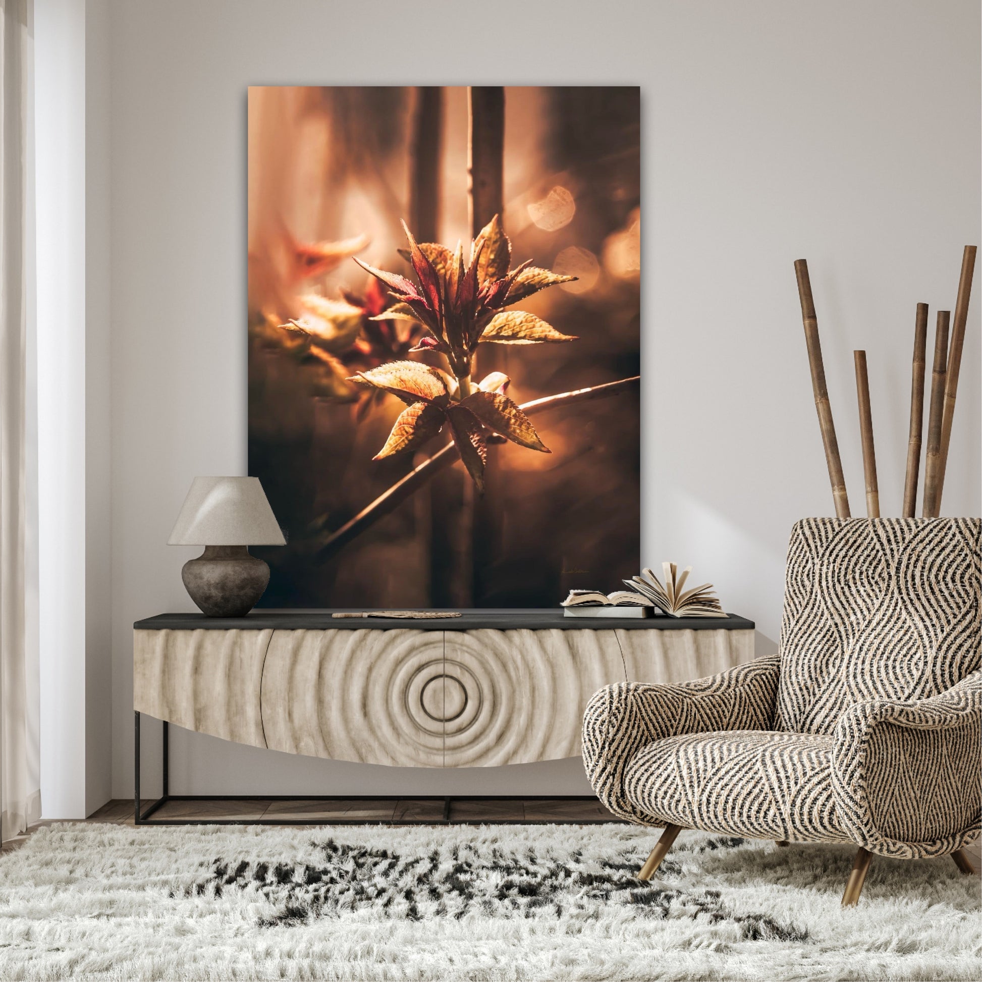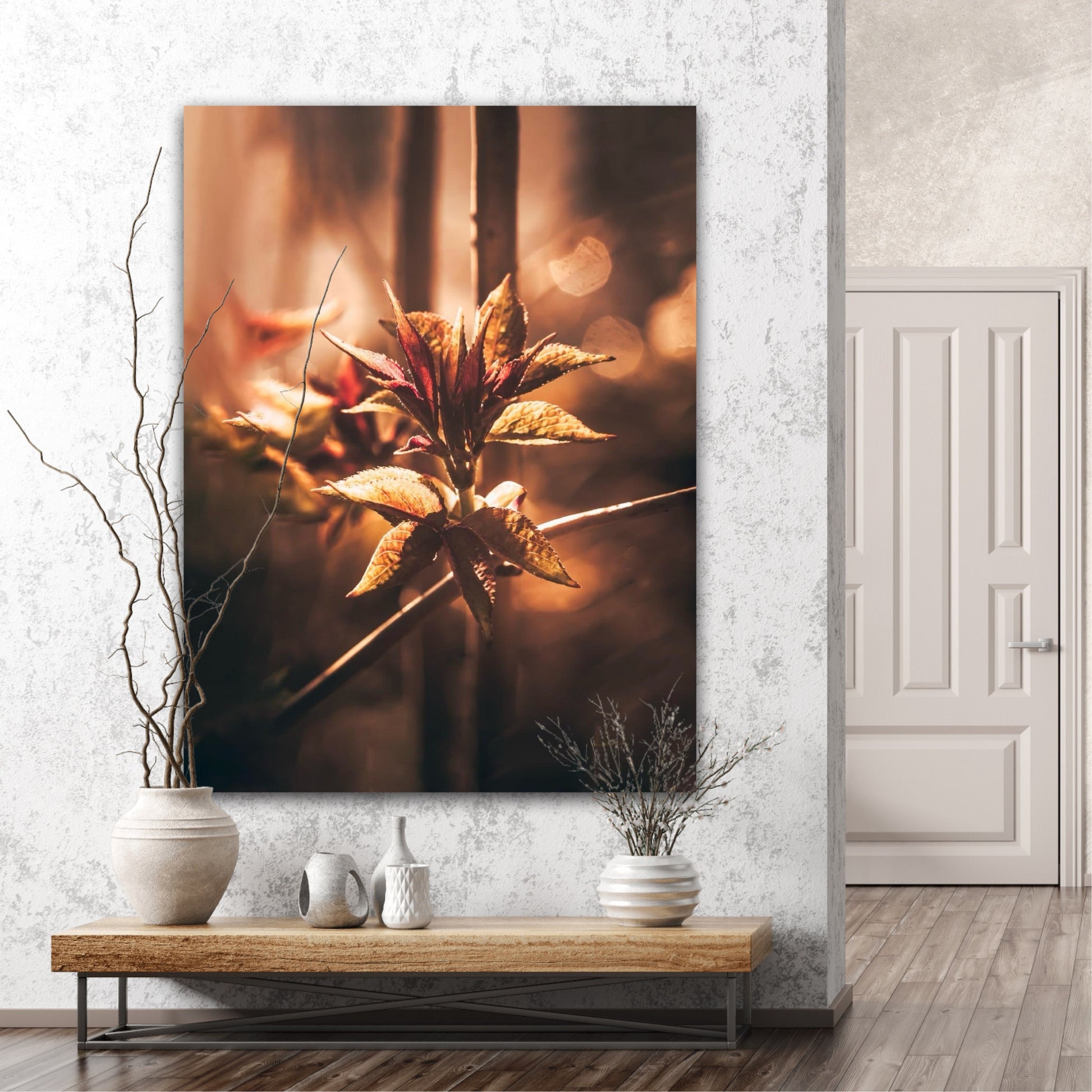 Beautiful and warm photographic art image of sprouting leaves on a tree branch on gorgeous, golden light. Beautiful and peaceful, get the good feeling with this beautiful artwork.