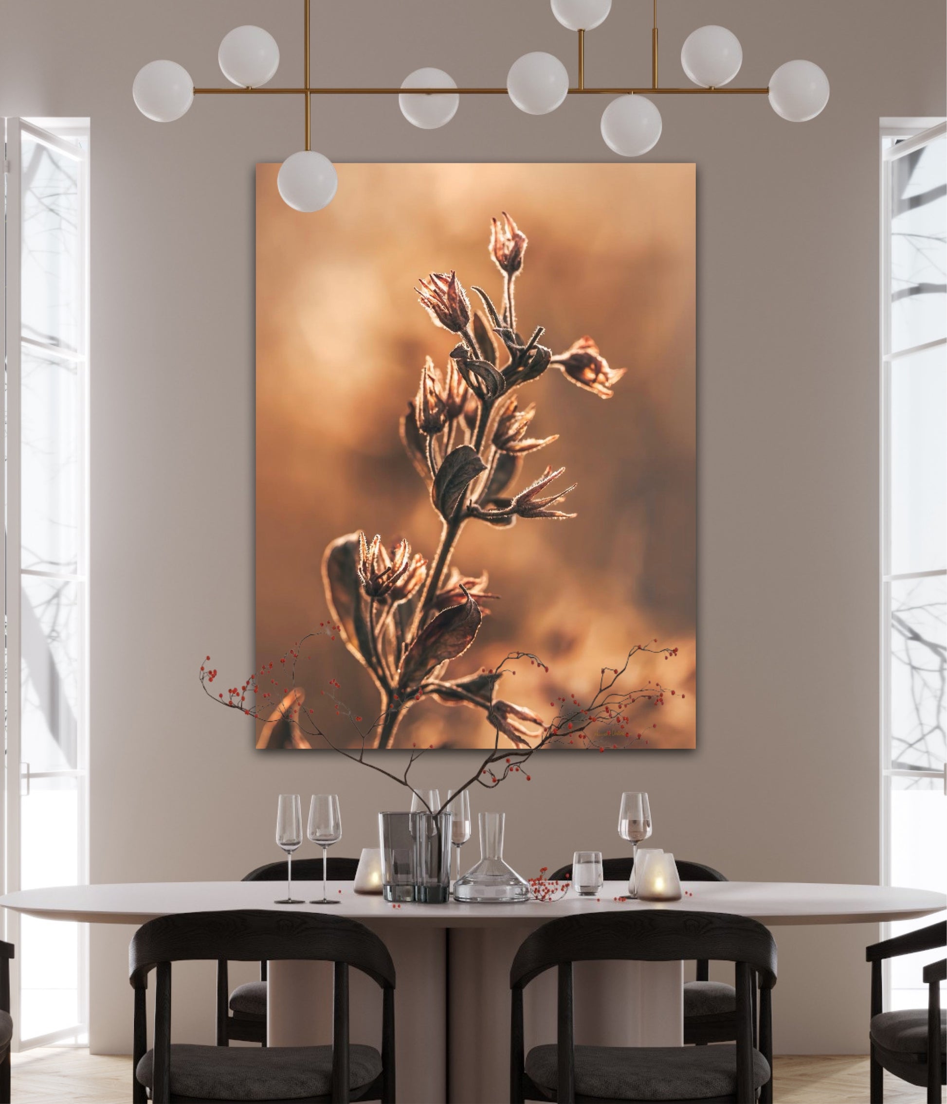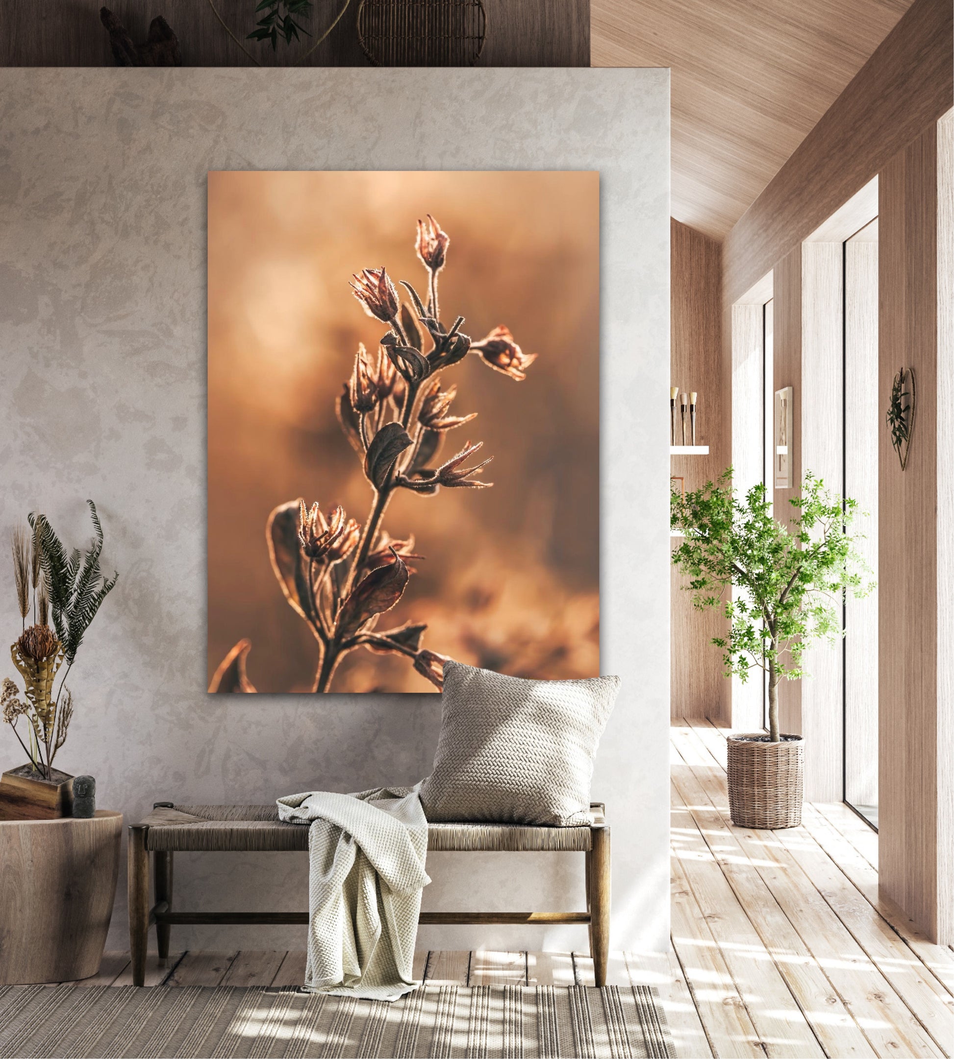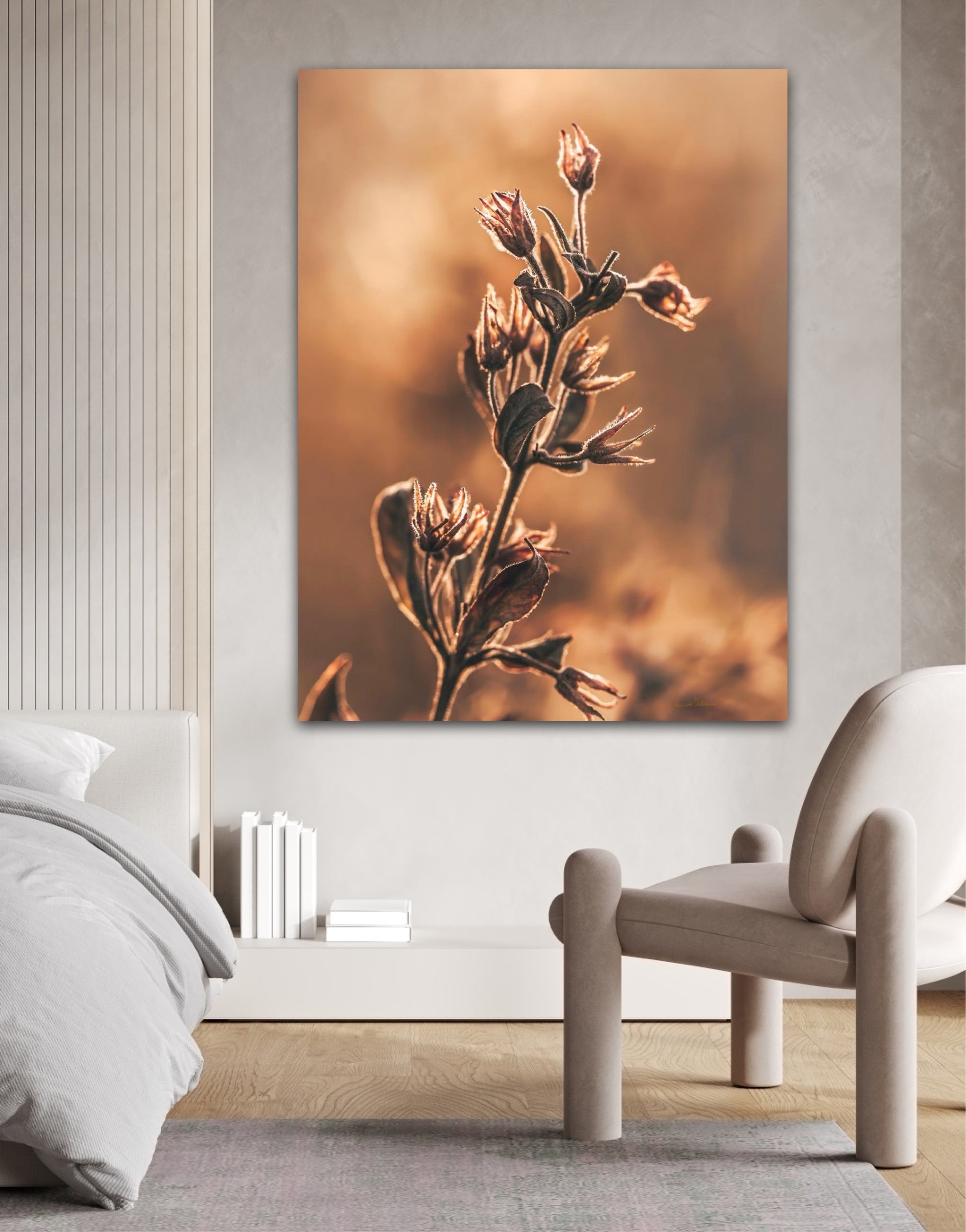 Beautiful photographic wall art of a flower weed in light golden tones, with beautiful details and lovely light. This picture will feel like the sun is shining in your home every day.