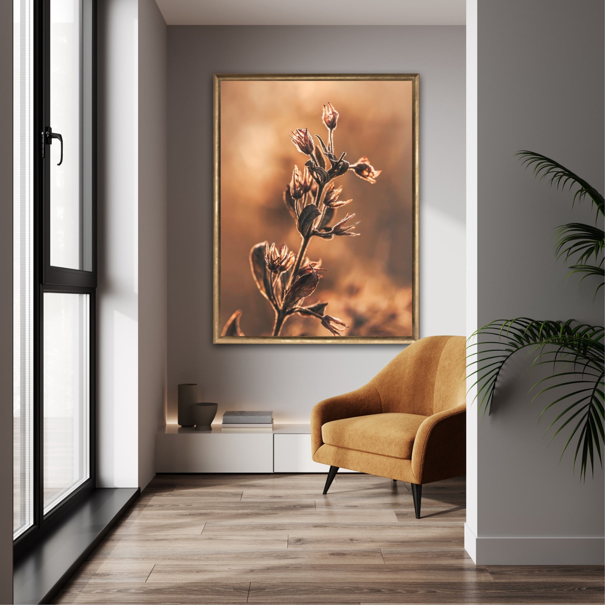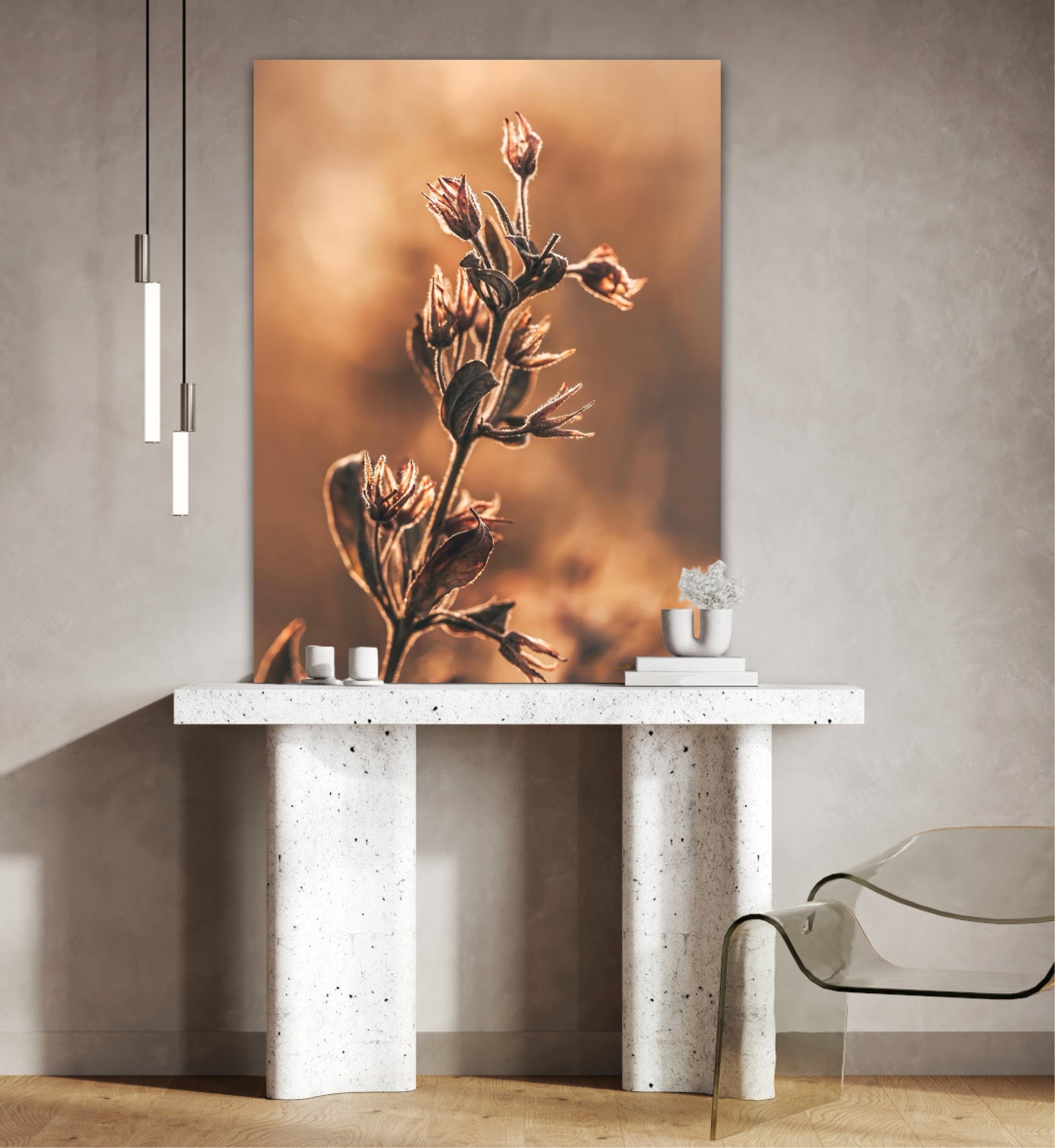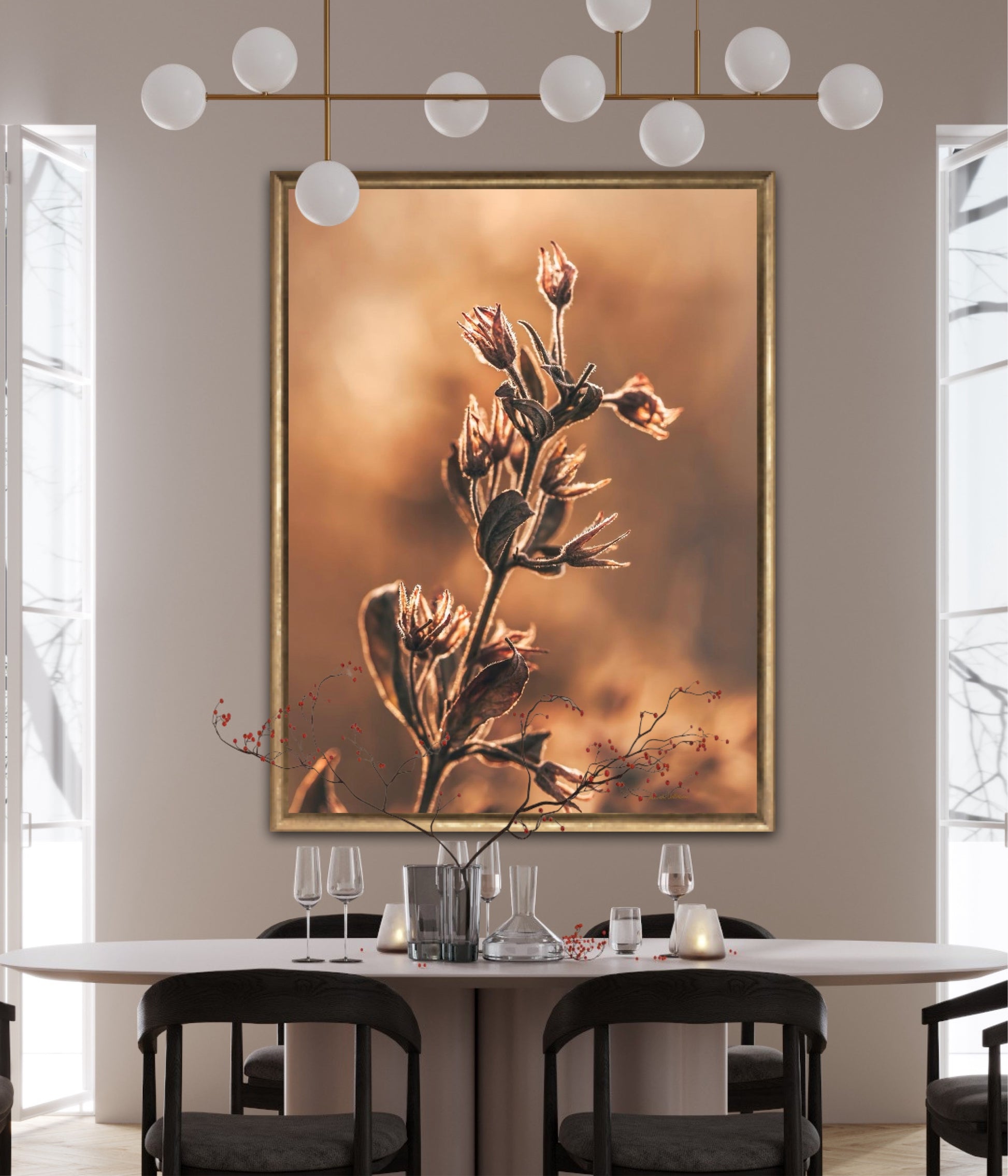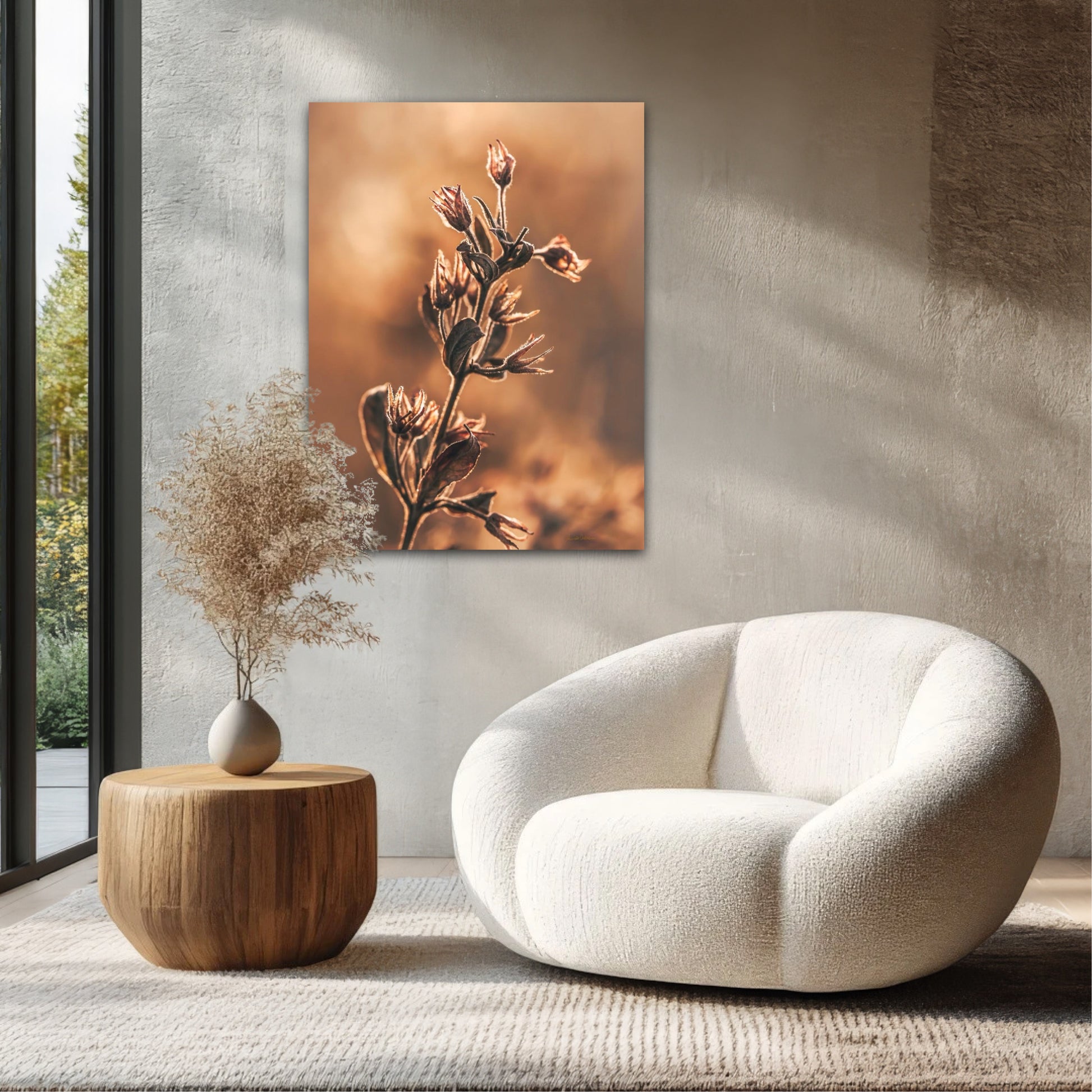 Beautiful photographic wall art of a flower weed in light golden tones, with beautiful details and lovely light. This picture will feel like the sun is shining in your home every day.