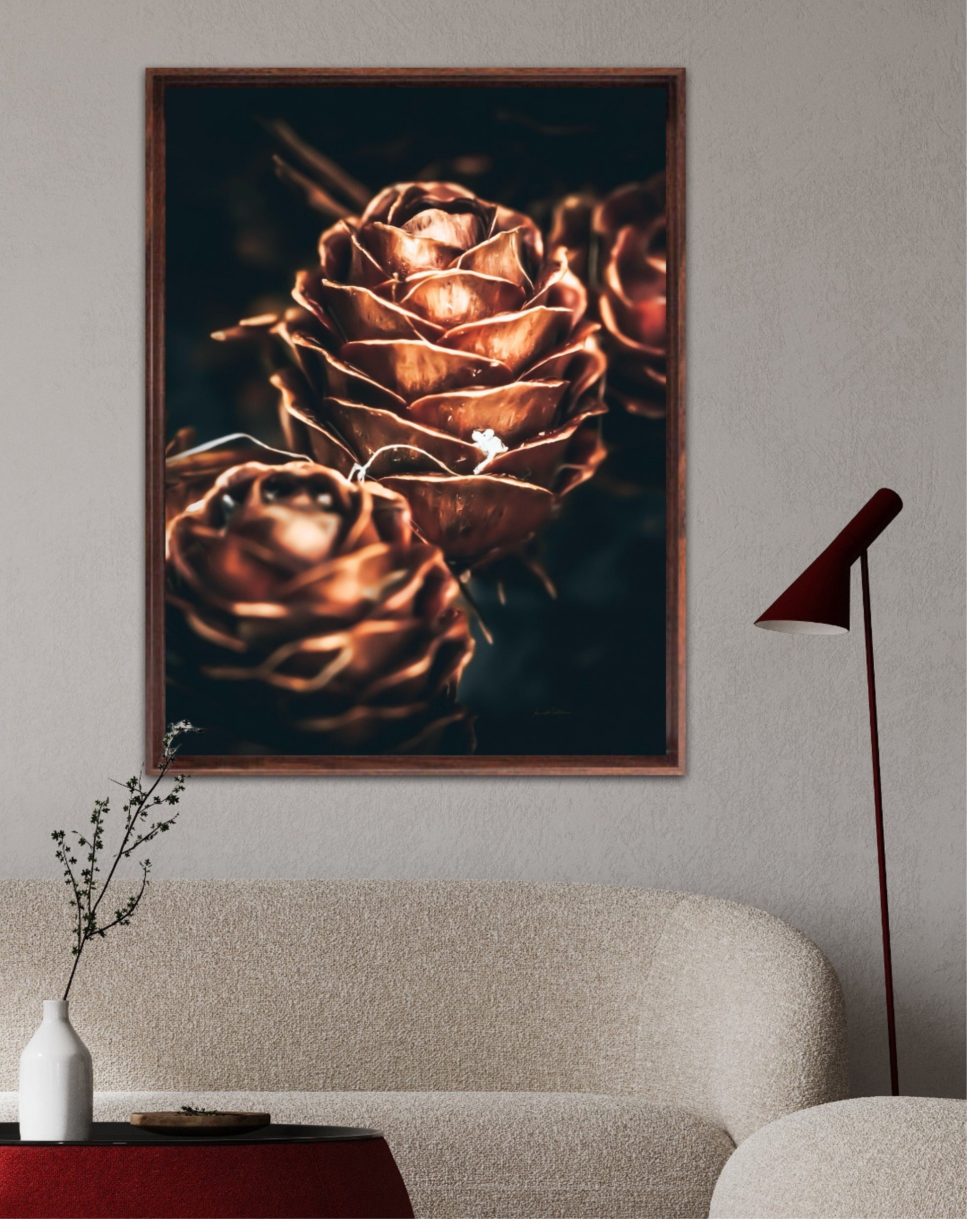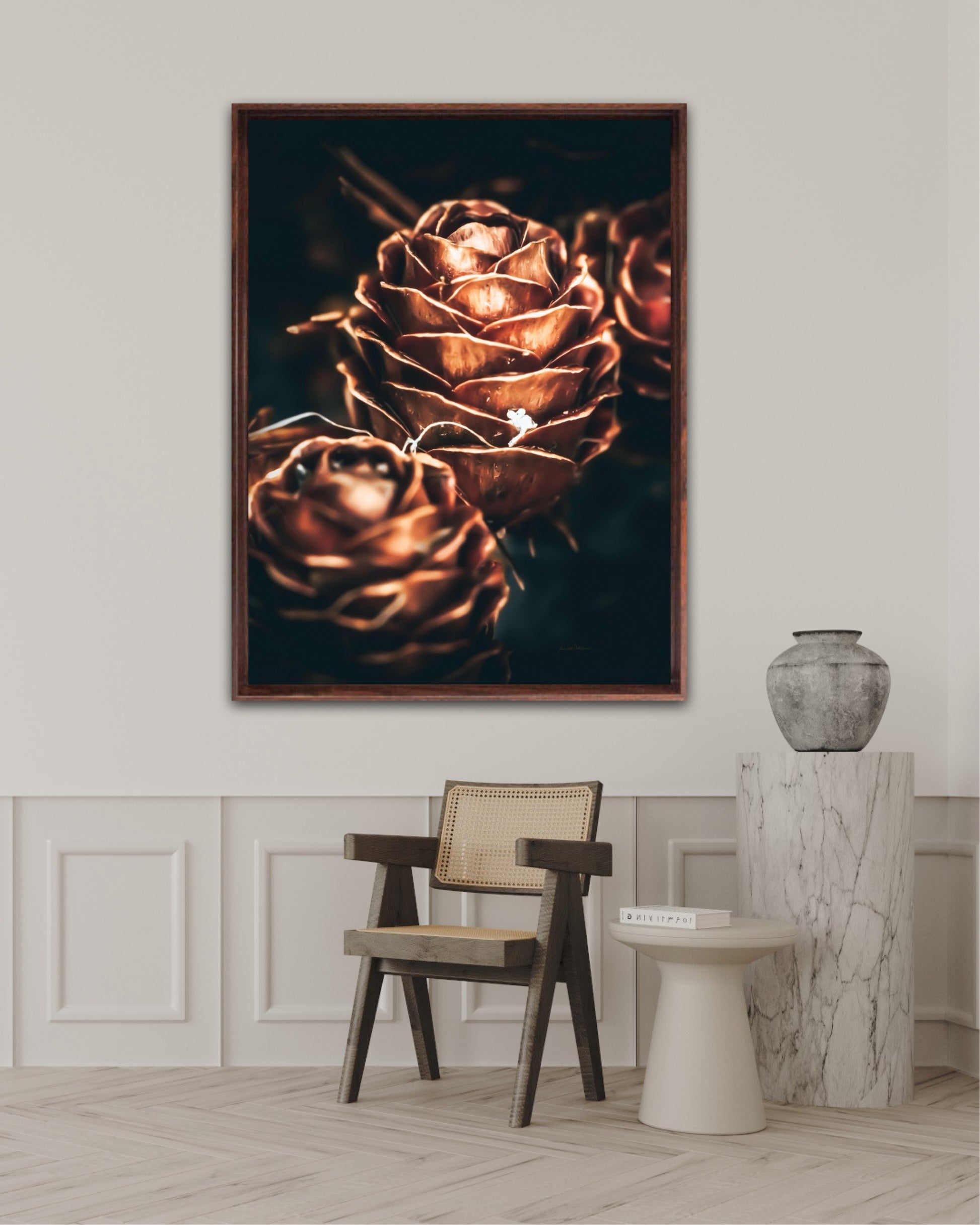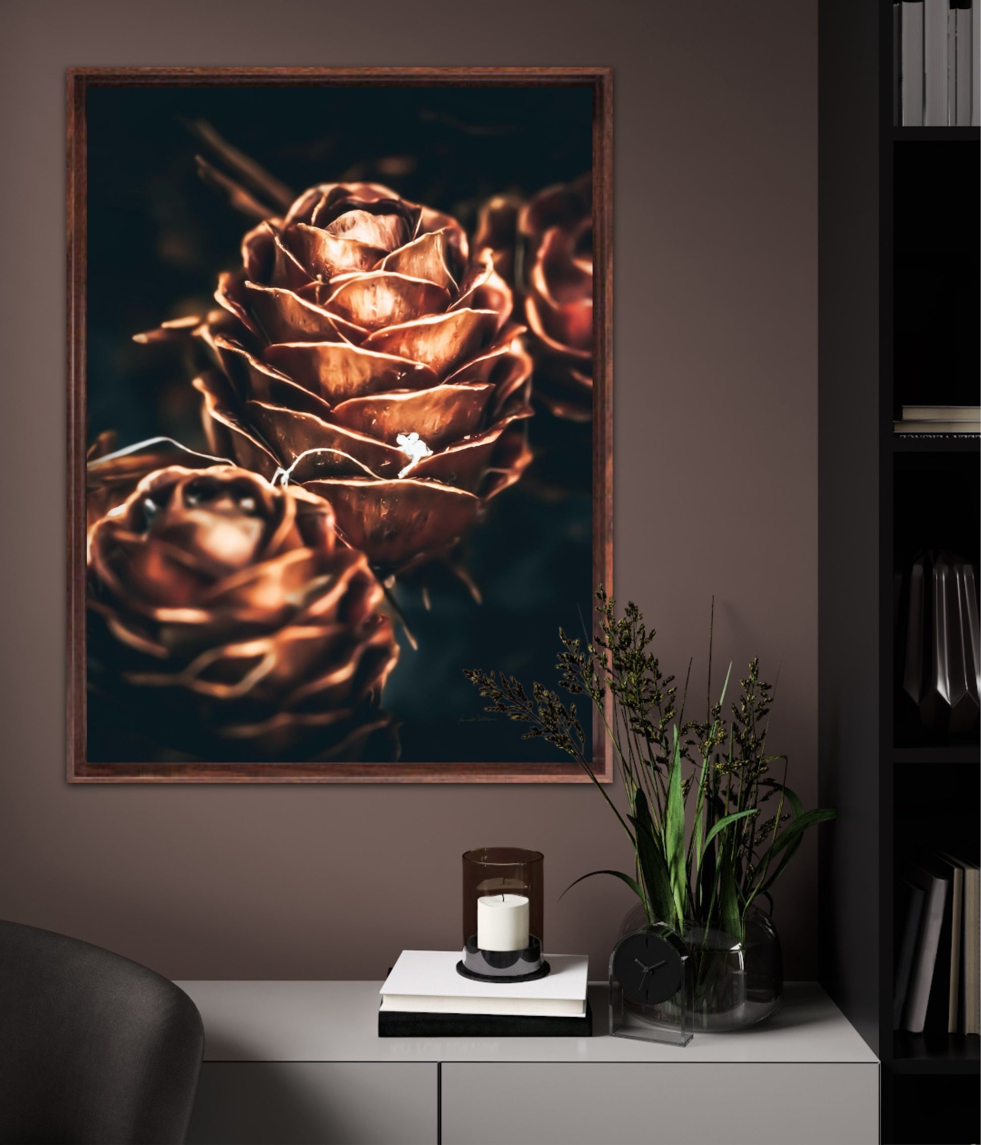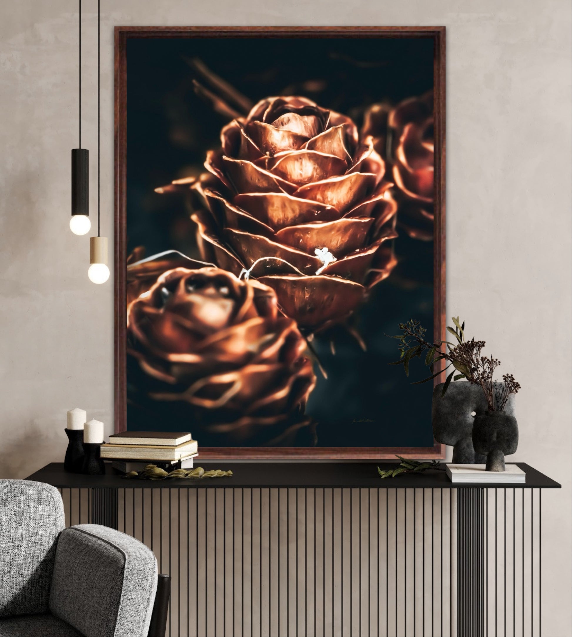 Beautiful photographic wall art that is a really close photo of pine cones that shine so beautifully in golden light. The colours are beautiful earth tones and are very pleasant to look at. This wall art will be a great decoration on your wall. It gives you peace from nature, and will impress friends and family. Get a beautiful piece of art on the wall. The mural fits particularly well in the cabin.
