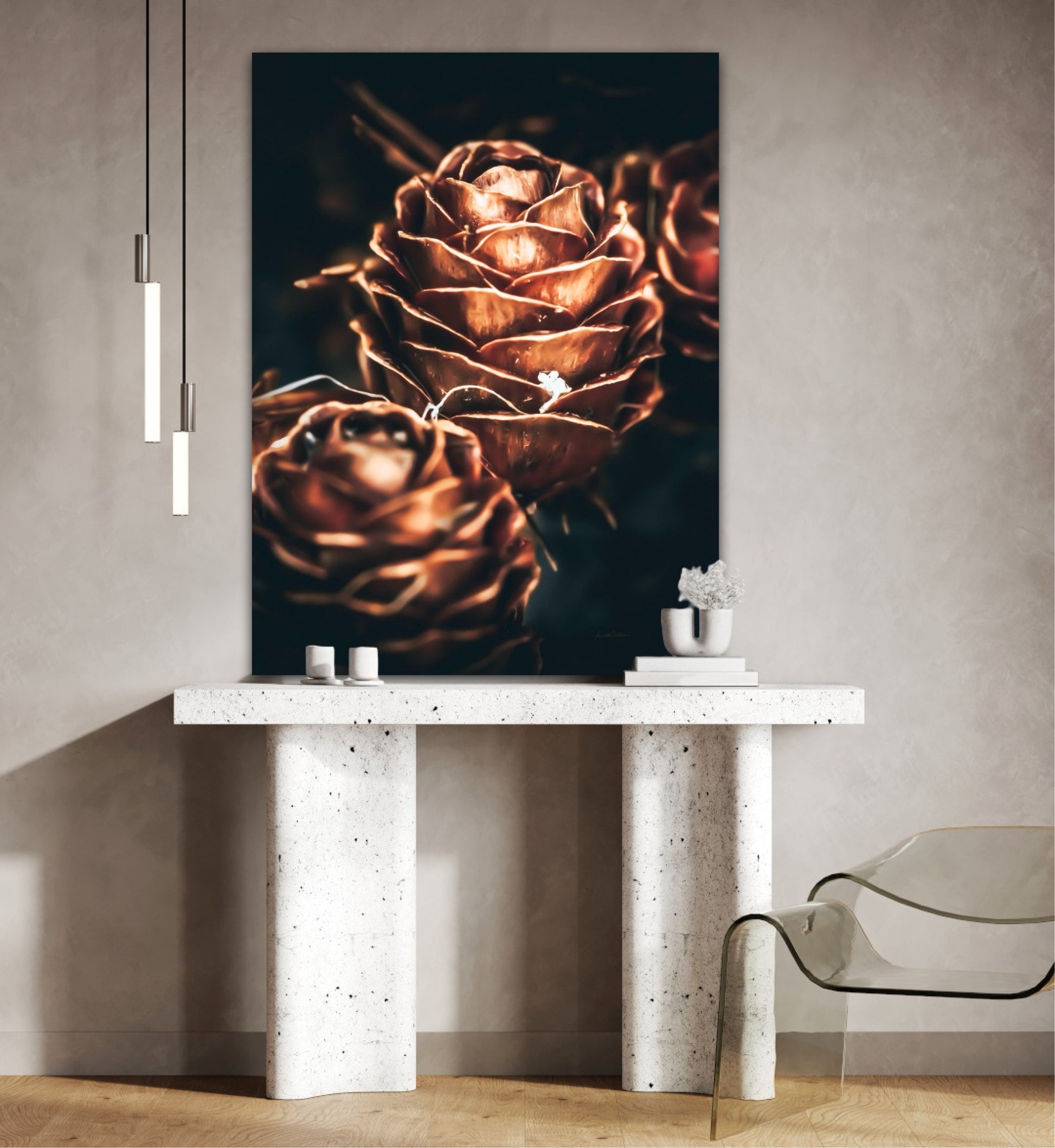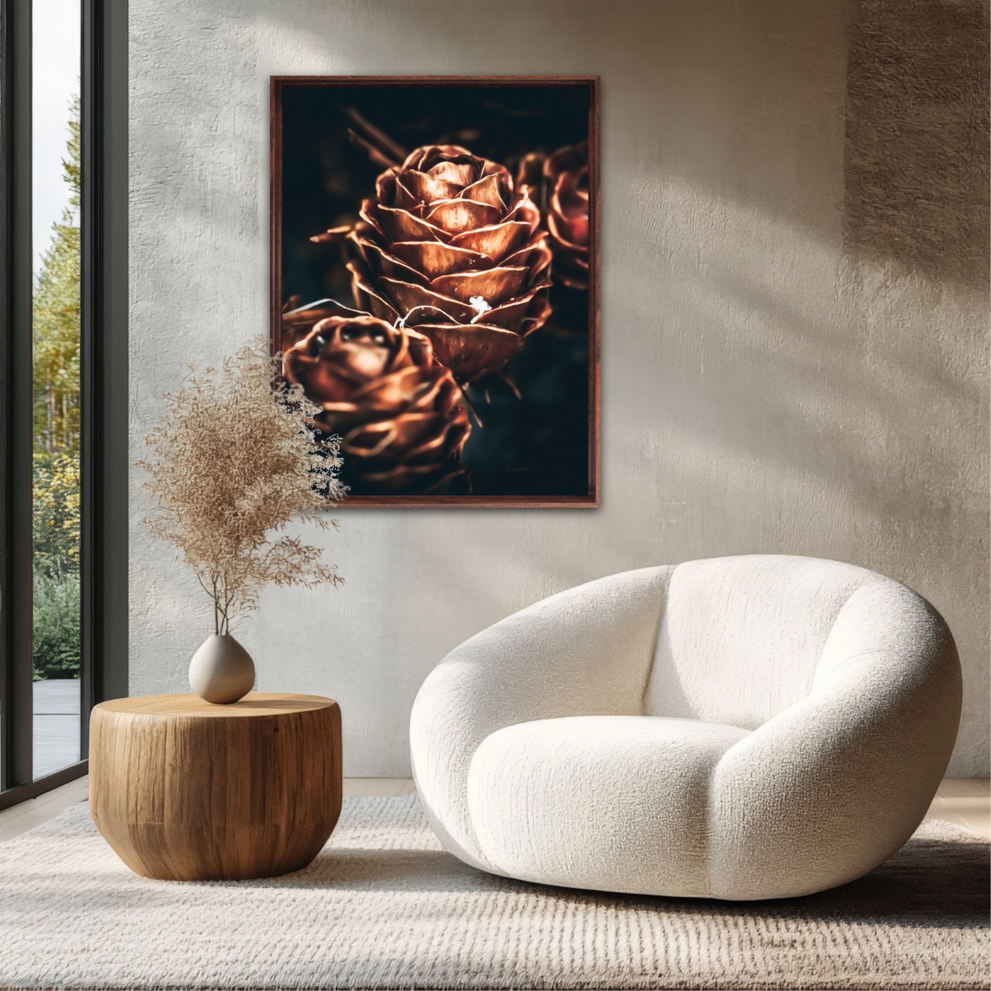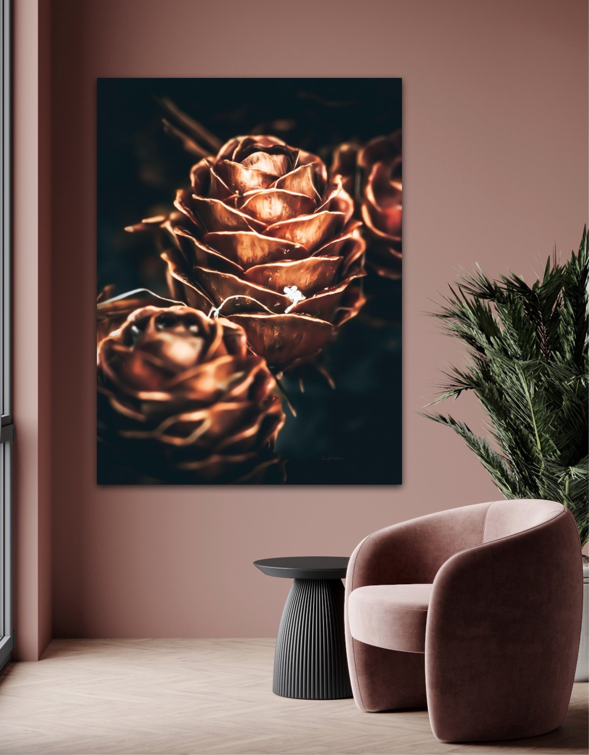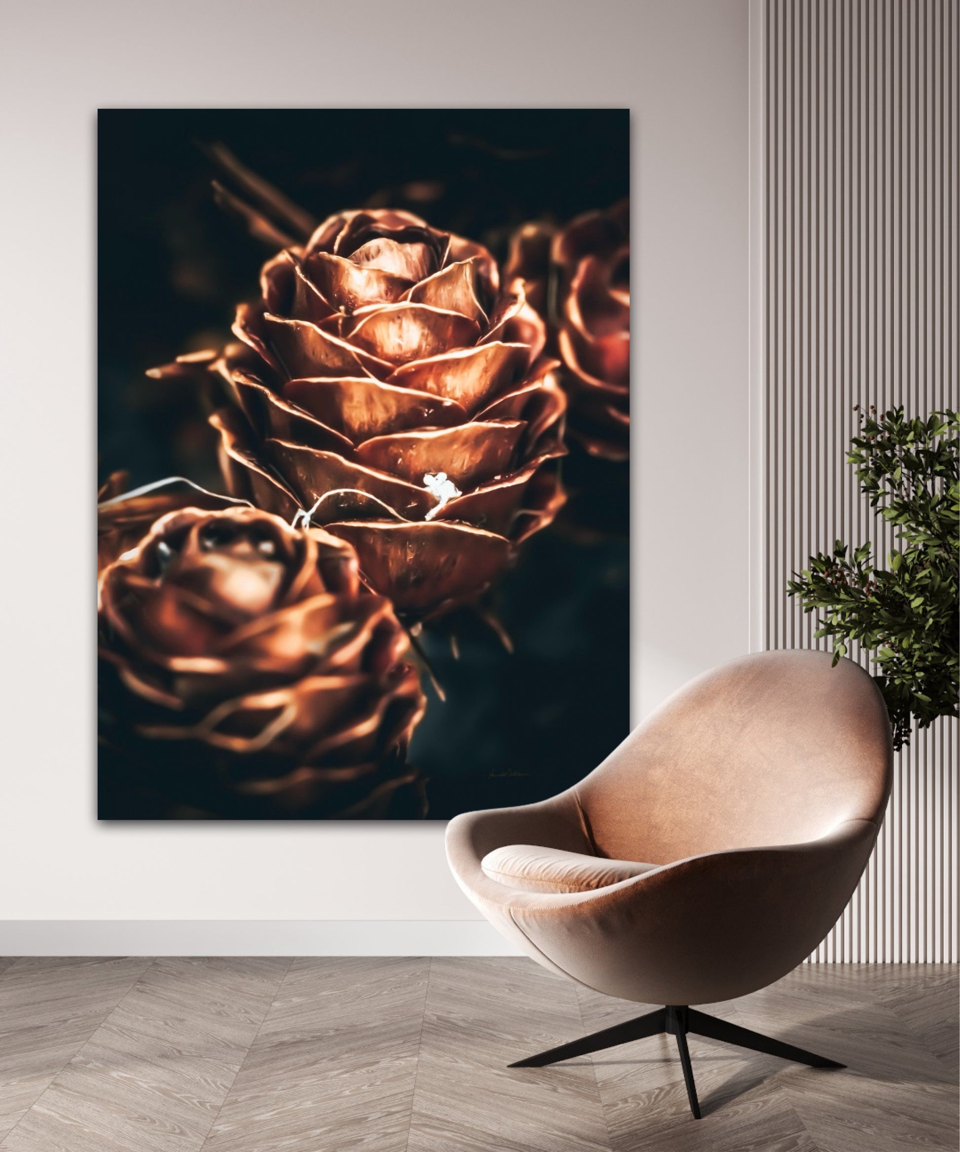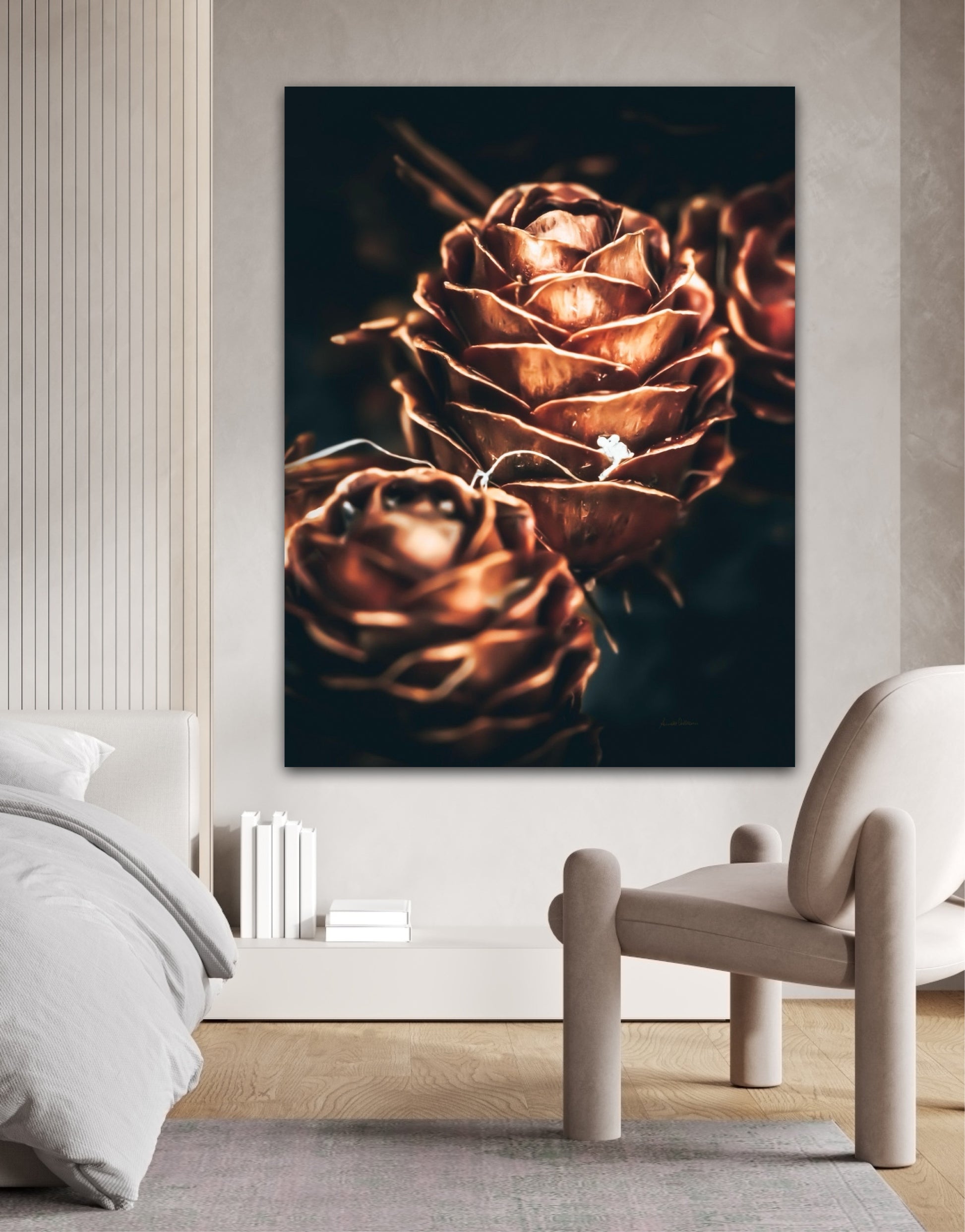 Beautiful photographic wall art that is a really close photo of pine cones that shine so beautifully in golden light. The colours are beautiful earth tones and are very pleasant to look at. This wall art will be a great decoration on your wall. It gives you peace from nature, and will impress friends and family. Get a beautiful piece of art on the wall. The mural fits particularly well in the cabin.