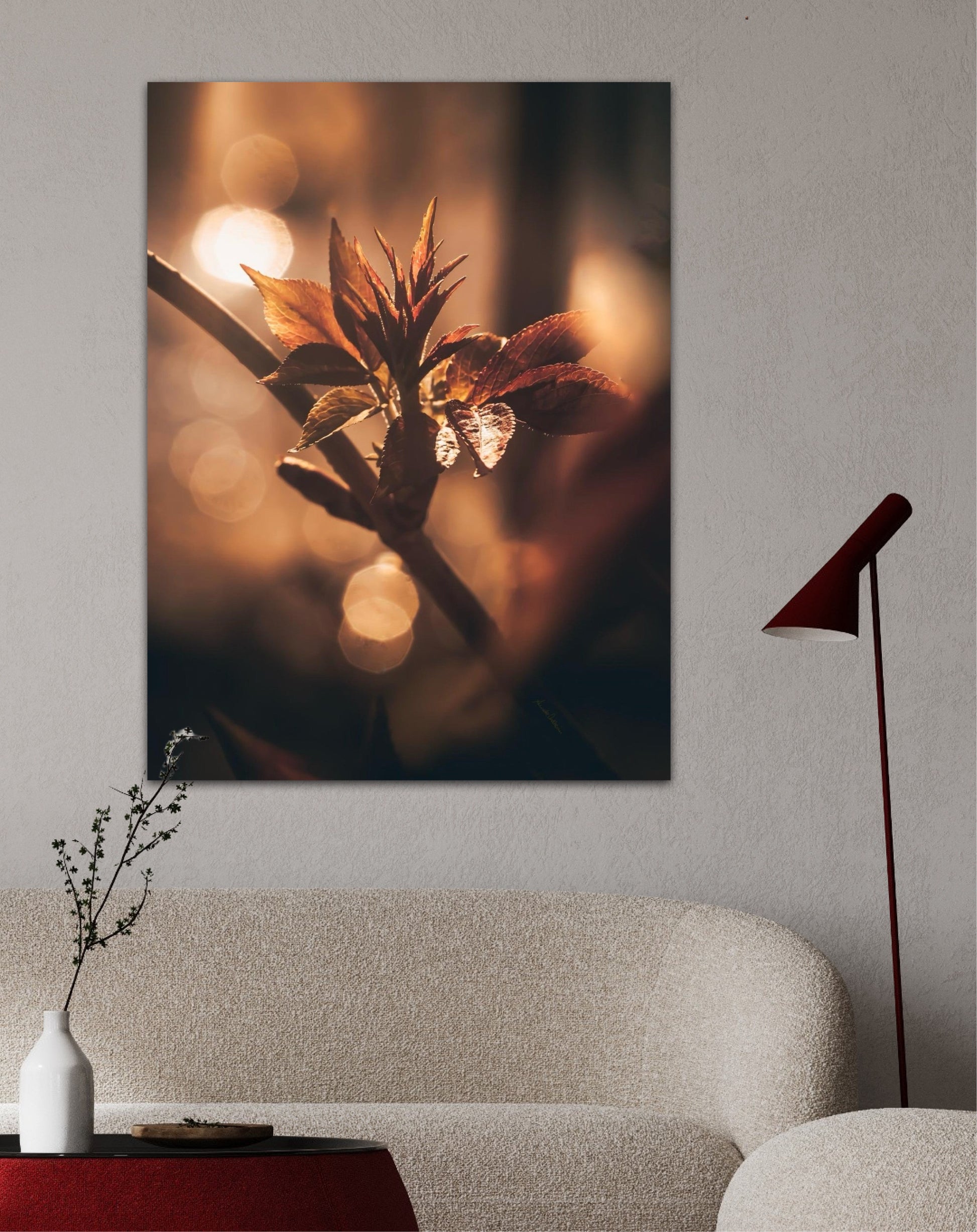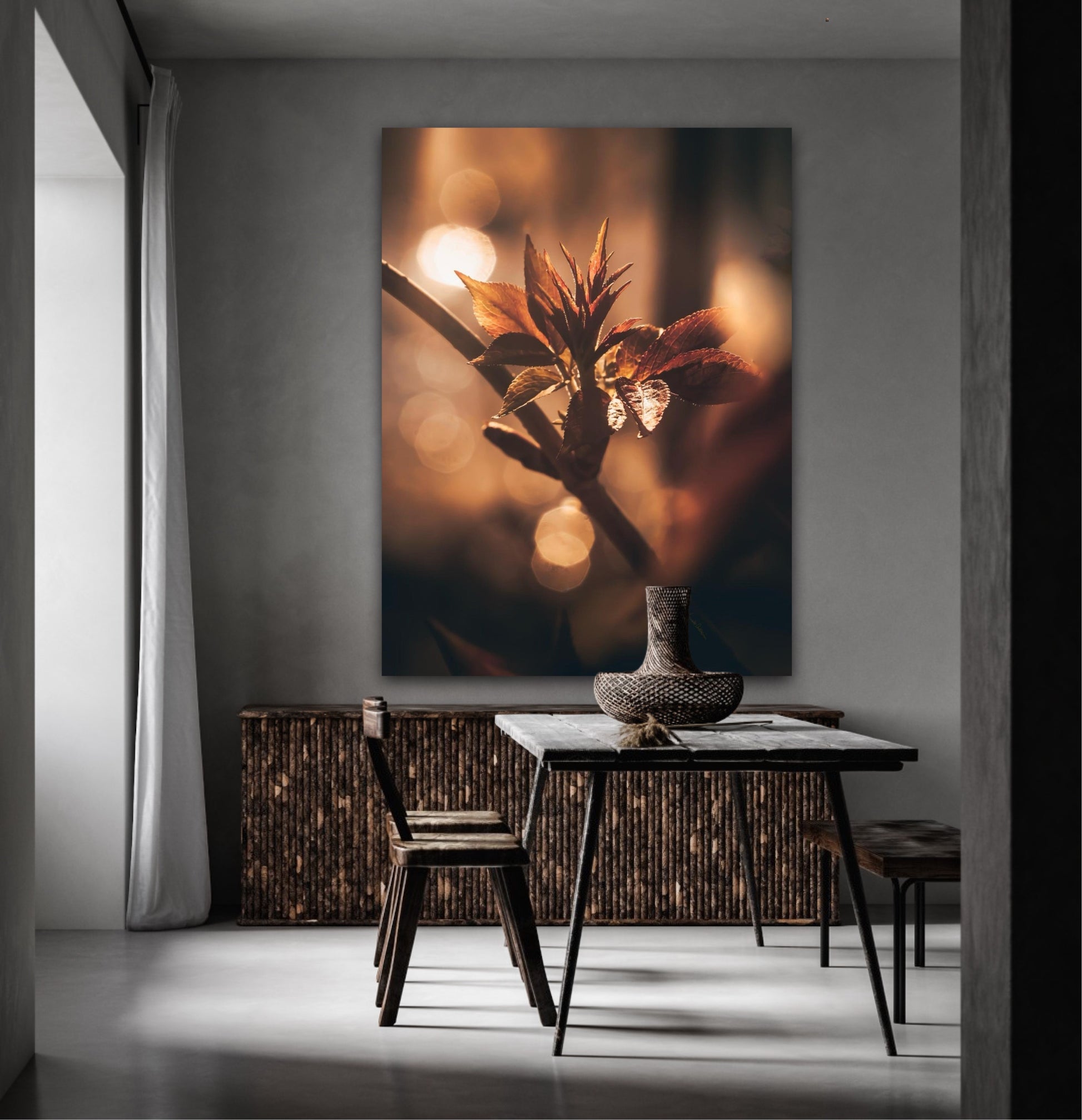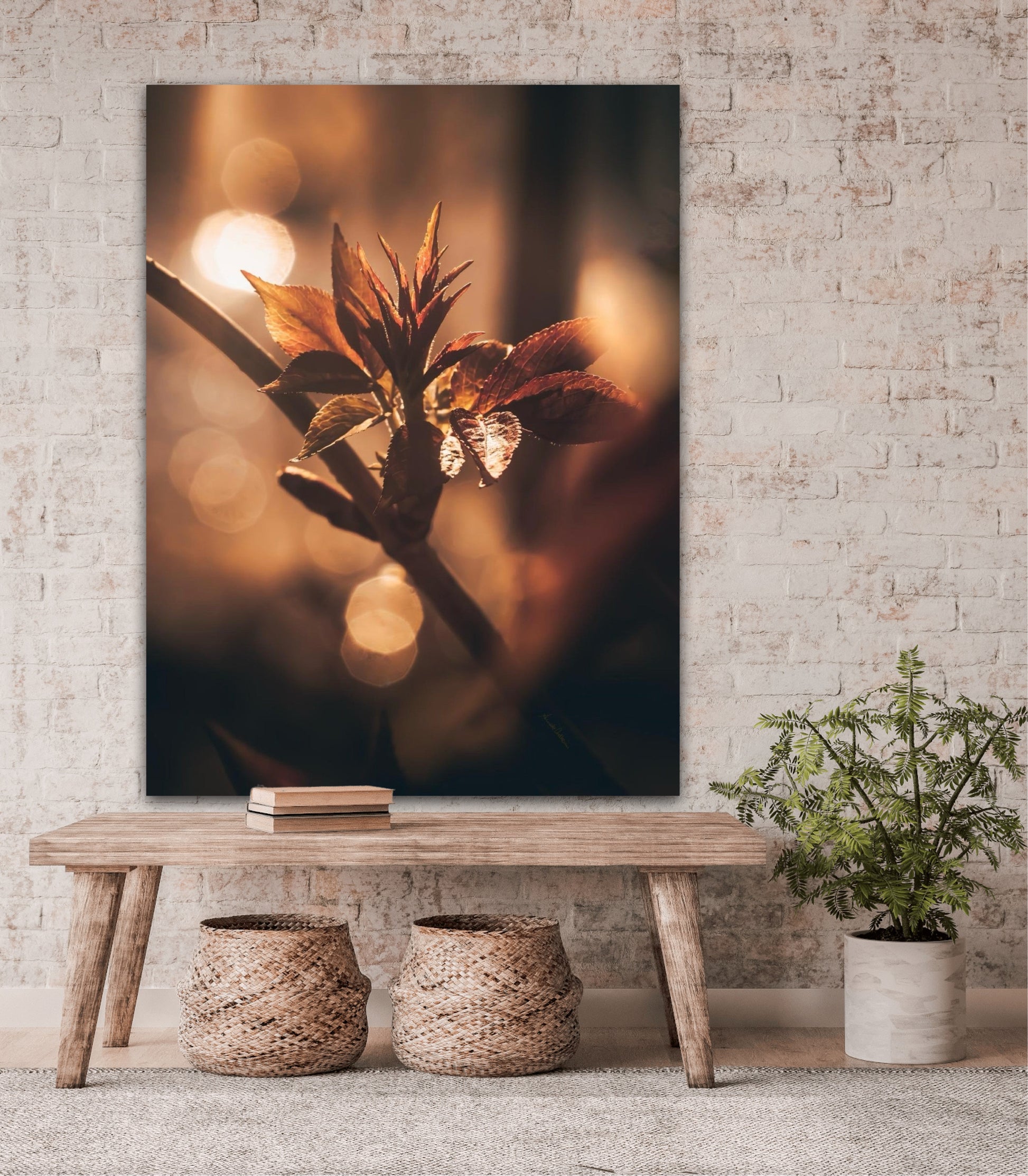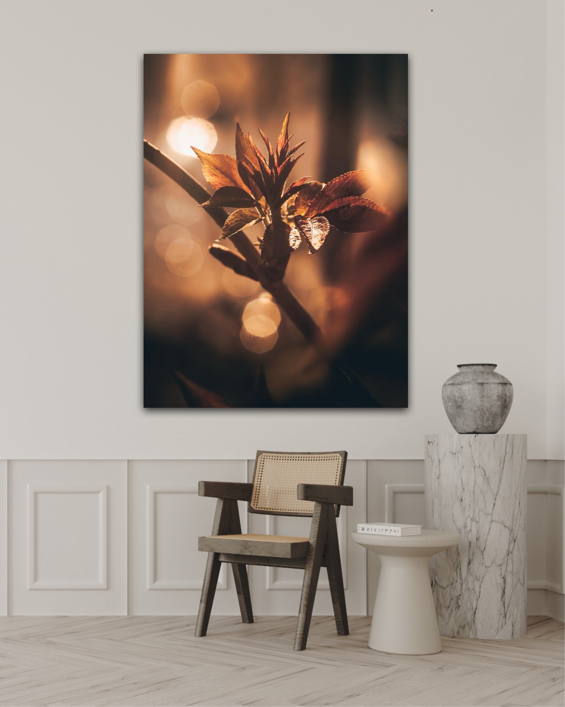 Beautiful and warm photographic art image of sprouting leaves on a tree branch on gorgeous, golden light. Beautiful and peaceful, get the good feeling with this beautiful artwork.