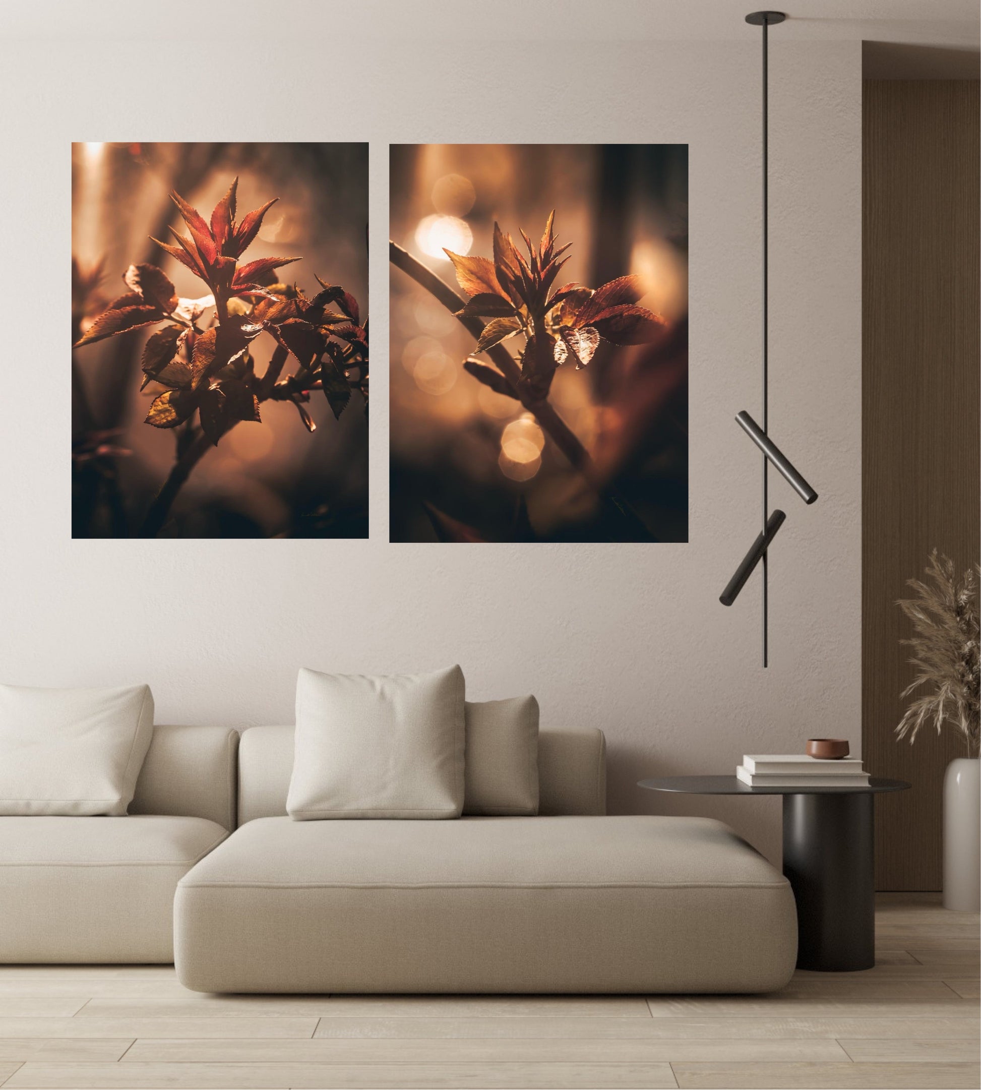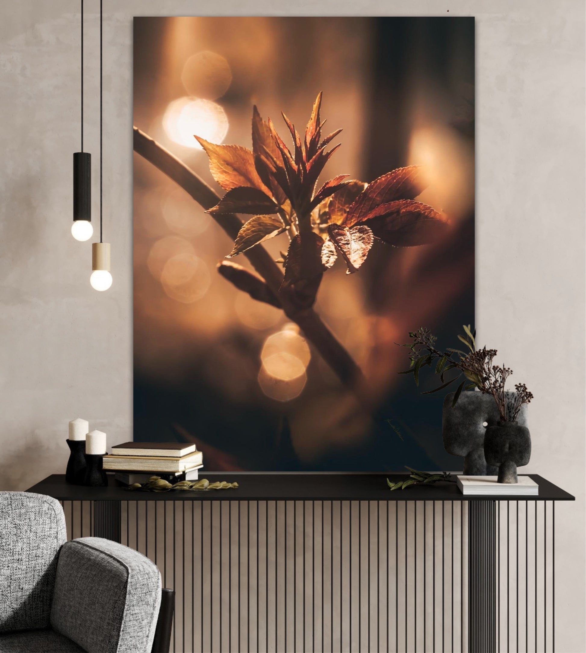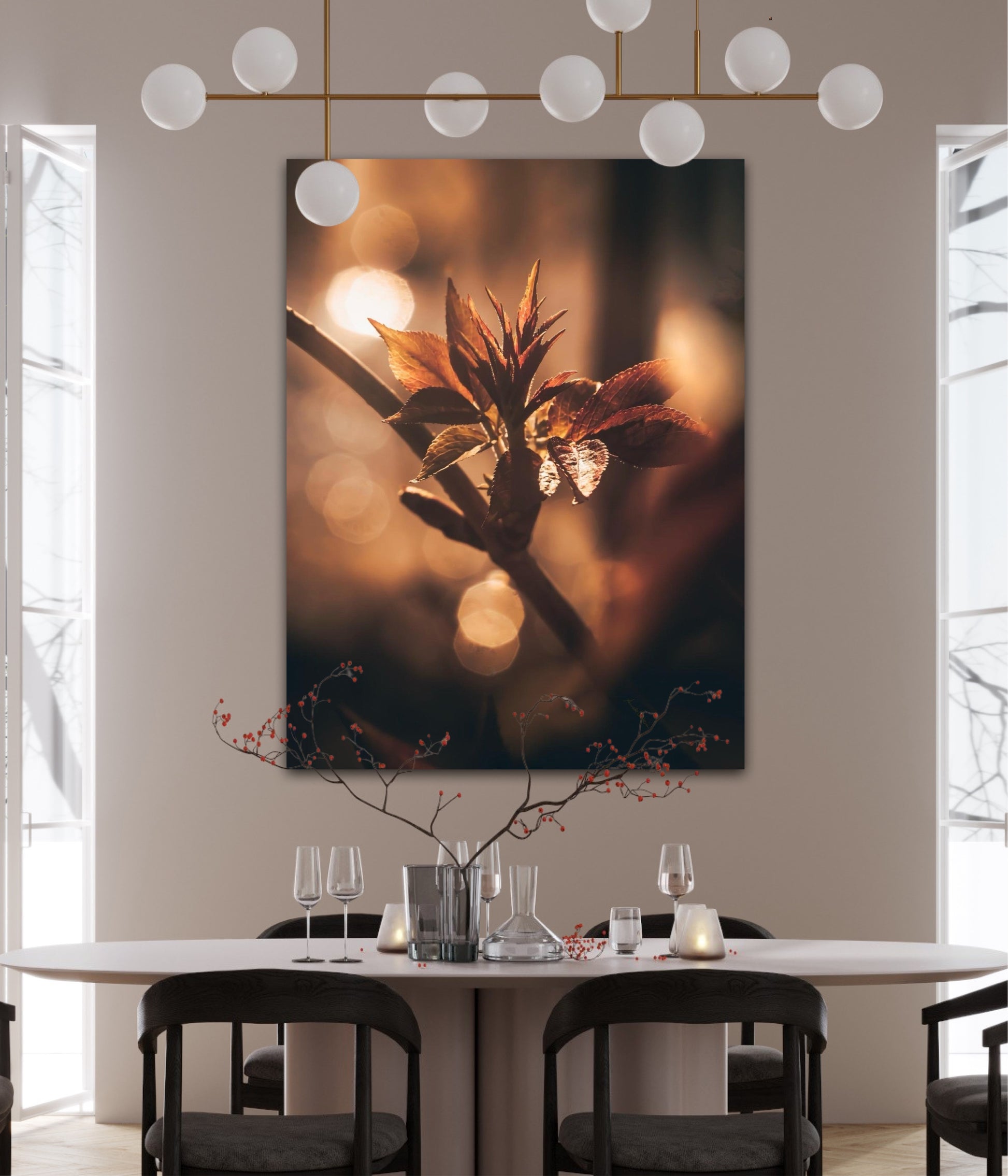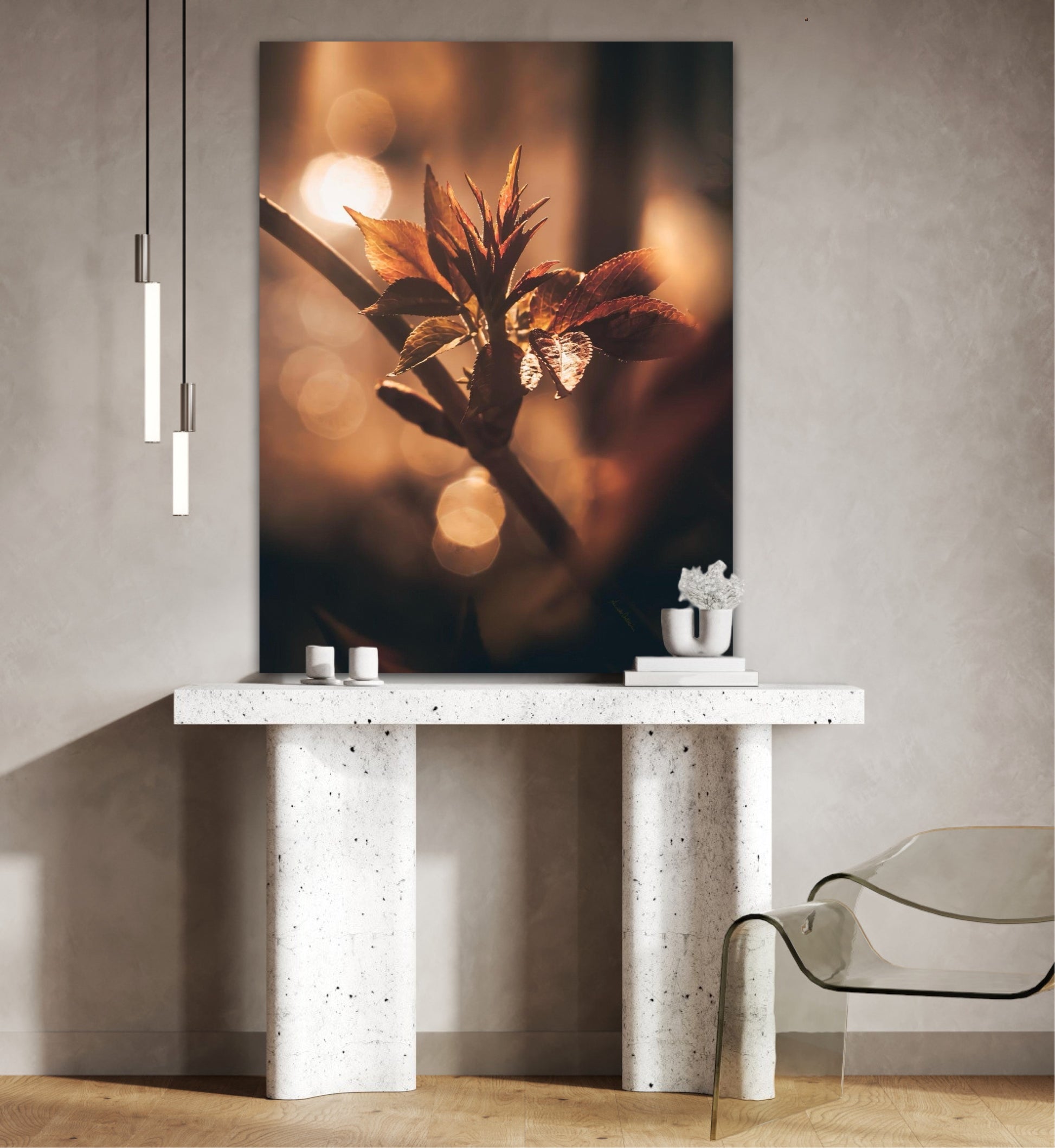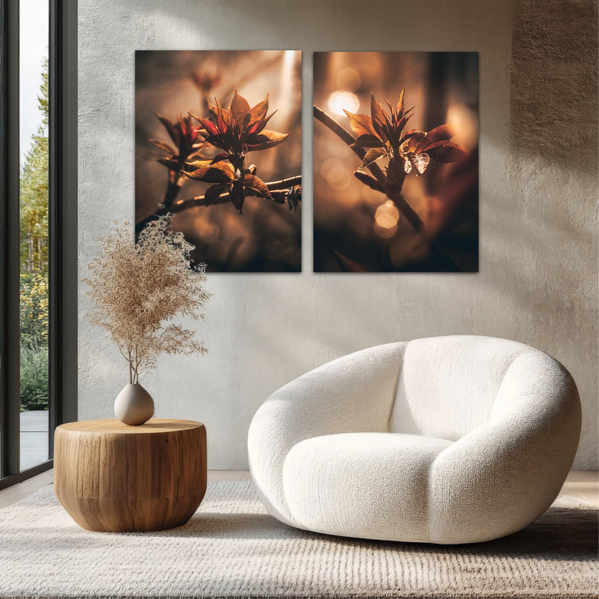 Beautiful and warm photographic art image of sprouting leaves on a tree branch on gorgeous, golden light. Beautiful and peaceful, get the good feeling with this beautiful artwork.