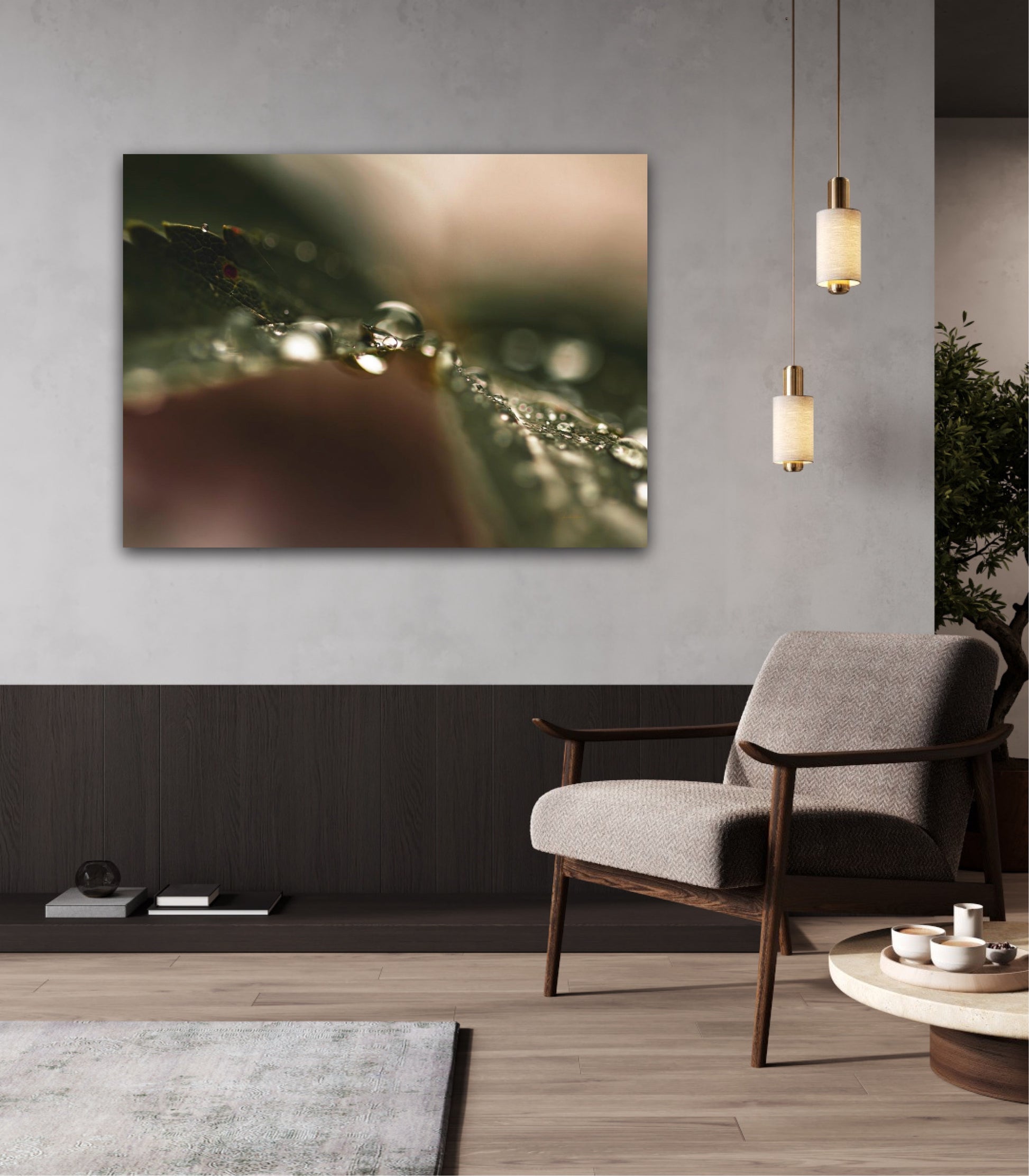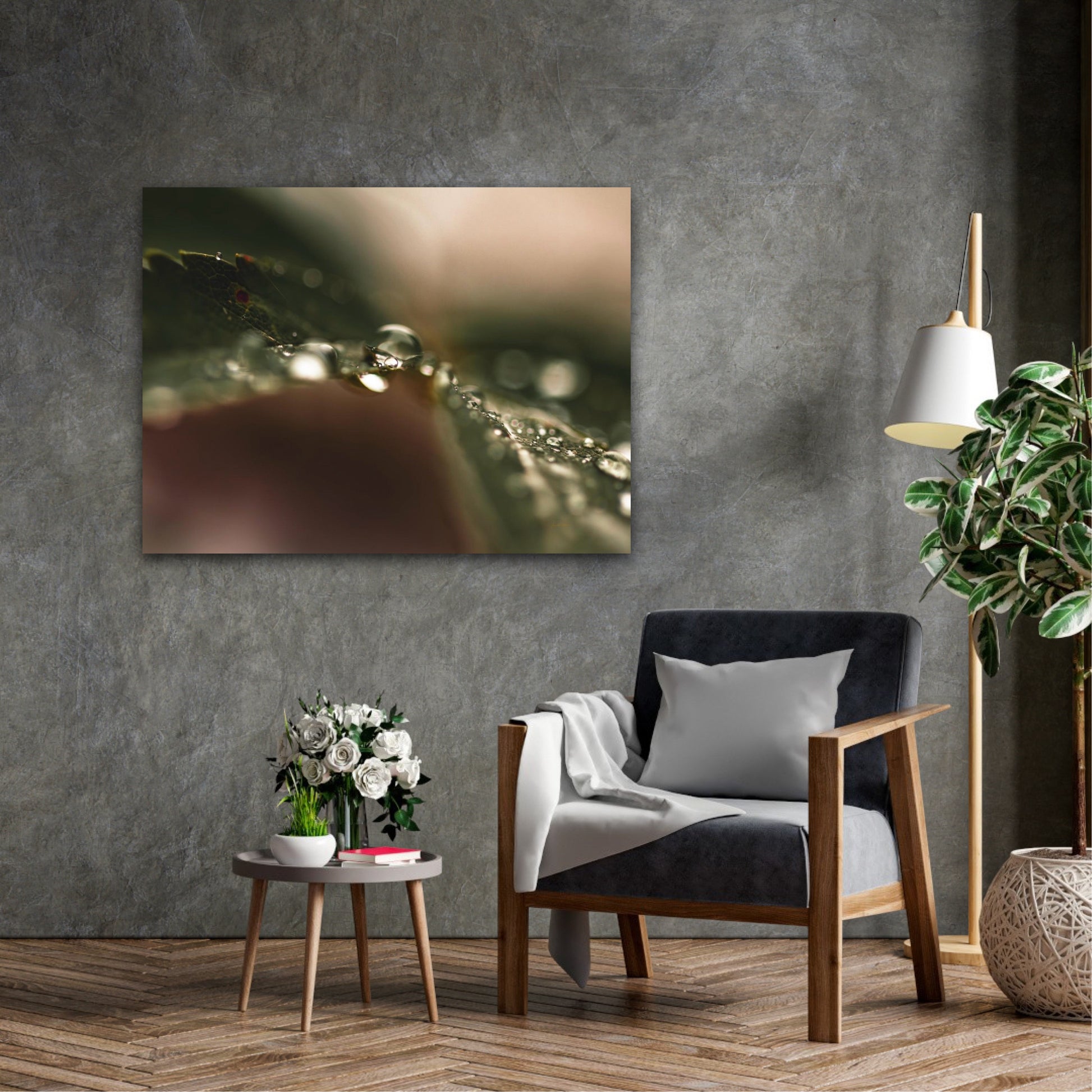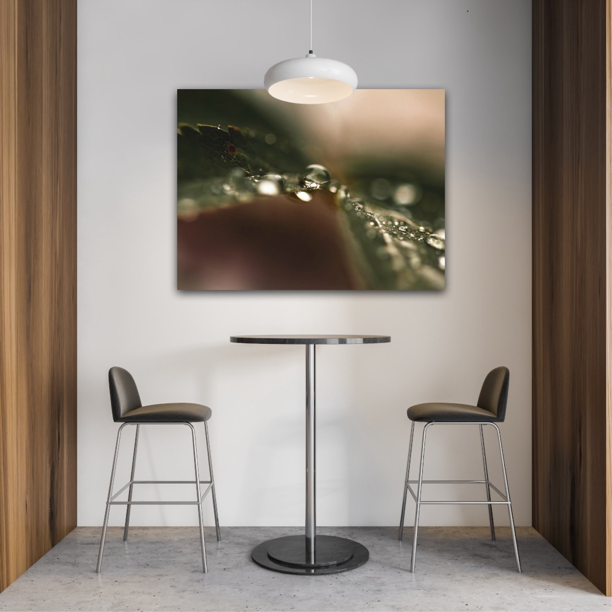 Beautiful photographic wall art of a green leaf with raindrops, just like diamonds. Feel the power of the motif and get an impressive piece of art on the wall with this artwork. Get the wonders of nature close to you, and impress your friends and family with this wall art.