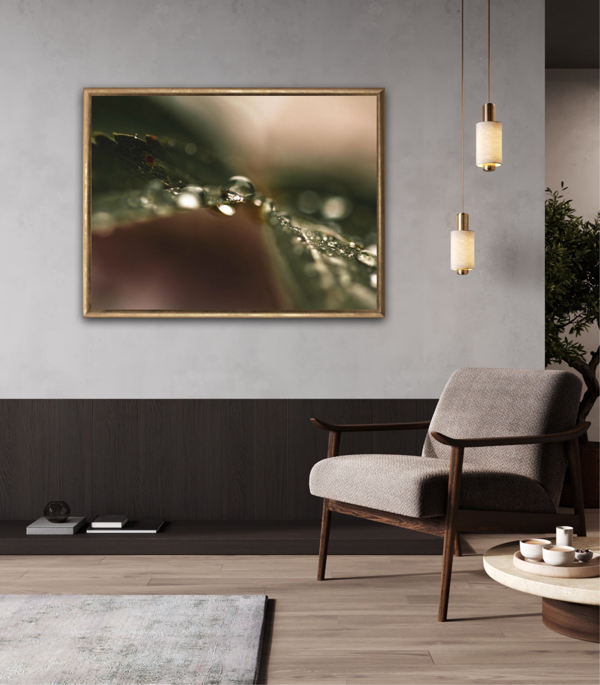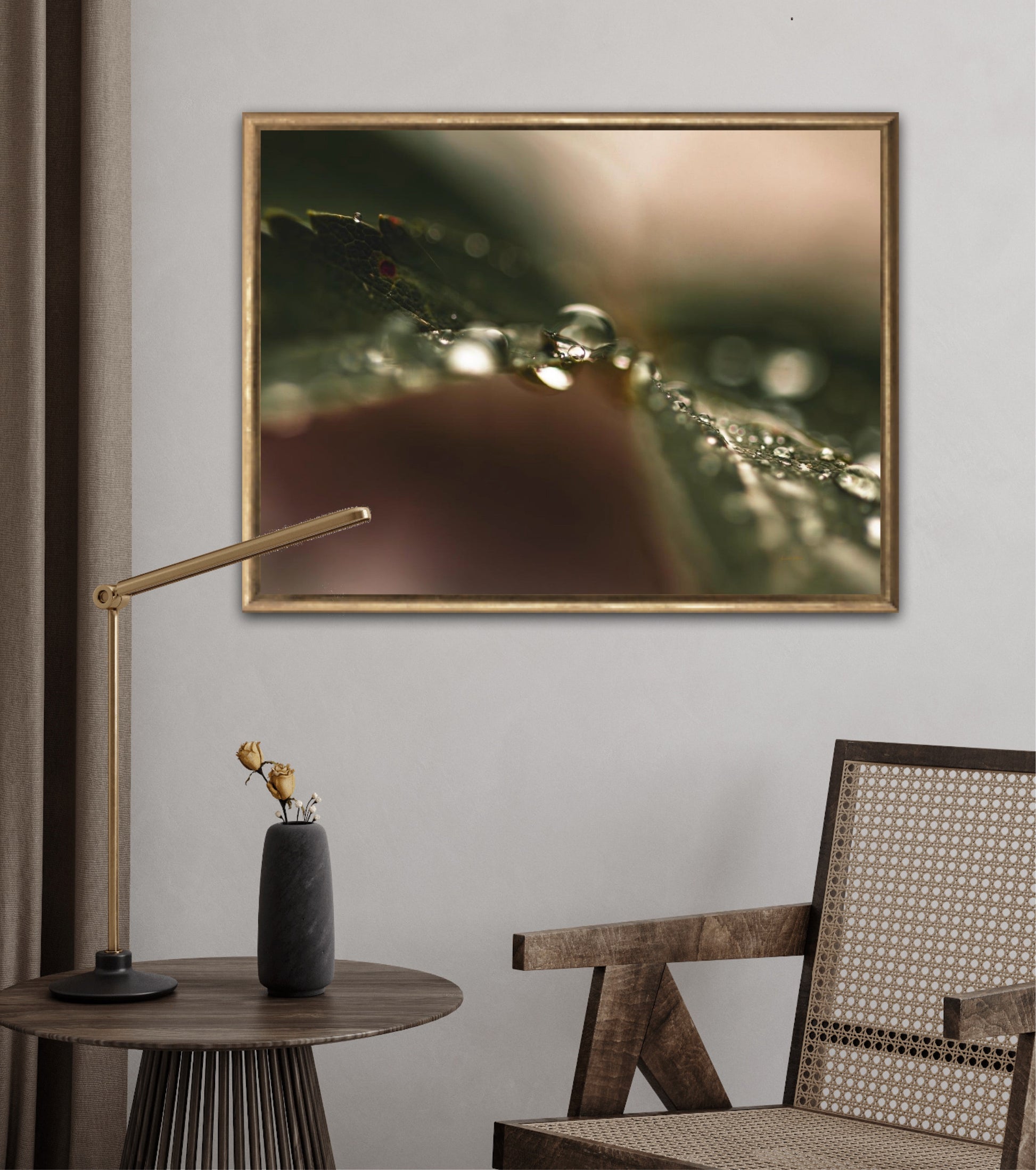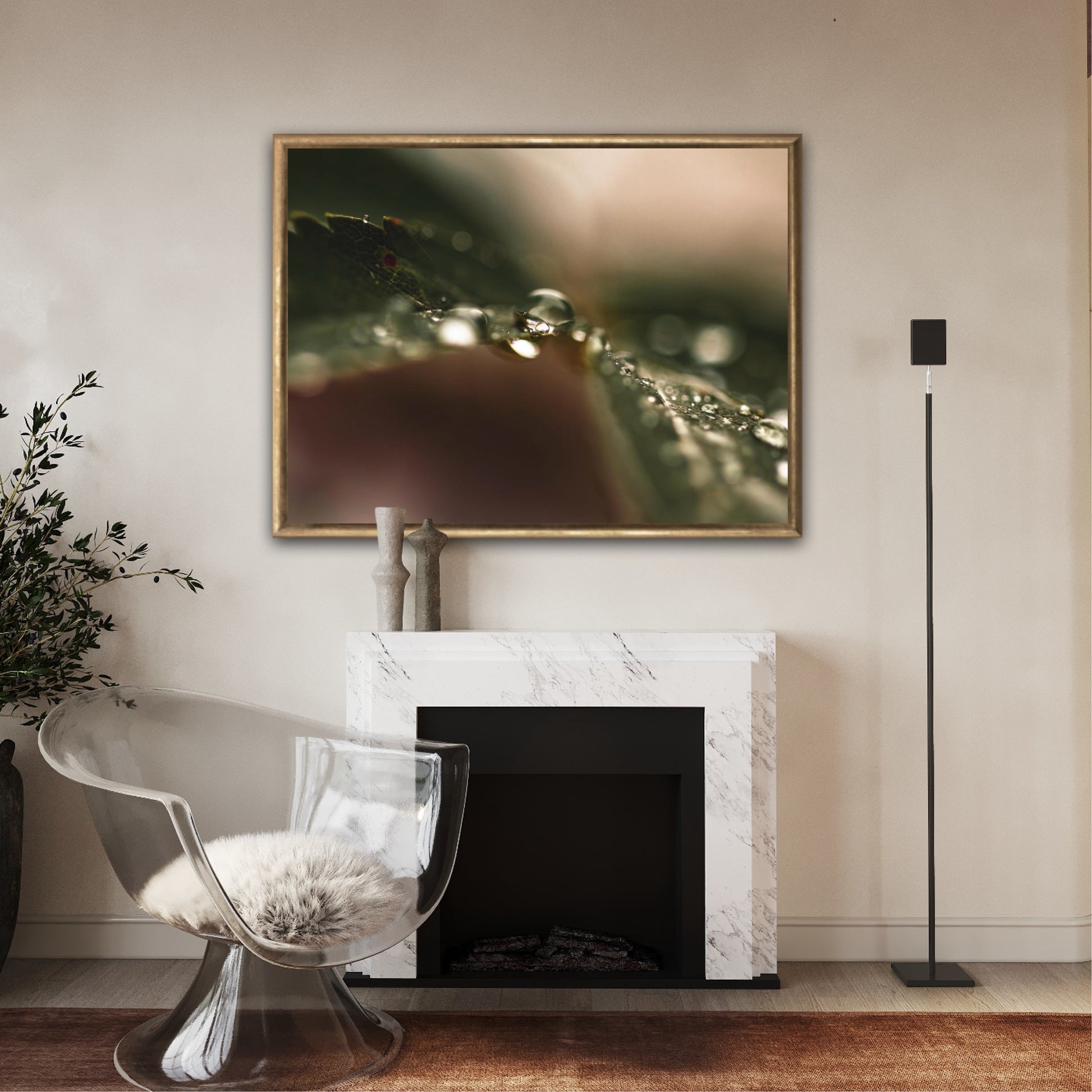 Beautiful photographic wall art of a green leaf with raindrops, just like diamonds. Feel the power of the motif and get an impressive piece of art on the wall with this artwork. Get the wonders of nature close to you, and impress your friends and family with this wall art.
