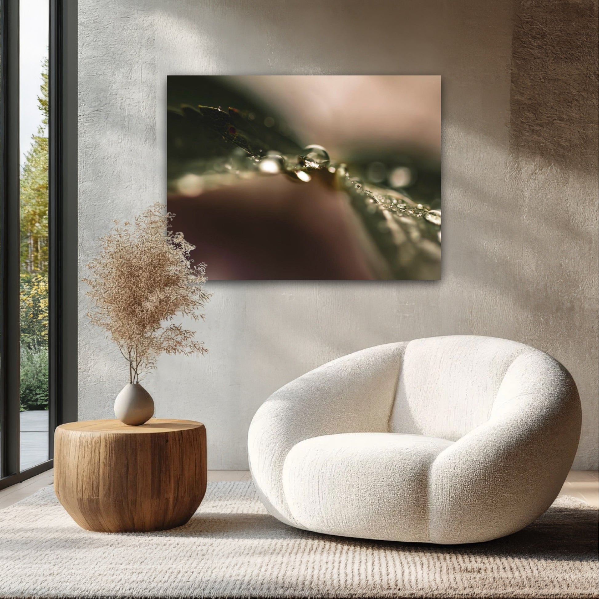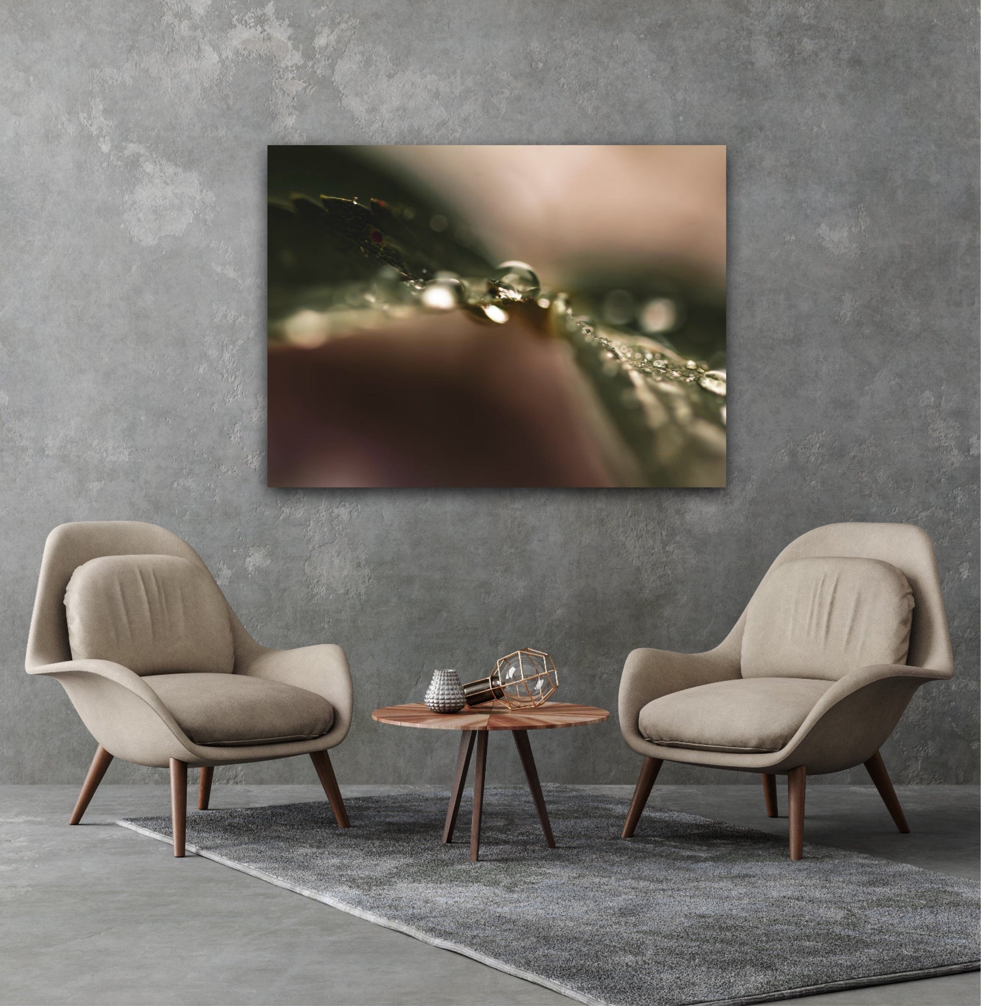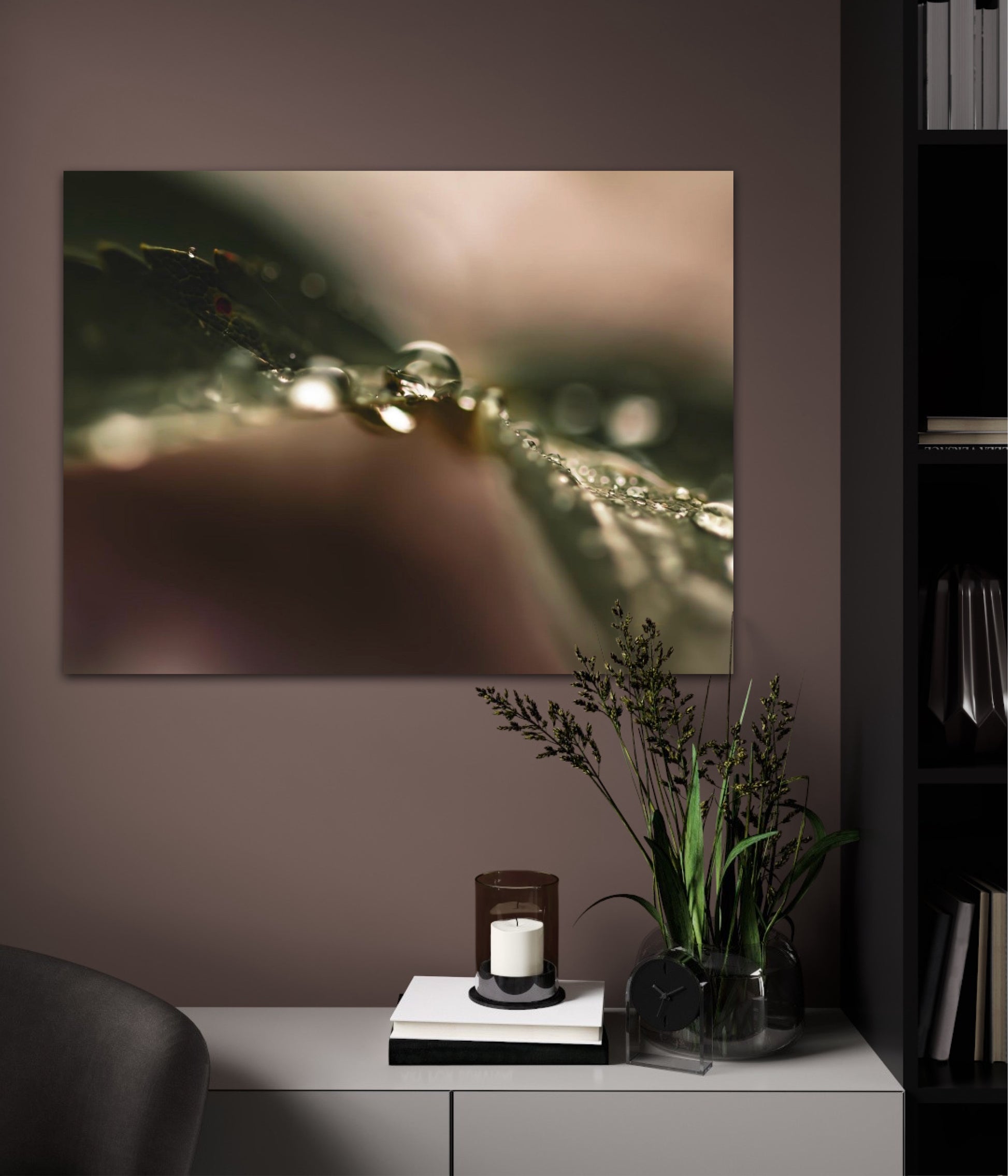 Beautiful photographic wall art of a green leaf with raindrops, just like diamonds. Feel the power of the motif and get an impressive piece of art on the wall with this artwork. Get the wonders of nature close to you, and impress your friends and family with this wall art.