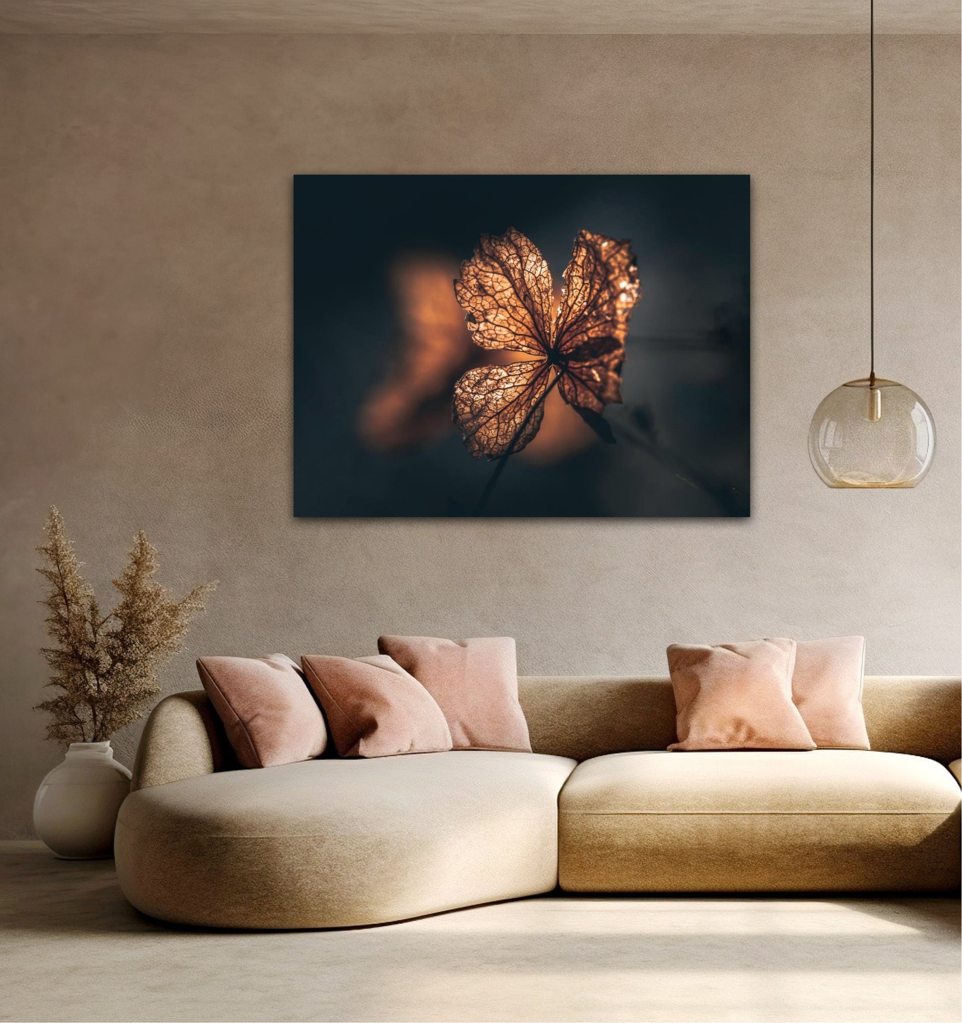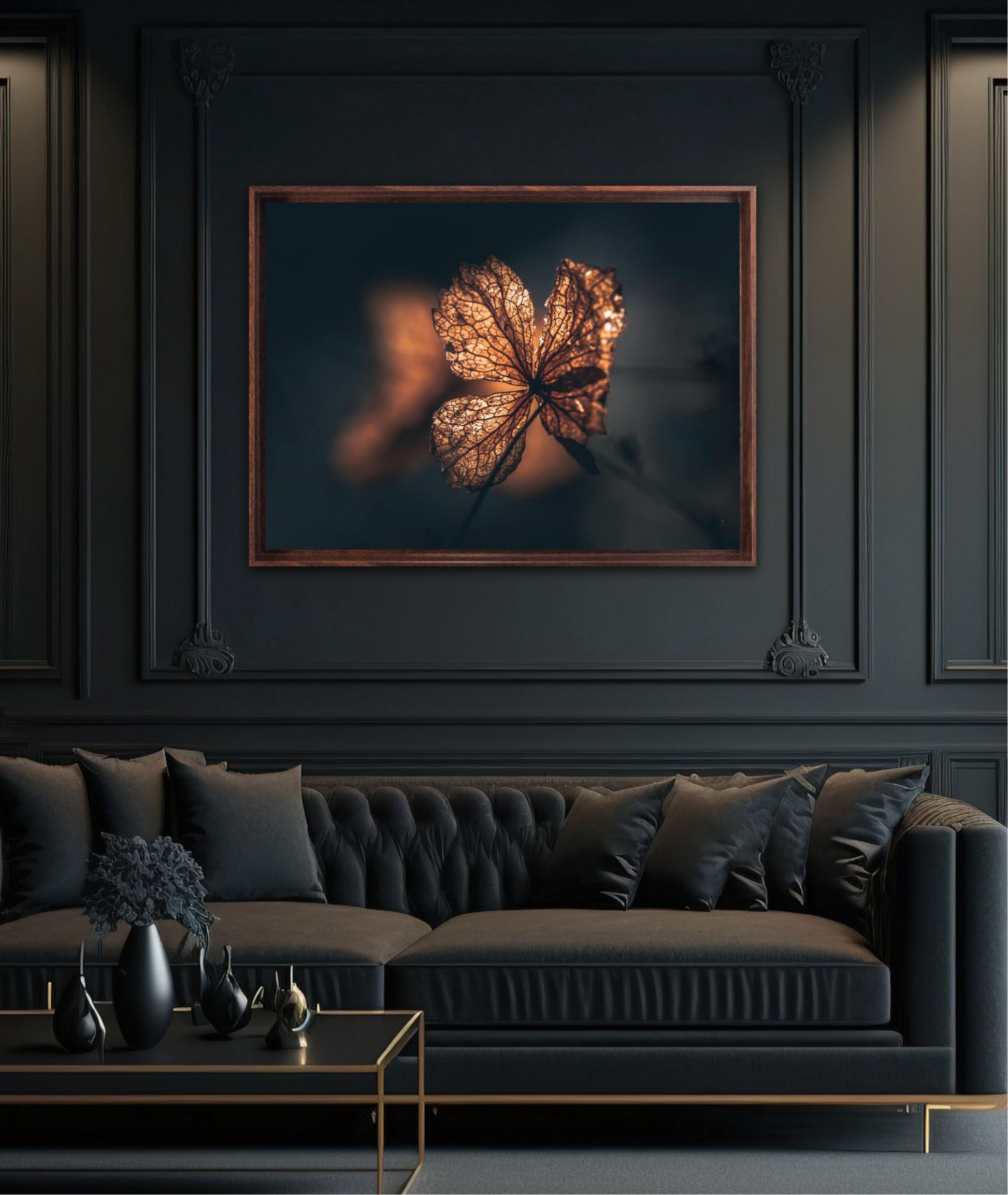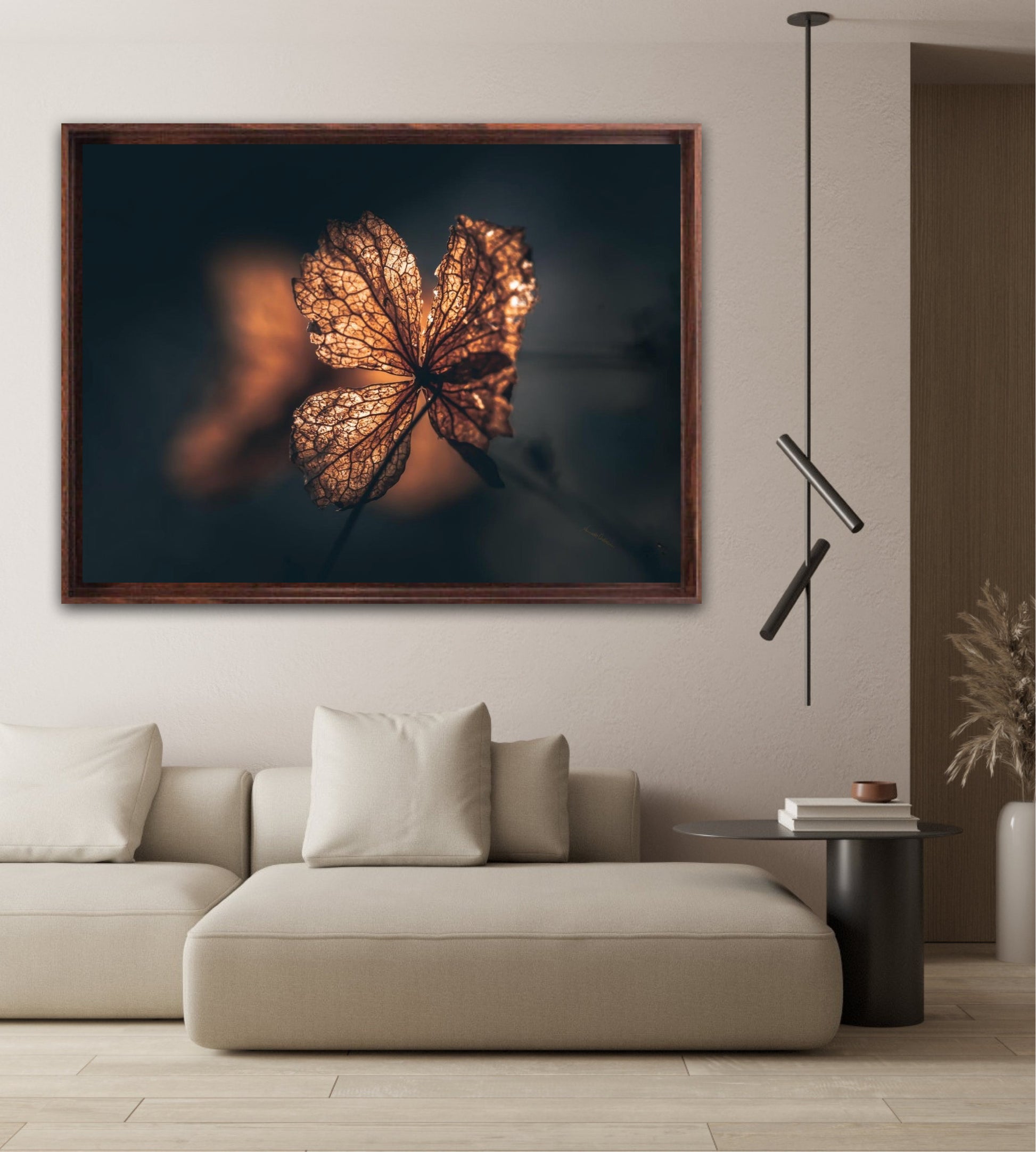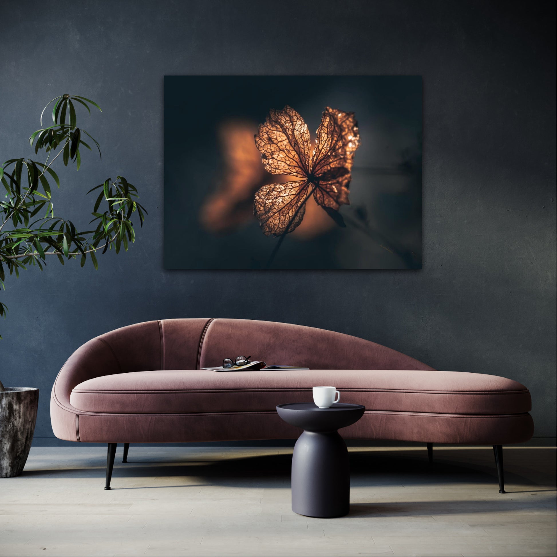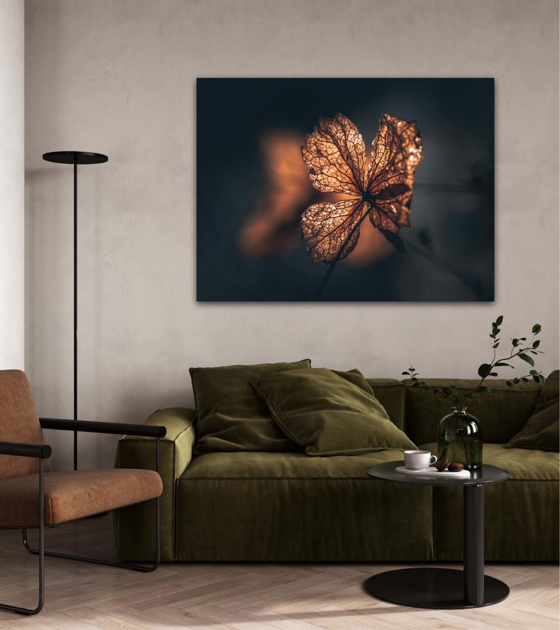 Beautiful photographic wall art of hydrangea a beautiful golden light. This artwork becomes an eye-catcher on the wall and brings nature into your home. Find the calm and magic of nature with this fine artwork.