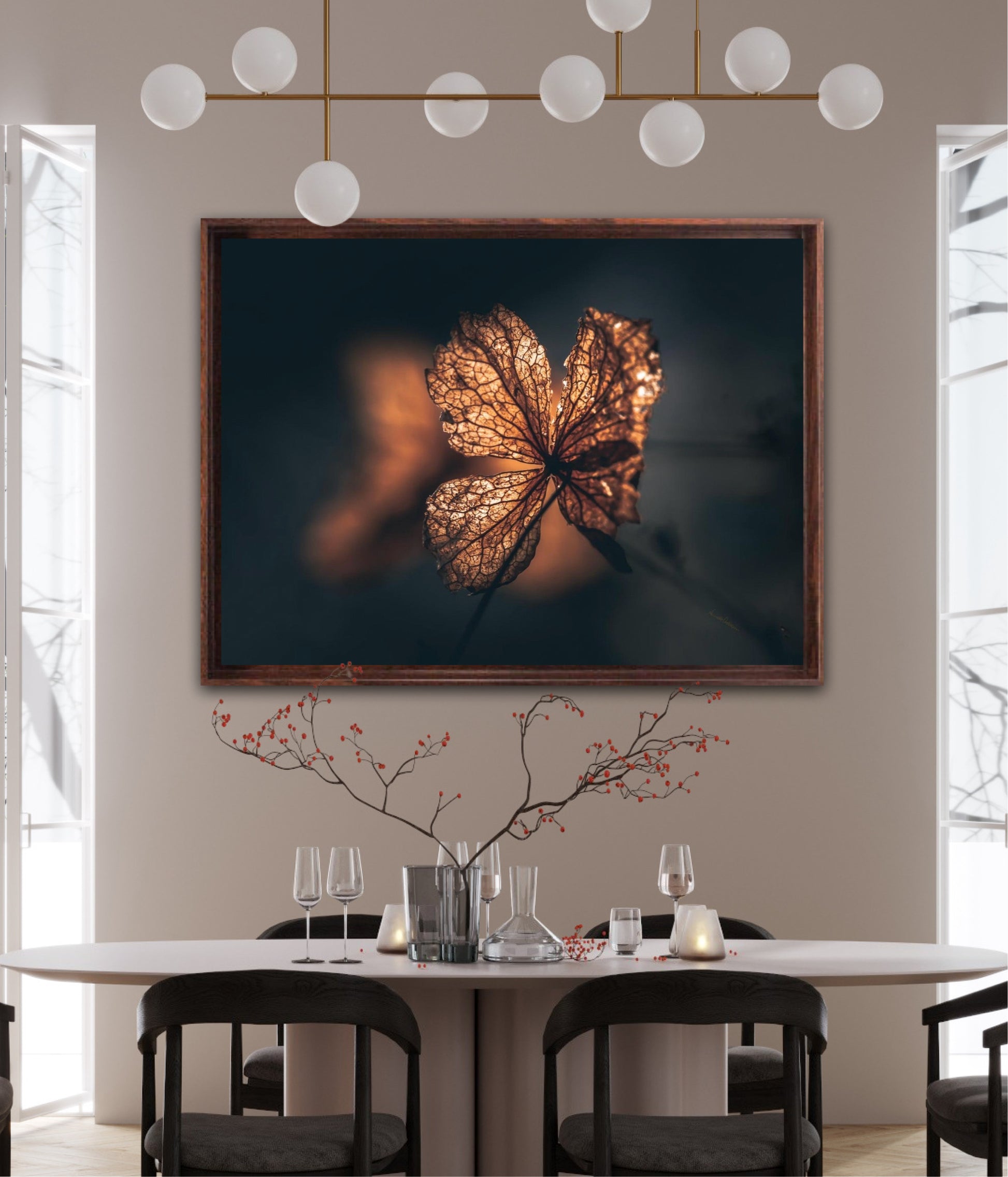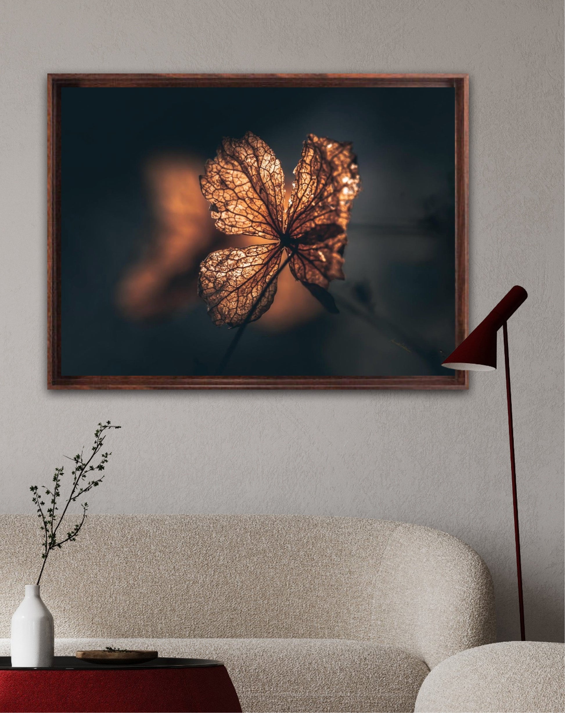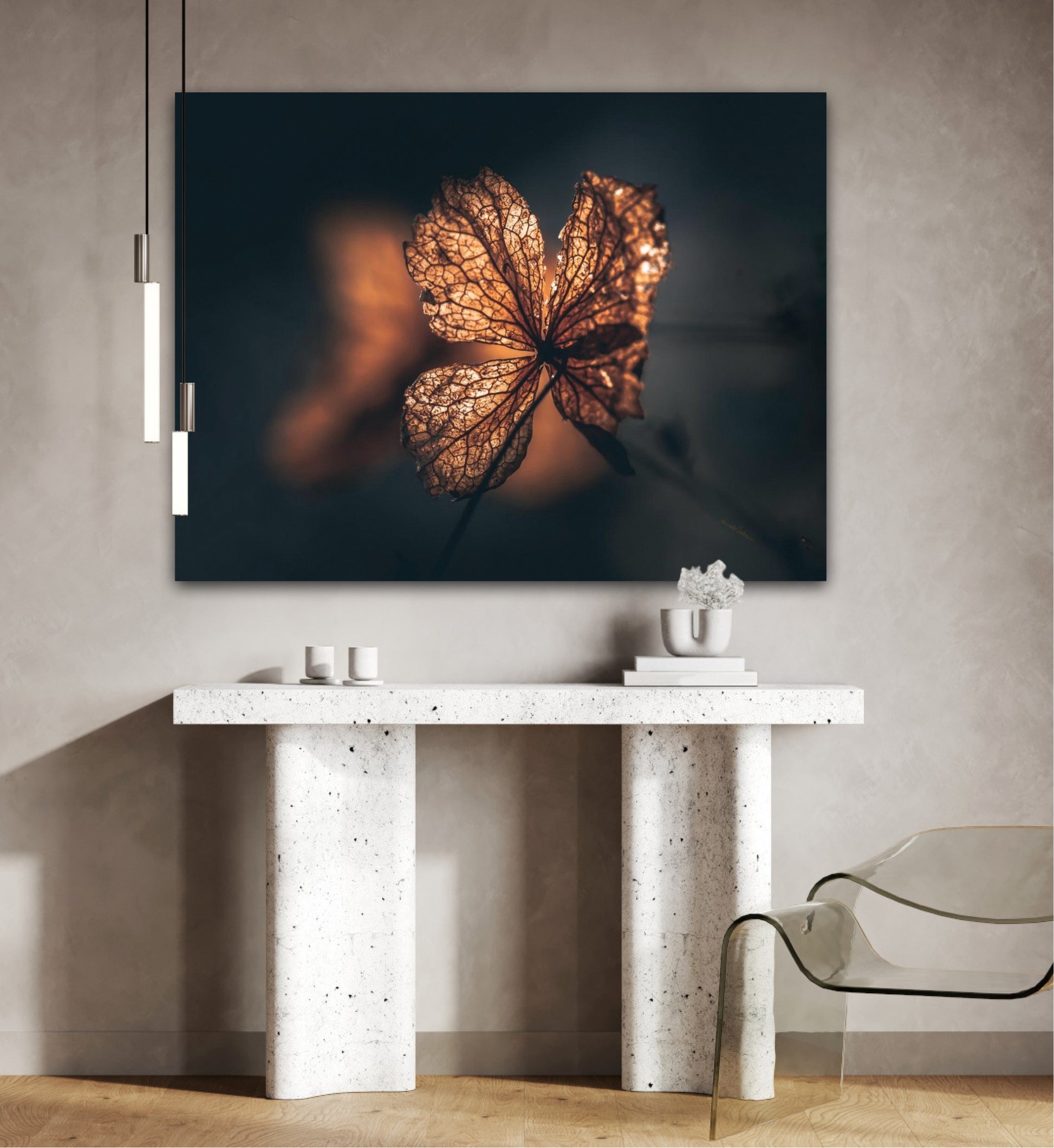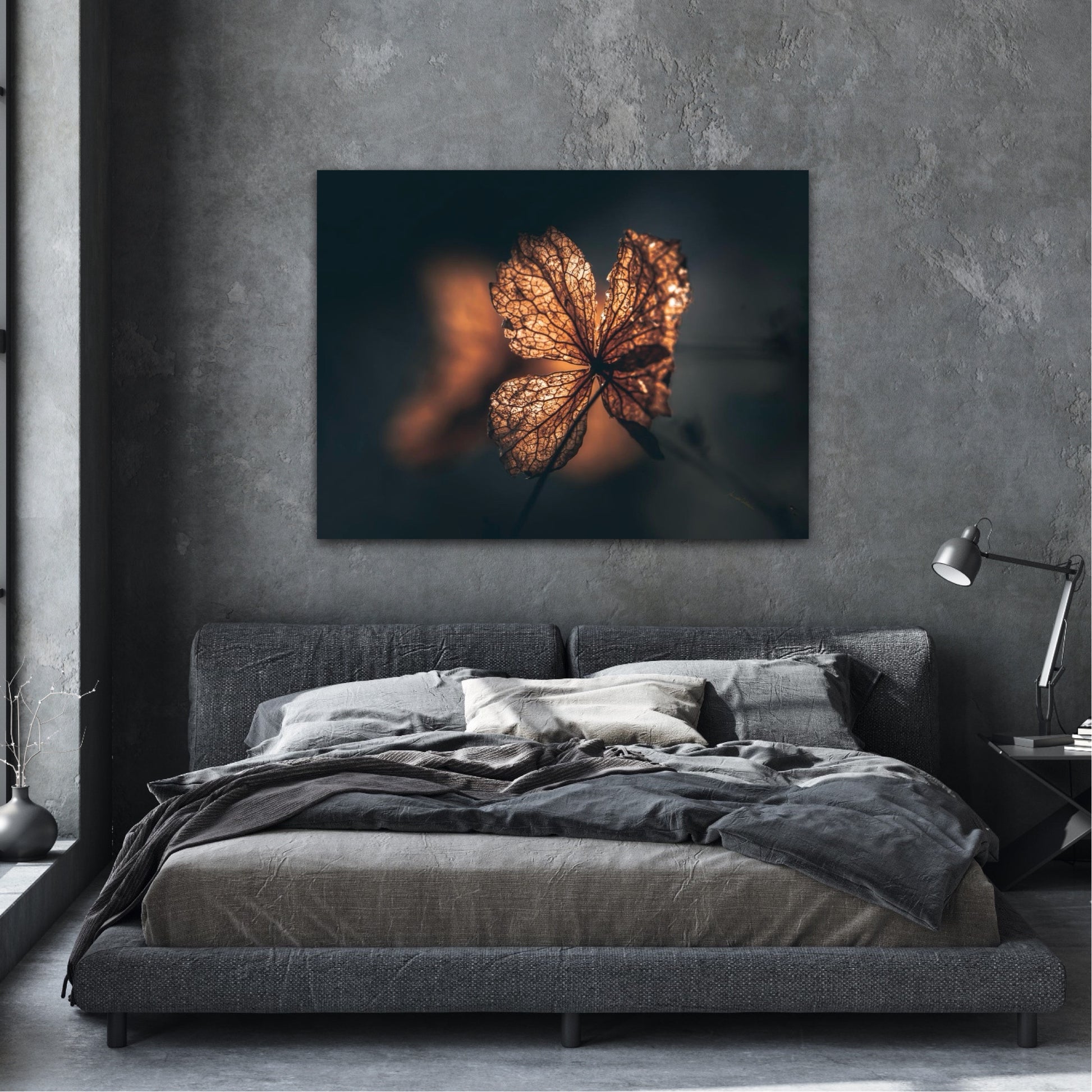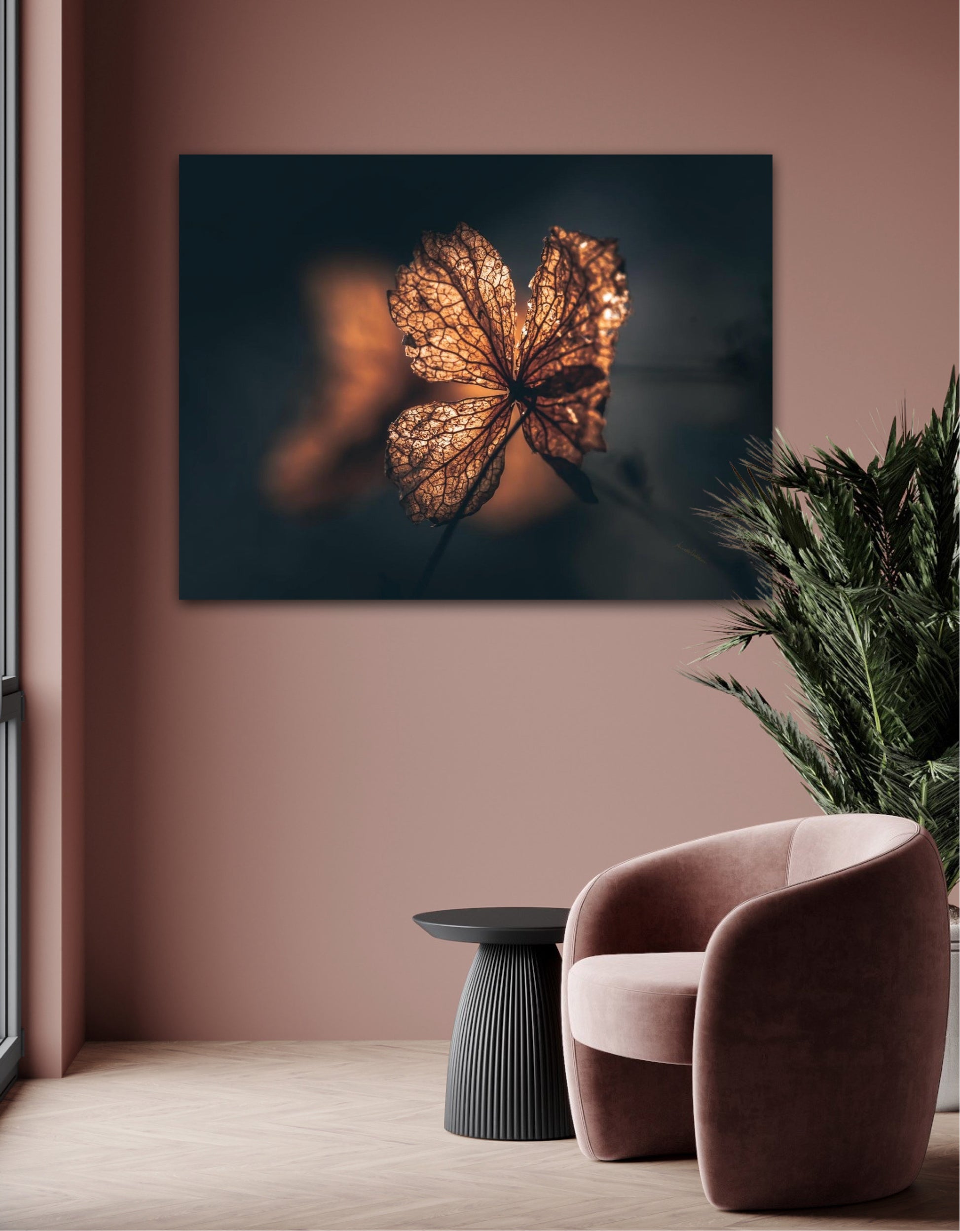 Beautiful photographic wall art of hydrangea a beautiful golden light. This artwork becomes an eye-catcher on the wall and brings nature into your home. Find the calm and magic of nature with this fine artwork.