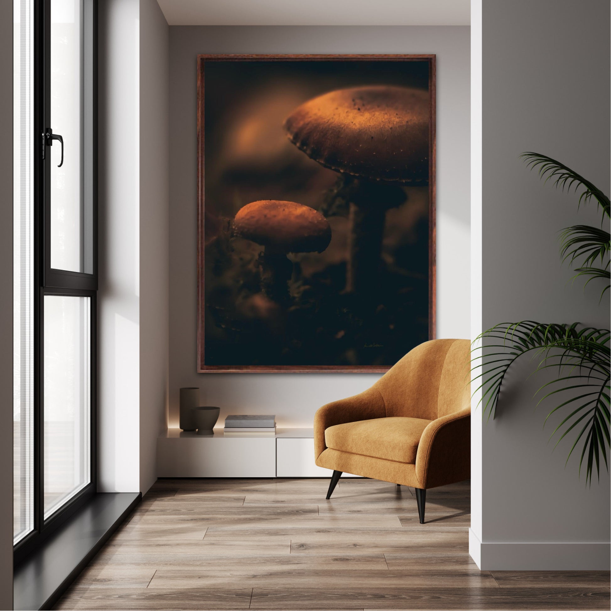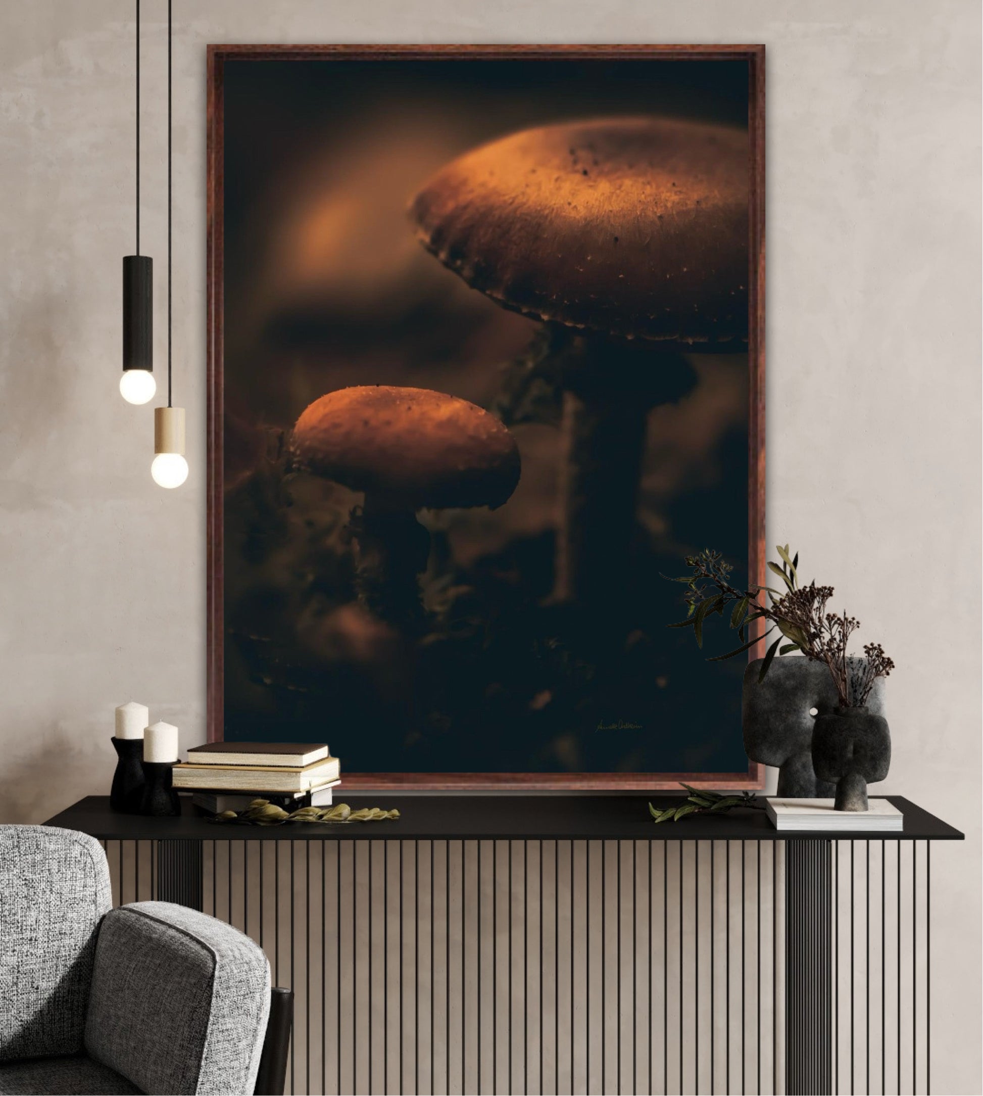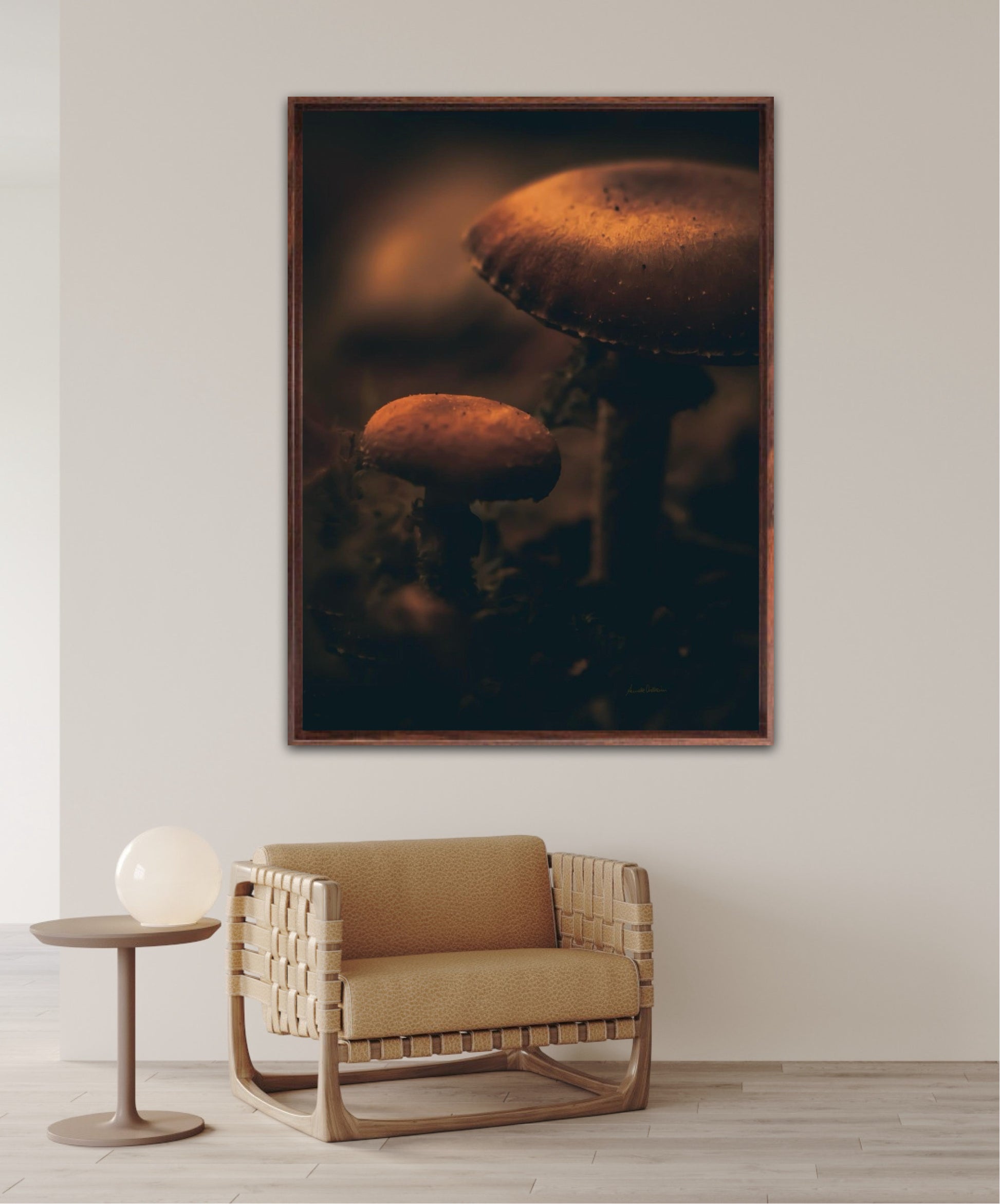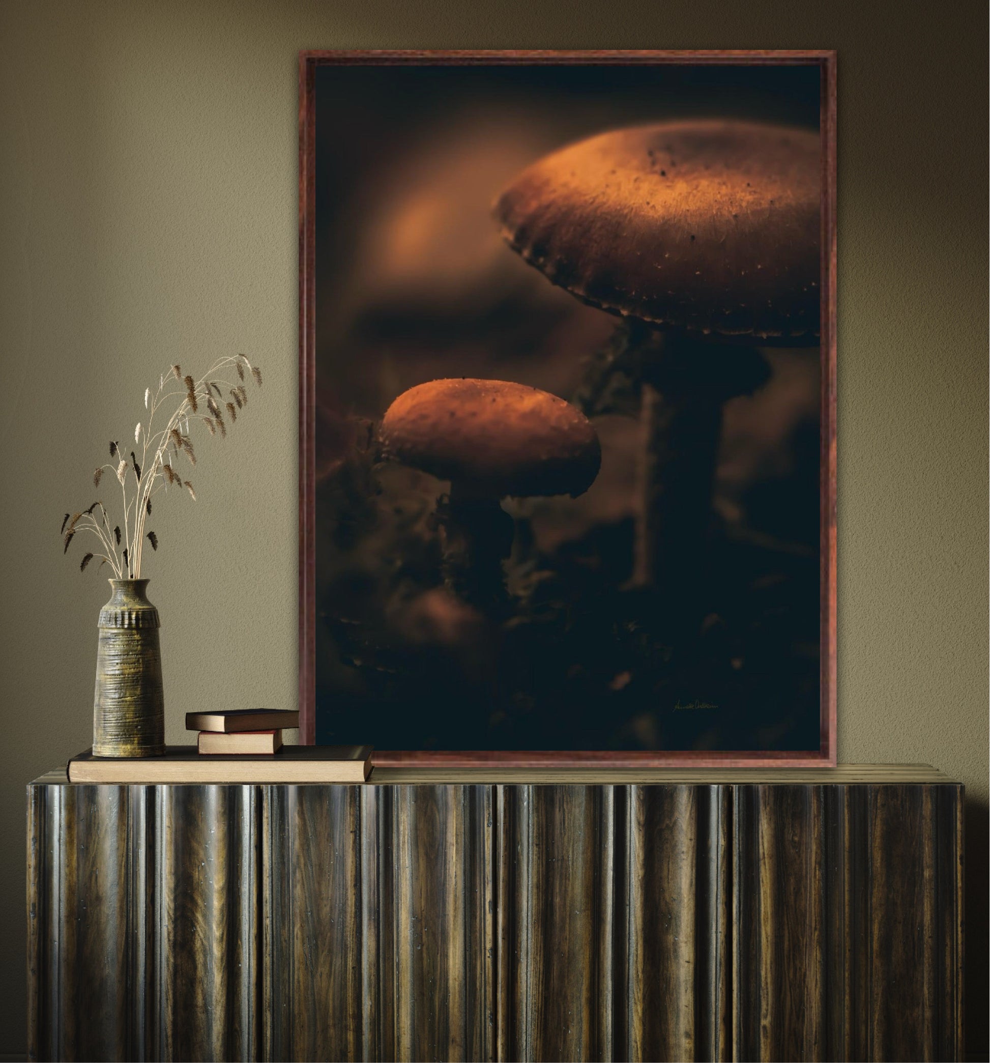 Beautiful photographic wall art of two mushrooms in moody tones, with beautiful details and dramatic light. One is watching over the other. This artwork will make you feel grounded and at peace.