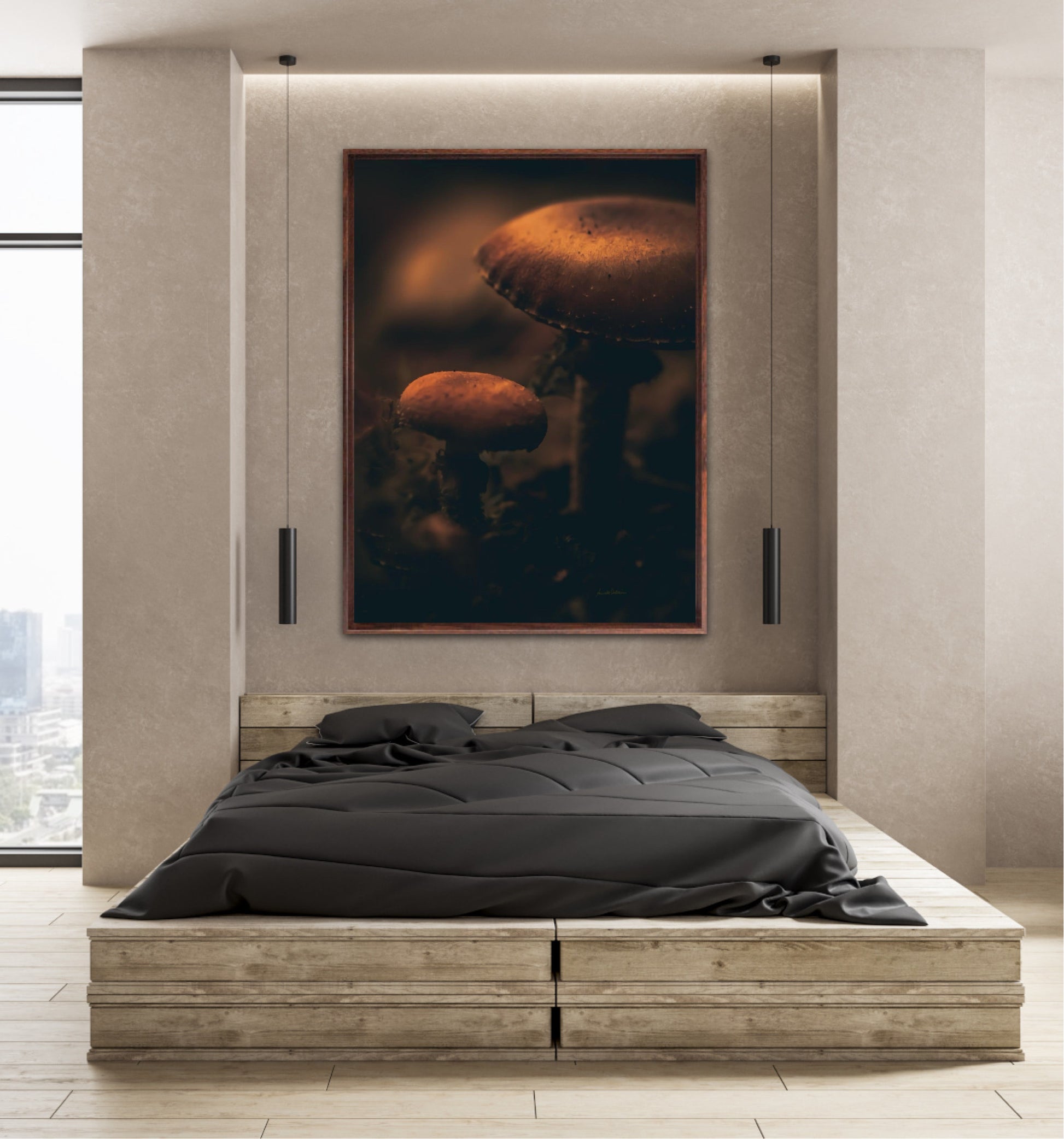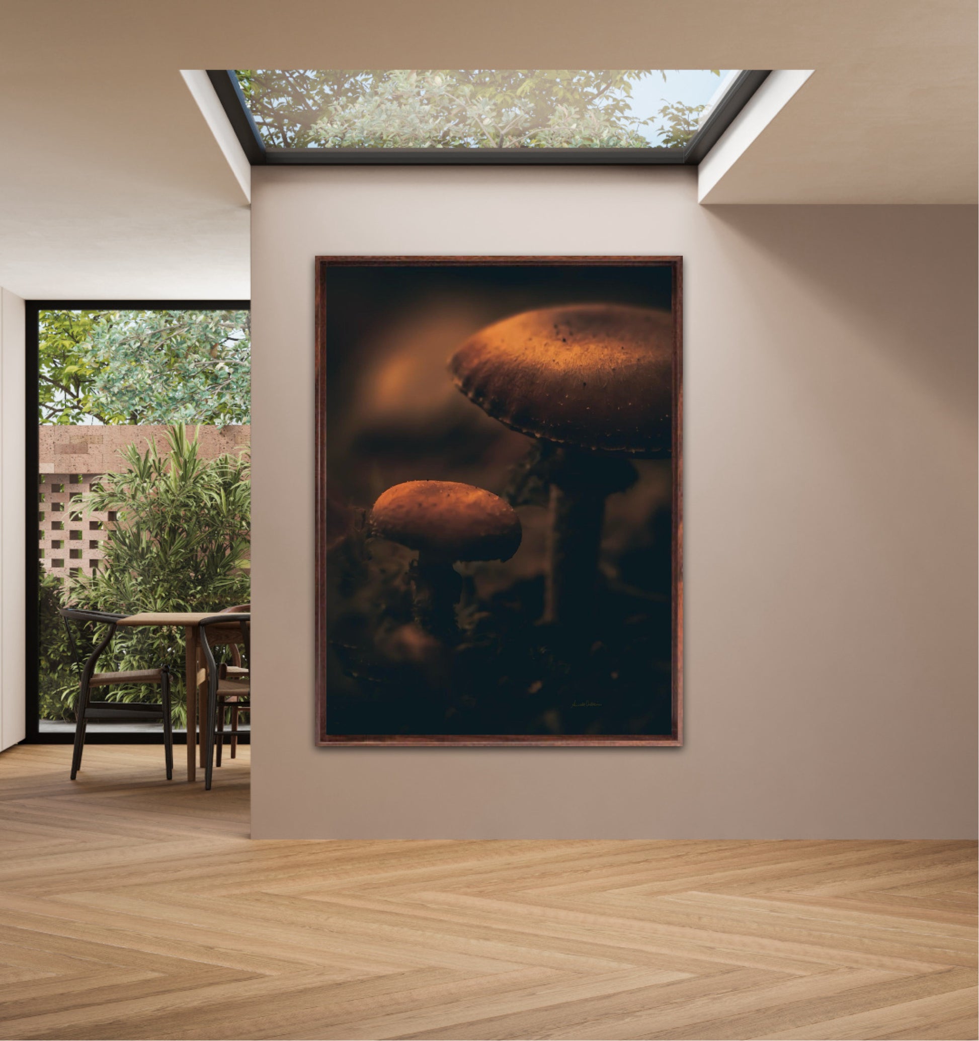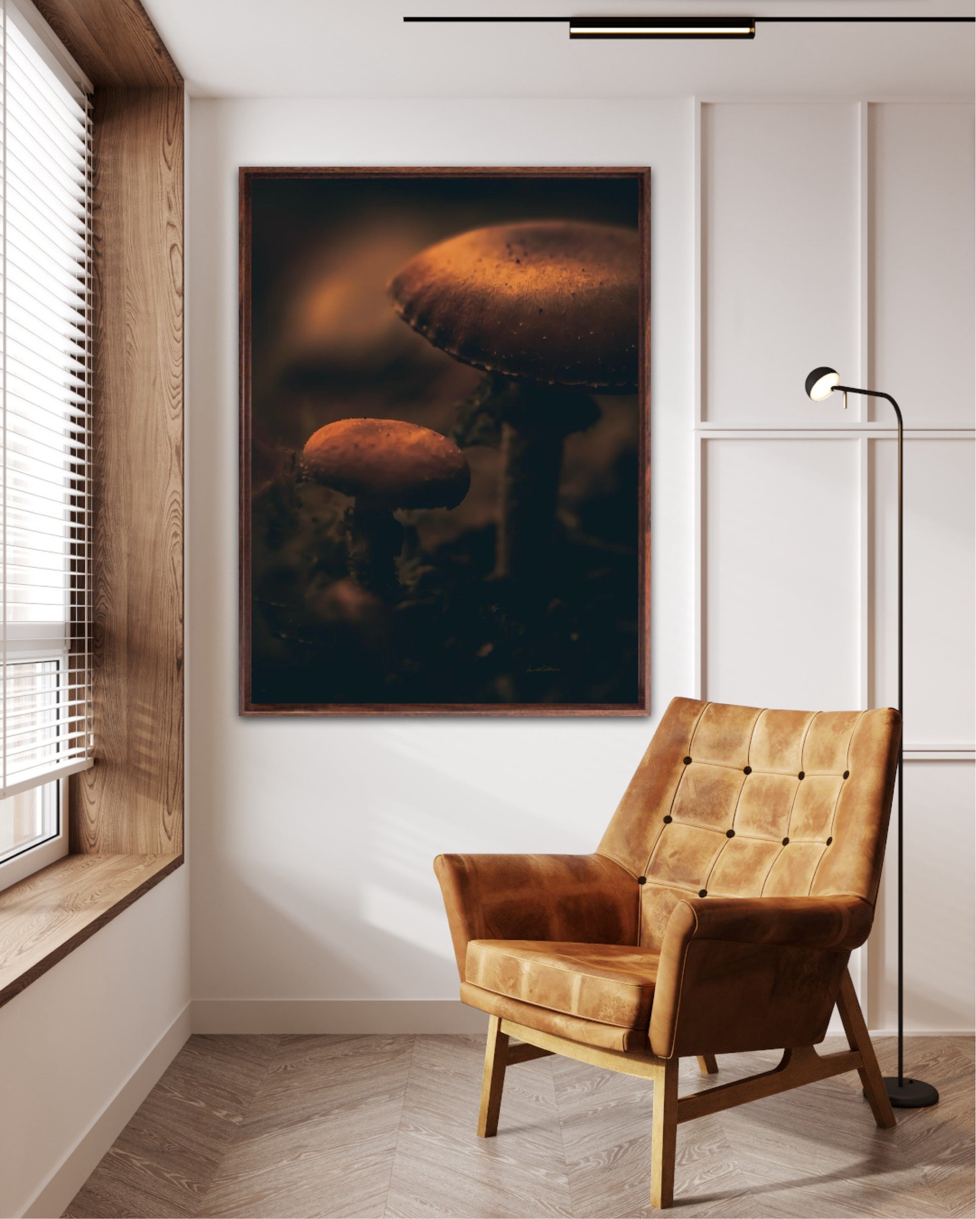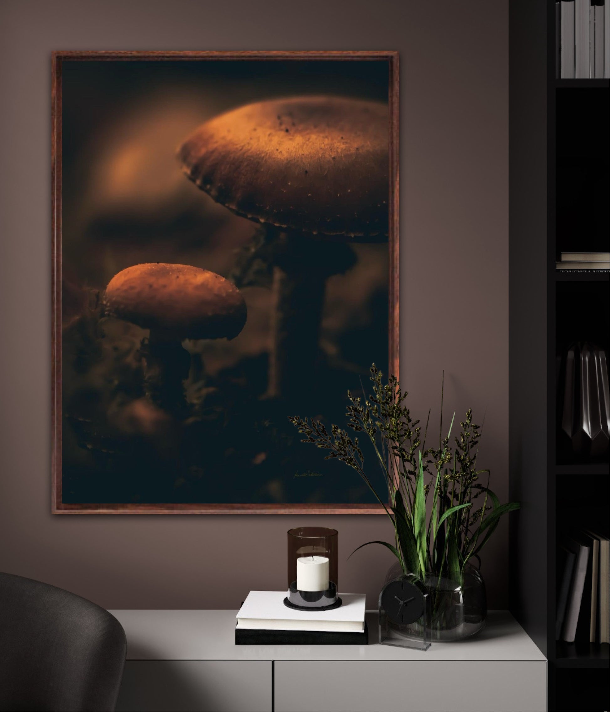 Beautiful photographic wall art of two mushrooms in moody tones, with beautiful details and dramatic light. One is watching over the other. This artwork will make you feel grounded and at peace.