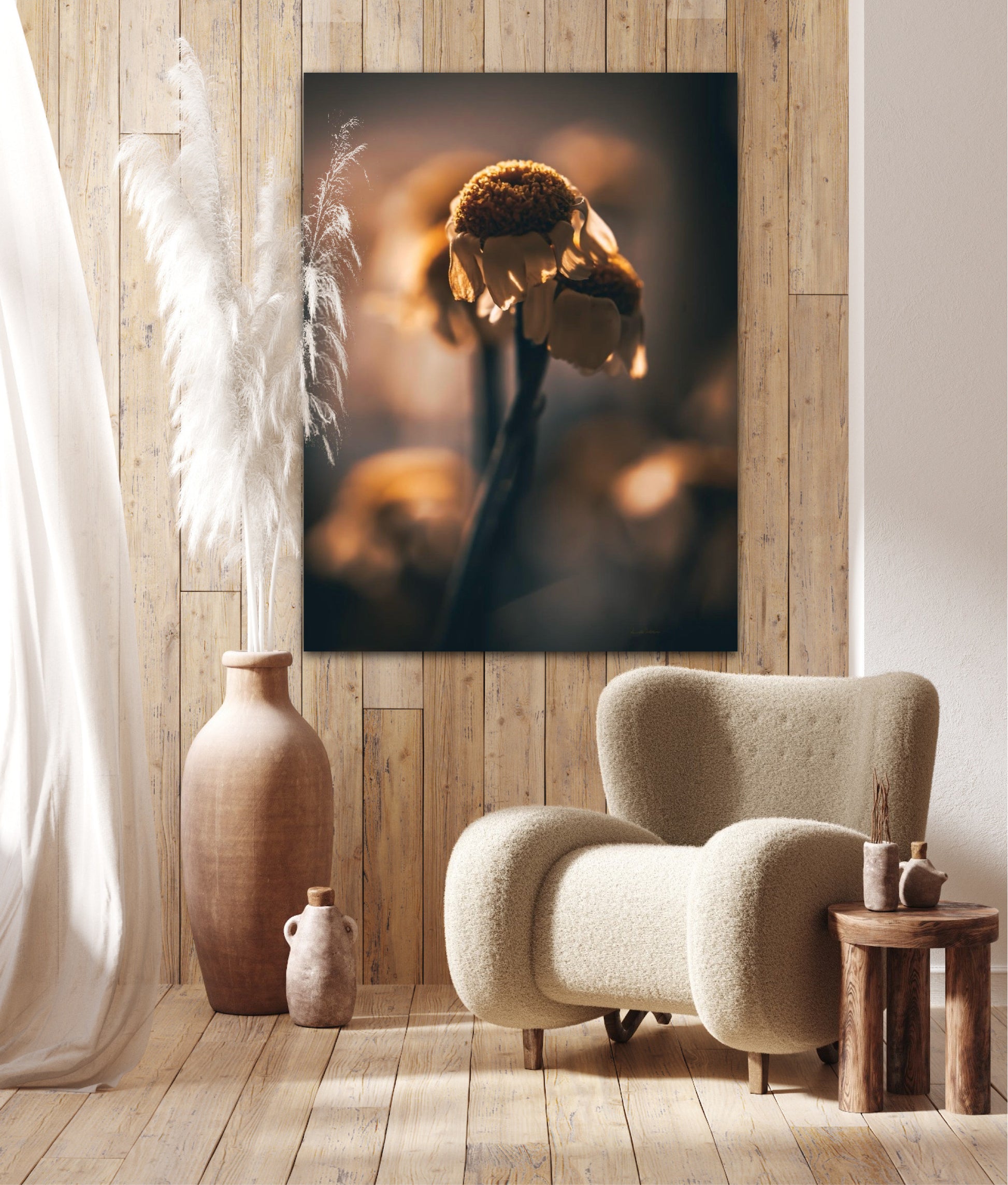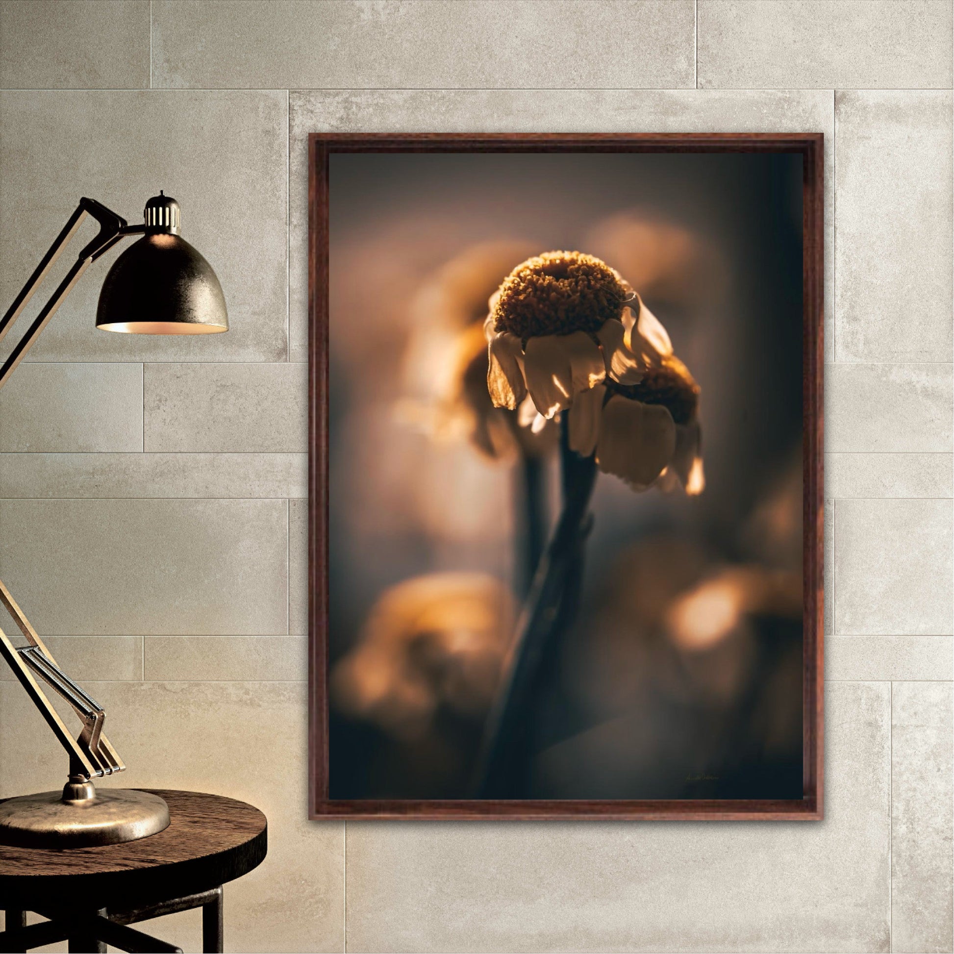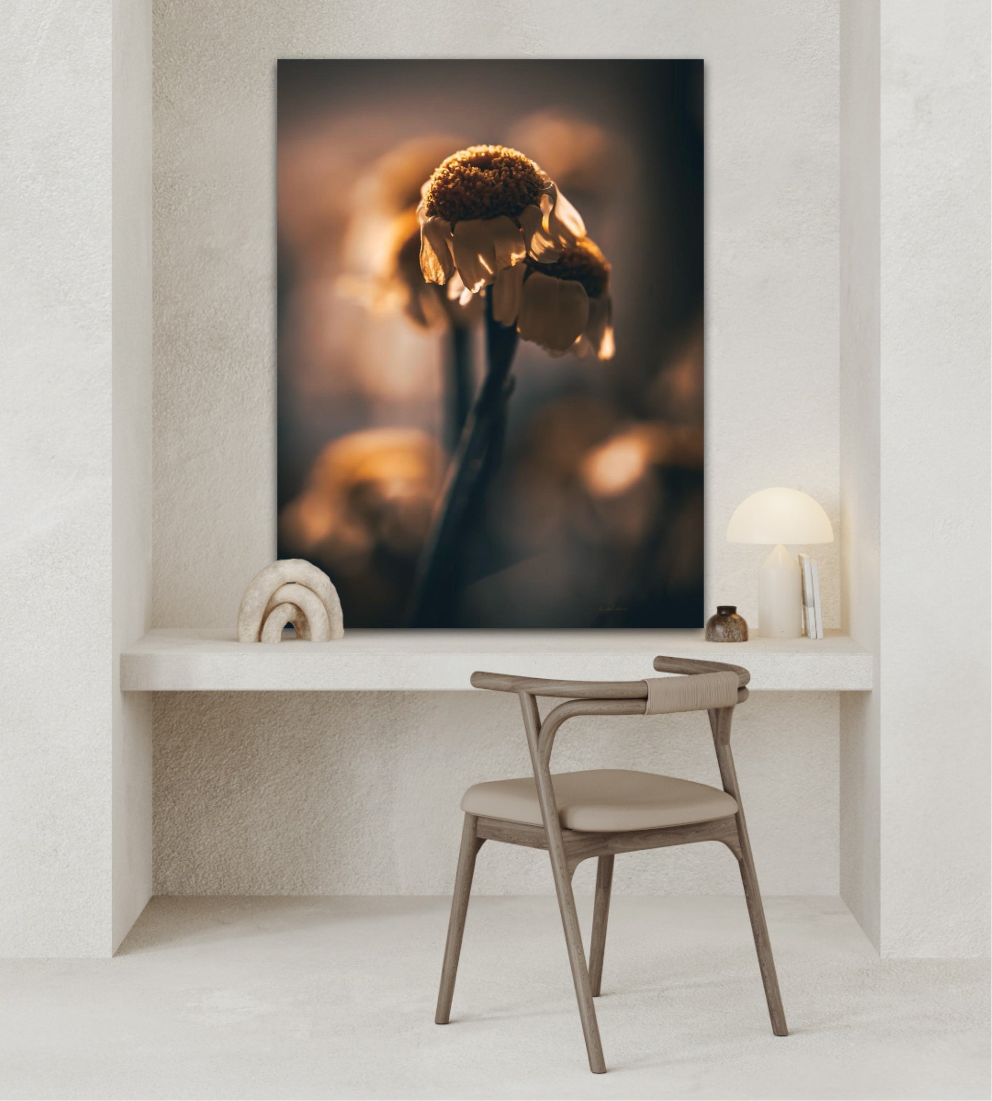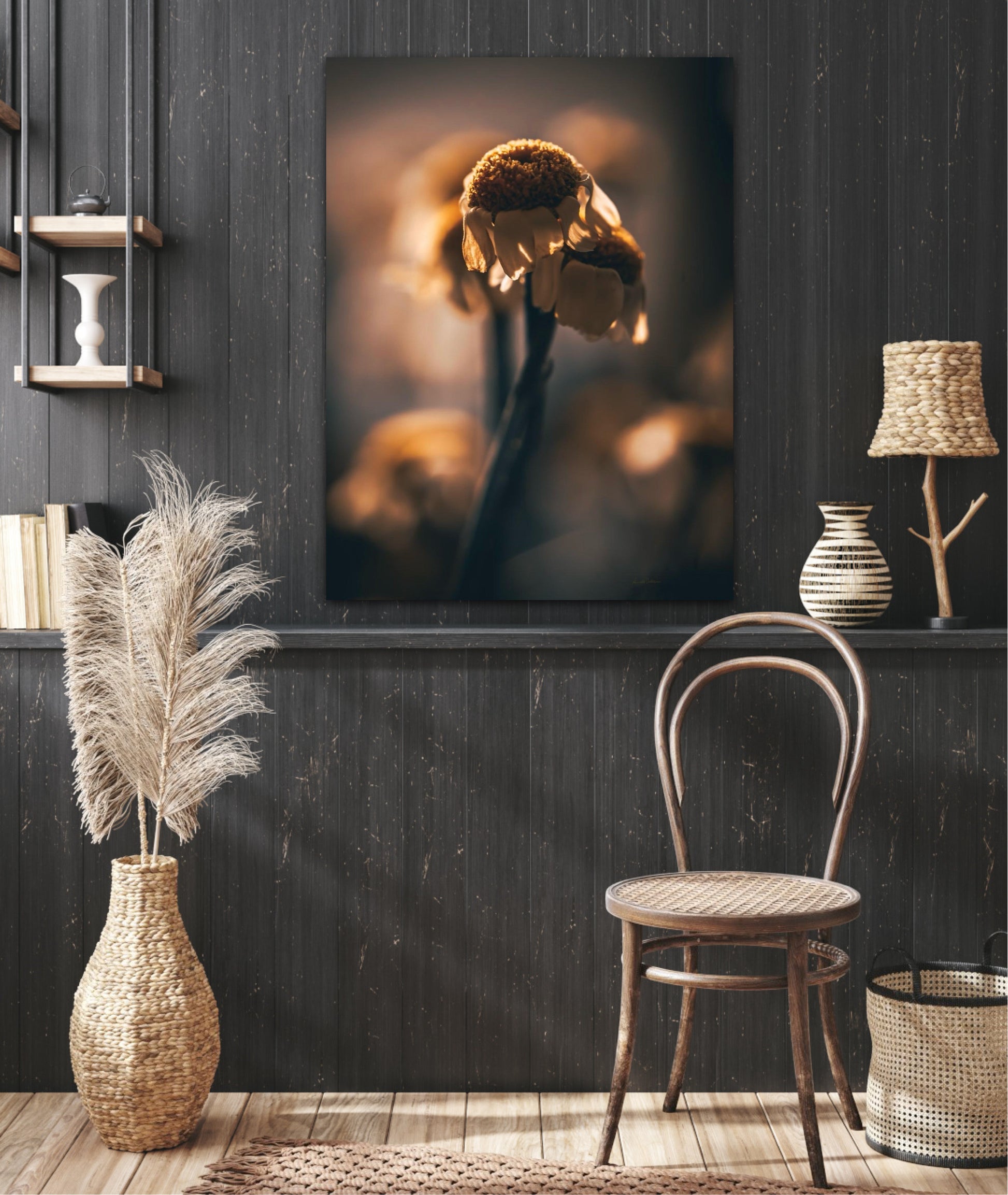 Beautiful photographic wall art of a gorgeous sundried flower on a golden background. This art piece will warm your heart.