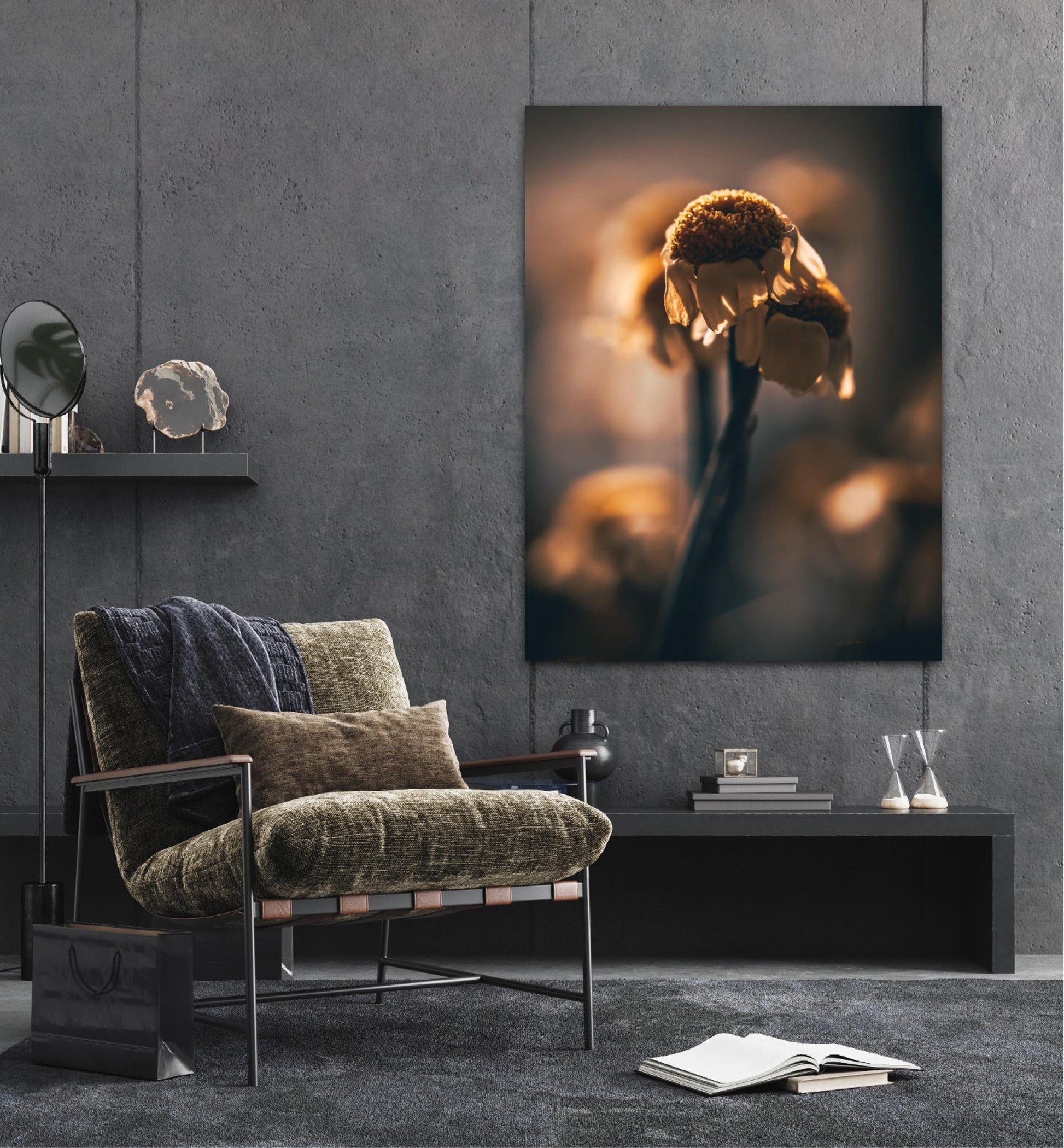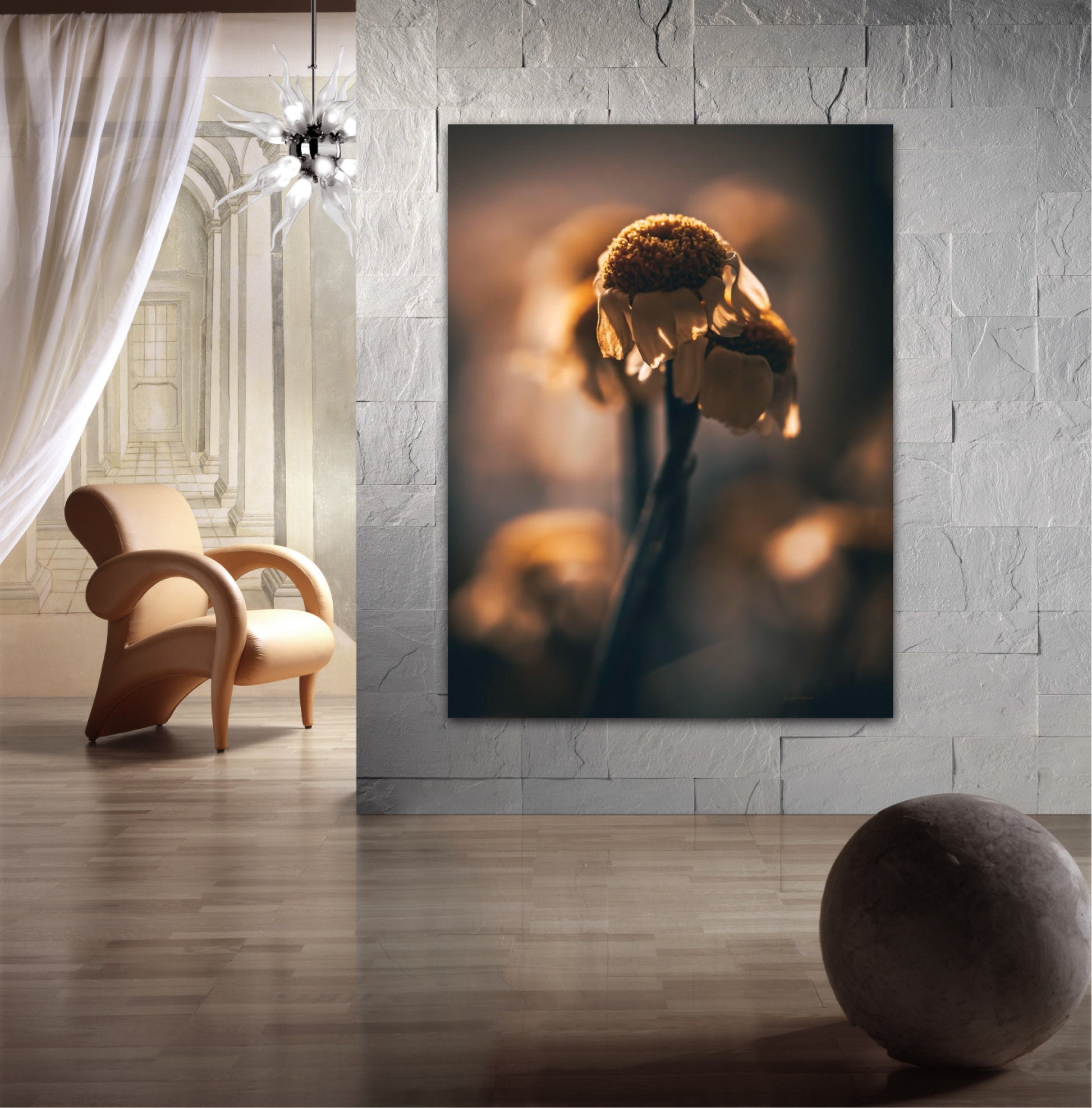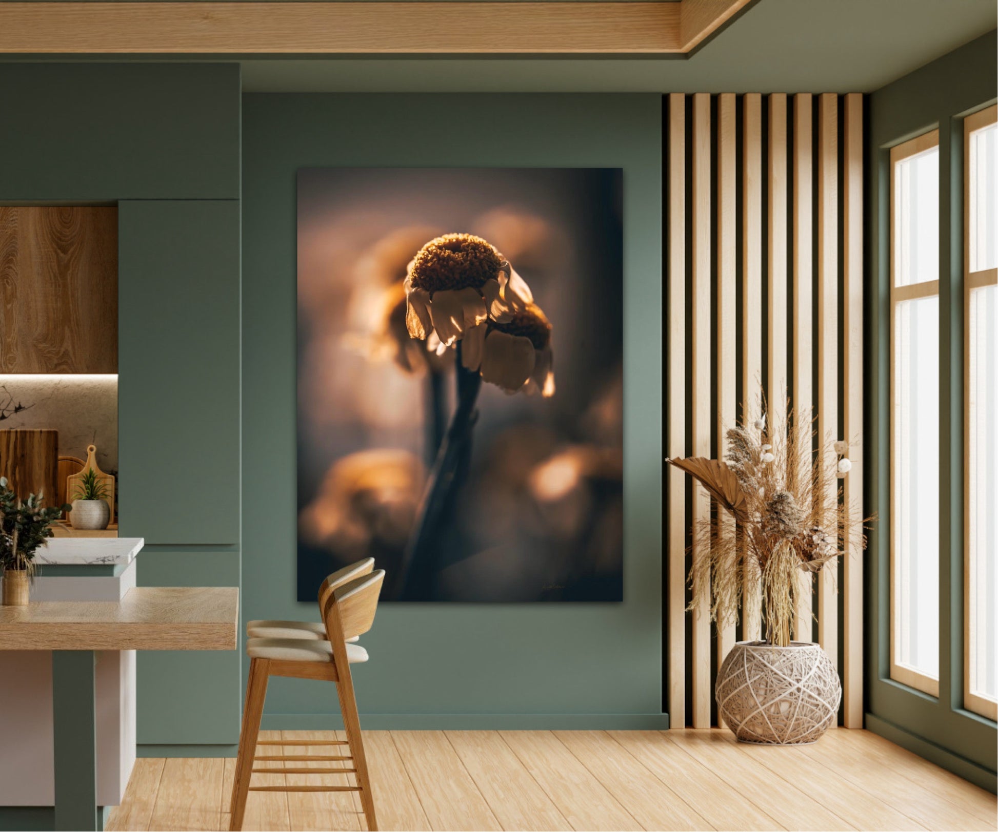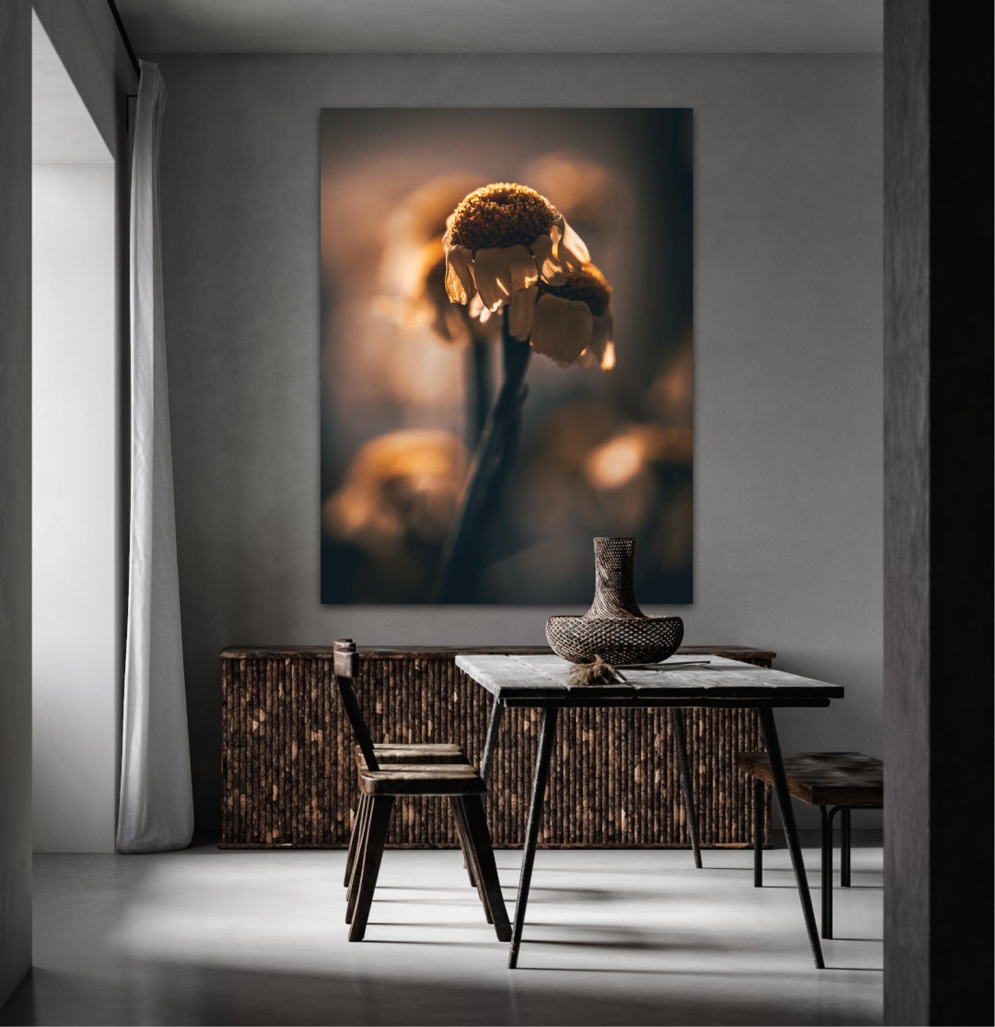 Beautiful photographic wall art of a gorgeous sundried flower on a golden background. This art piece will warm your heart.
