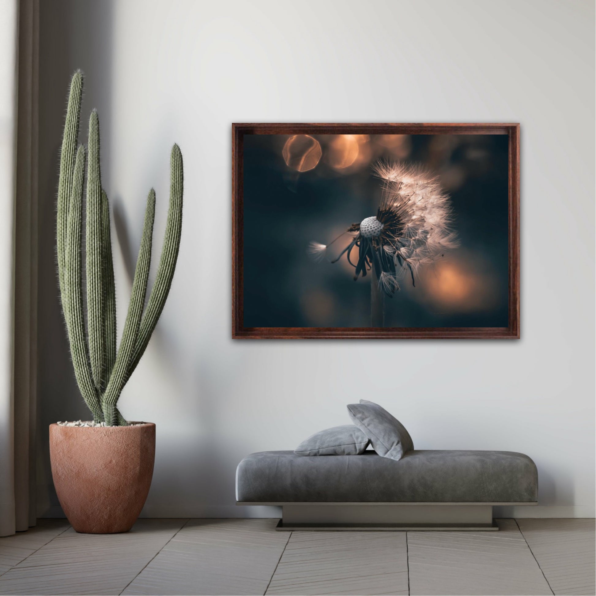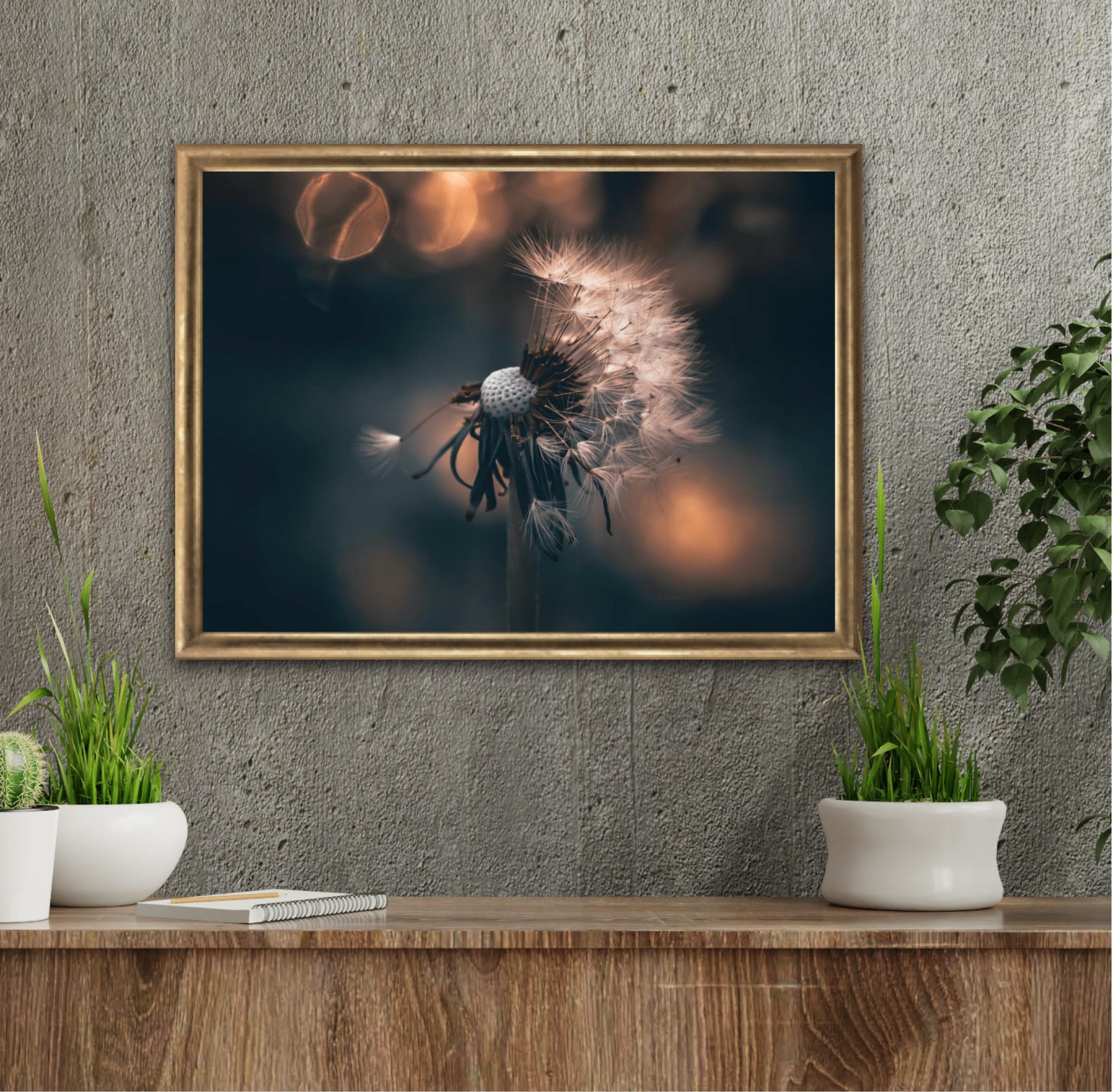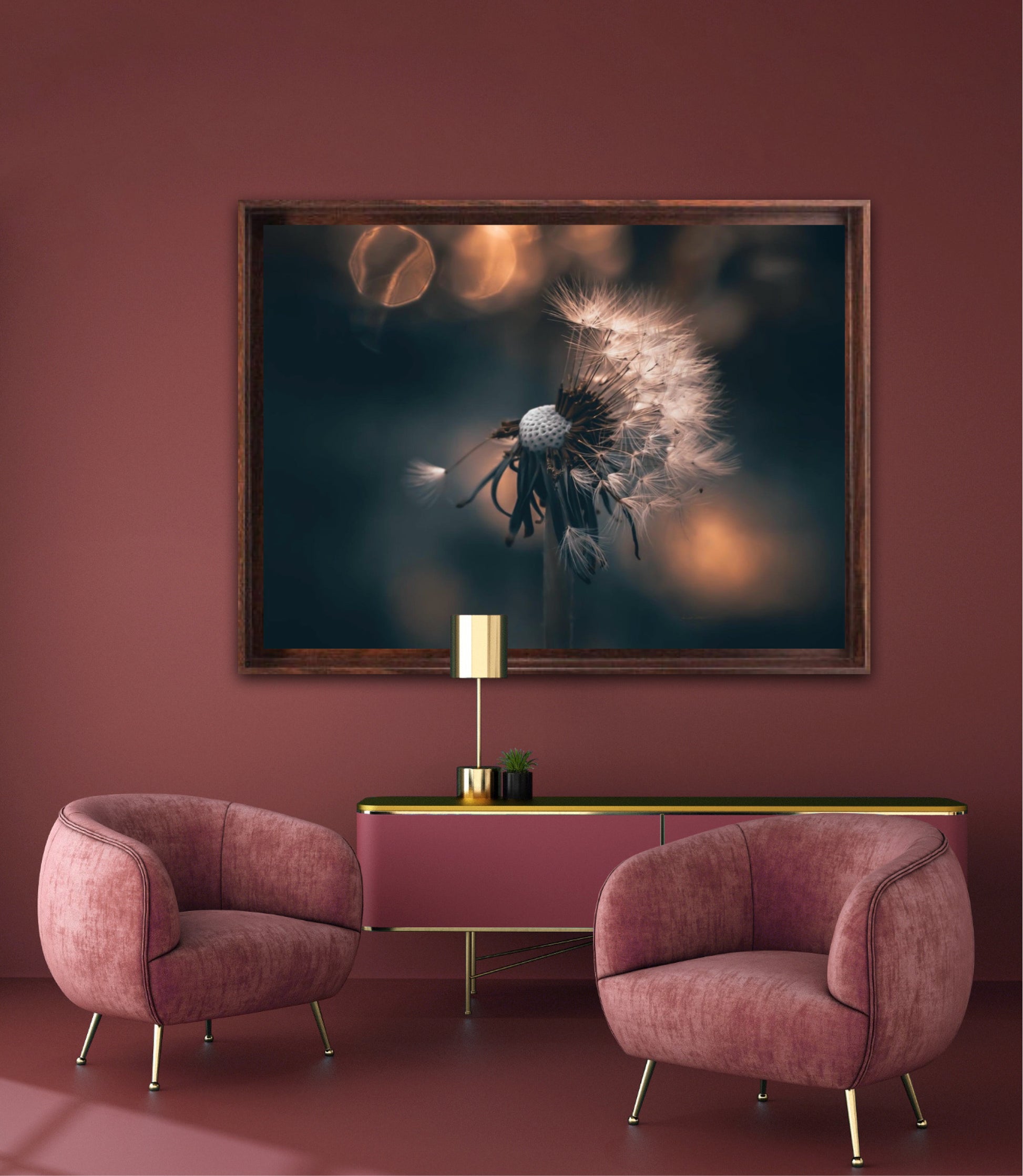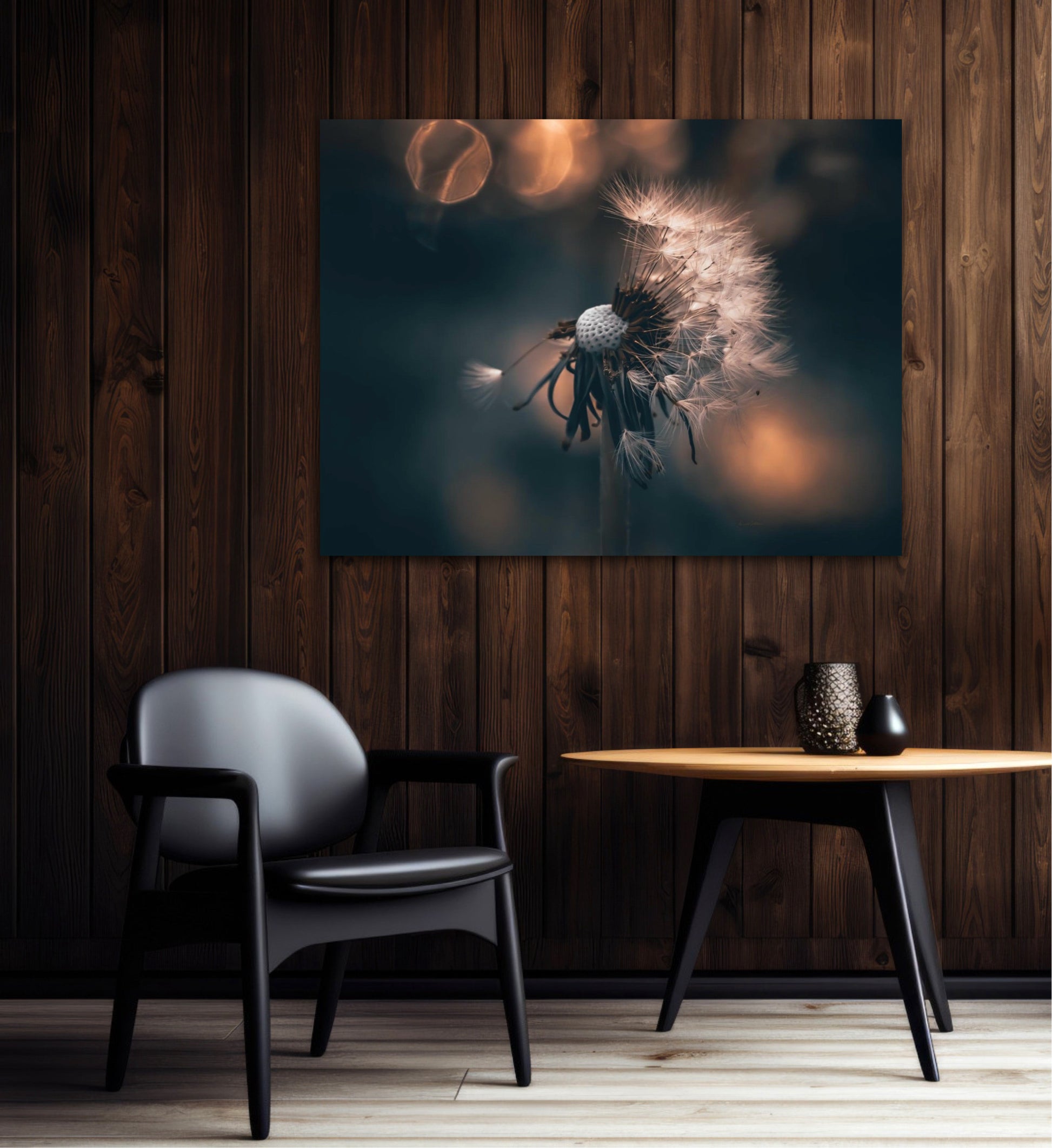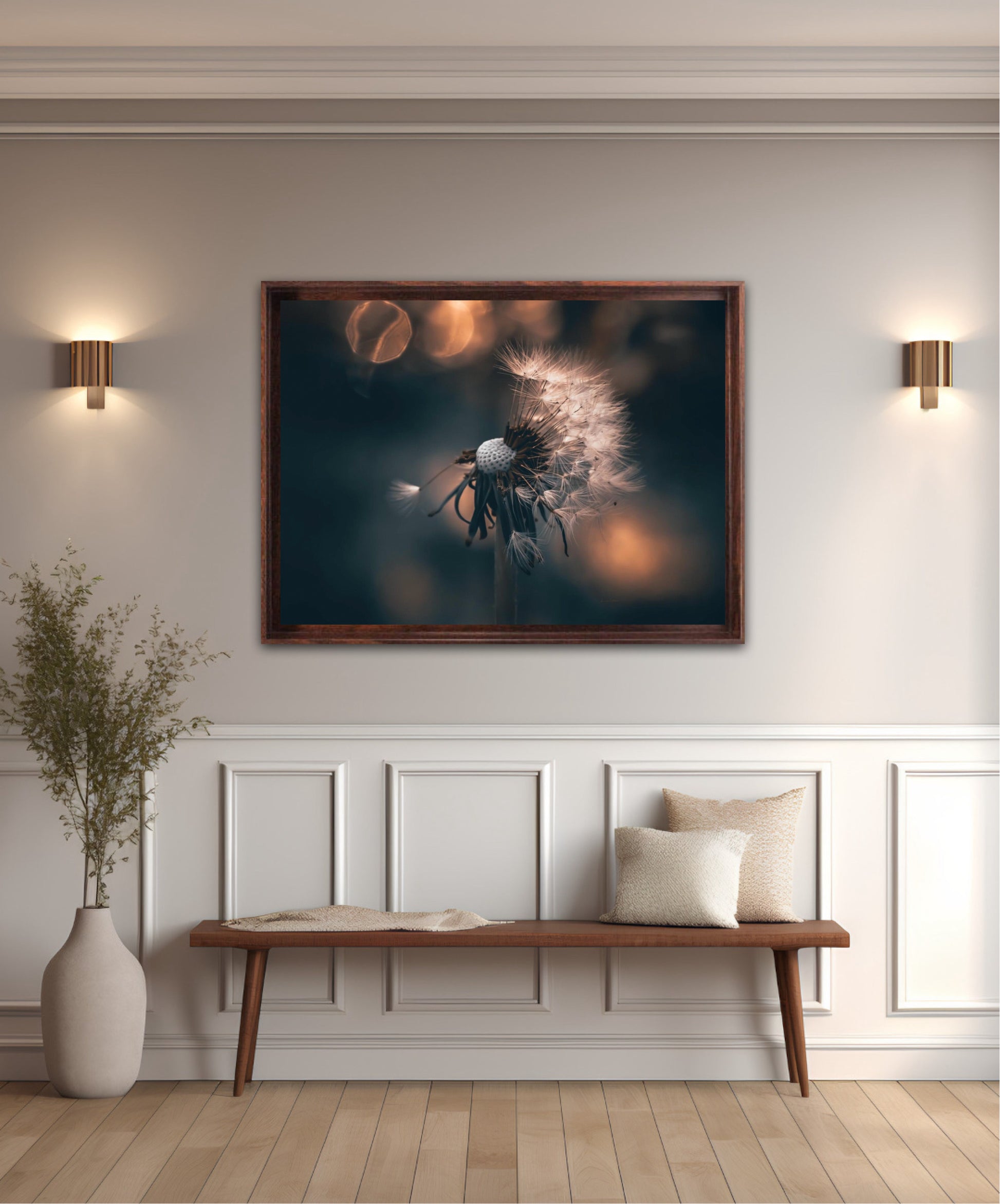Beautiful photographic wall art of a dandelion in a beautiful golden light. This artwork becomes an eye-catcher on the wall and brings nature into your home. Find the calm and magic of nature with this fine artwork.