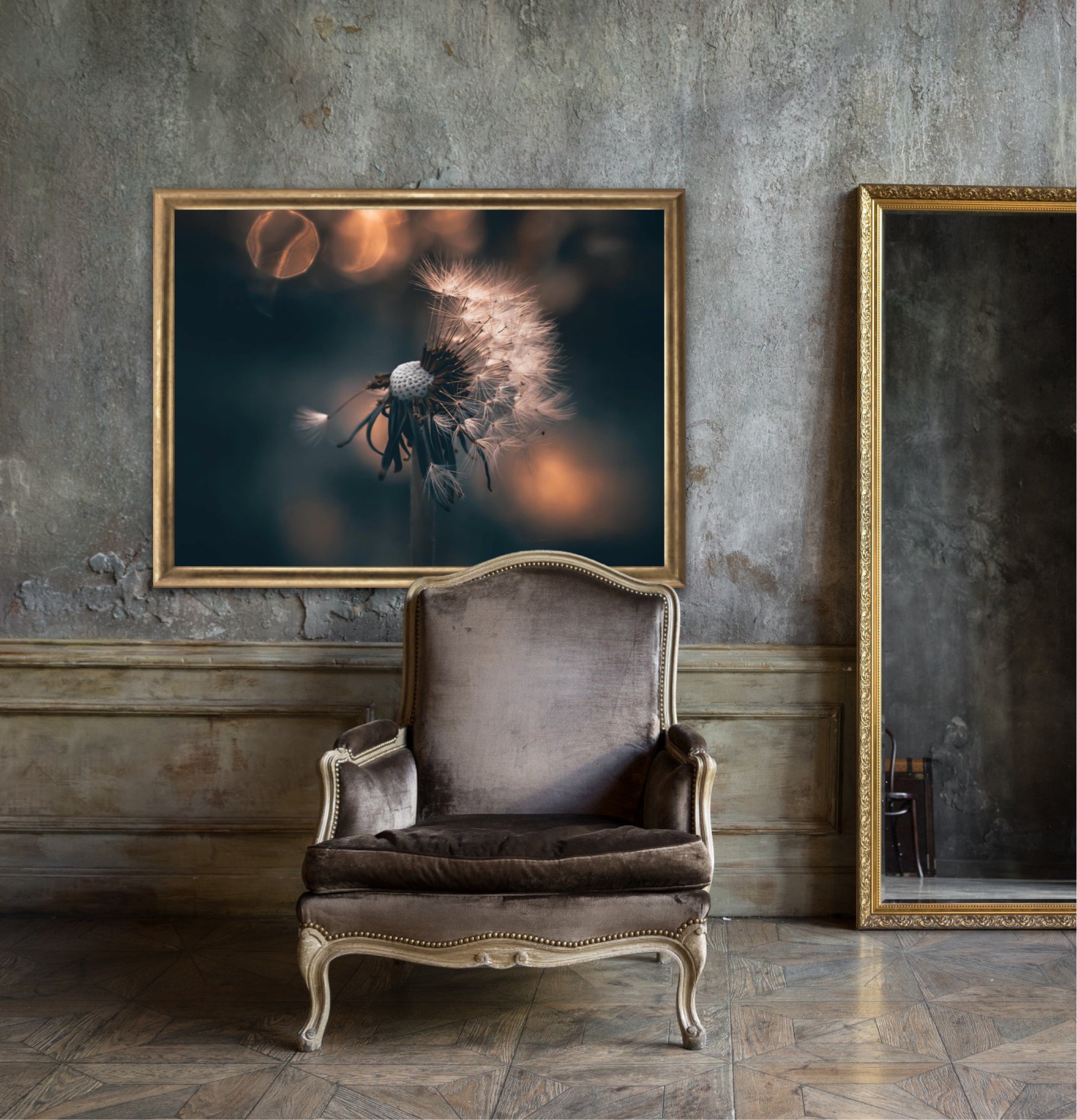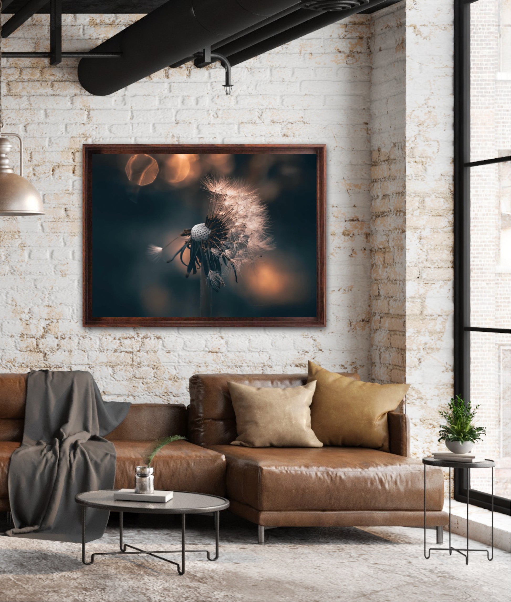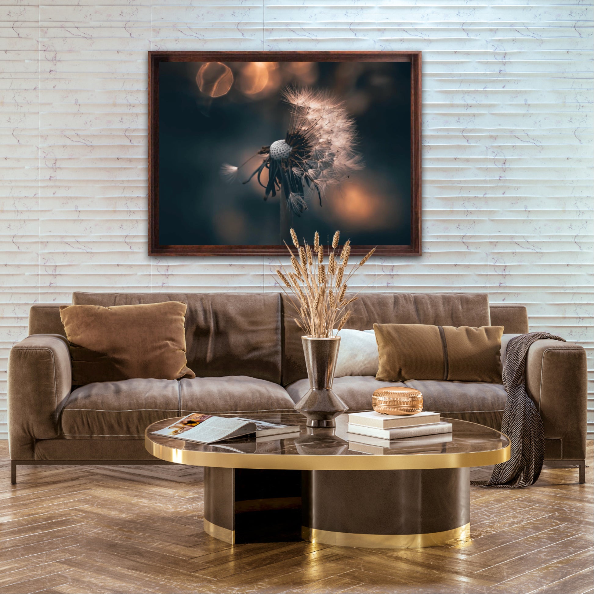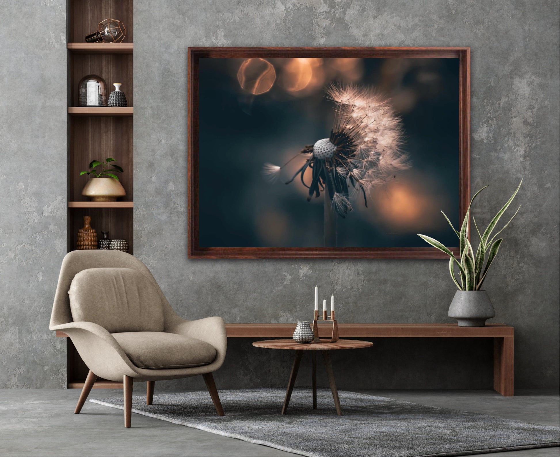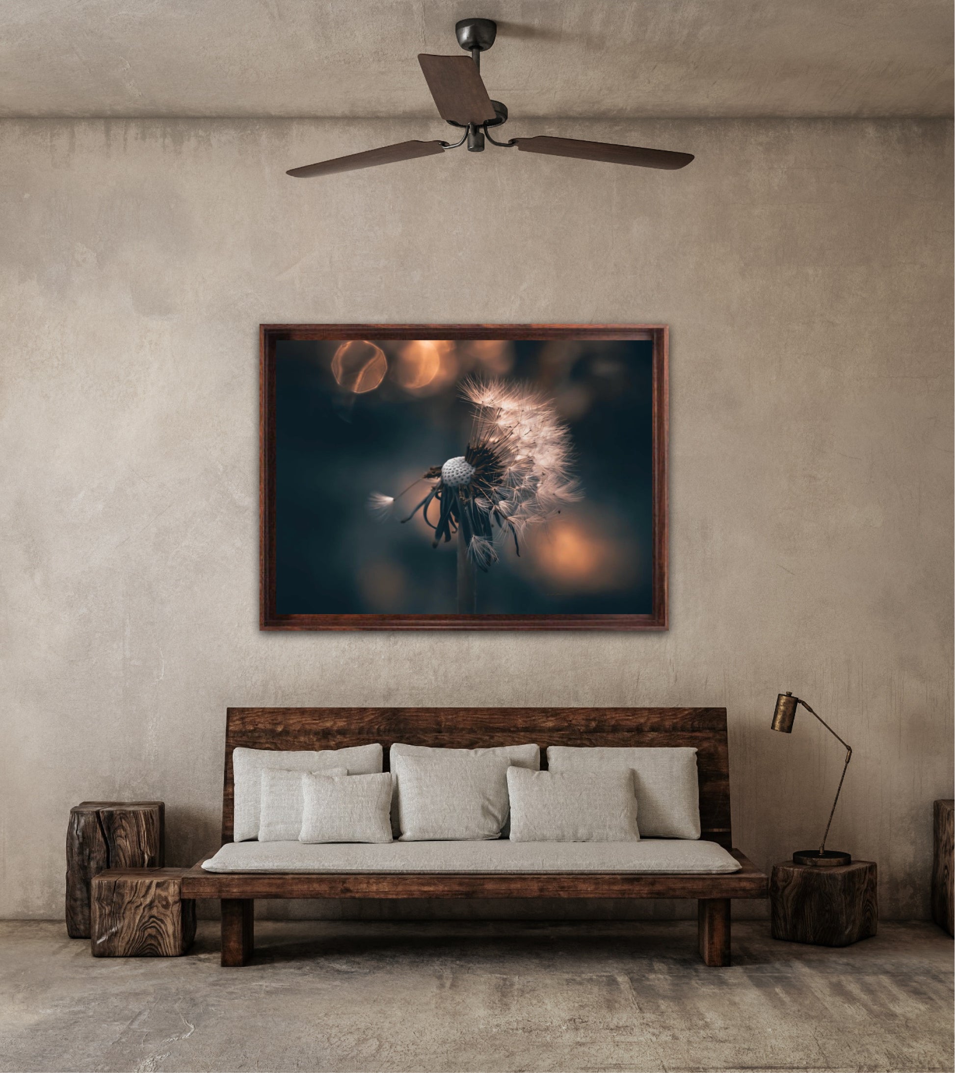 Beautiful photographic wall art of a dandelion in a beautiful golden light. This artwork becomes an eye-catcher on the wall and brings nature into your home. Find the calm and magic of nature with this fine artwork.