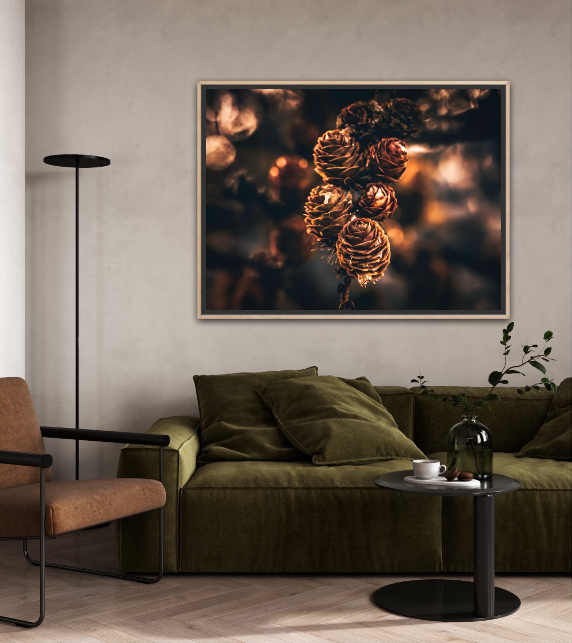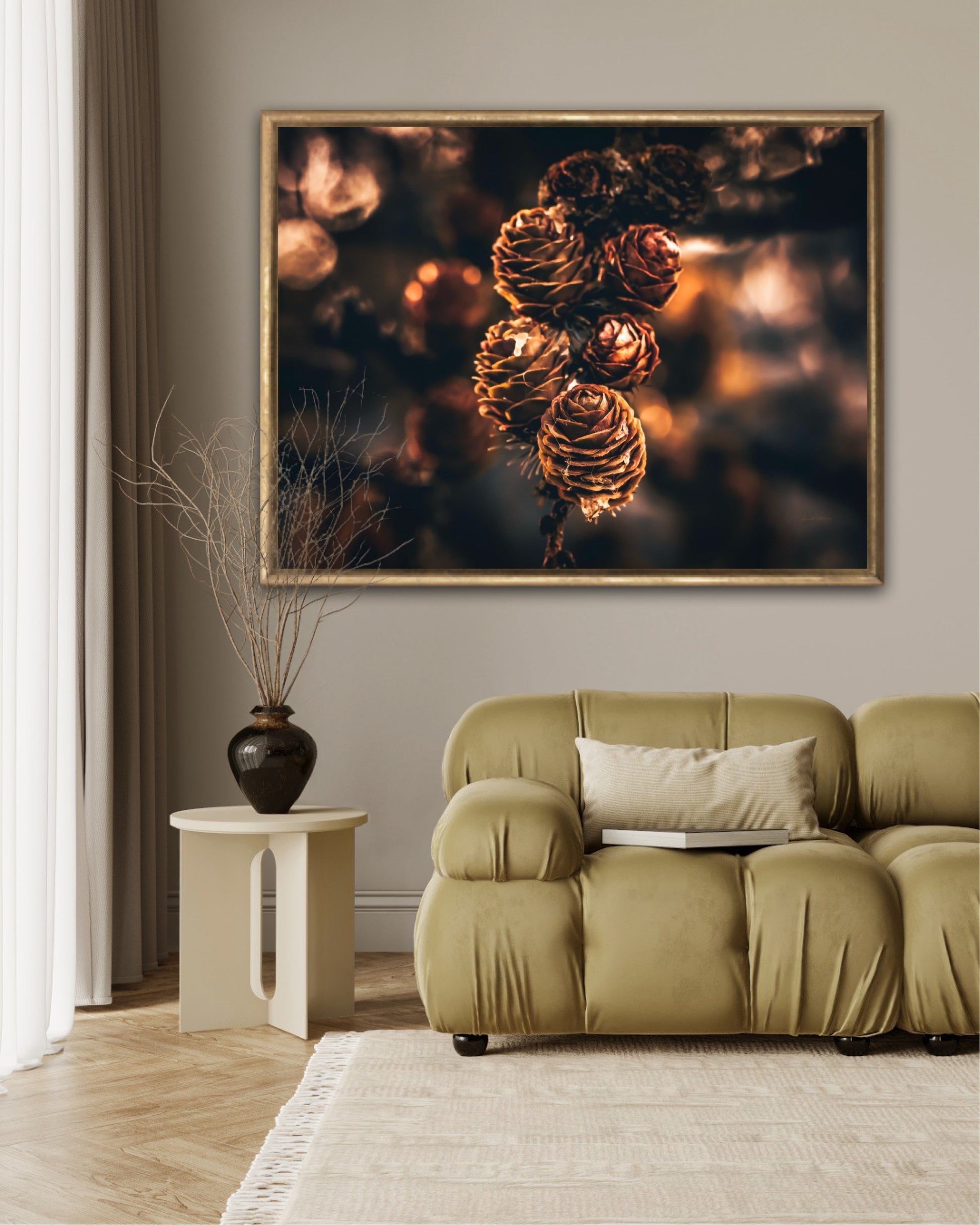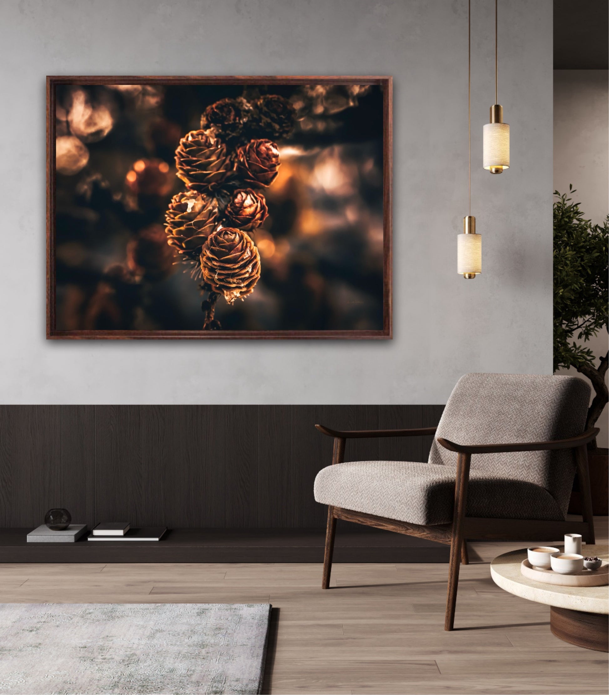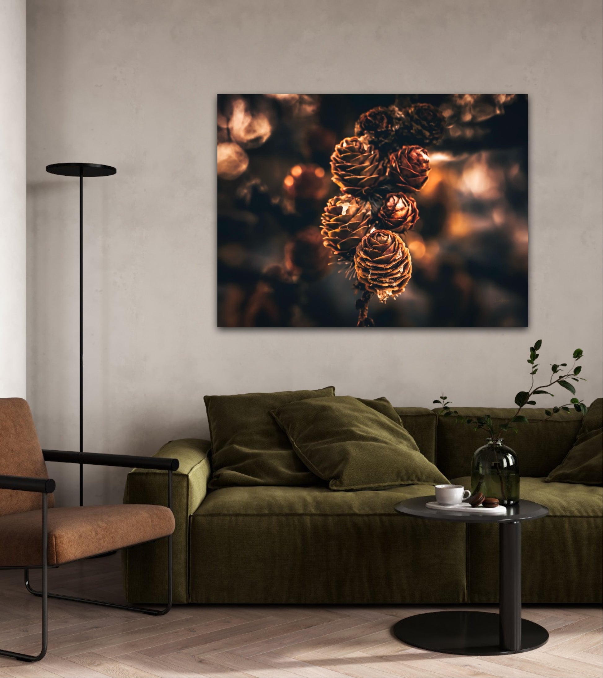 Beautiful photographic wall art of pinecones in warm, golden tones. This wall art gives your home a real warm and cosy atmosphere.