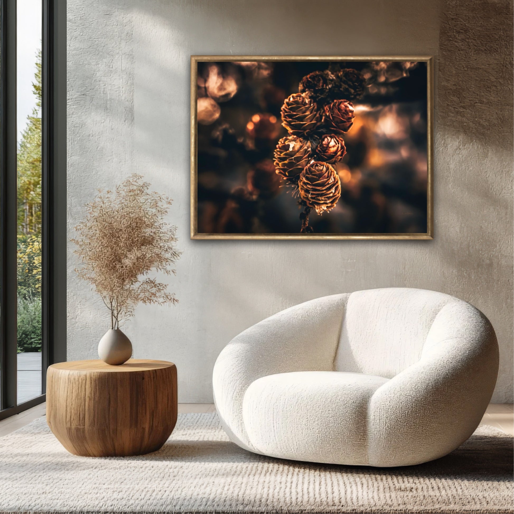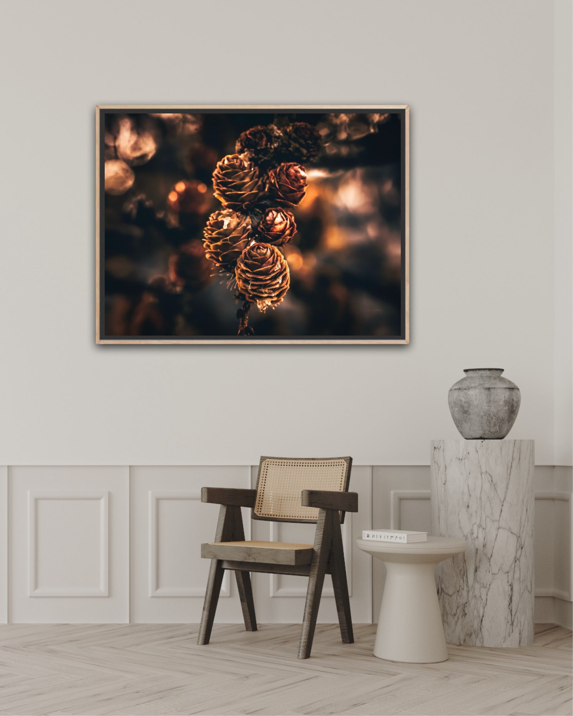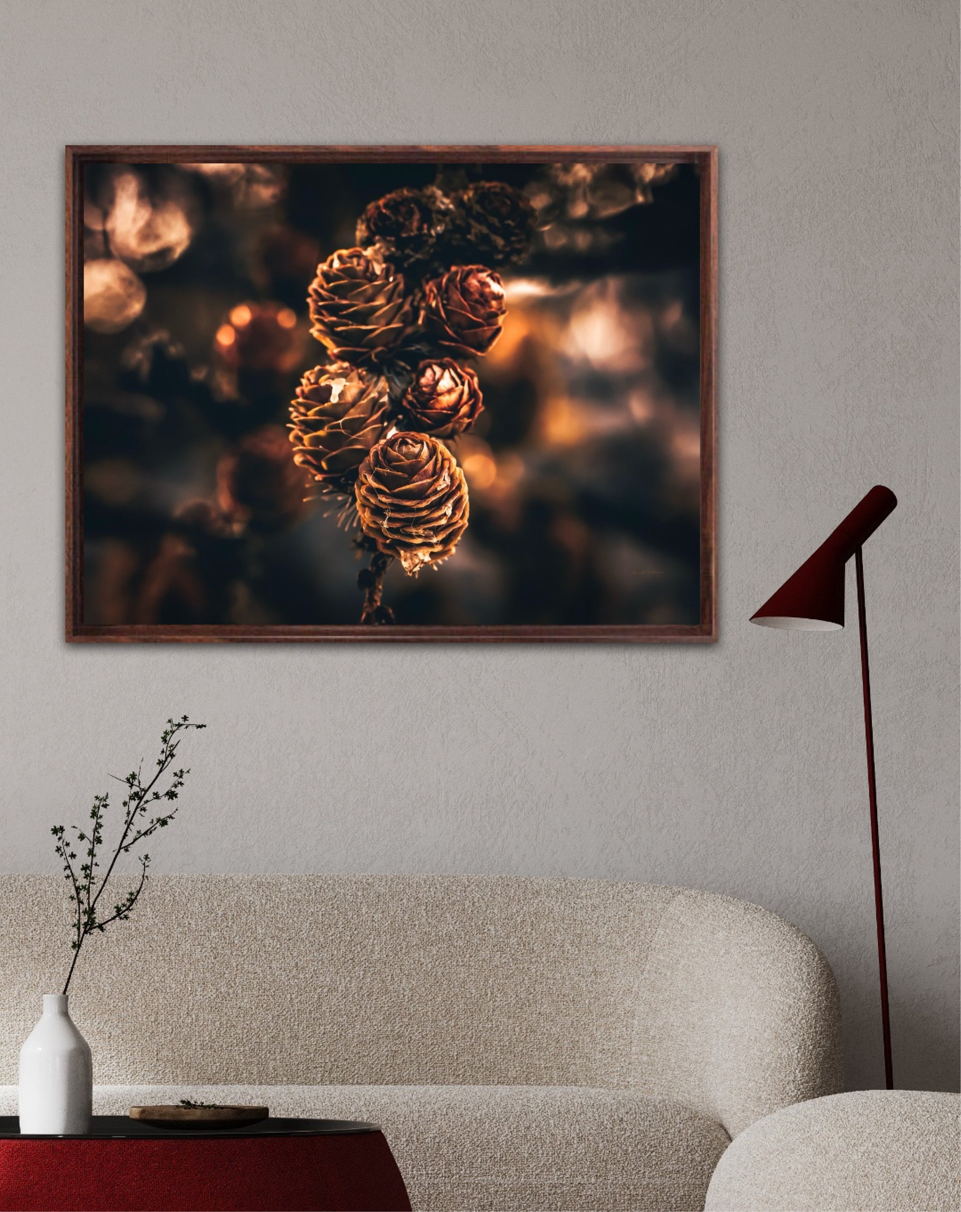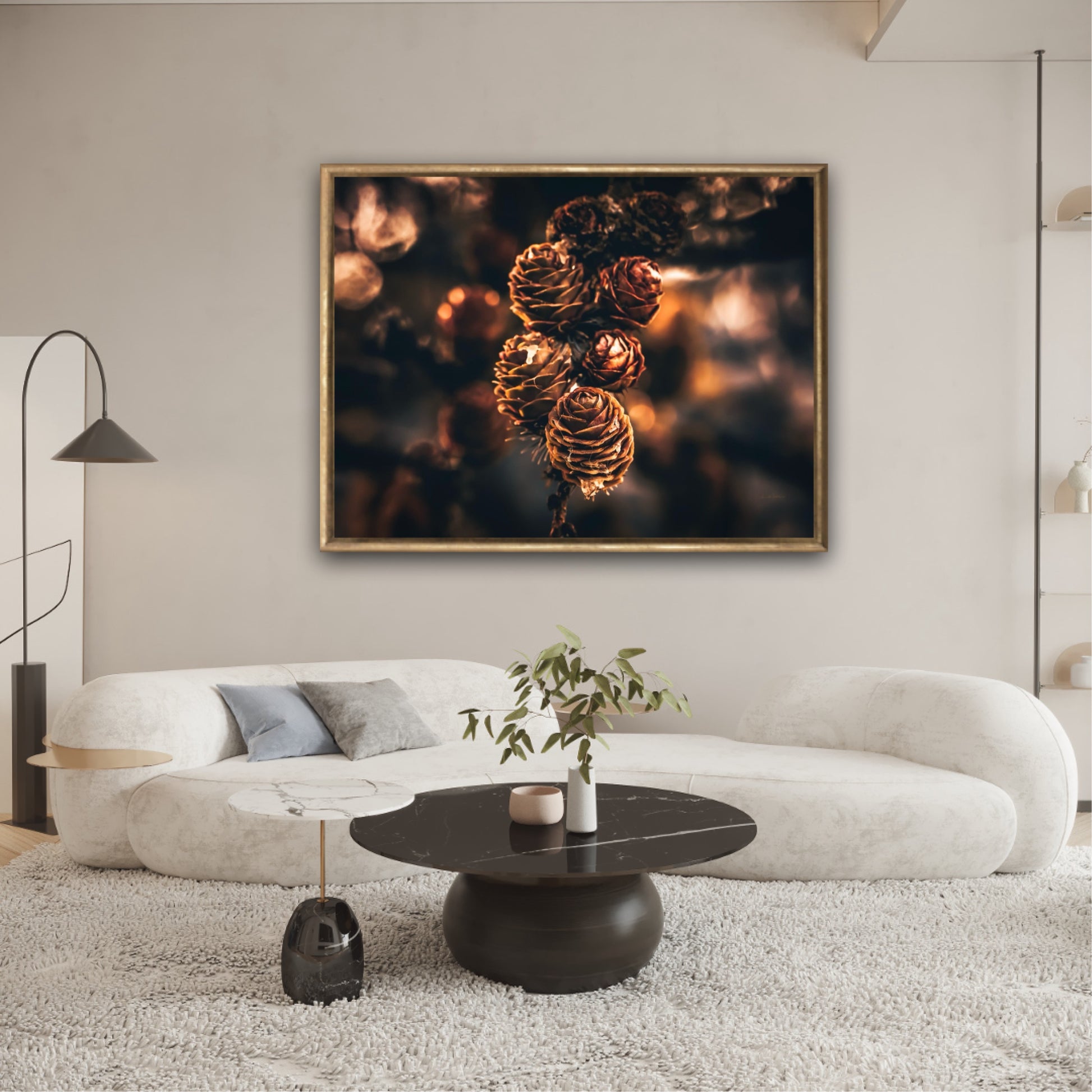 Beautiful photographic wall art of pinecones in warm, golden tones. This wall art gives your home a real warm and cosy atmosphere.
