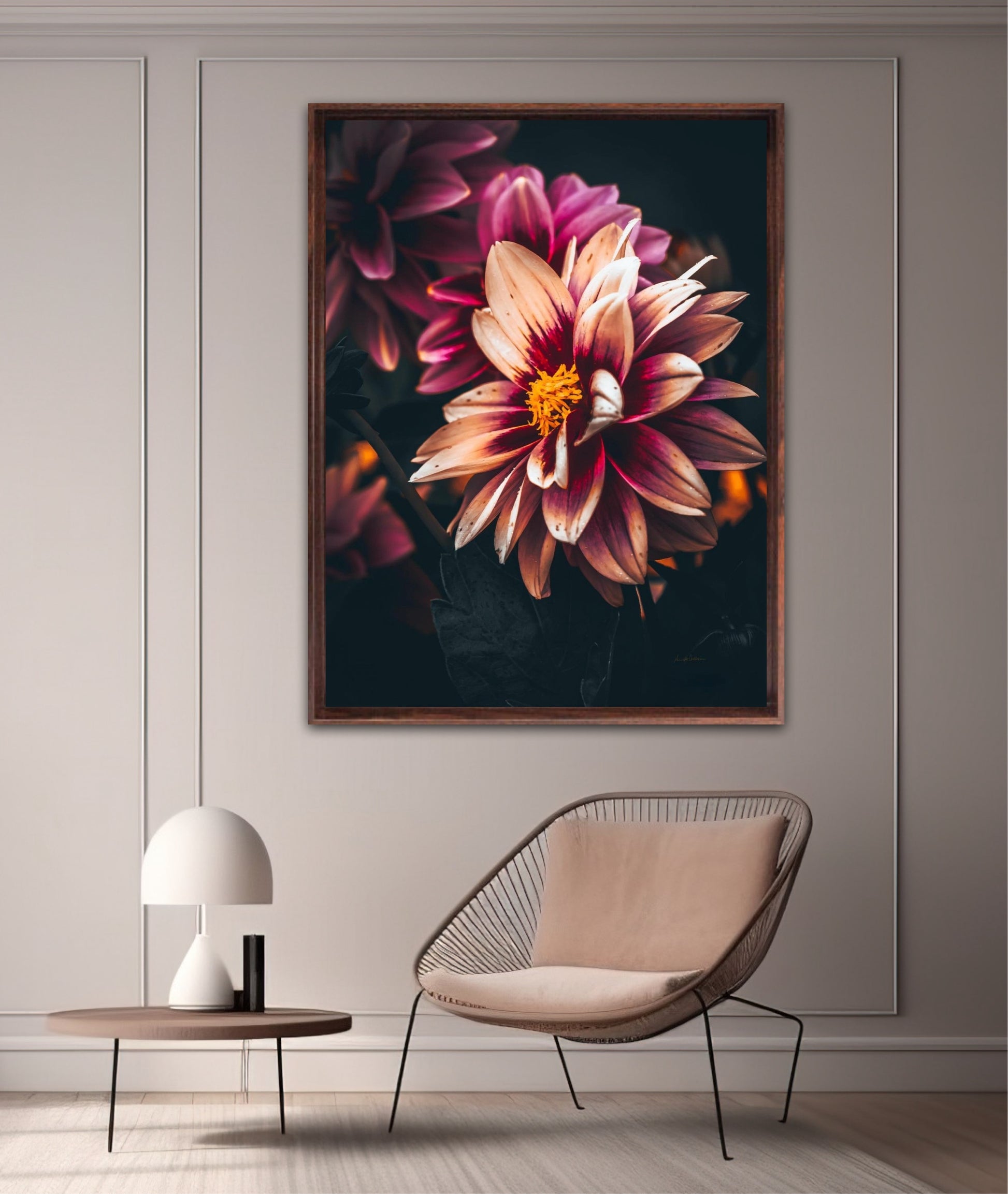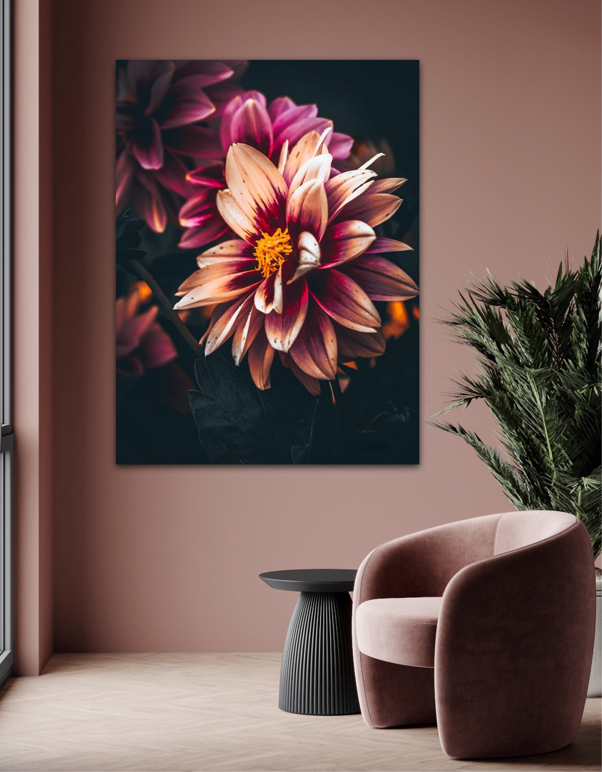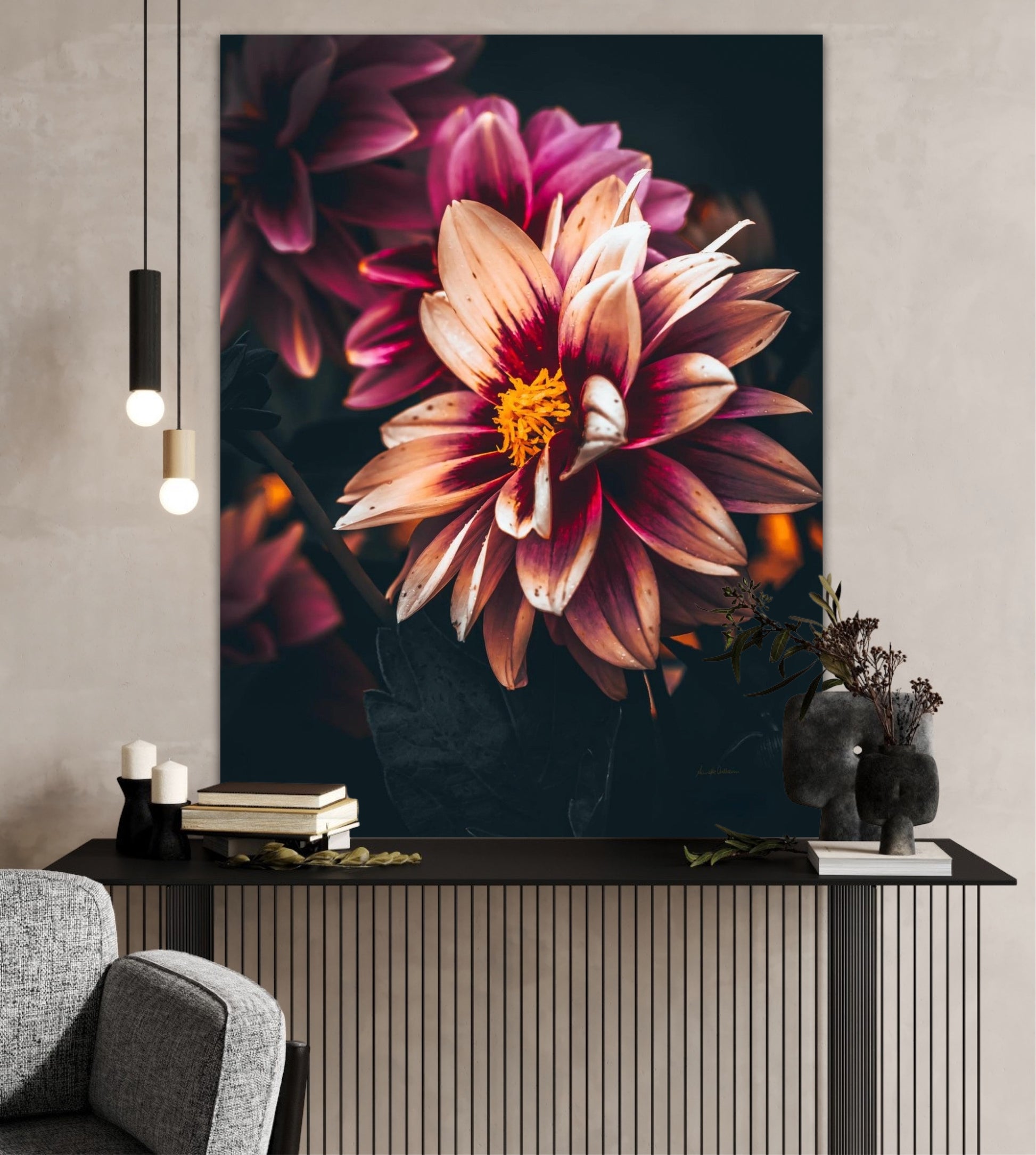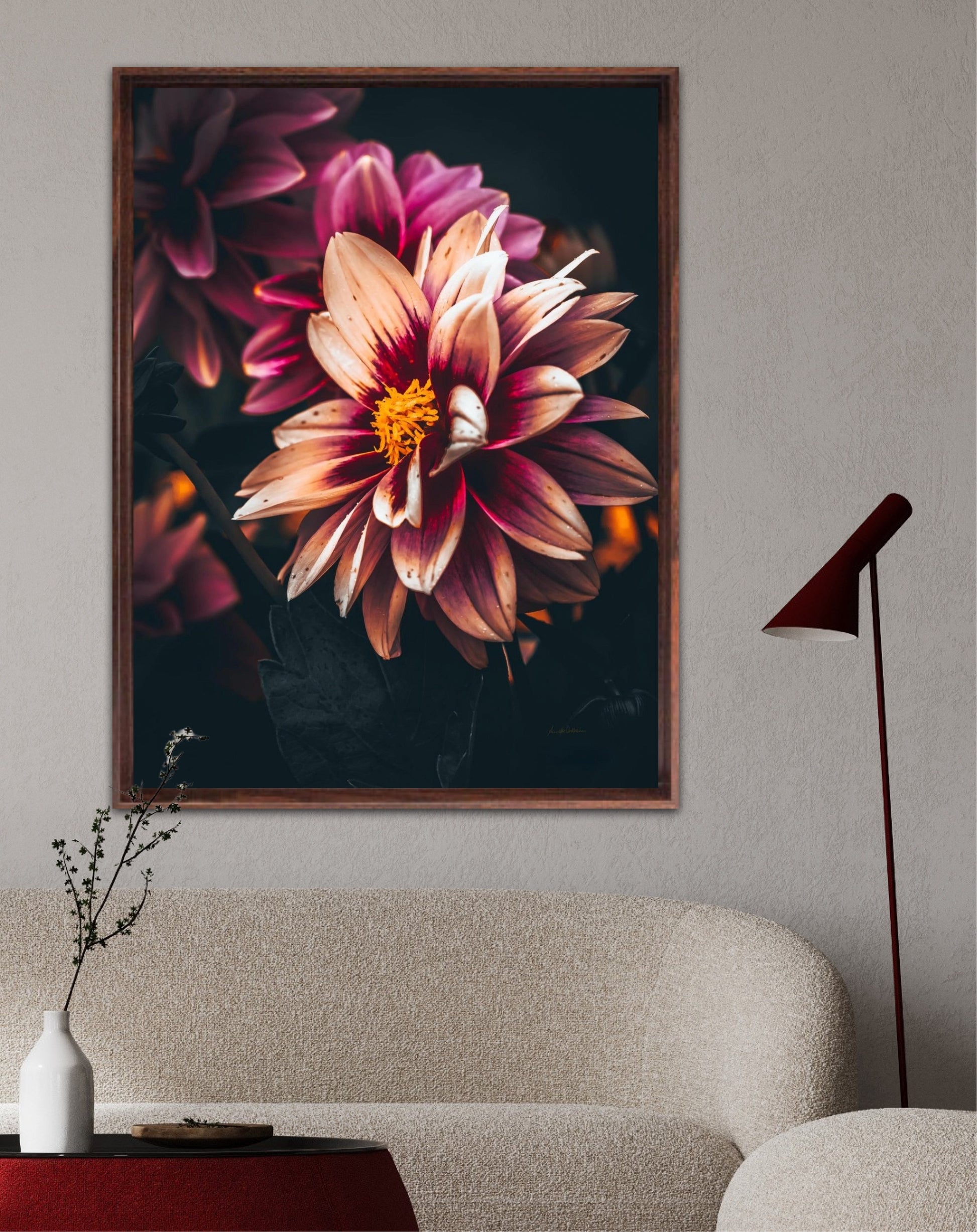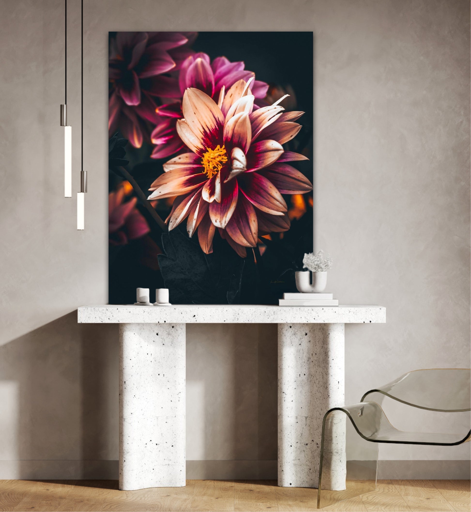 Striking photographic wall art of a white and pink Dahlia flower close up in stunning red, pink, white and orange tones, on a dark background. This artwork will be a stand-out piece in your home and bring you peace and tranquility.