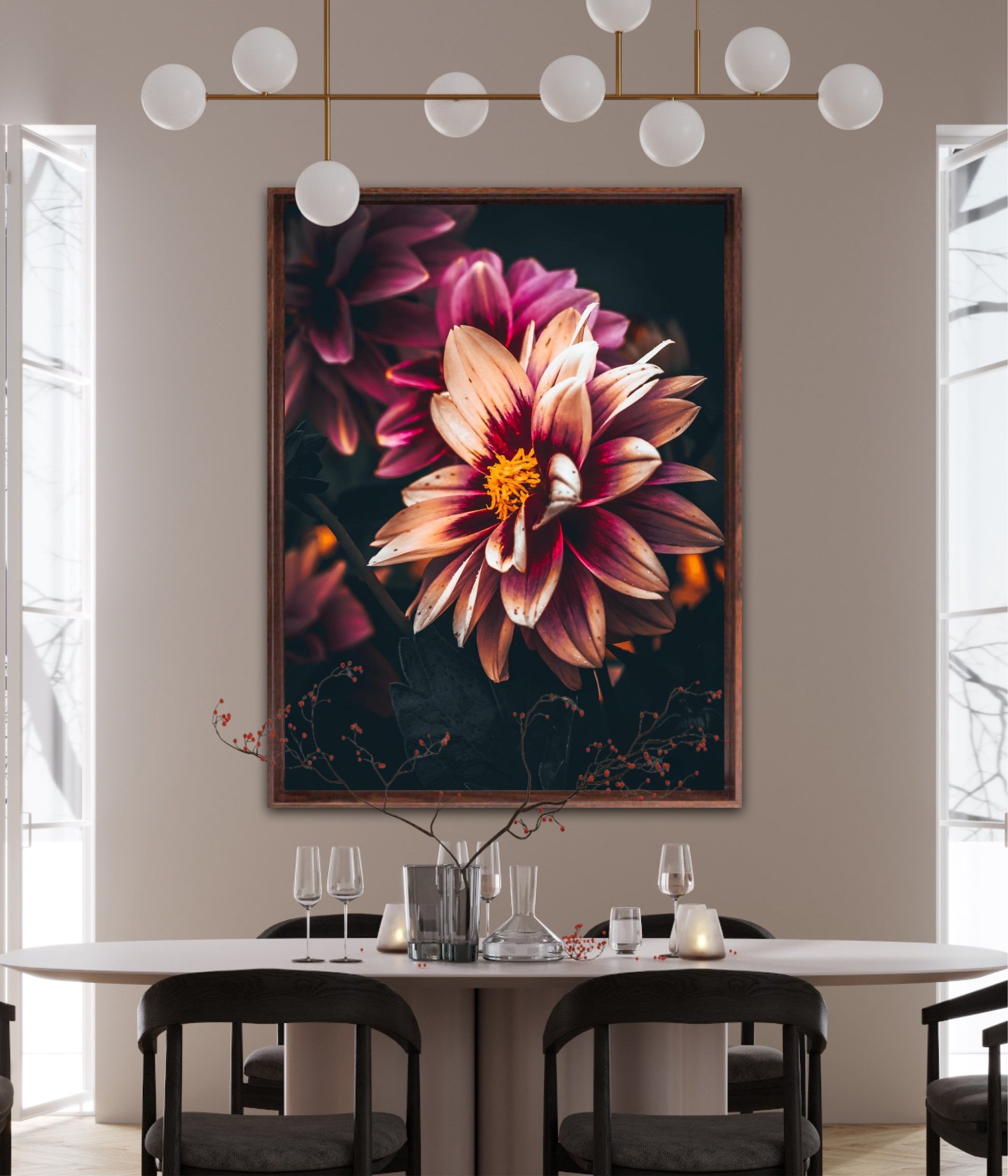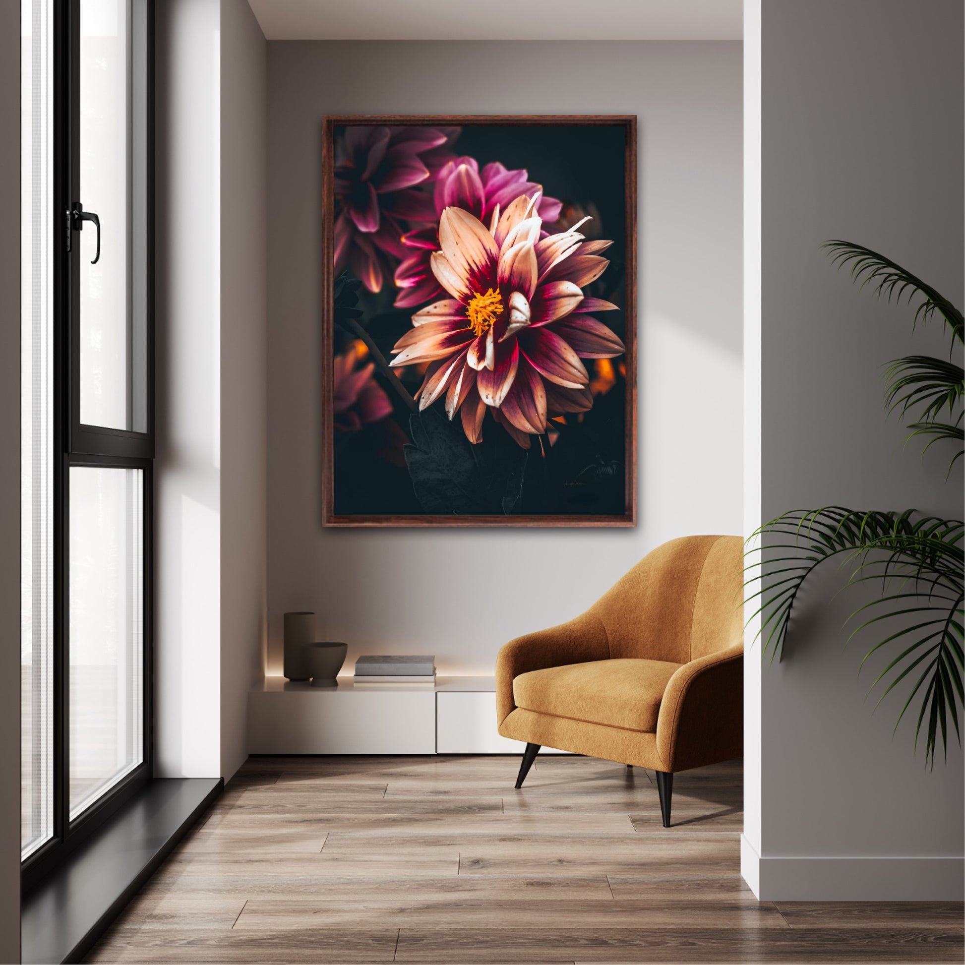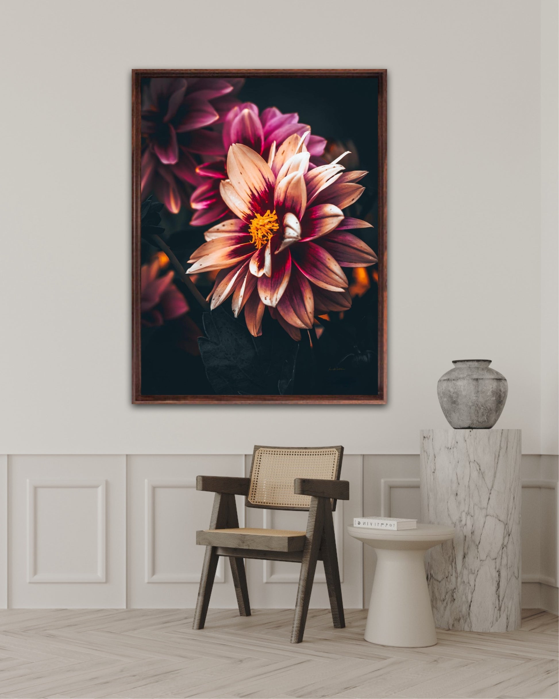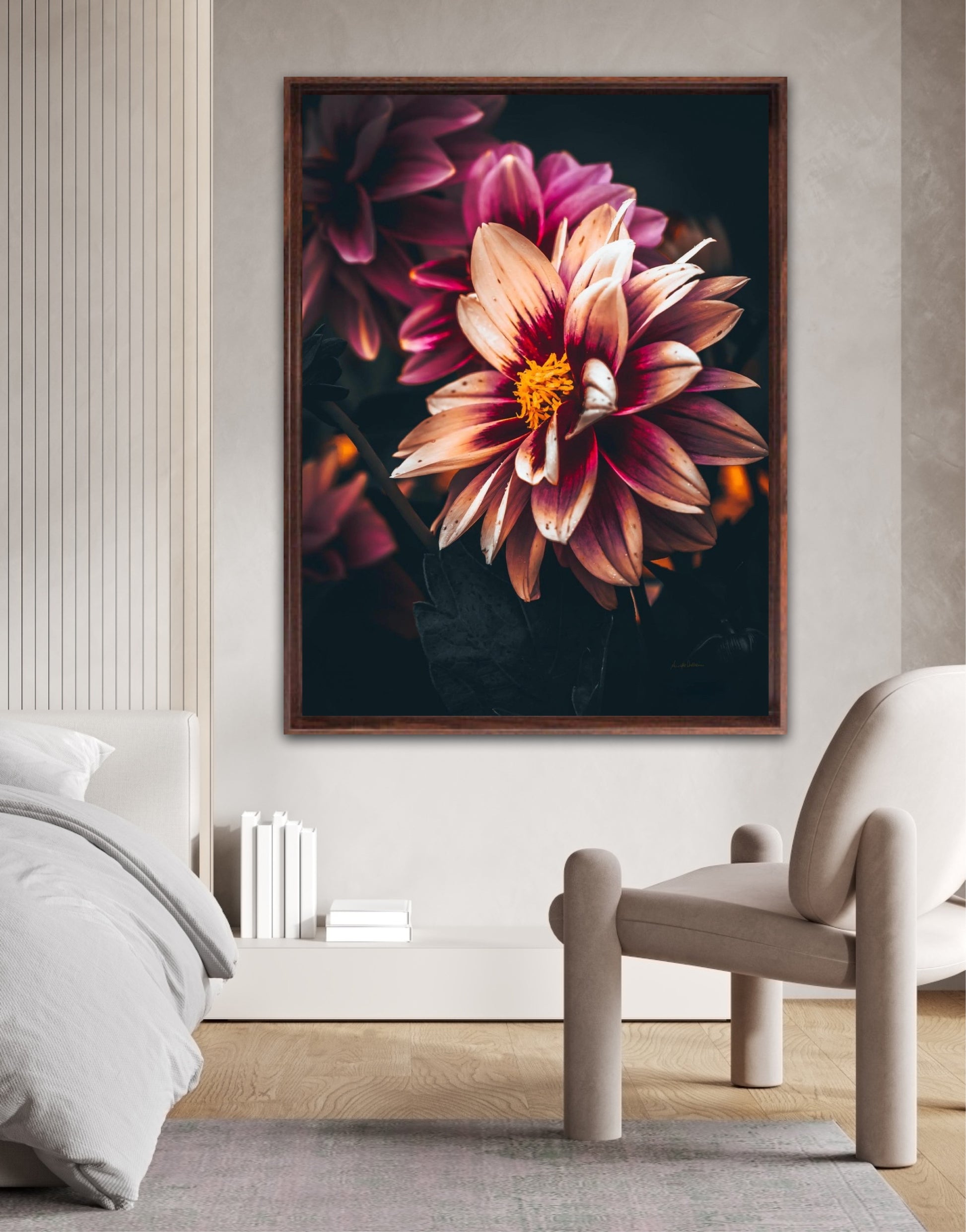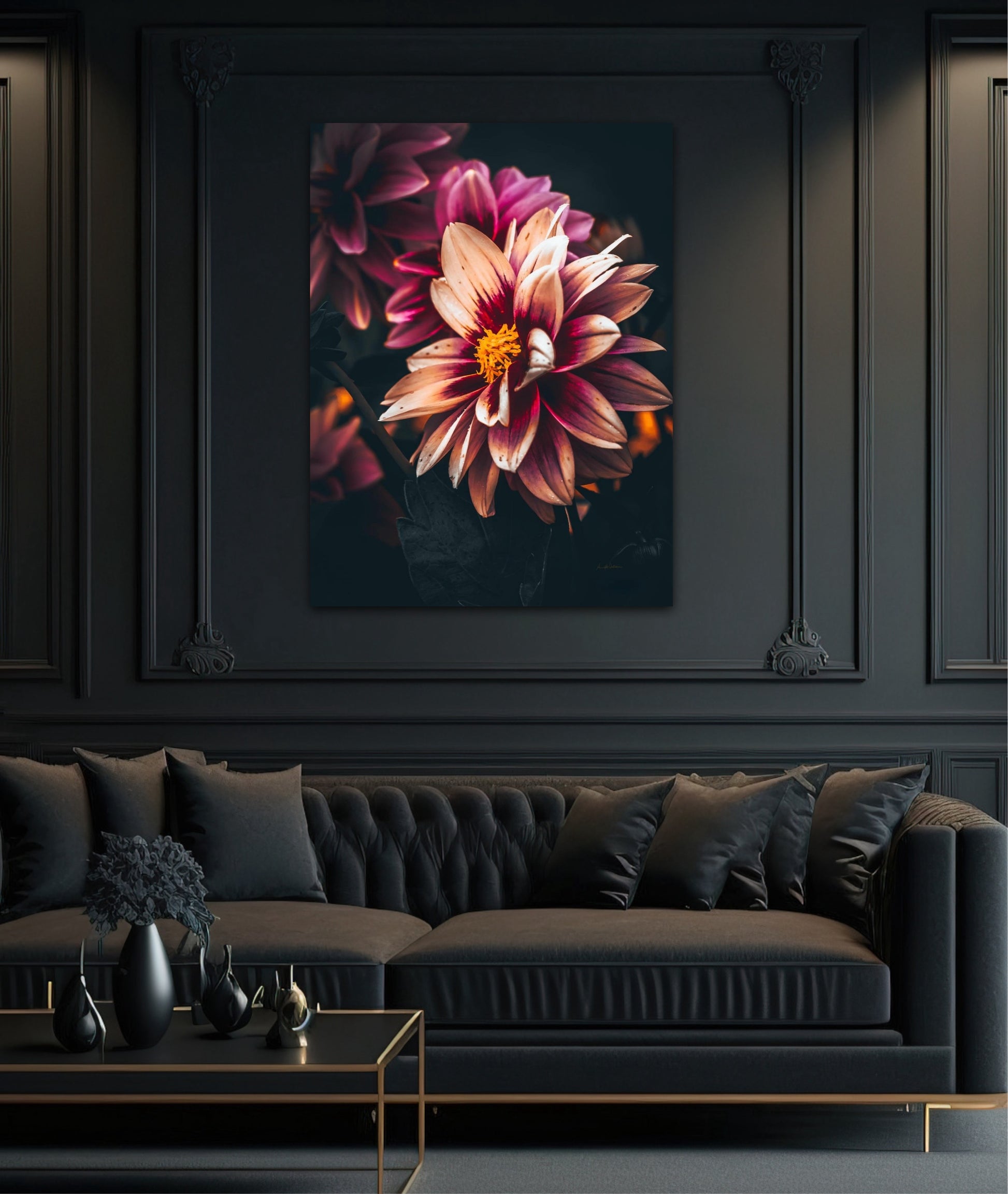 Striking photographic wall art of a white and pink Dahlia flower close up in stunning red, pink, white and orange tones, on a dark background. This artwork will be a stand-out piece in your home and bring you peace and tranquility.