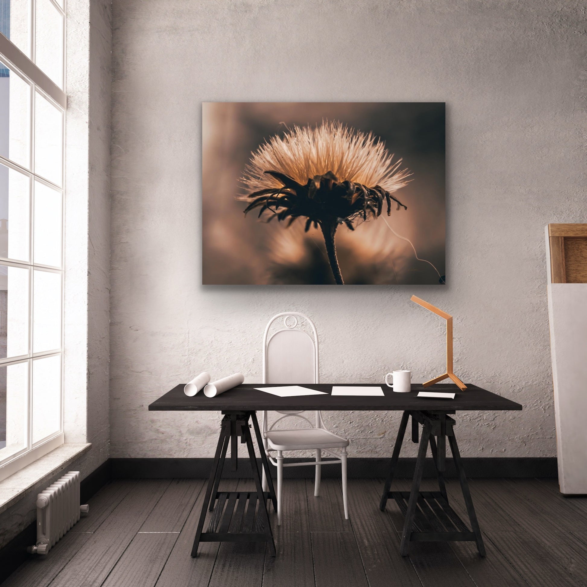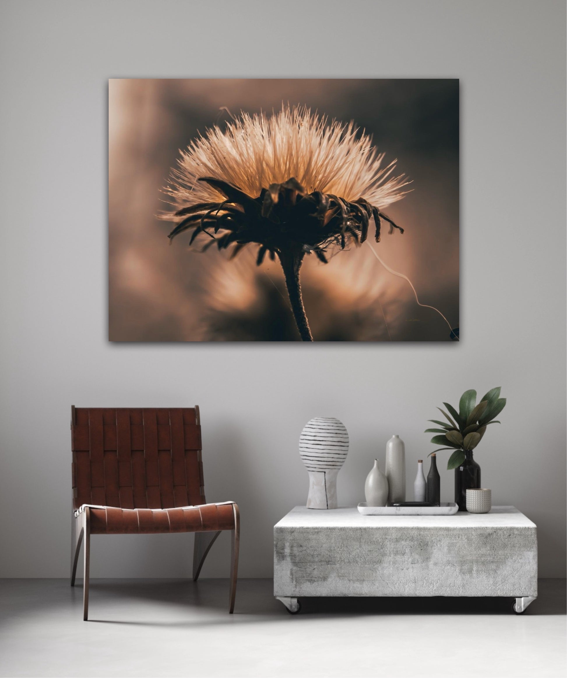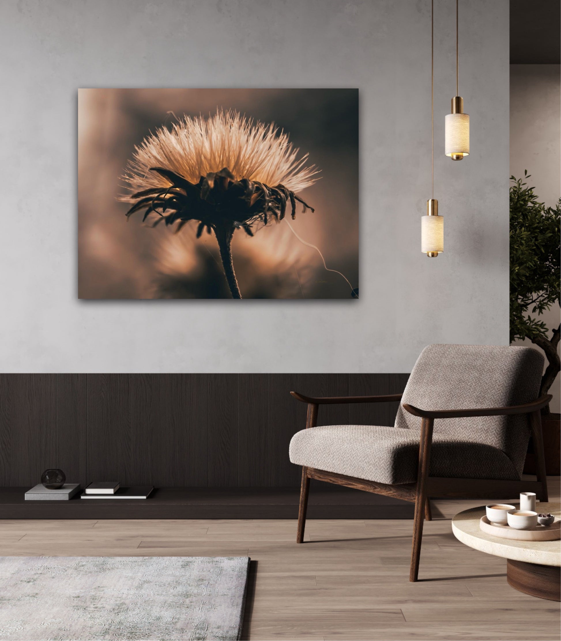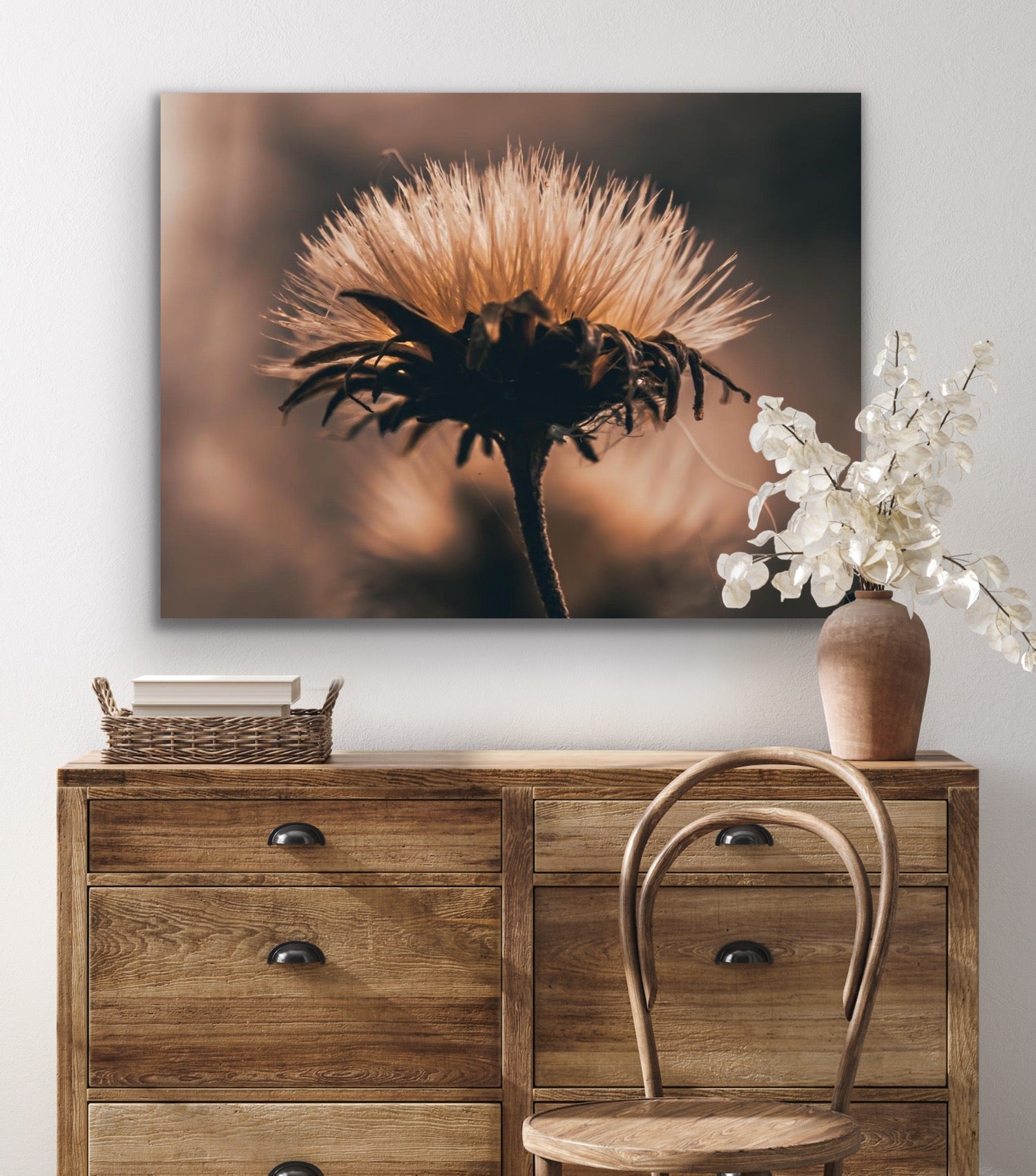Beautiful photographic wall art of a dandelion in muted dark beige brown and black color. The background is dramatic with beautiful light effects.