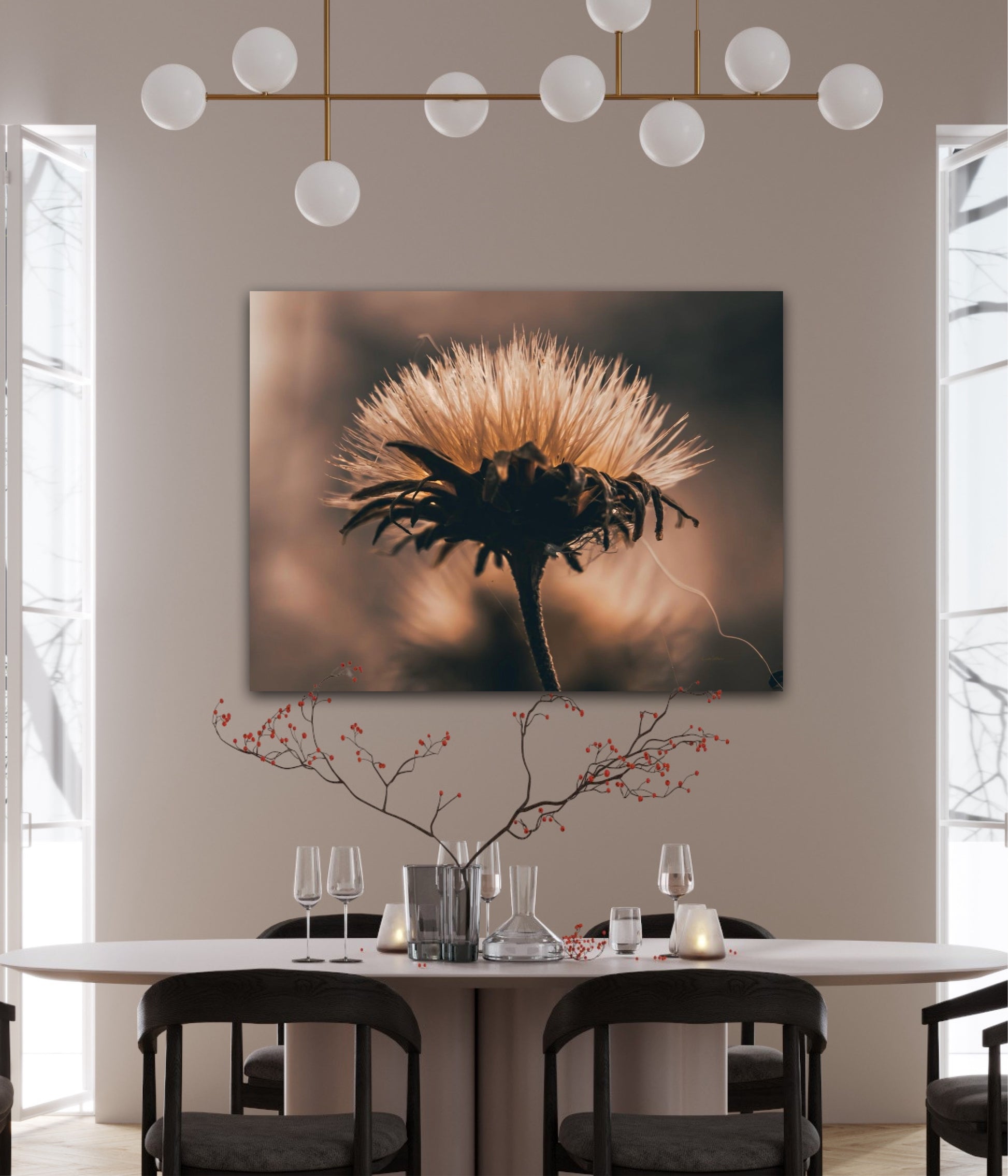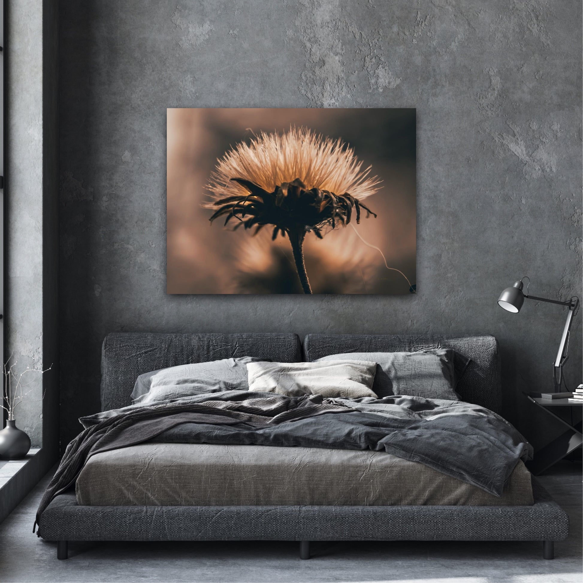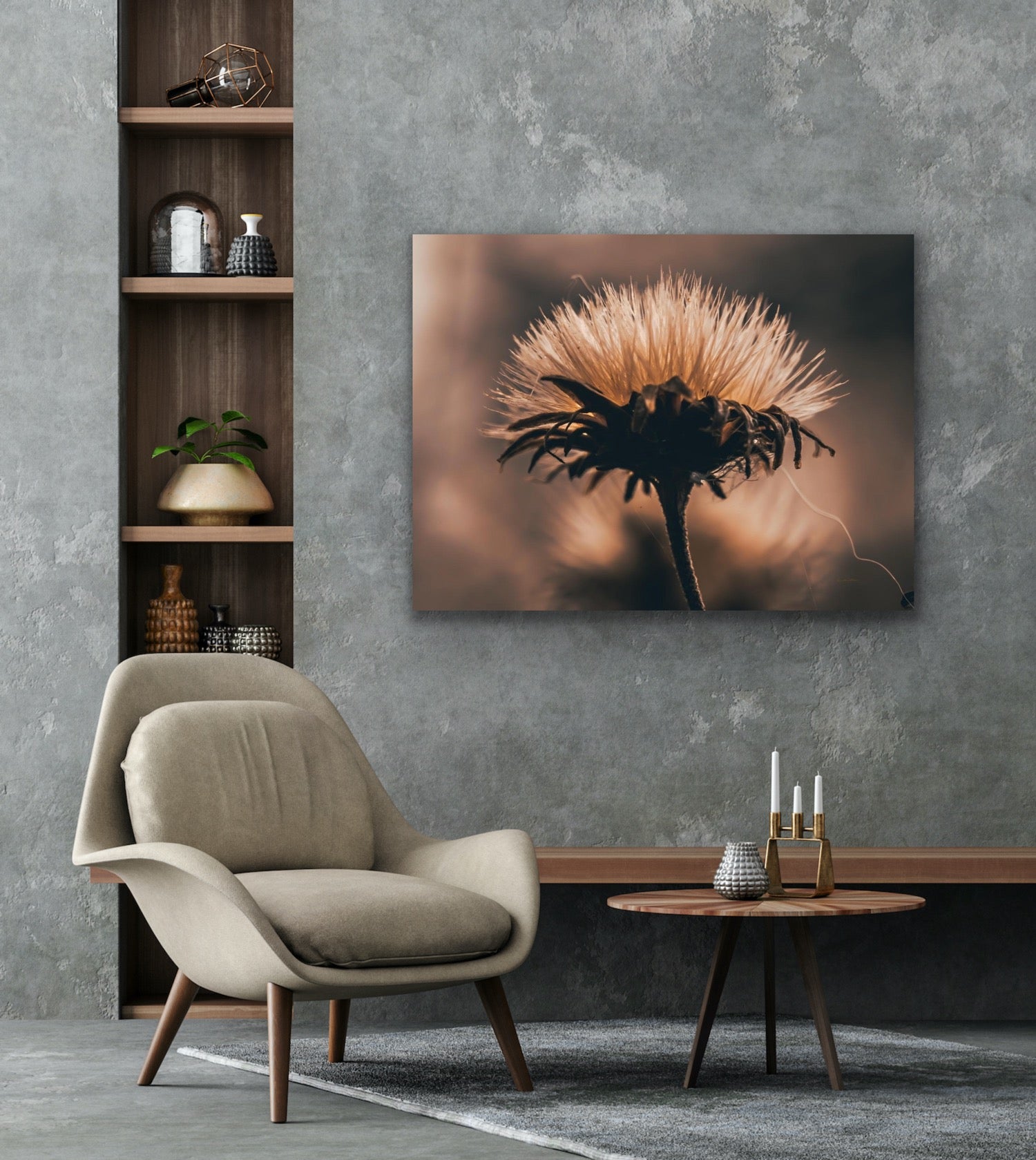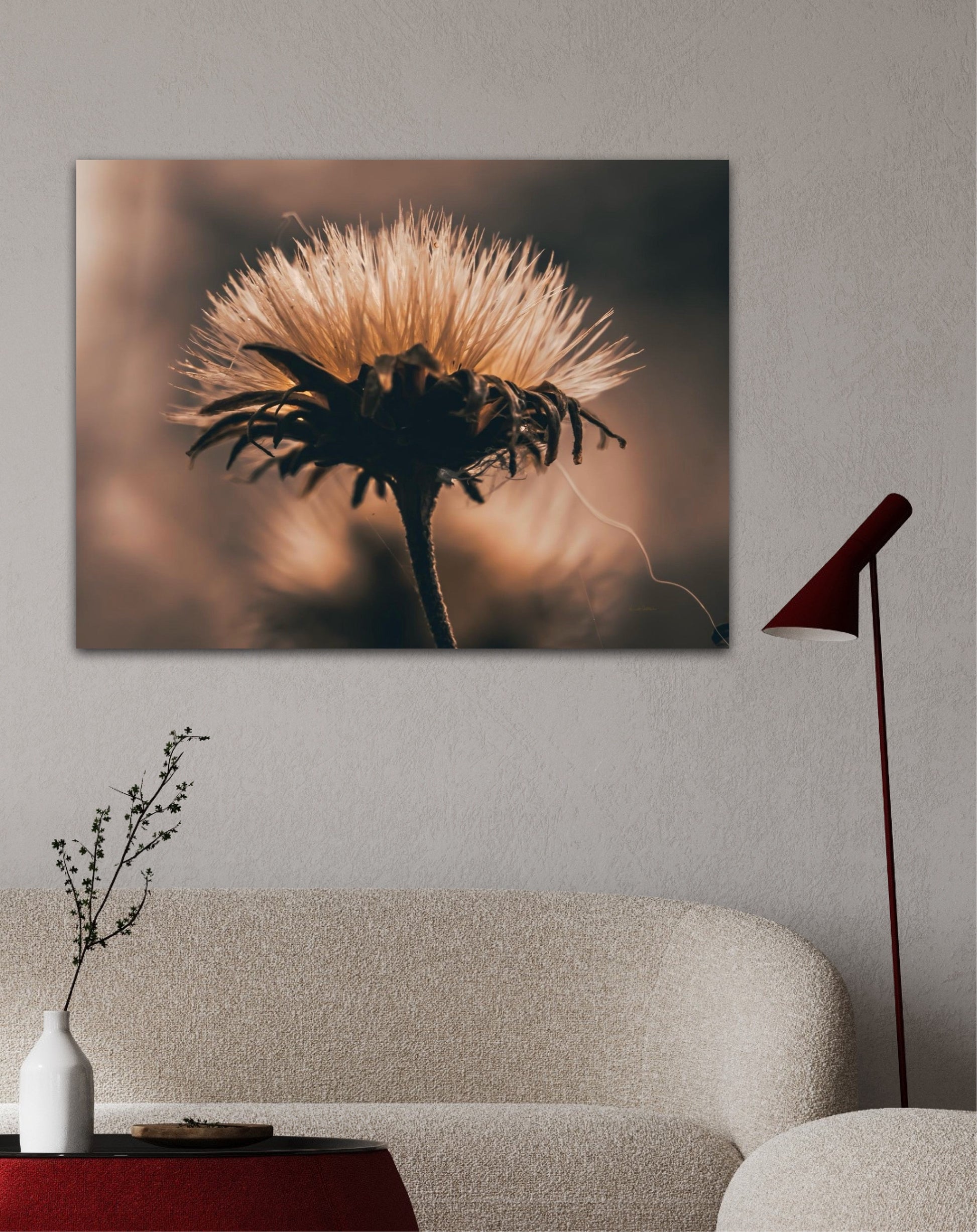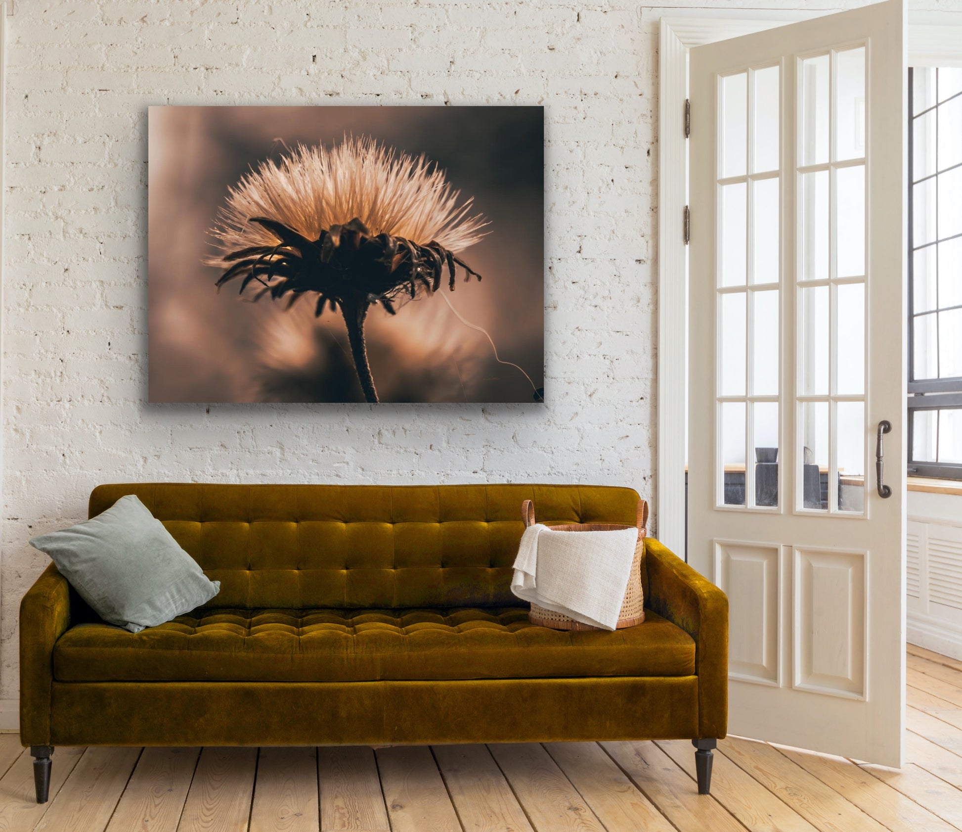 Beautiful photographic wall art of a dandelion in muted dark beige brown and black color. The background is dramatic with beautiful light effects.