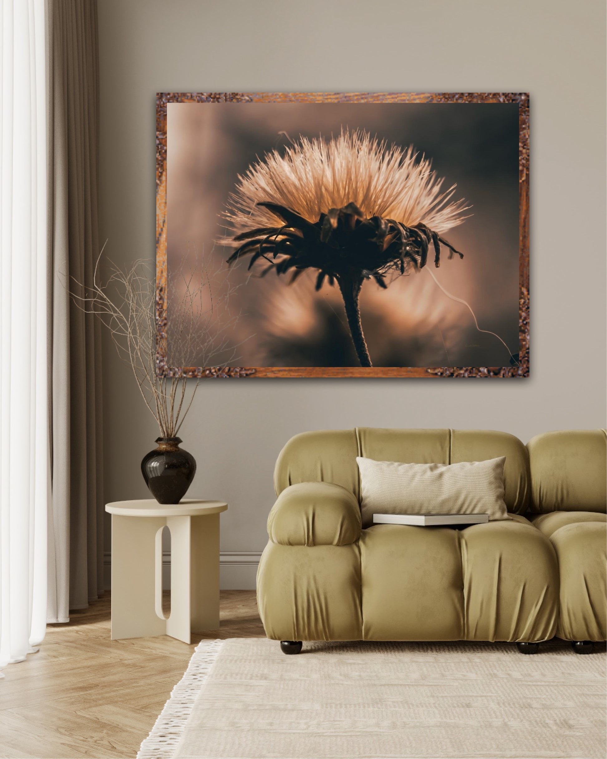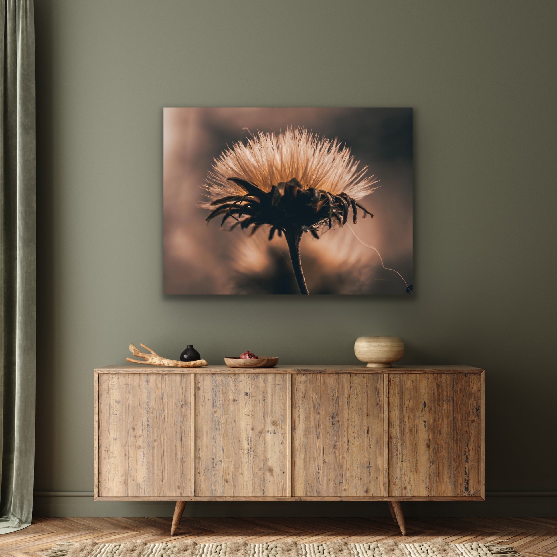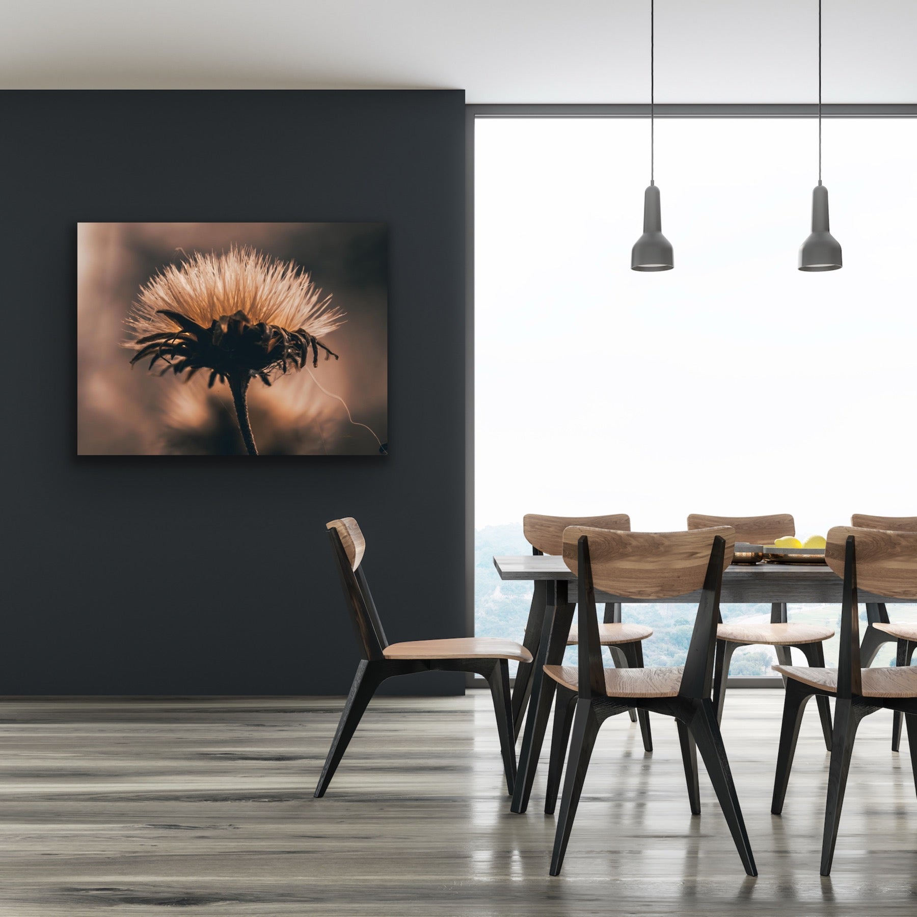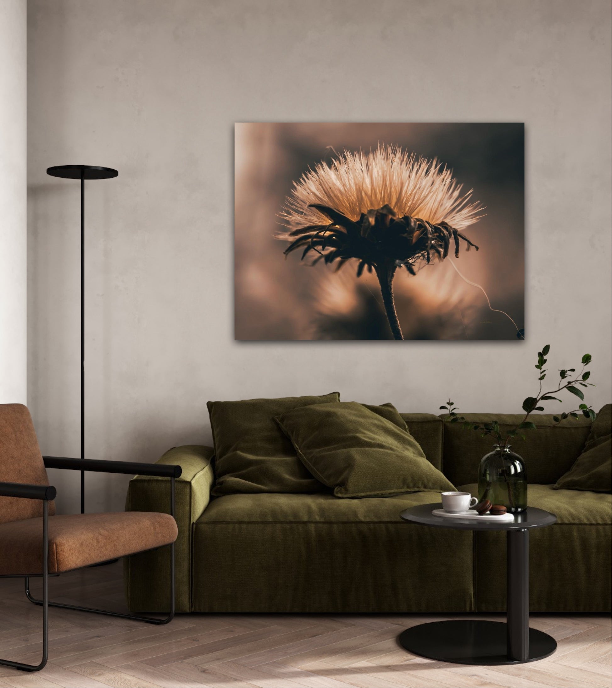 Beautiful photographic wall art of a dandelion in muted dark beige brown and black color. The background is dramatic with beautiful light effects.