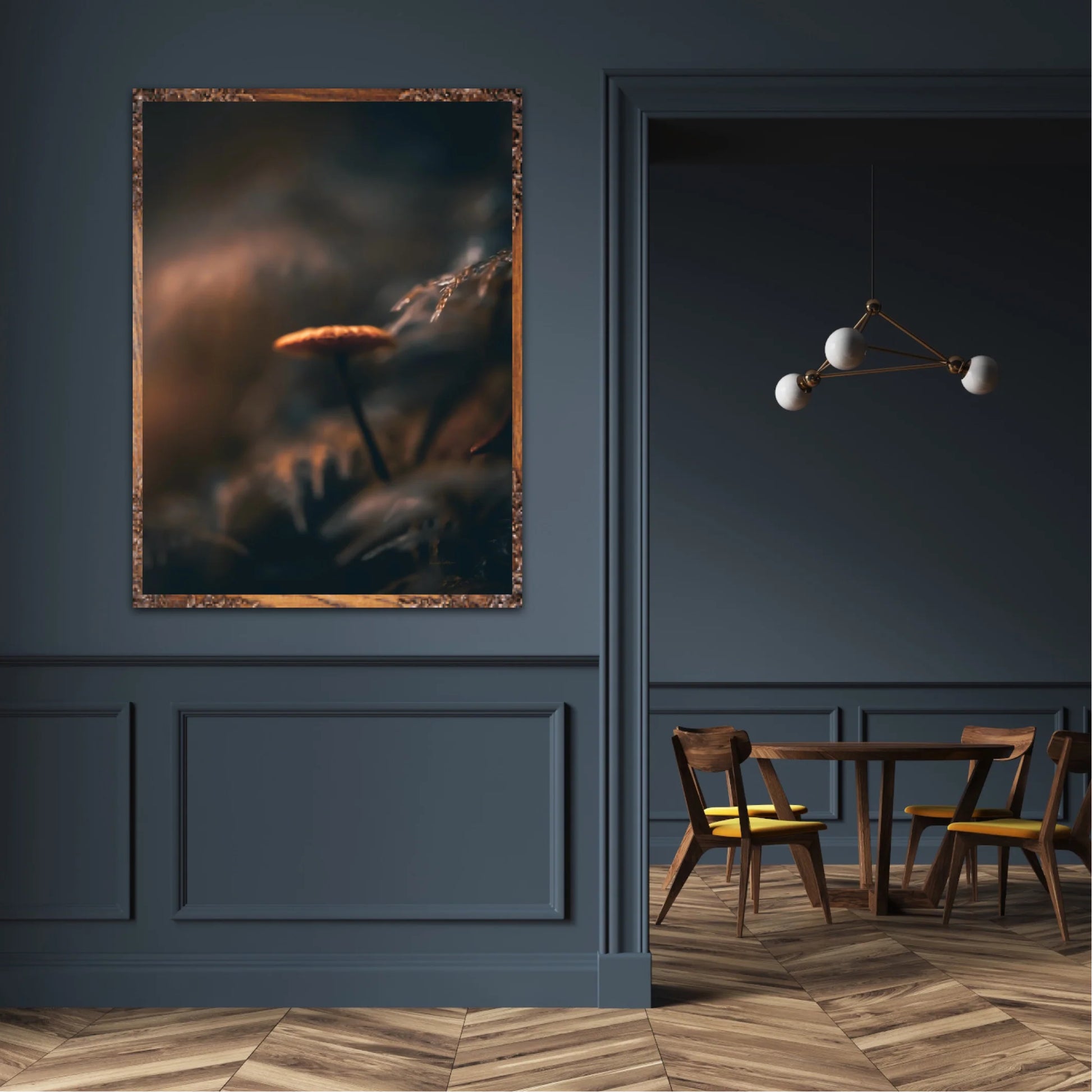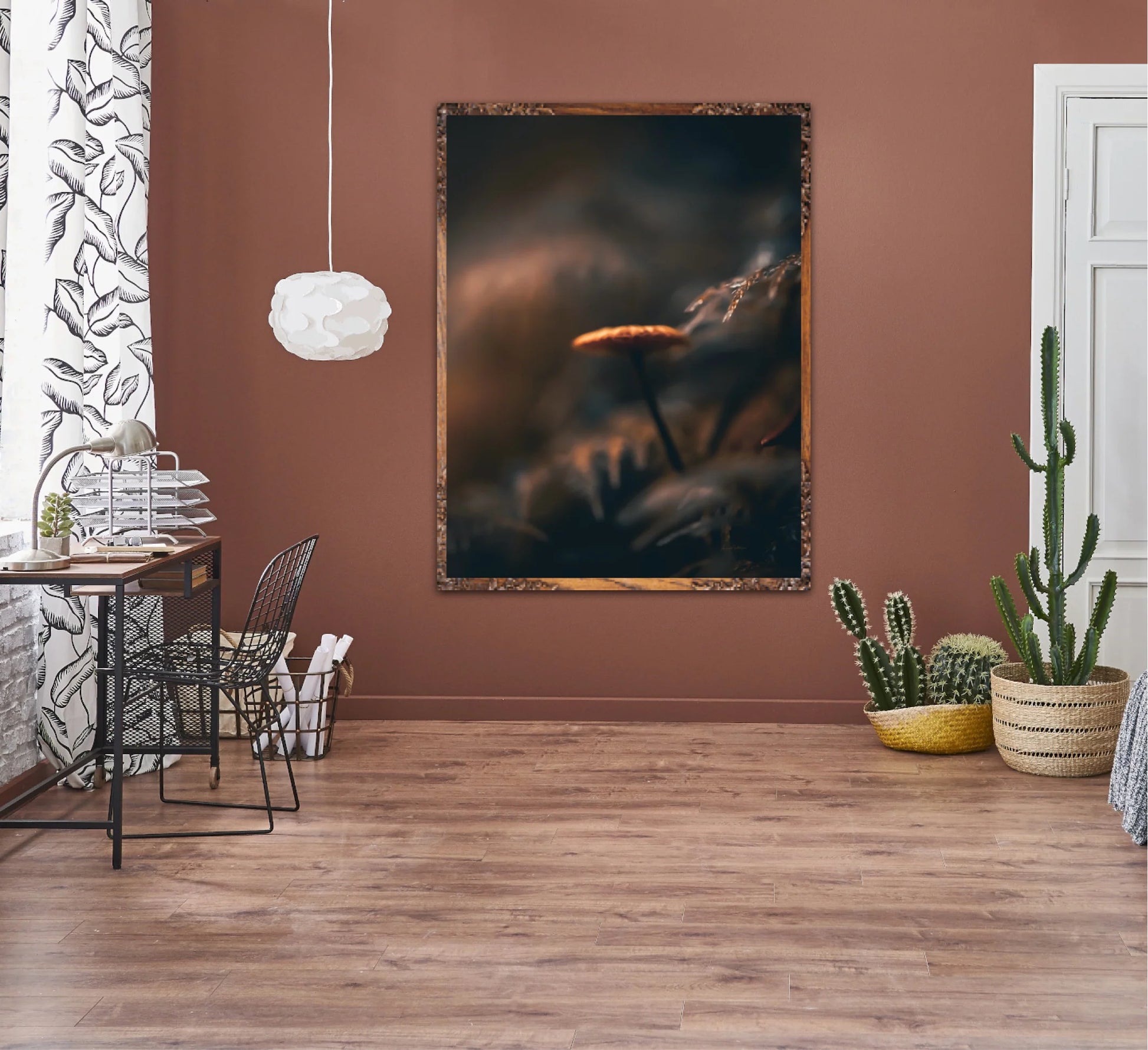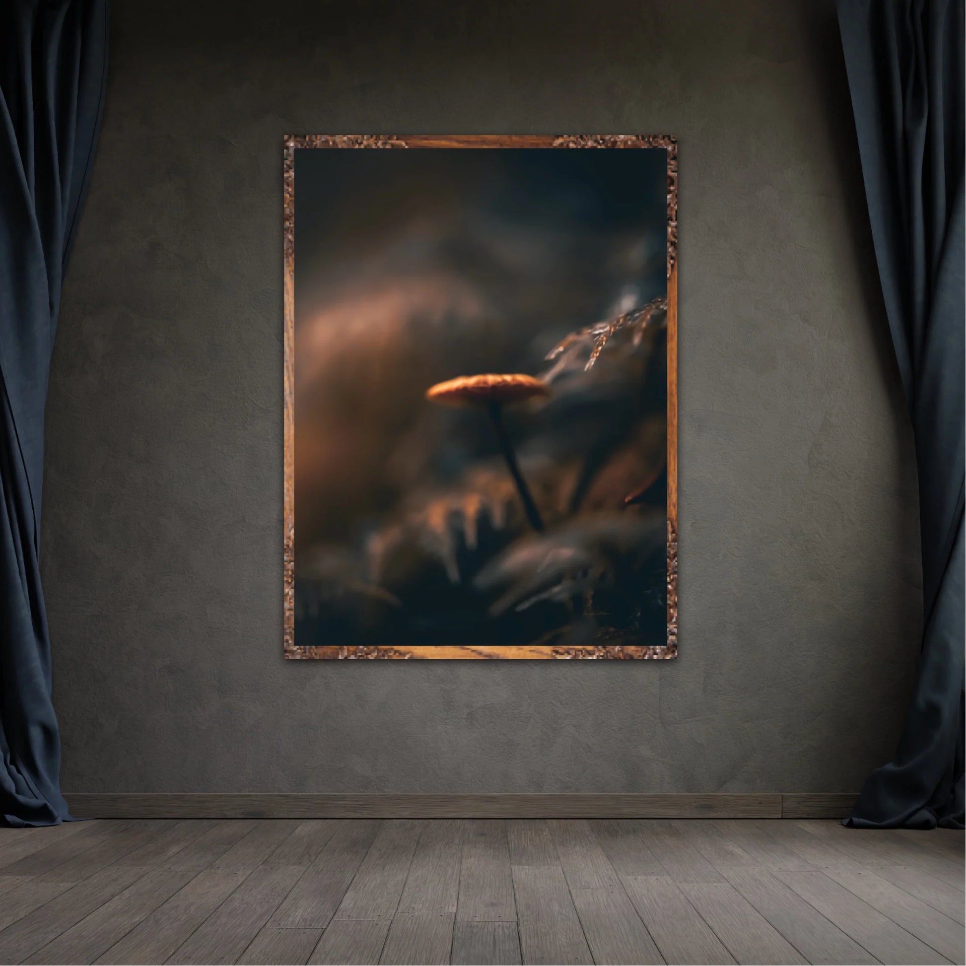 Beautiful photographic wall art of s small mushroom in the forest. The colours are wonderful earthy of brown, golden brown, grey and greyish green. This wall art gives you a real connection with nature and looks amazing on your wall.