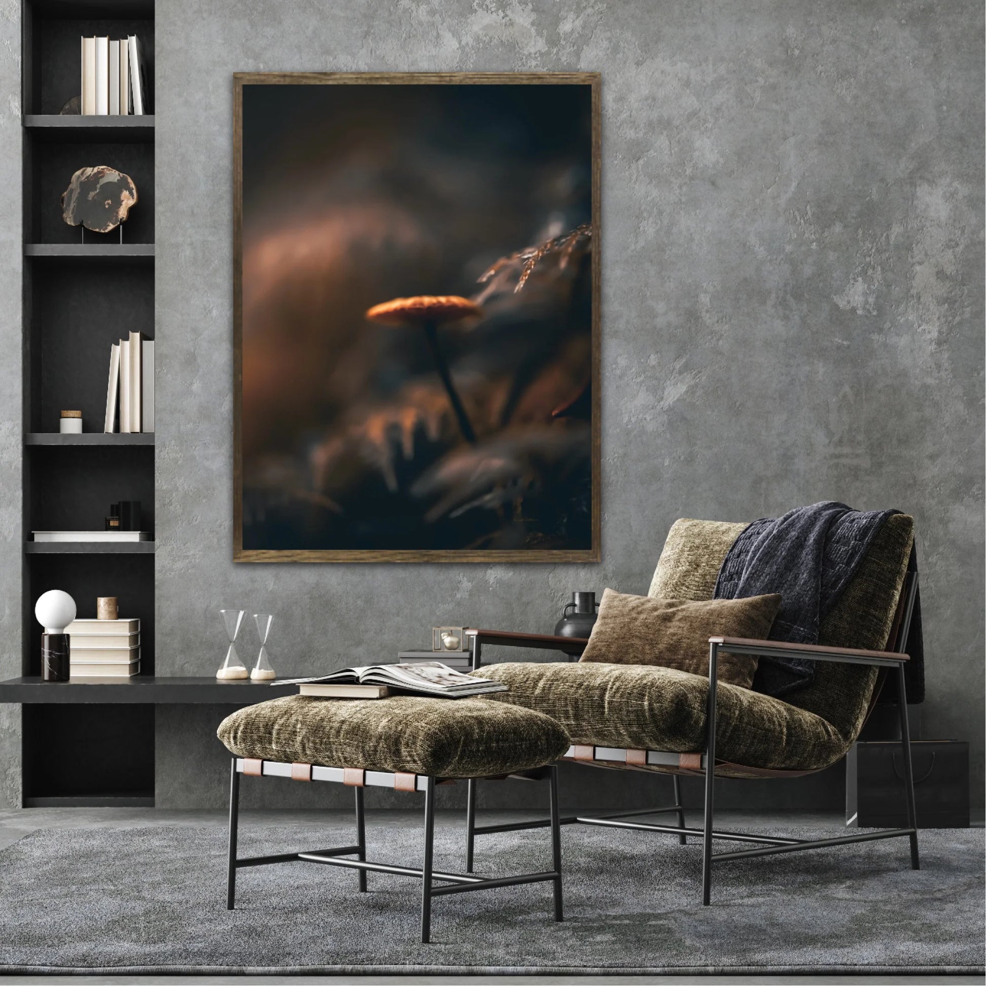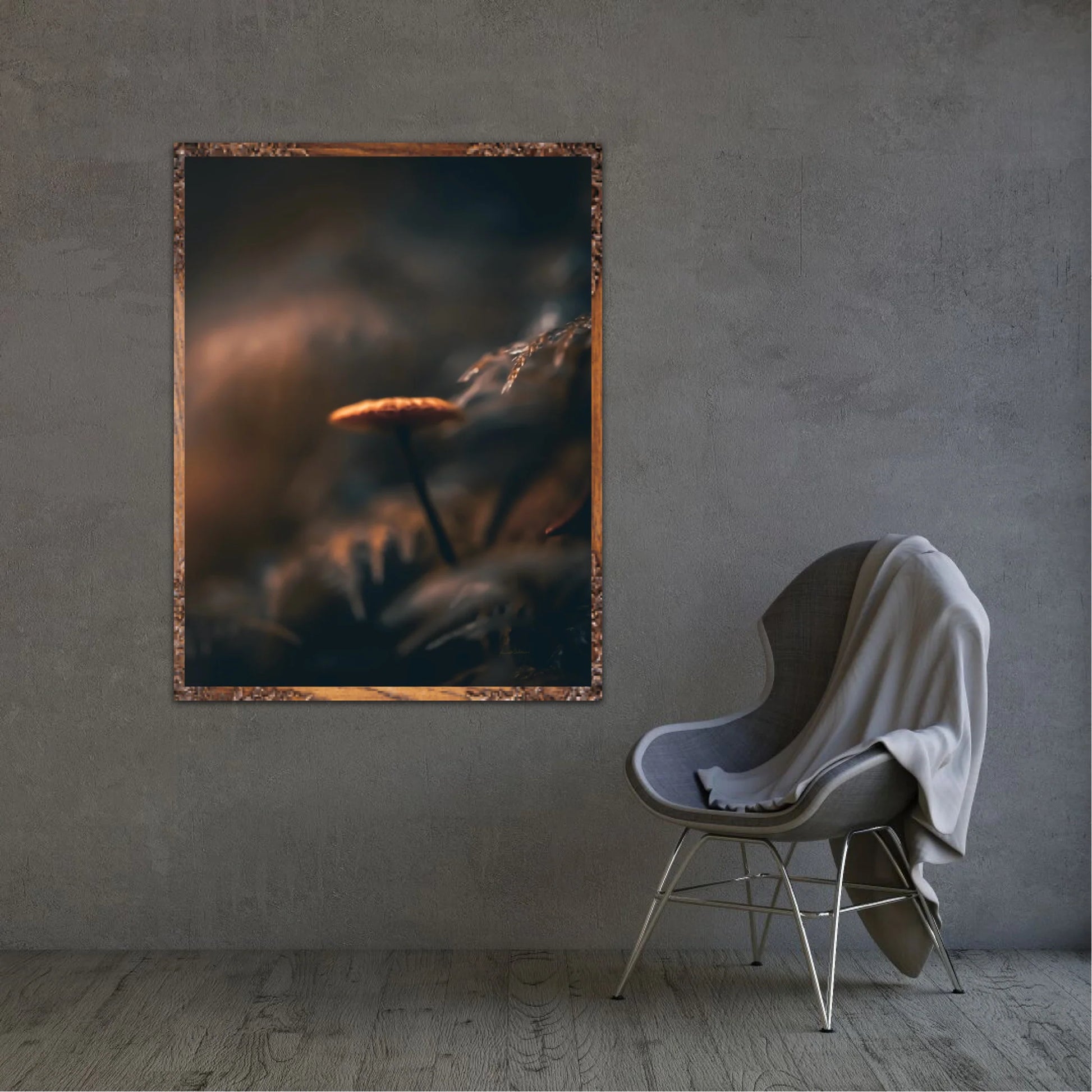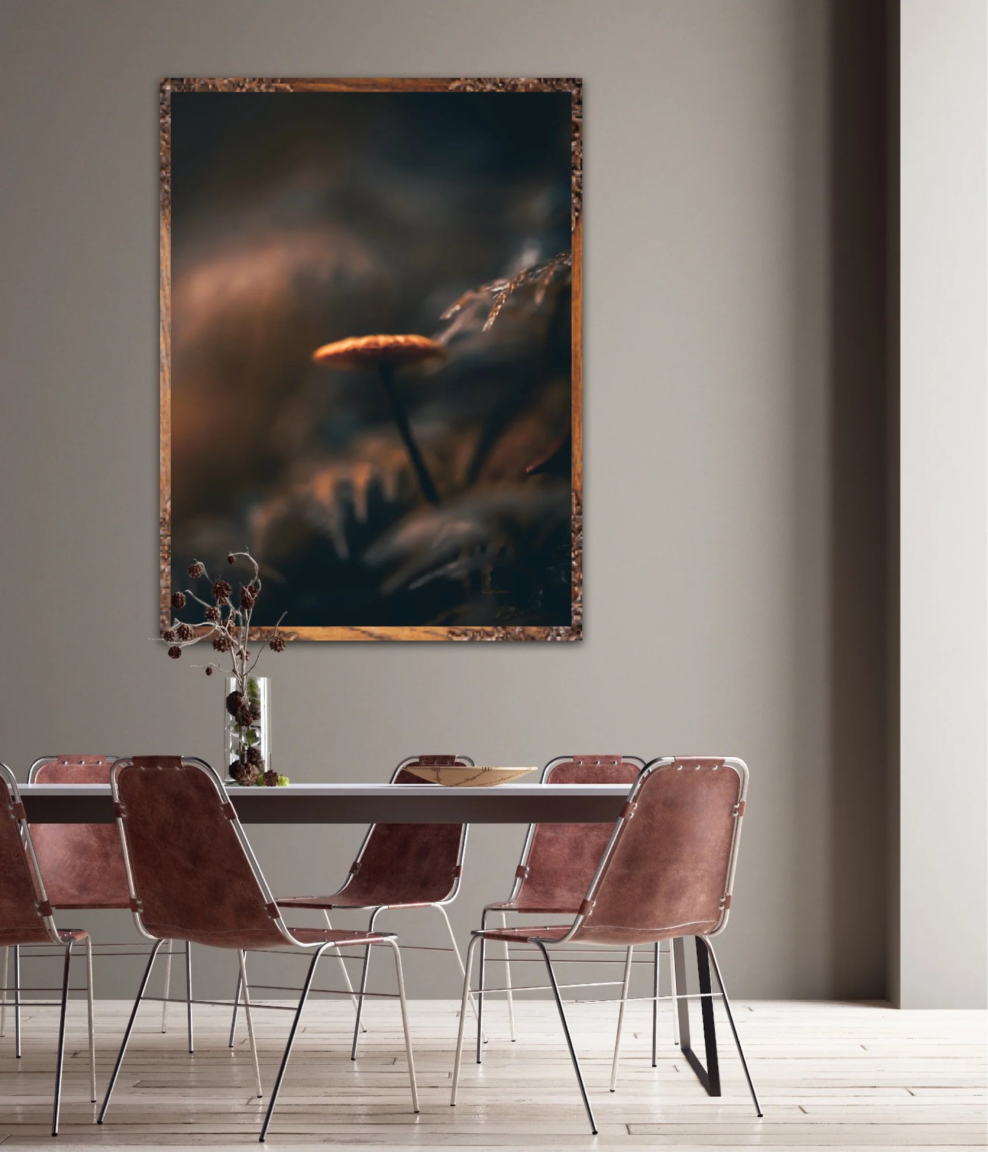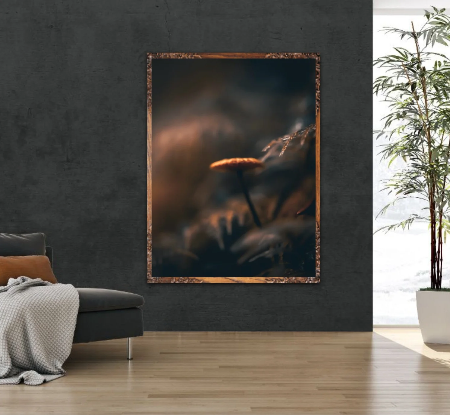 Beautiful photographic wall art of s small mushroom in the forest. The colours are wonderful earthy of brown, golden brown, grey and greyish green. This wall art gives you a real connection with nature and looks amazing on your wall.