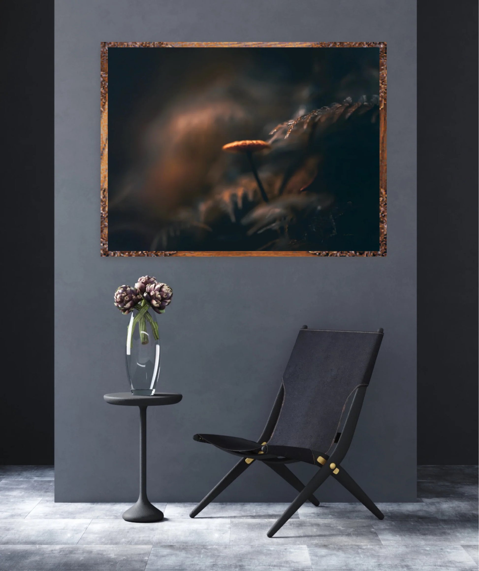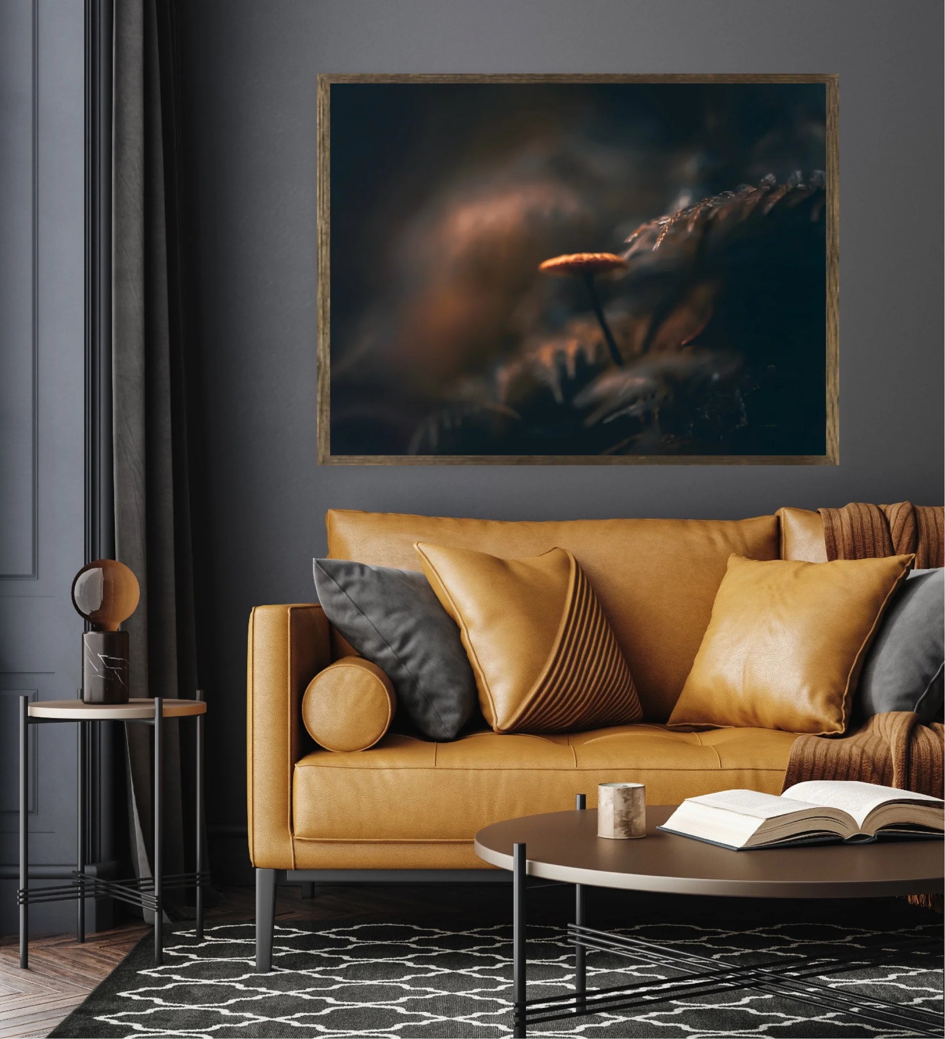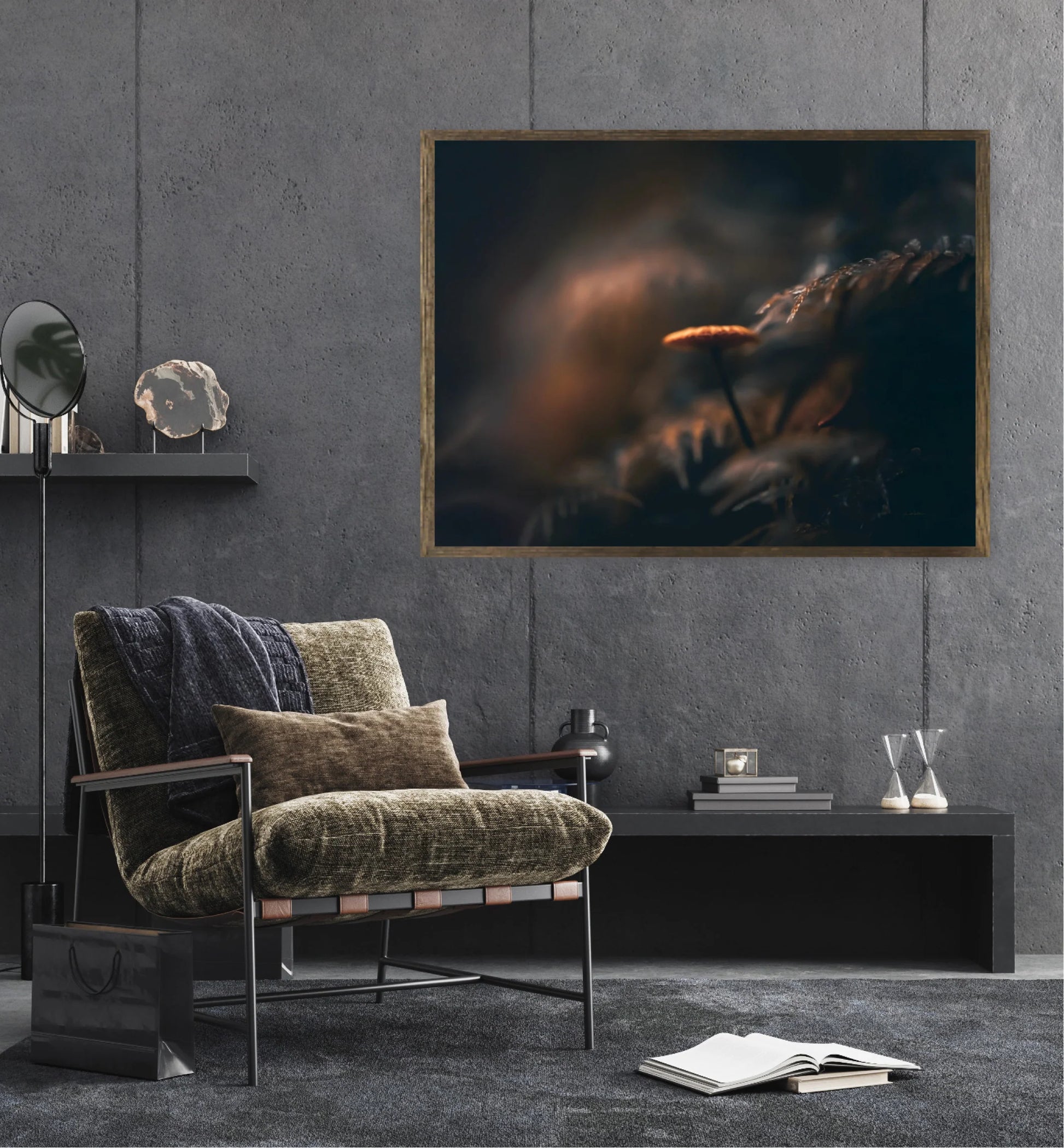 Beautiful photographic wall art of s small mushroom in the forest. The colours are wonderful earthy of brown, golden brown, grey and greyish green. This wall art gives you a real connection with nature and looks amazing on your wall.