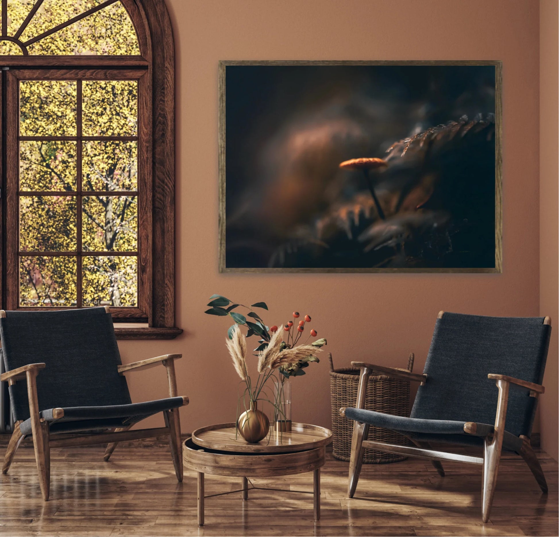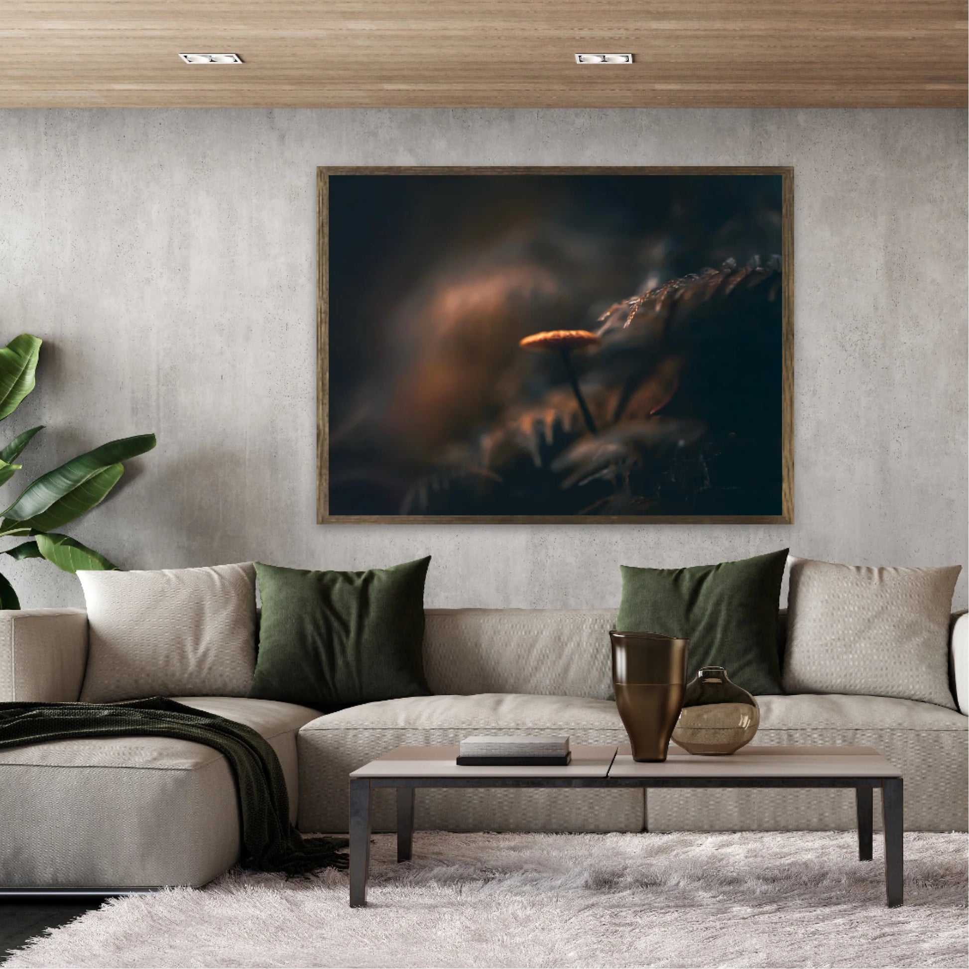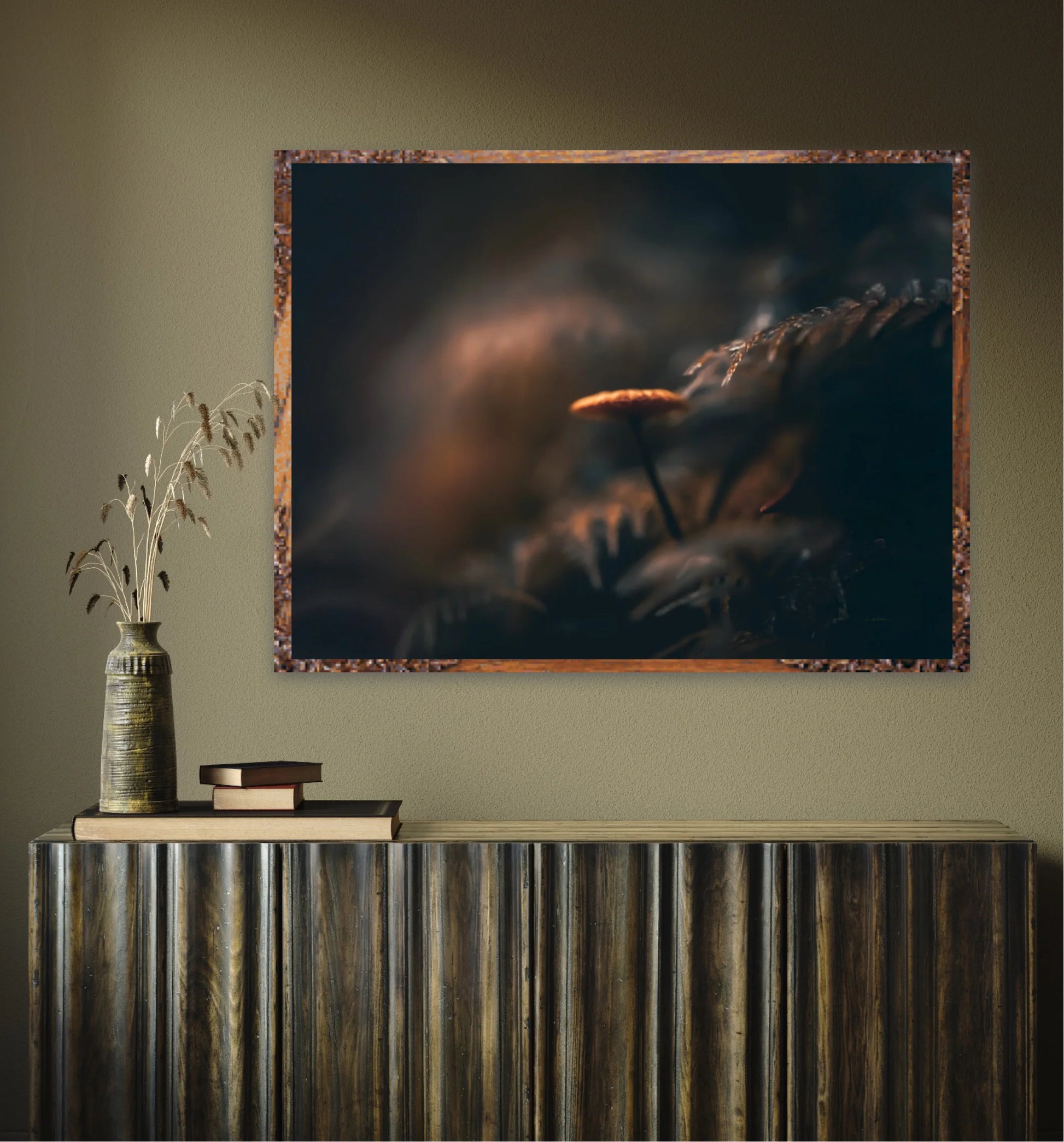 Beautiful photographic wall art of s small mushroom in the forest. The colours are wonderful earthy of brown, golden brown, grey and greyish green. This wall art gives you a real connection with nature and looks amazing on your wall.
