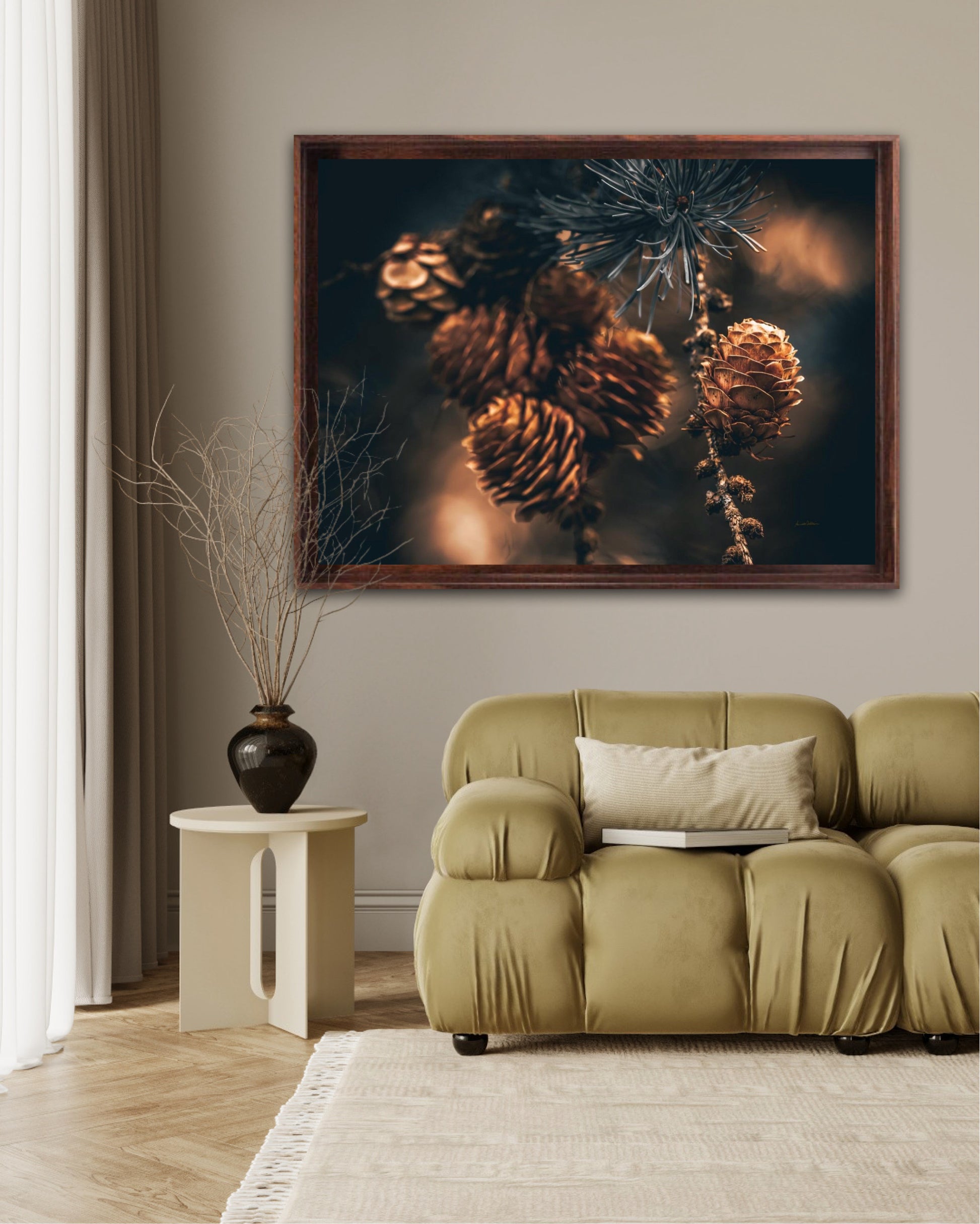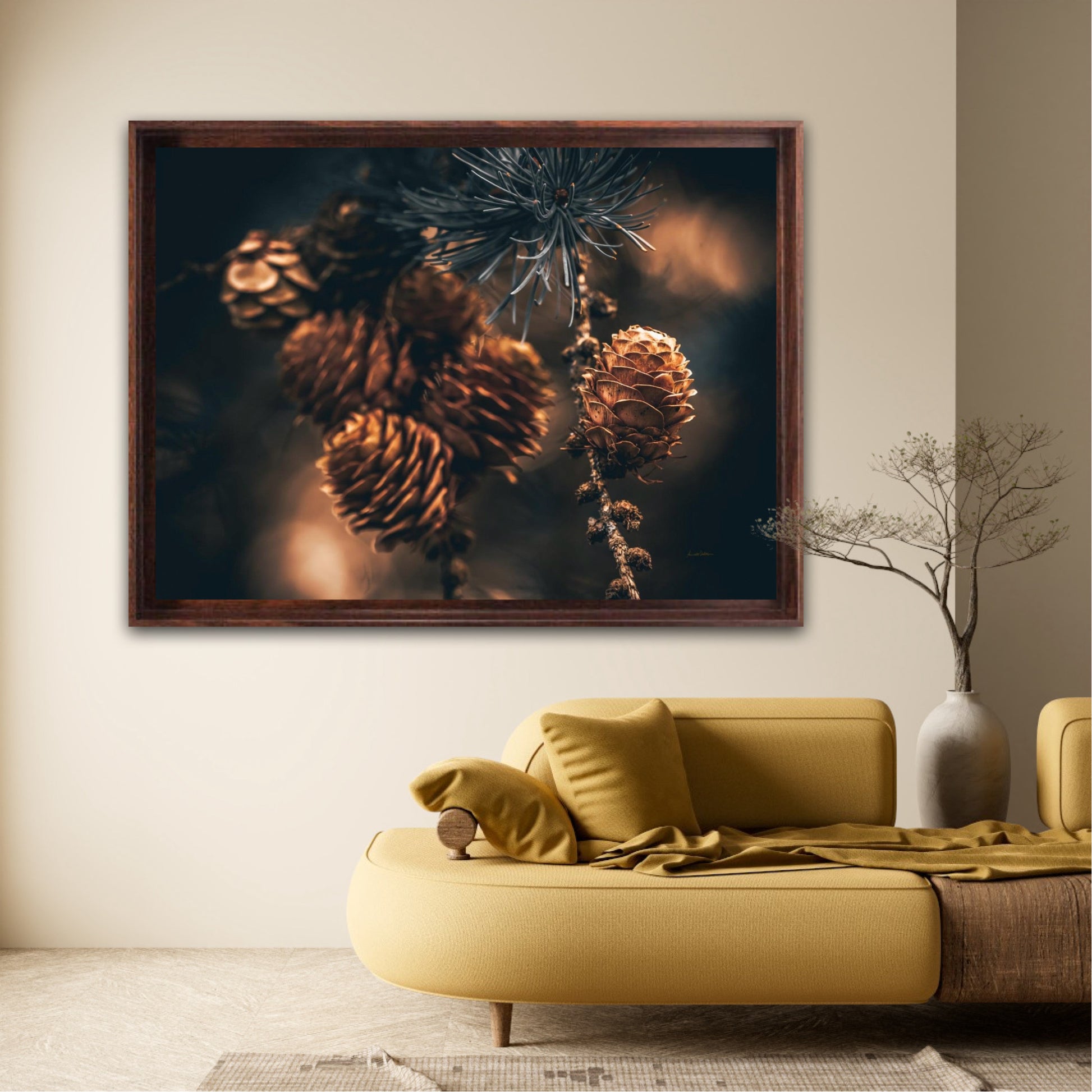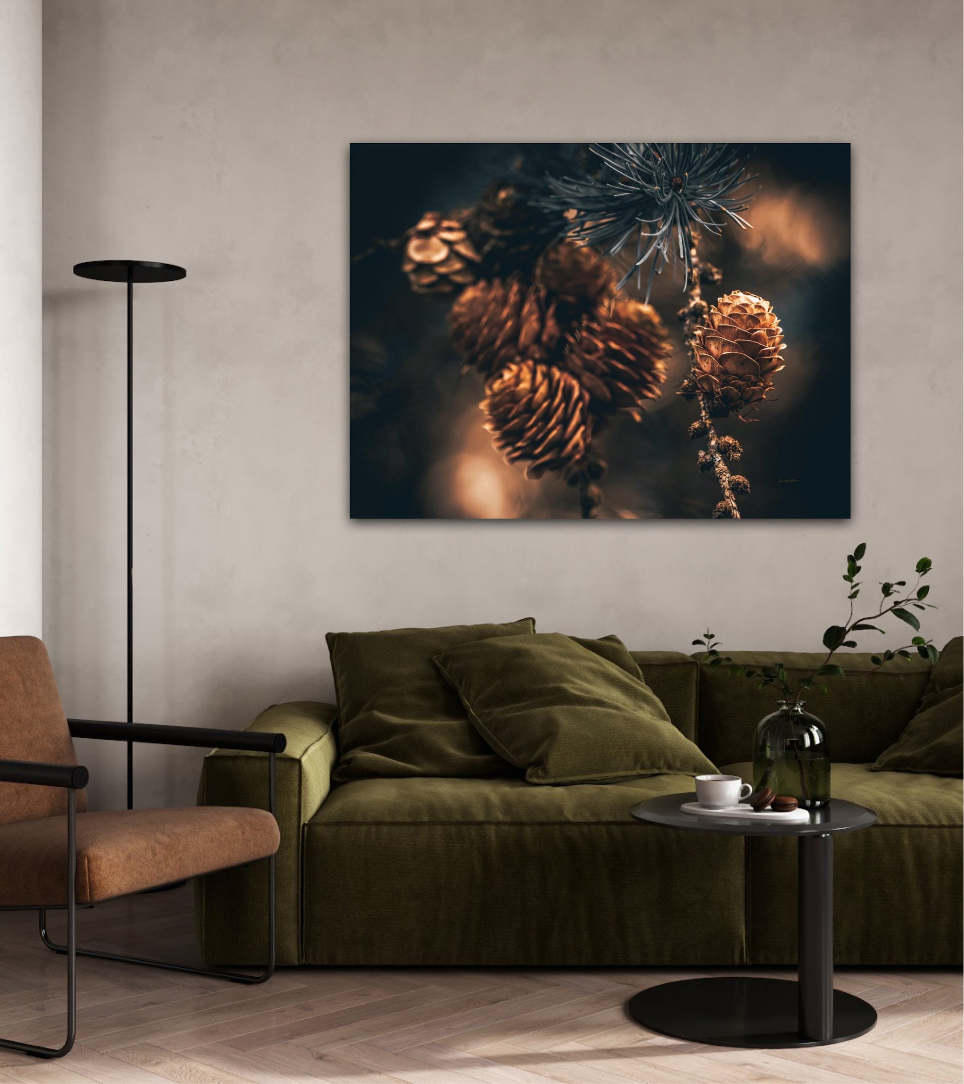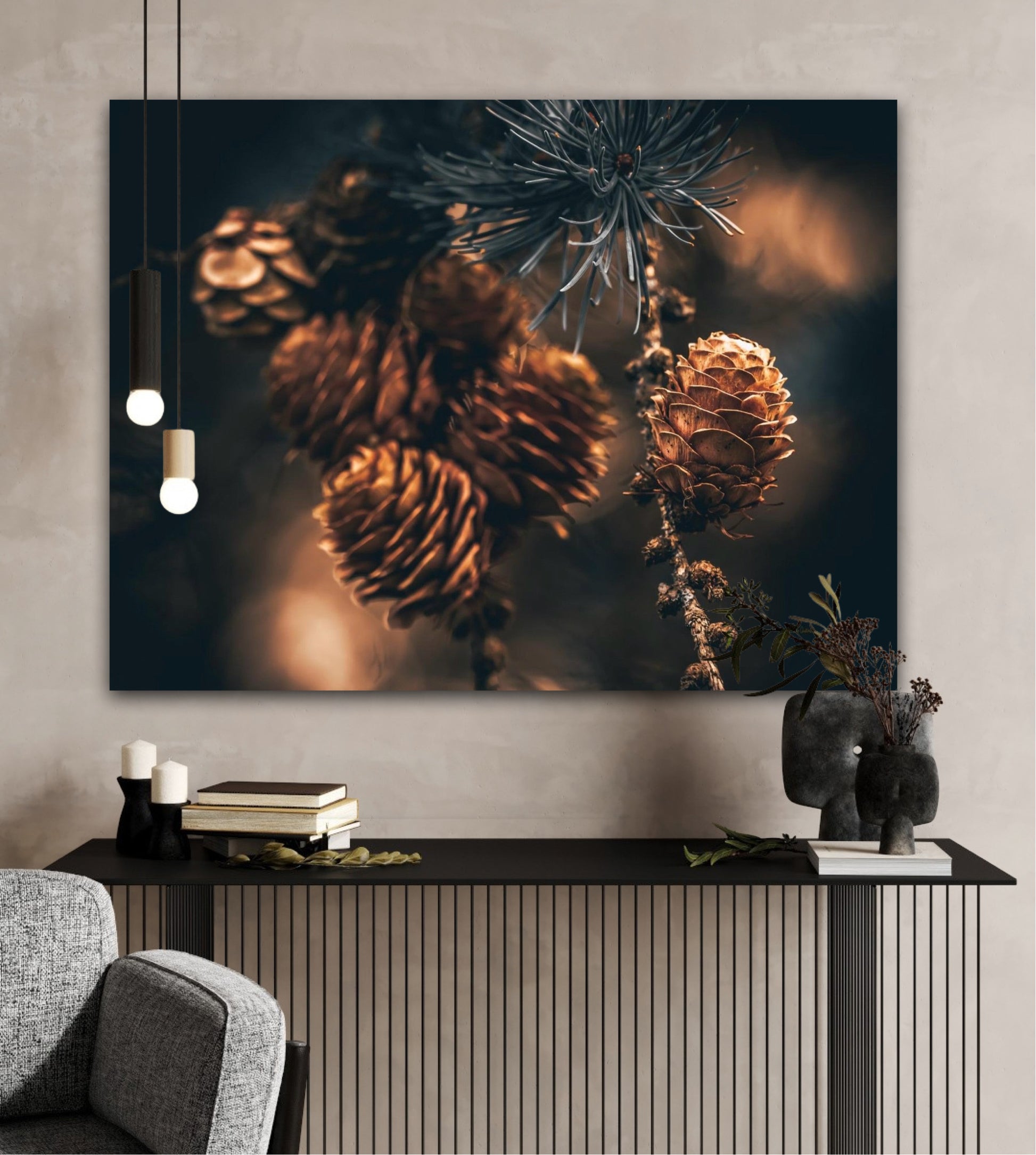 Beautiful photographic wall art of pine cones on a branch in a beautiful golden light. This artwork becomes an eye-catcher on the wall and brings nature into your home. Find the calm and magic of nature with this fine artwork.