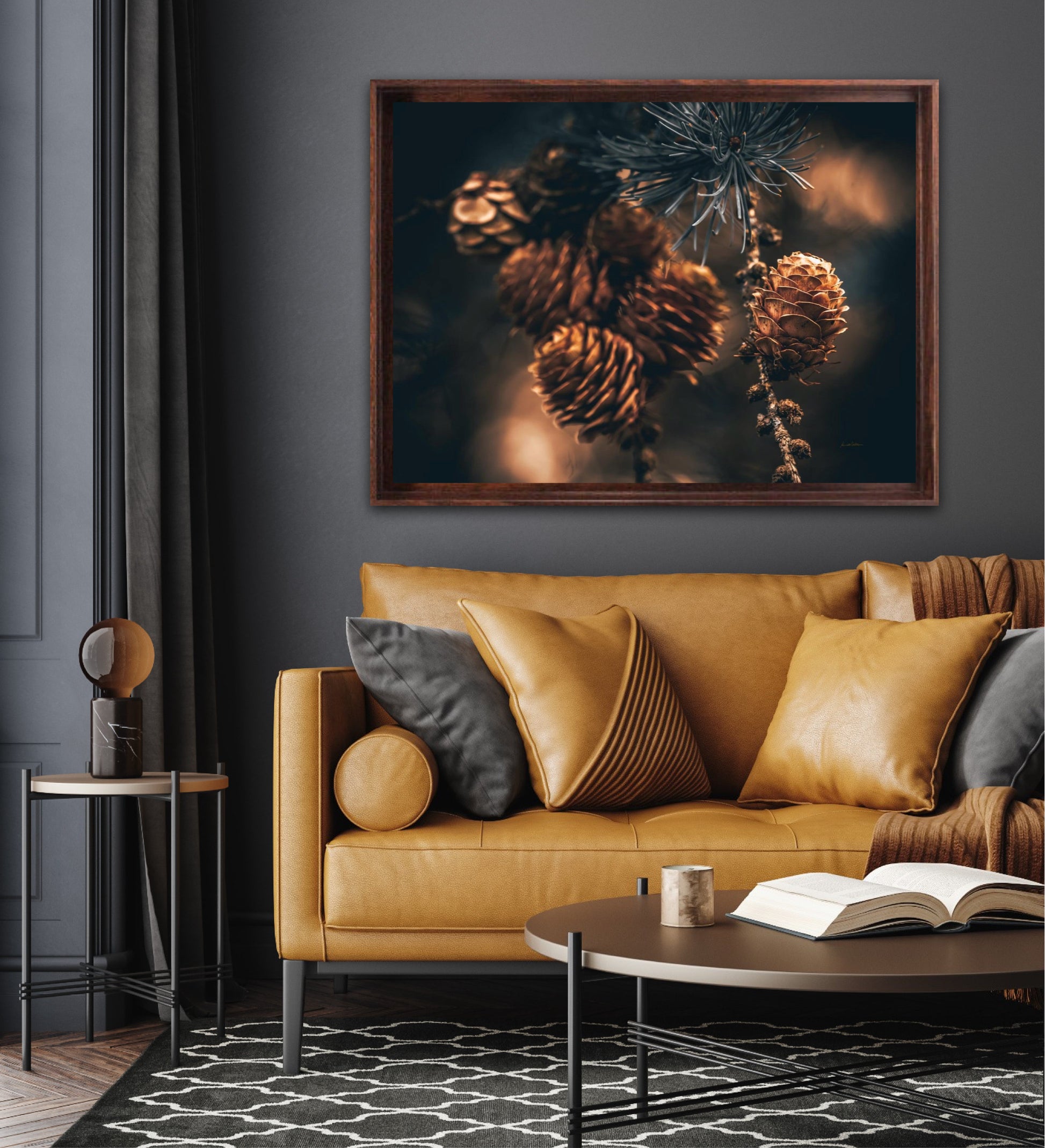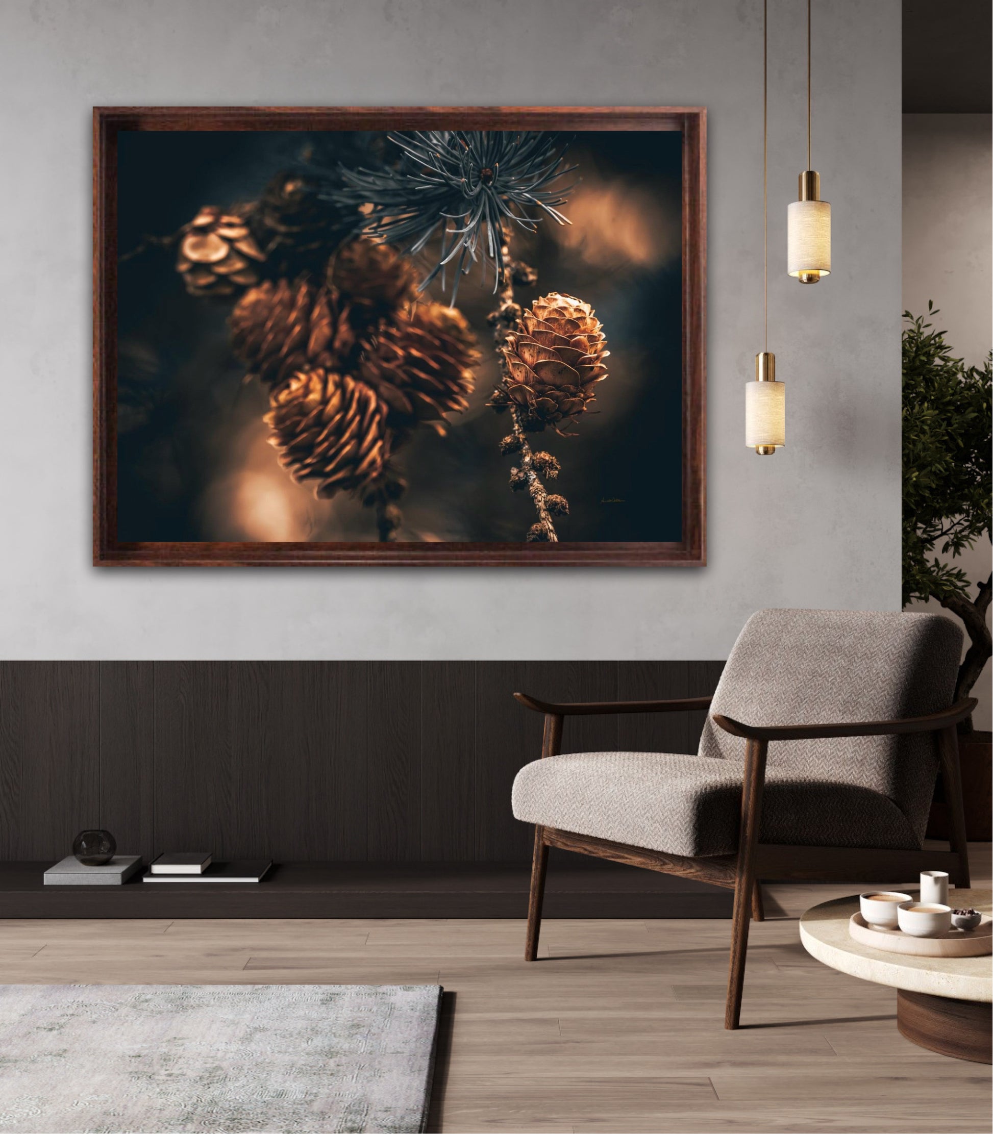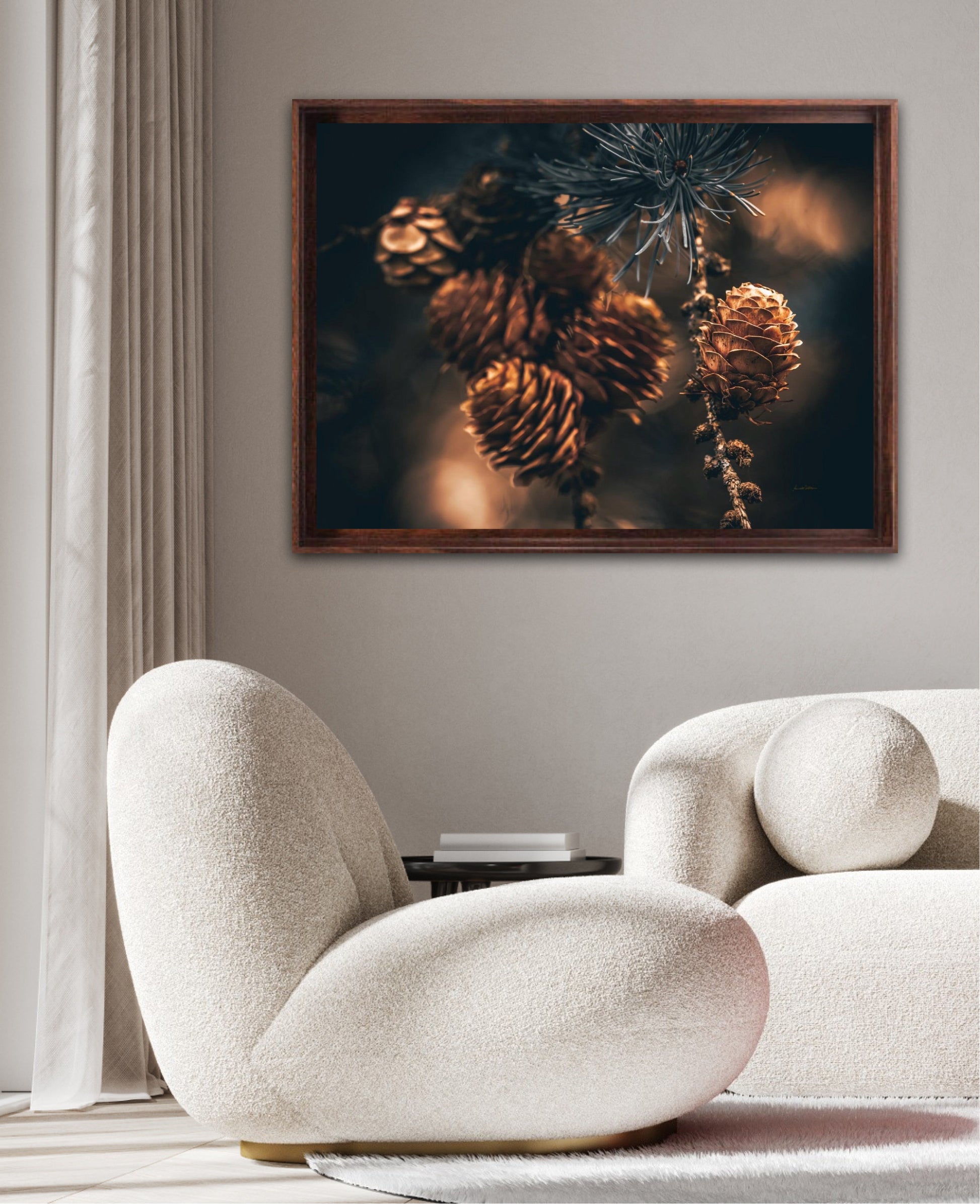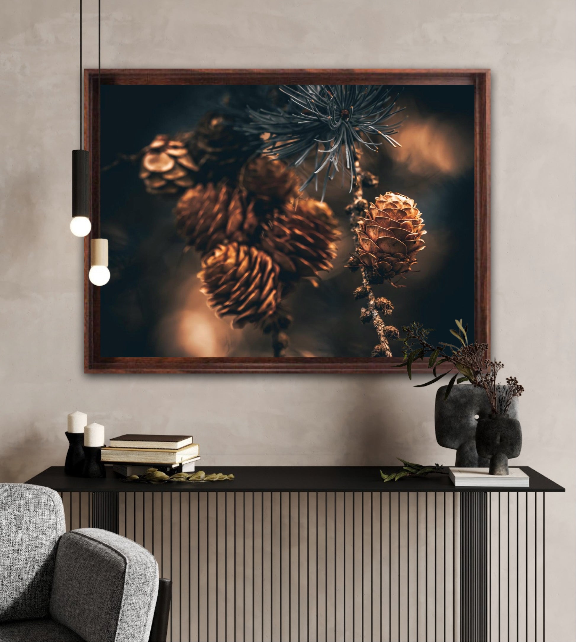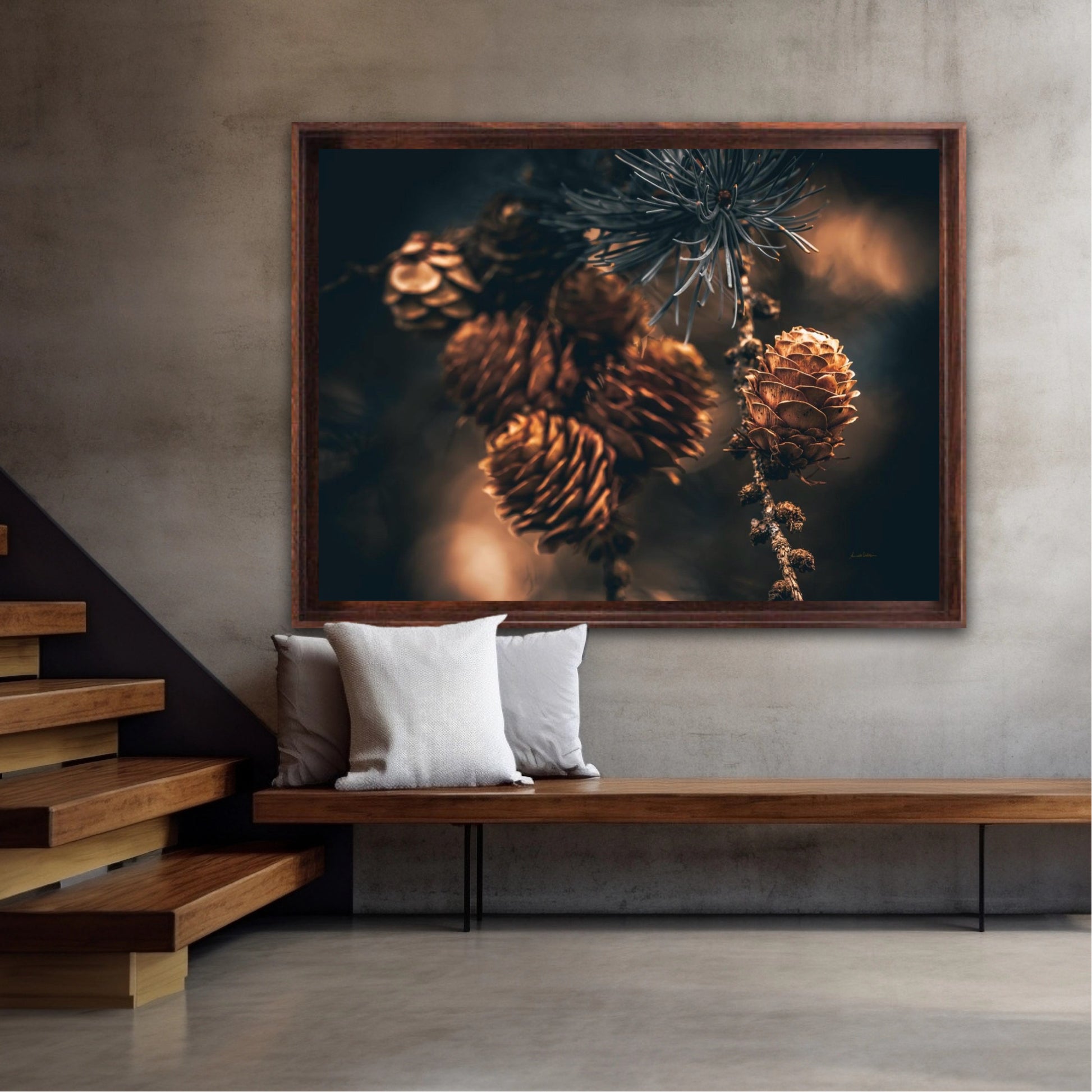 Beautiful photographic wall art of pine cones on a branch in a beautiful golden light. This artwork becomes an eye-catcher on the wall and brings nature into your home. Find the calm and magic of nature with this fine artwork.