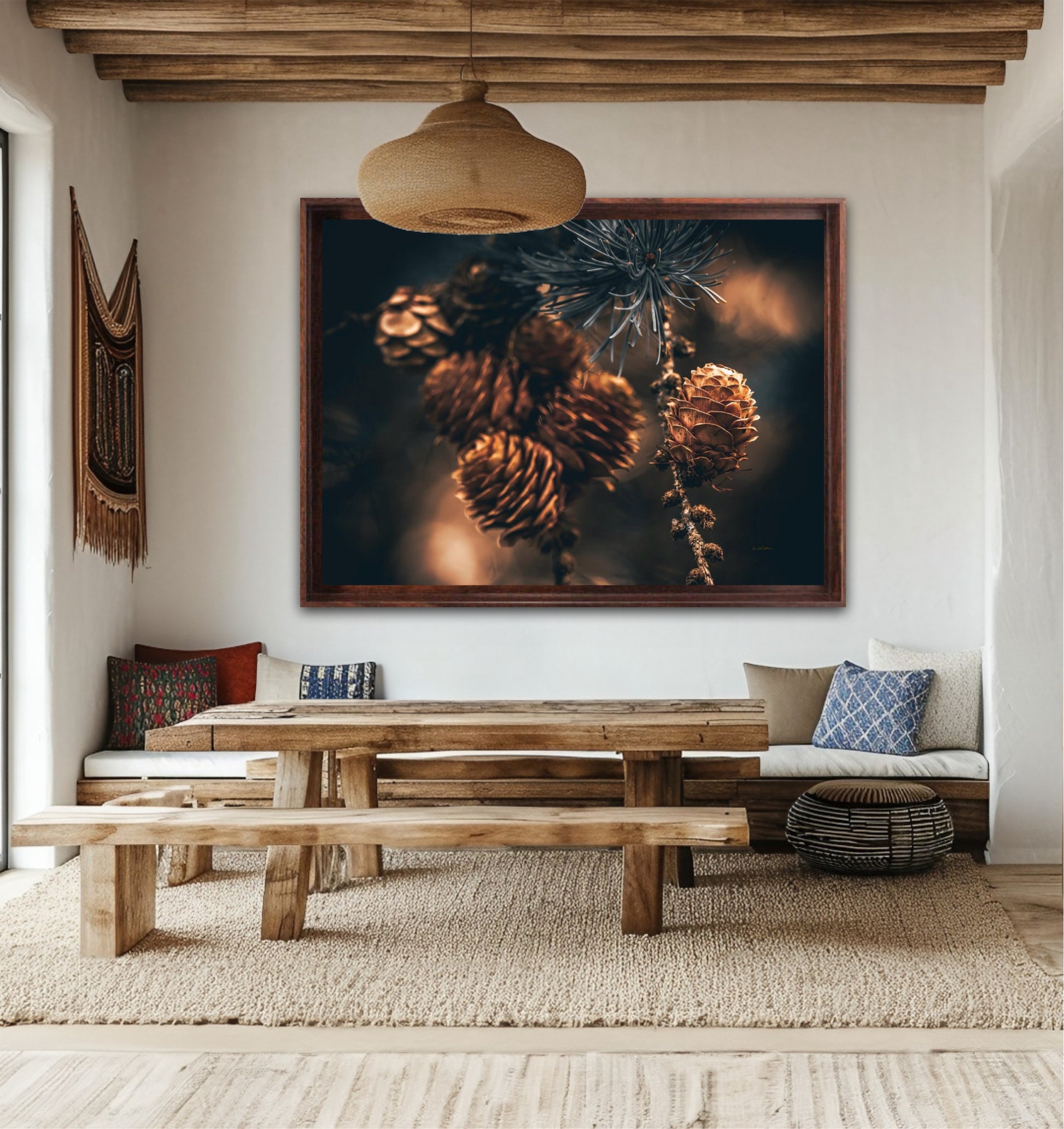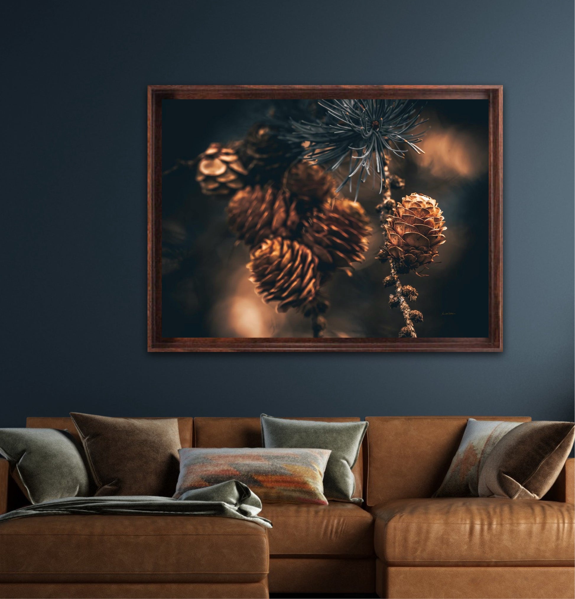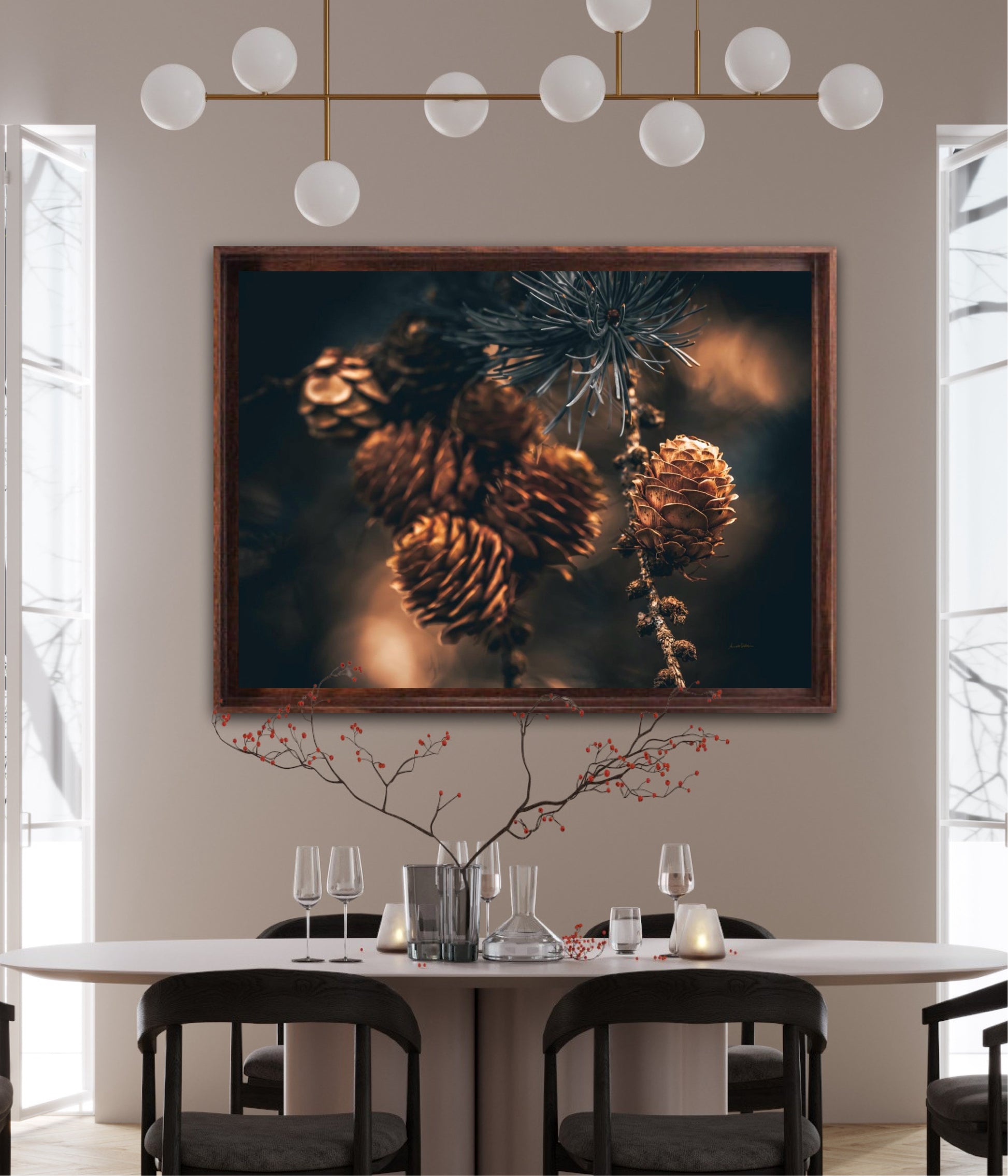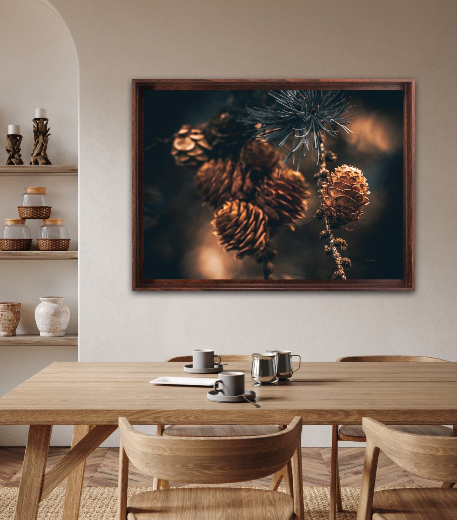 Beautiful photographic wall art of pine cones on a branch in a beautiful golden light. This artwork becomes an eye-catcher on the wall and brings nature into your home. Find the calm and magic of nature with this fine artwork.