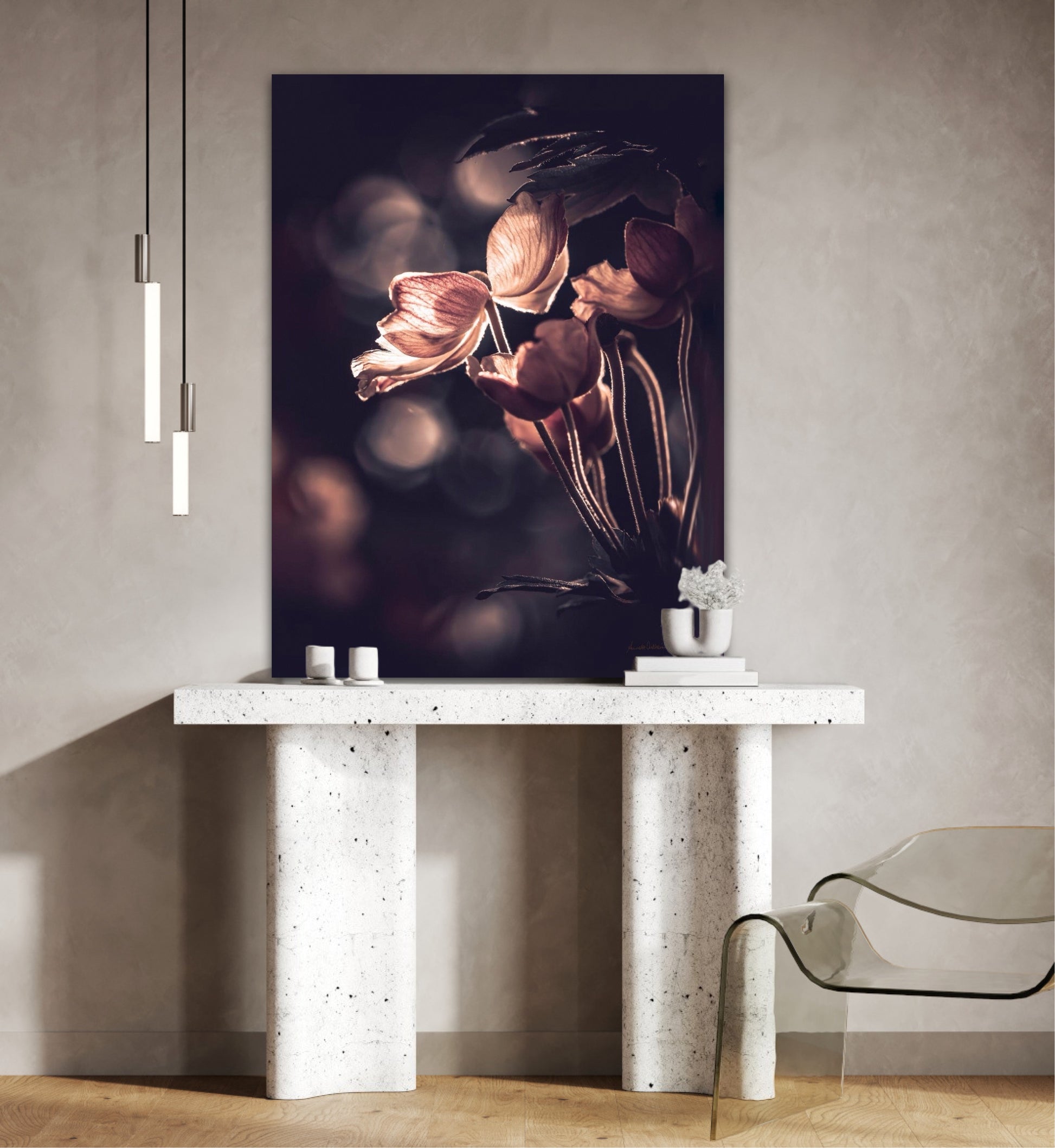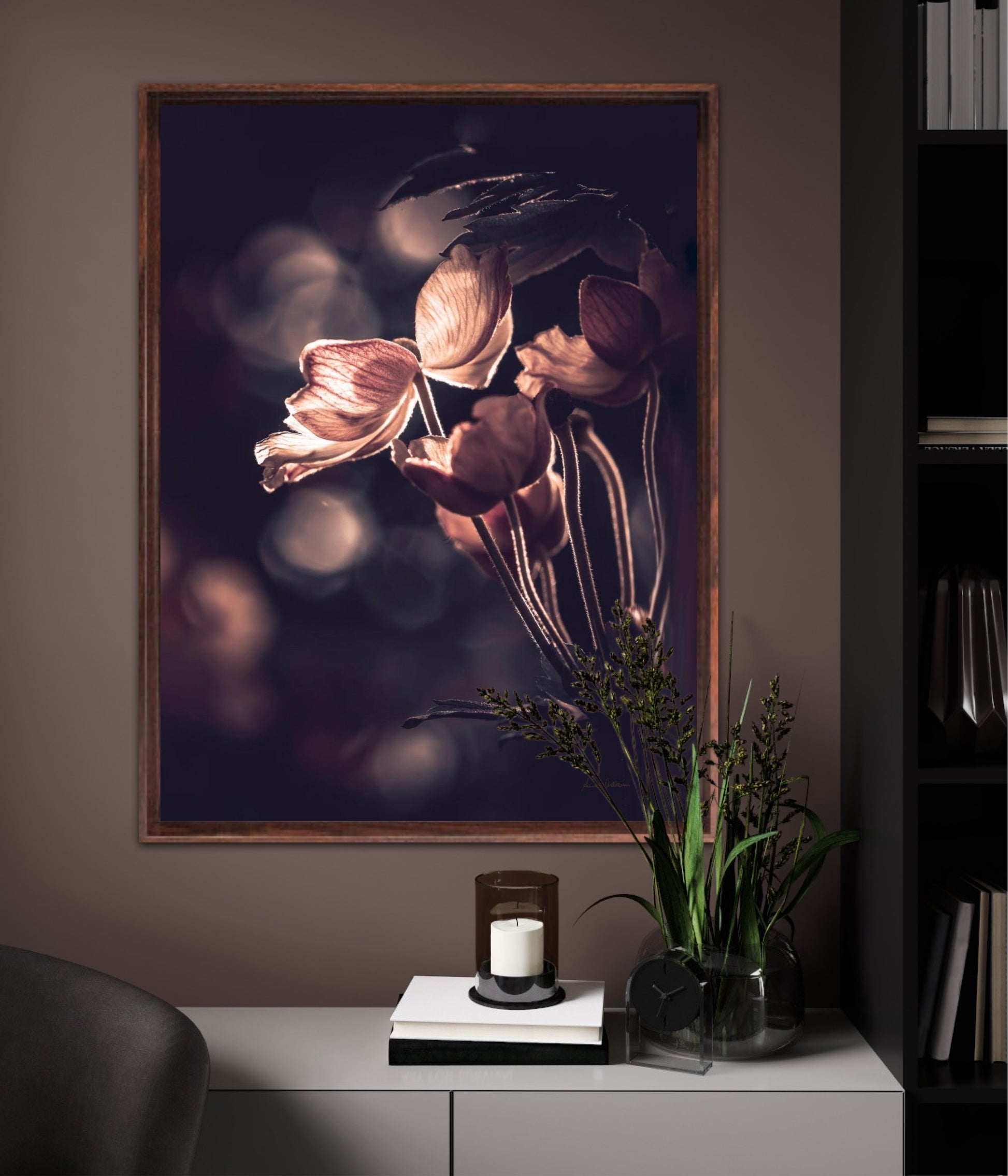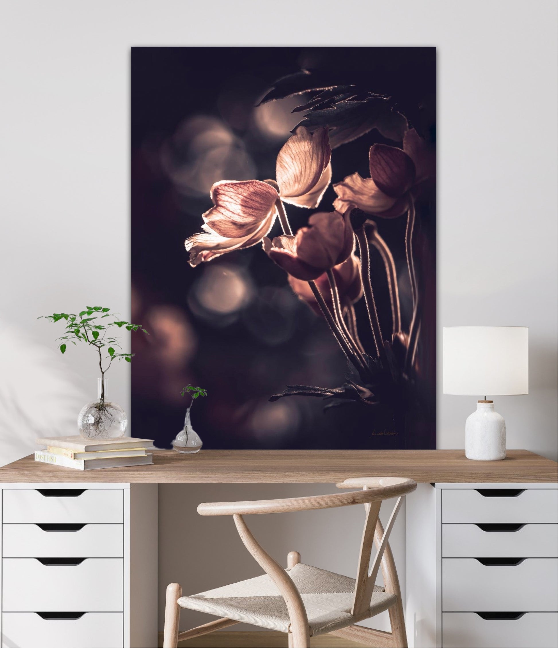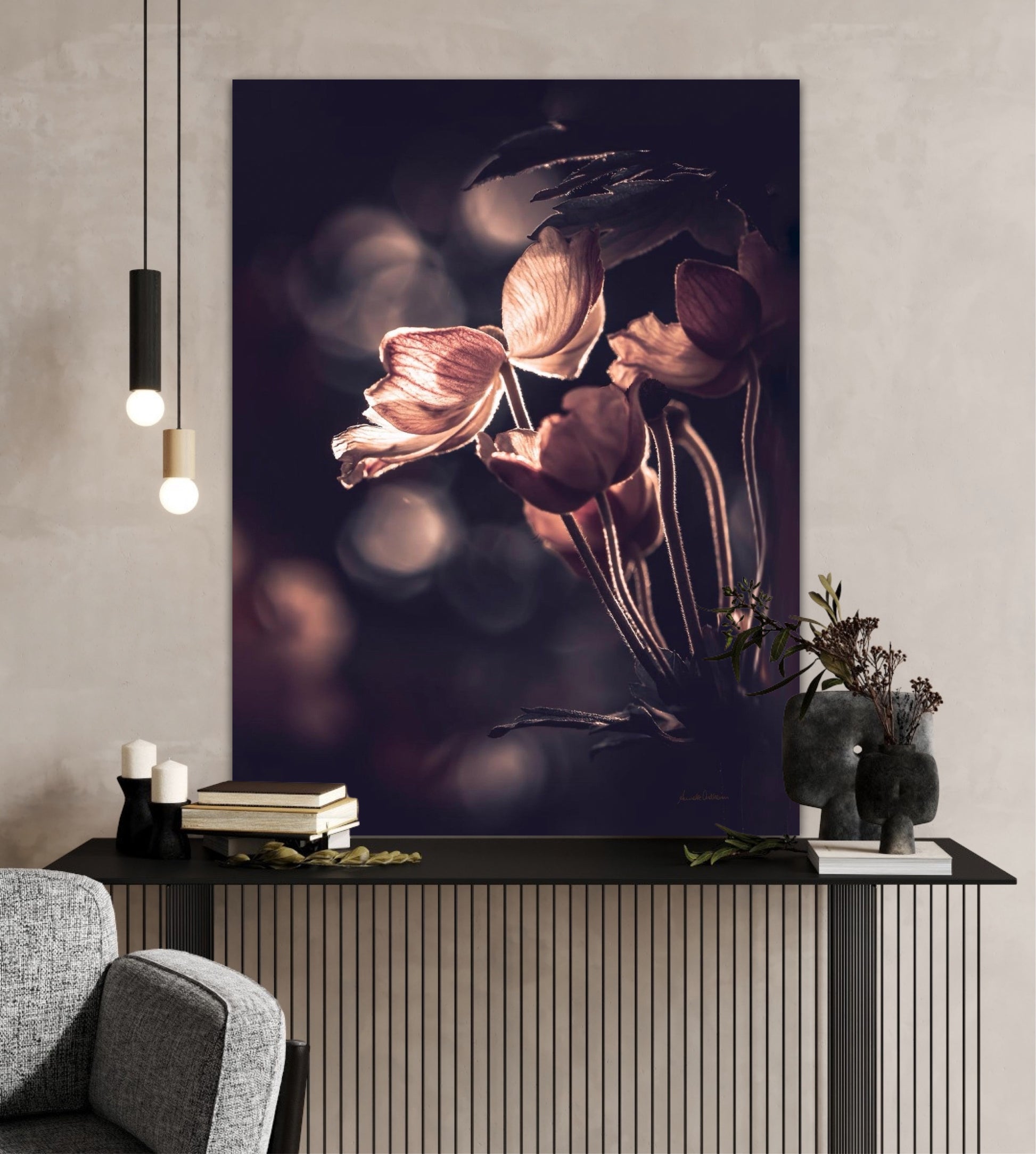 Beautiful photographic wall art of an anemone flower in beautiful tones of pink on a dark lilac and black background. This photo really has amazing atmosphere! Bring peace to your home with this beautiful artwork, and order today!