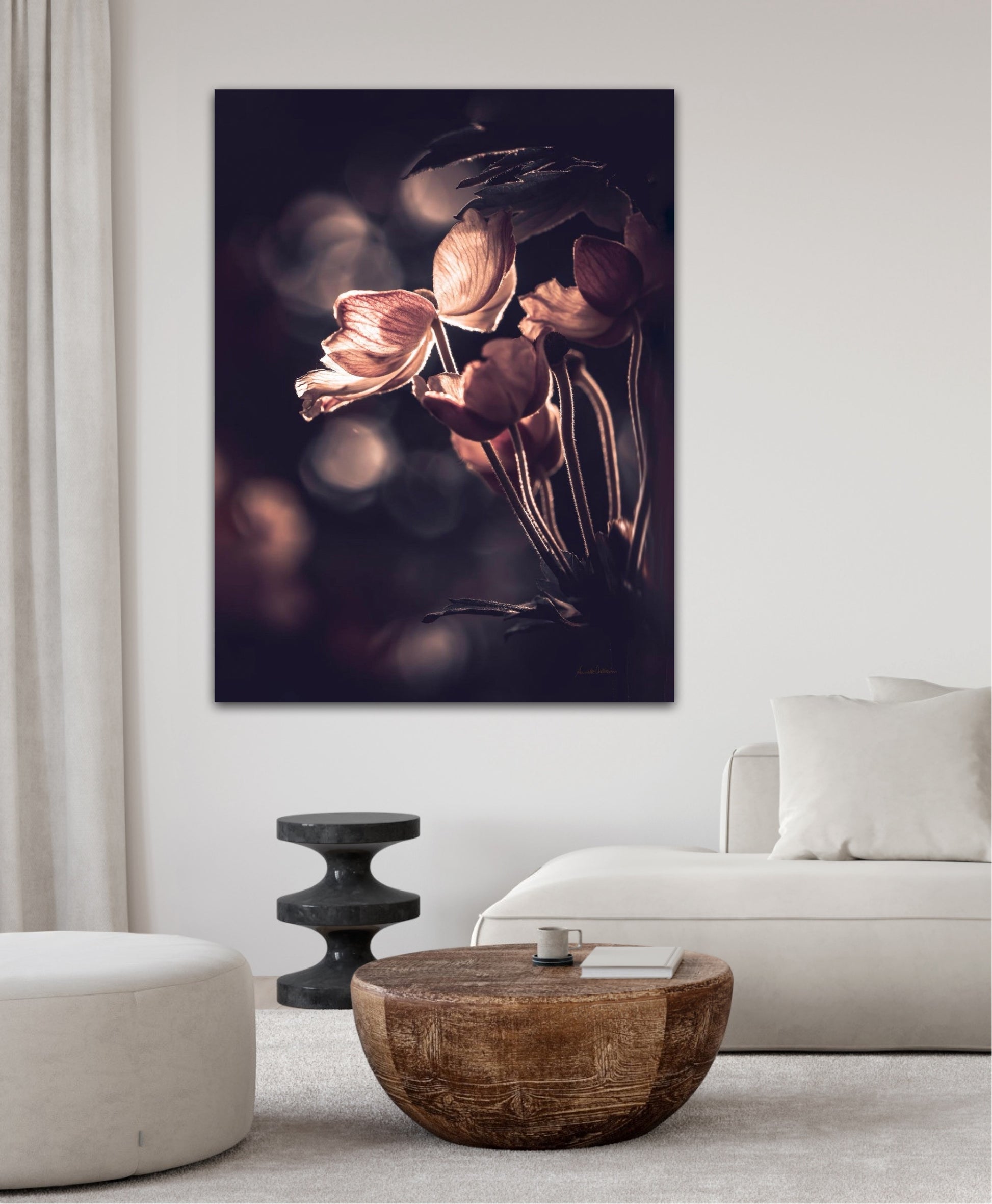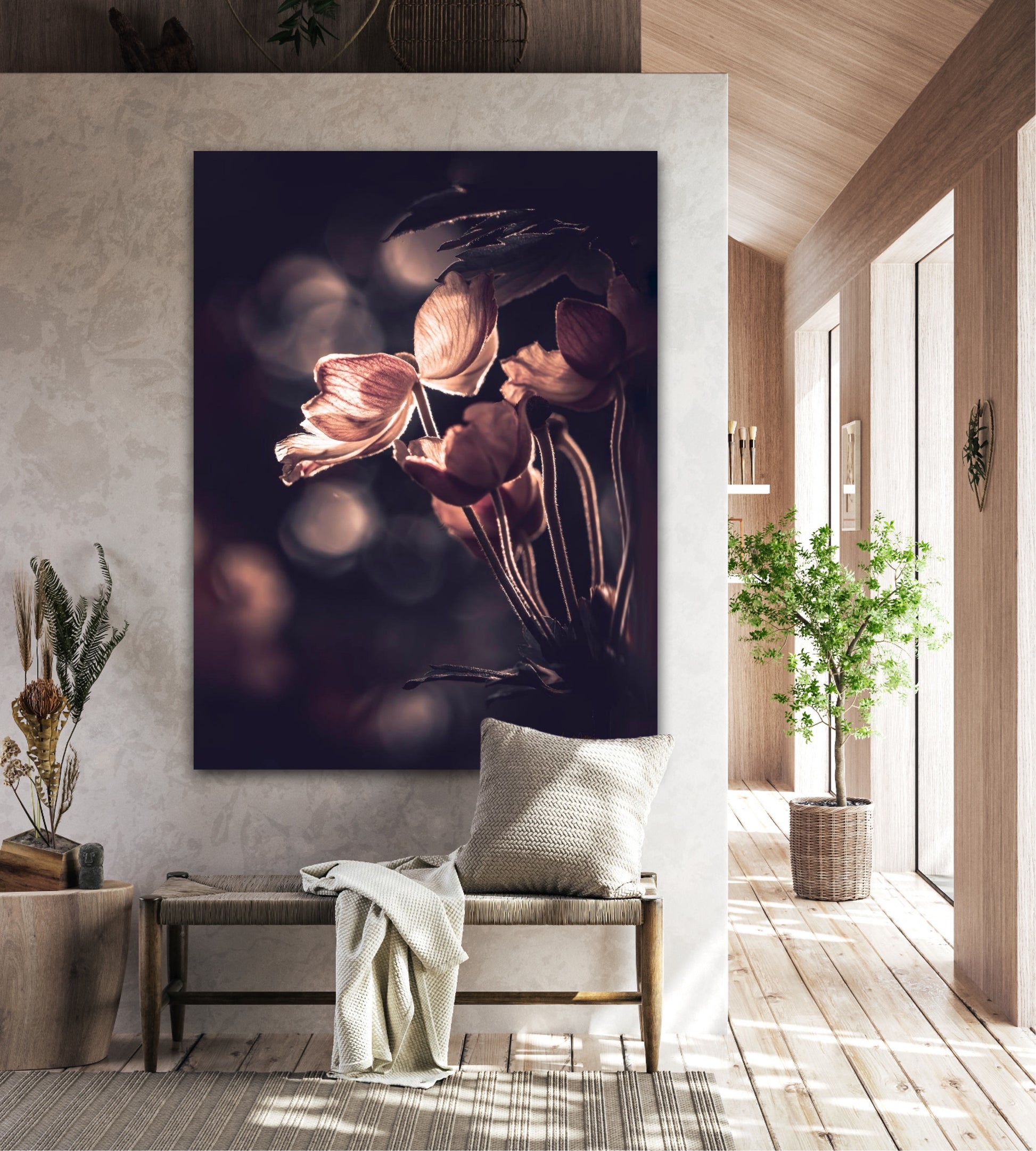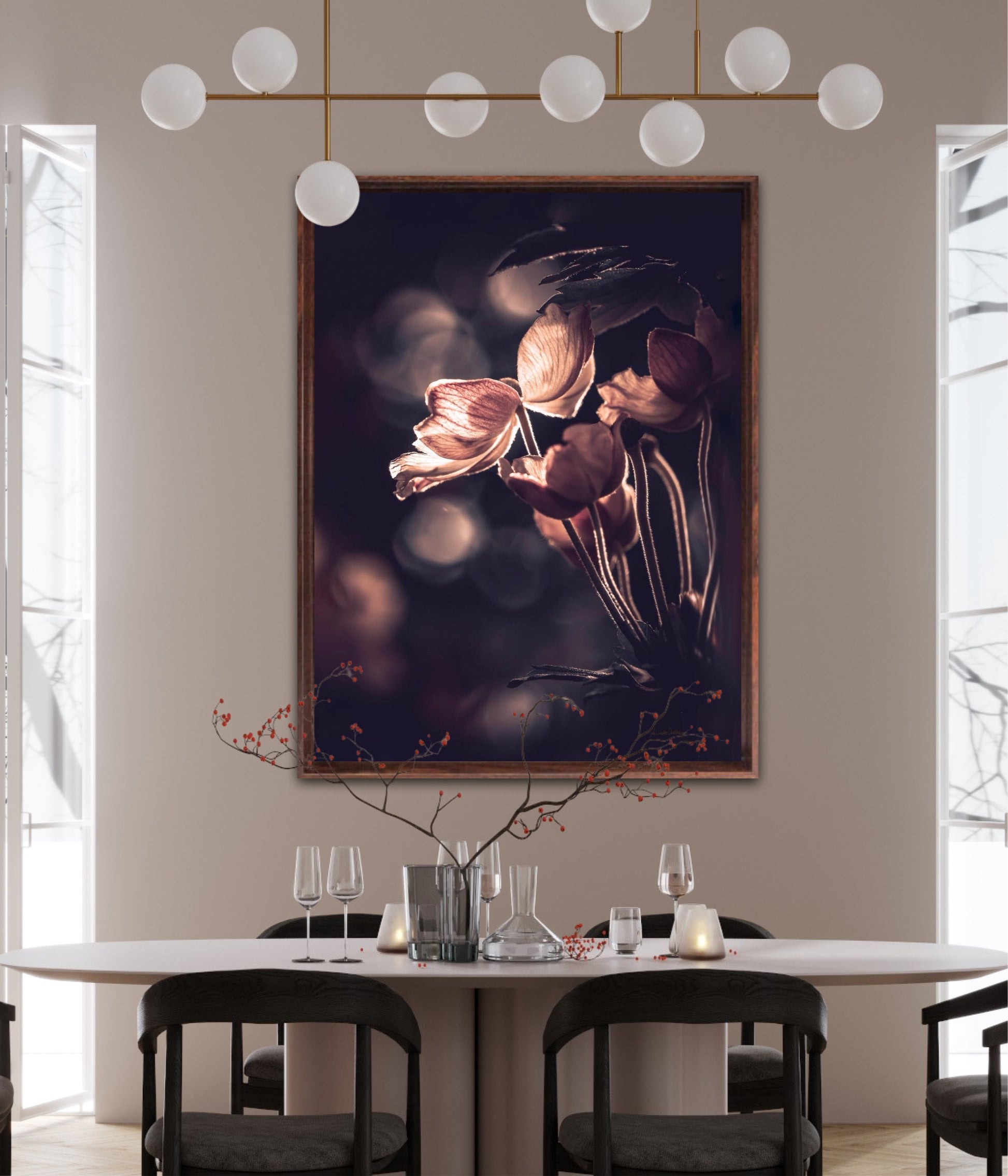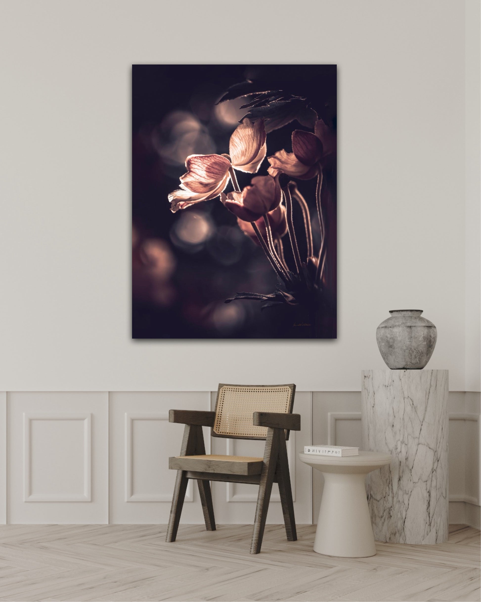 Beautiful photographic wall art of an anemone flower in beautiful tones of pink on a dark lilac and black background. This photo really has amazing atmosphere! Bring peace to your home with this beautiful artwork, and order today!