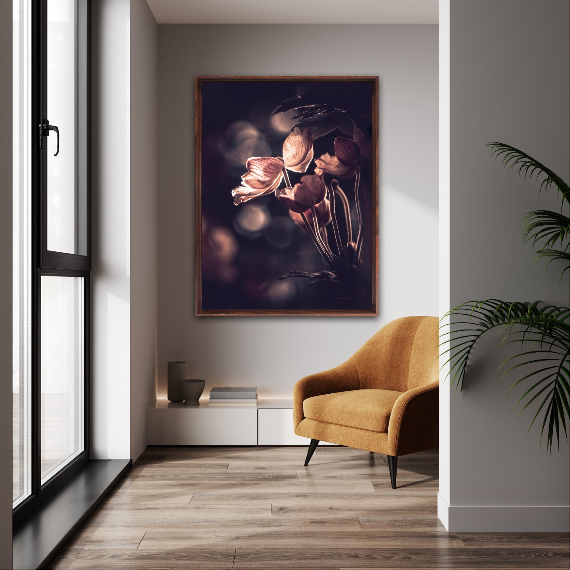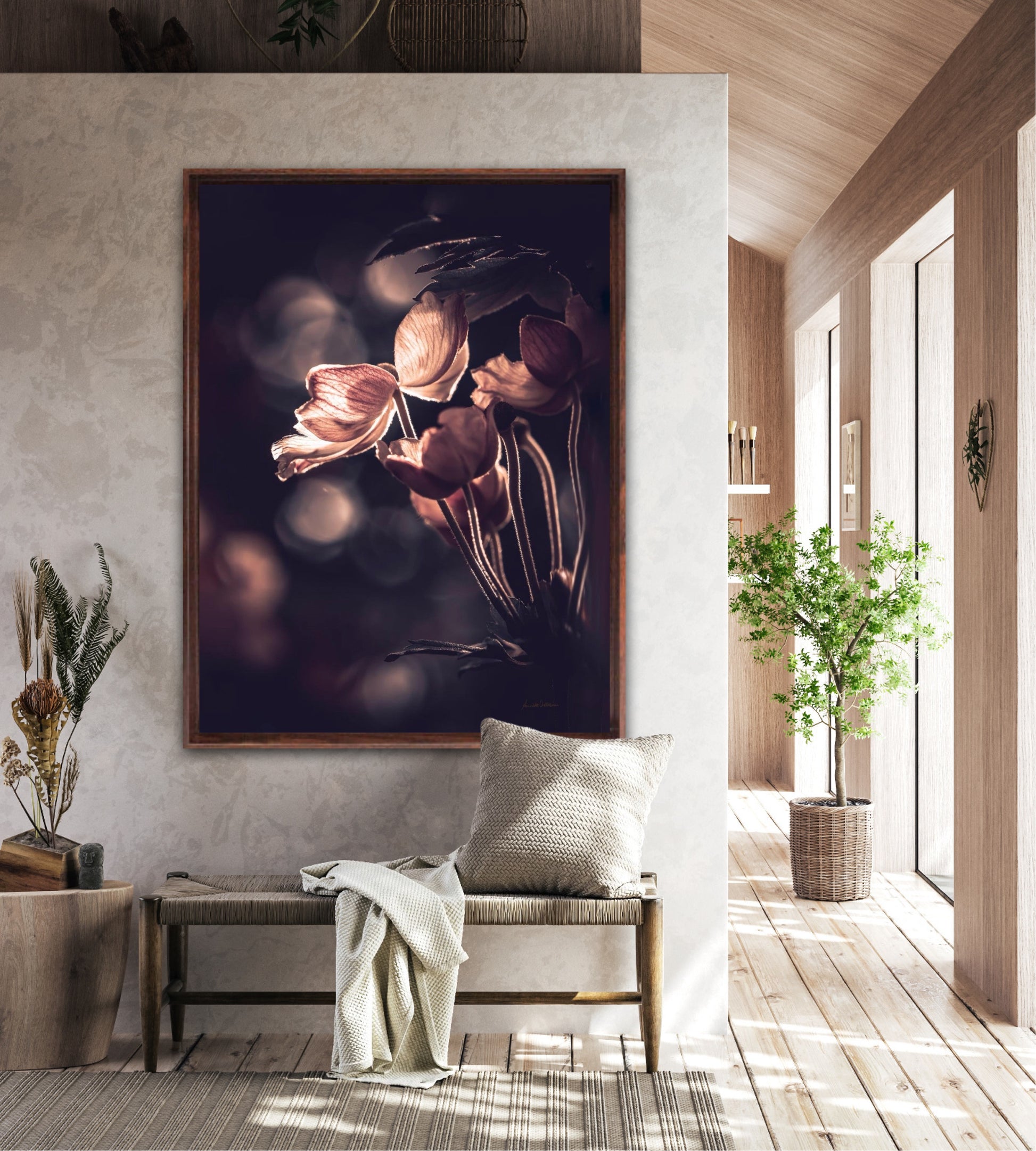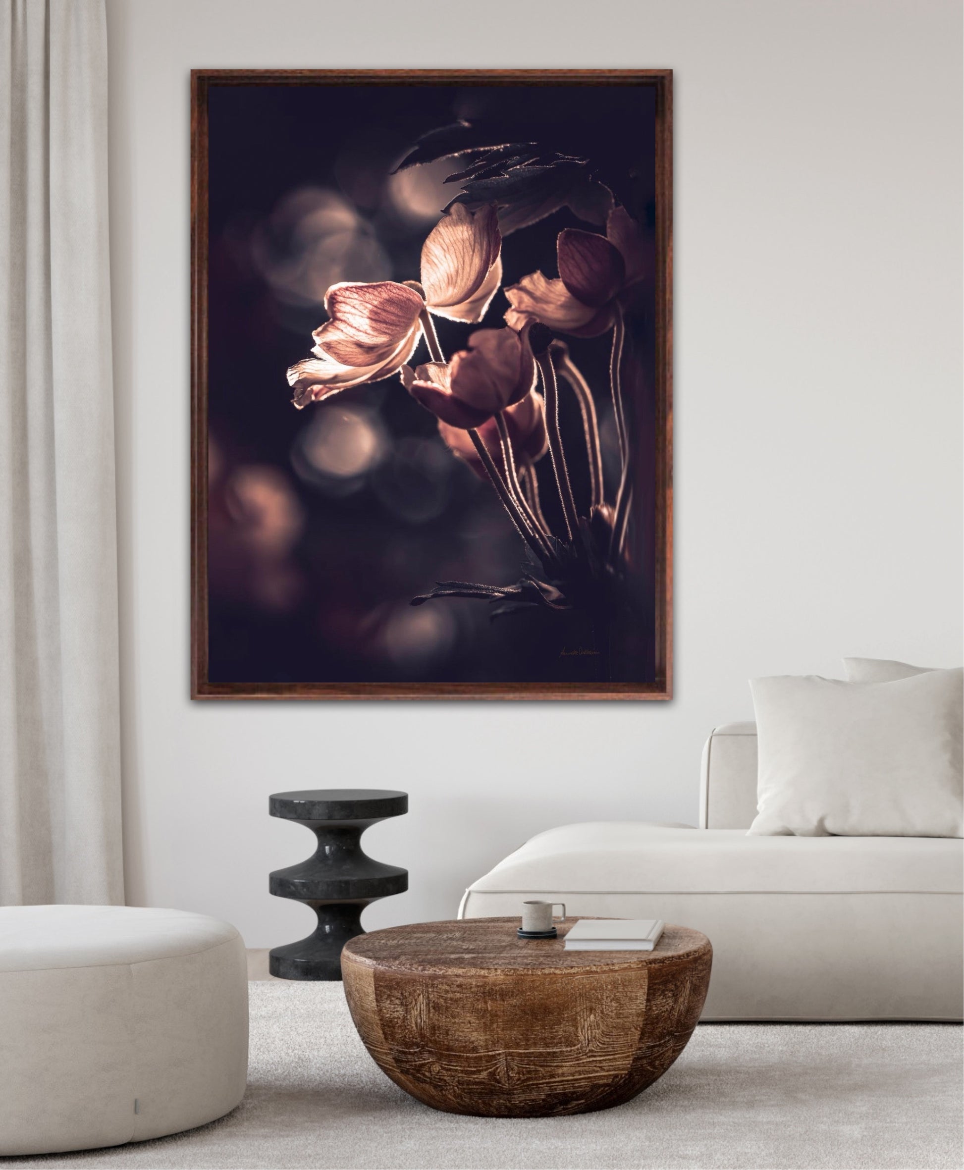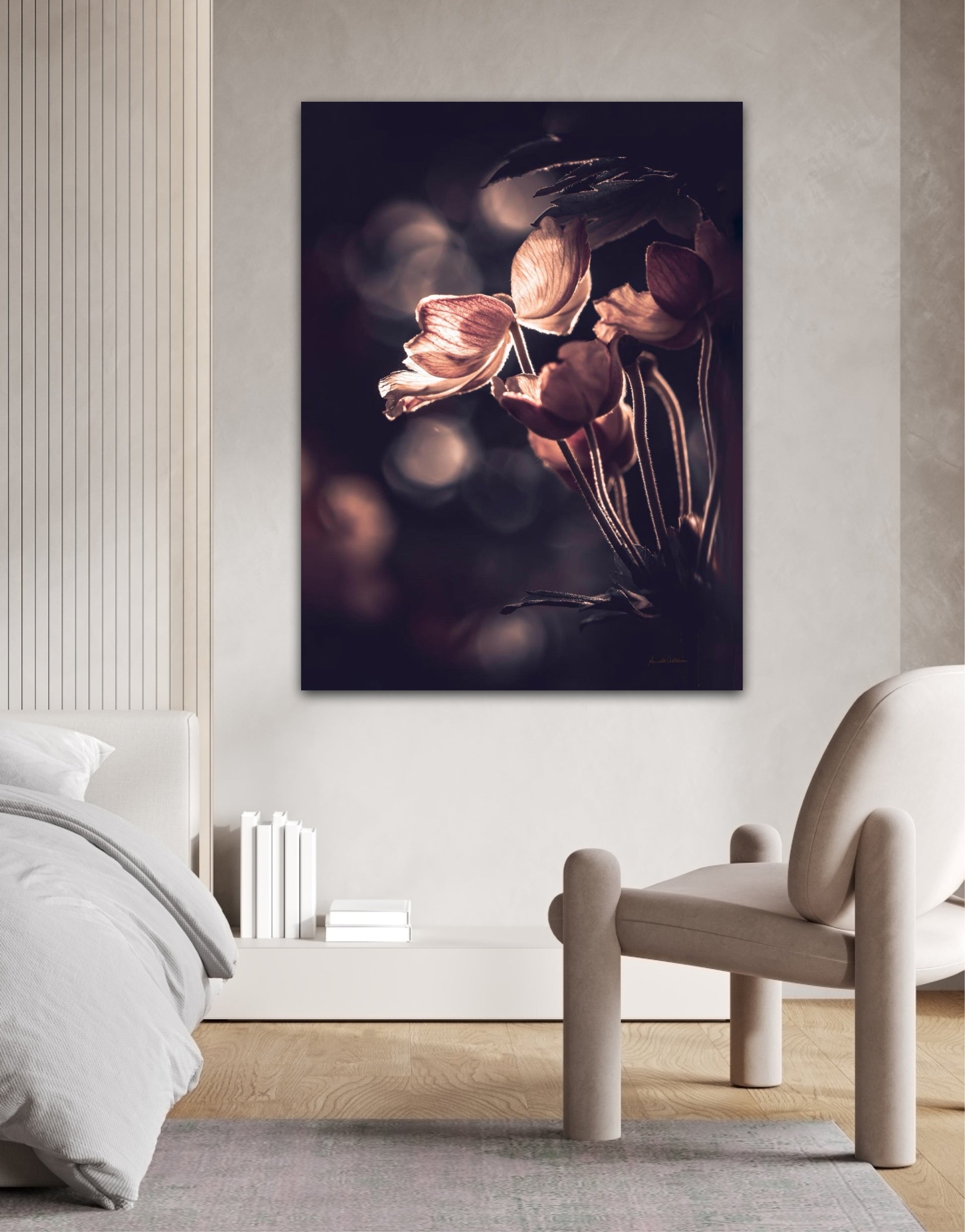 Beautiful photographic wall art of an anemone flower in beautiful tones of pink on a dark lilac and black background. This photo really has amazing atmosphere! Bring peace to your home with this beautiful artwork, and order today!