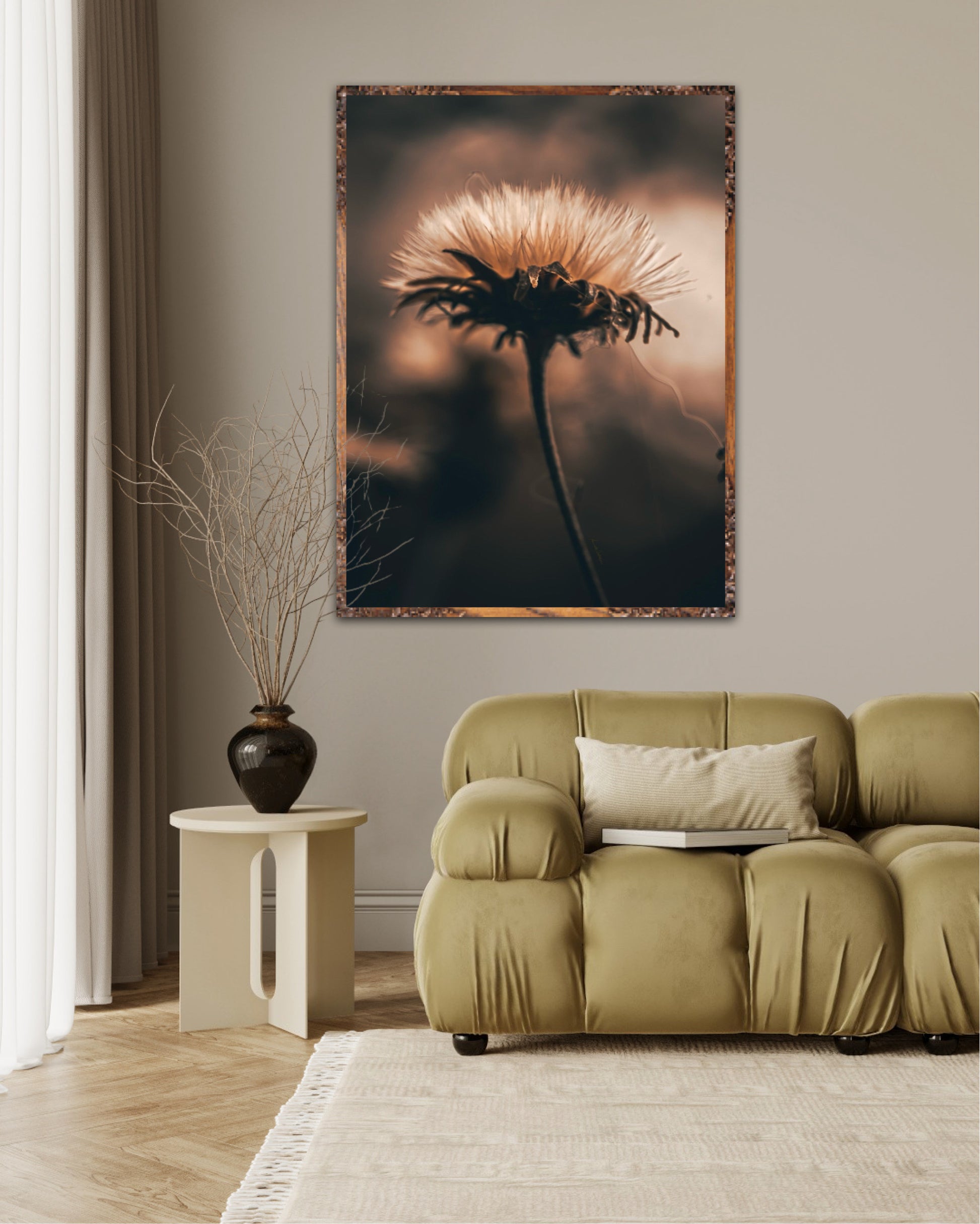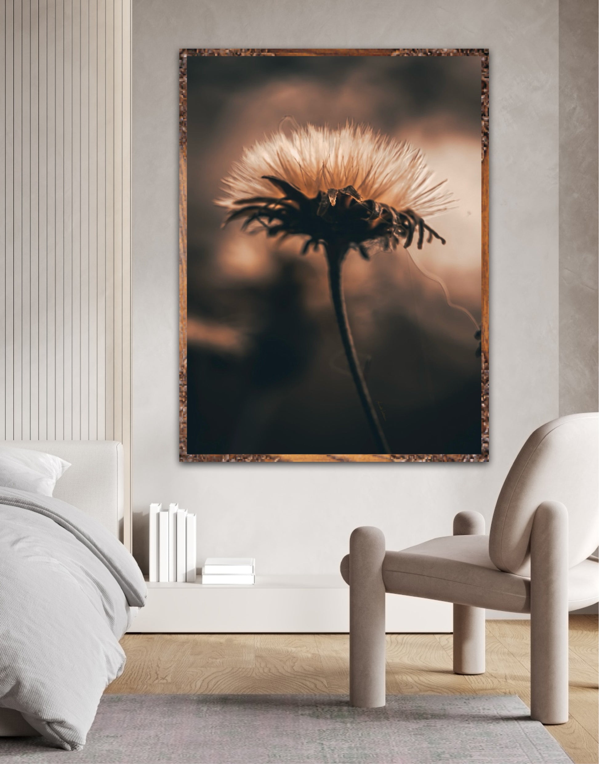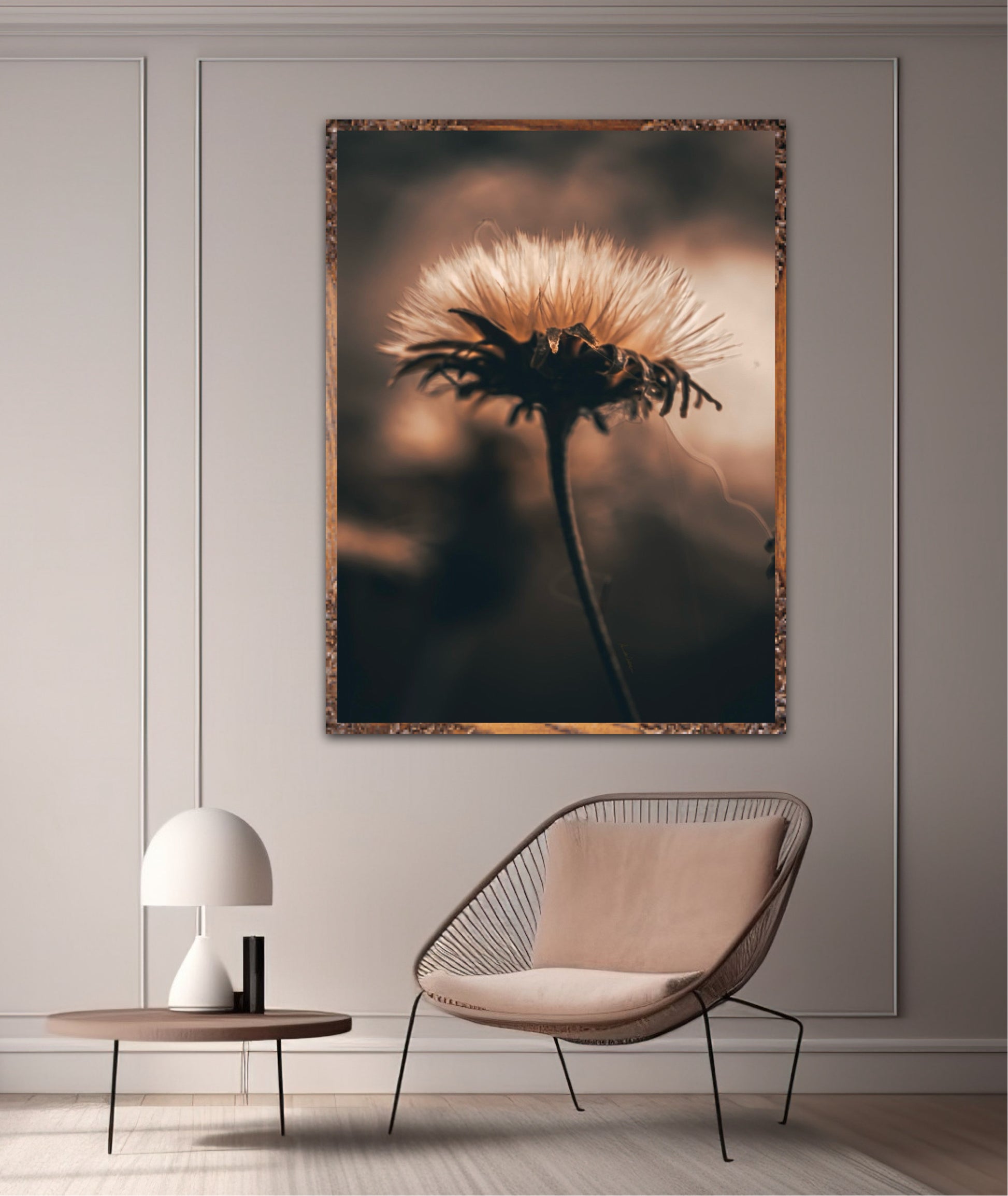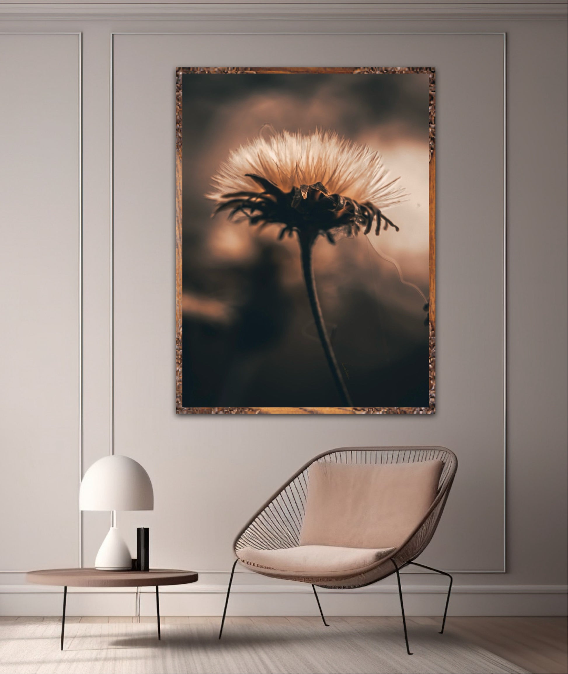 Beautiful photographic wall art of a fluffy, withered plant. The wallart has dramatic light ang comes in a beige, brown and black color.